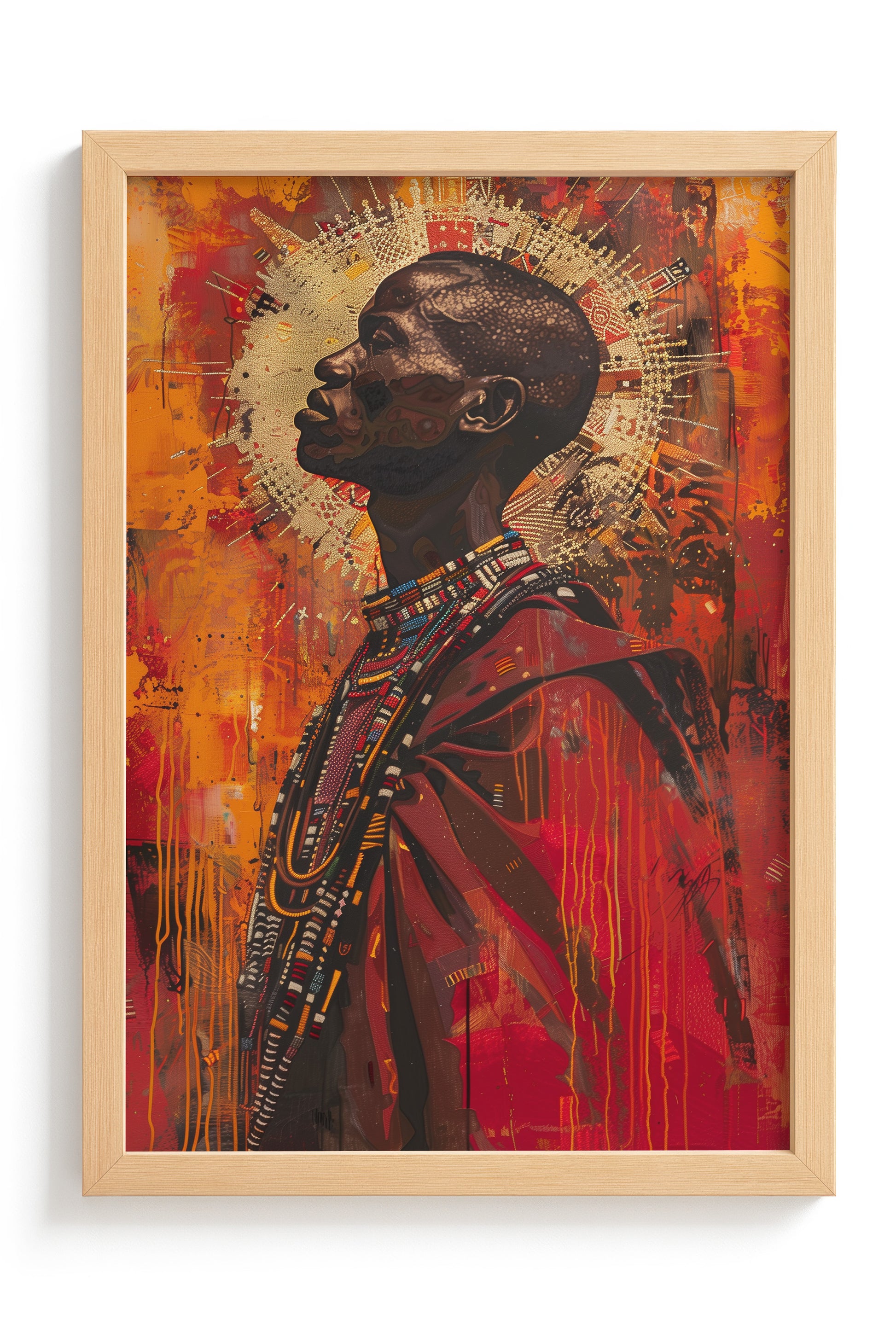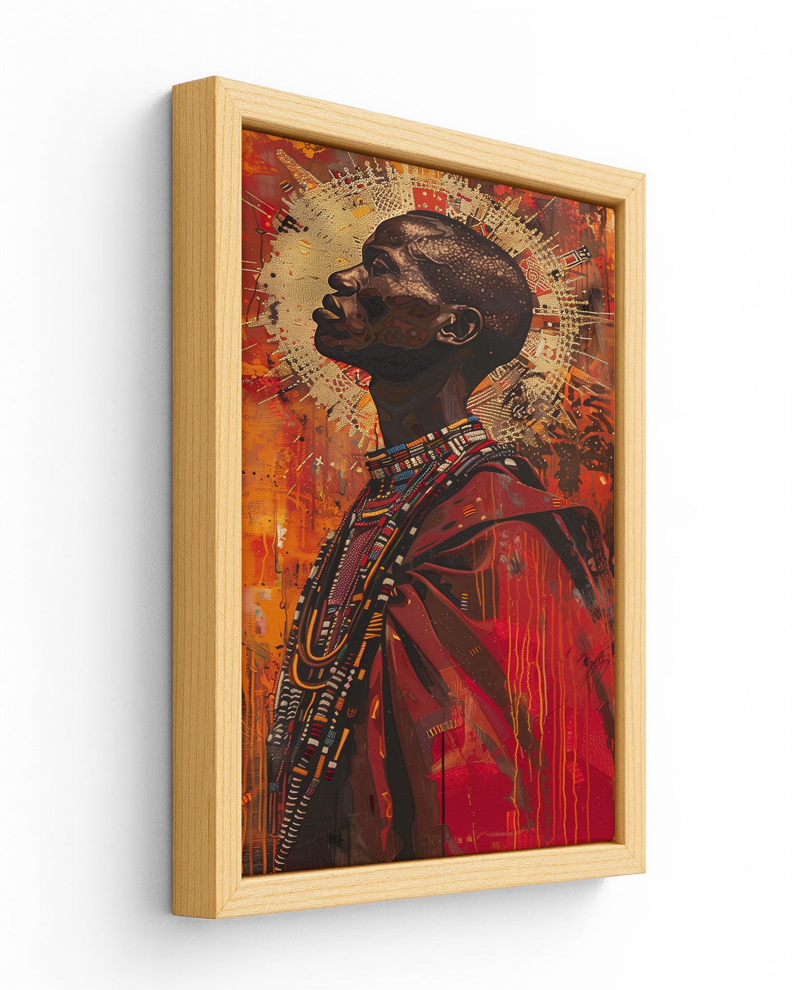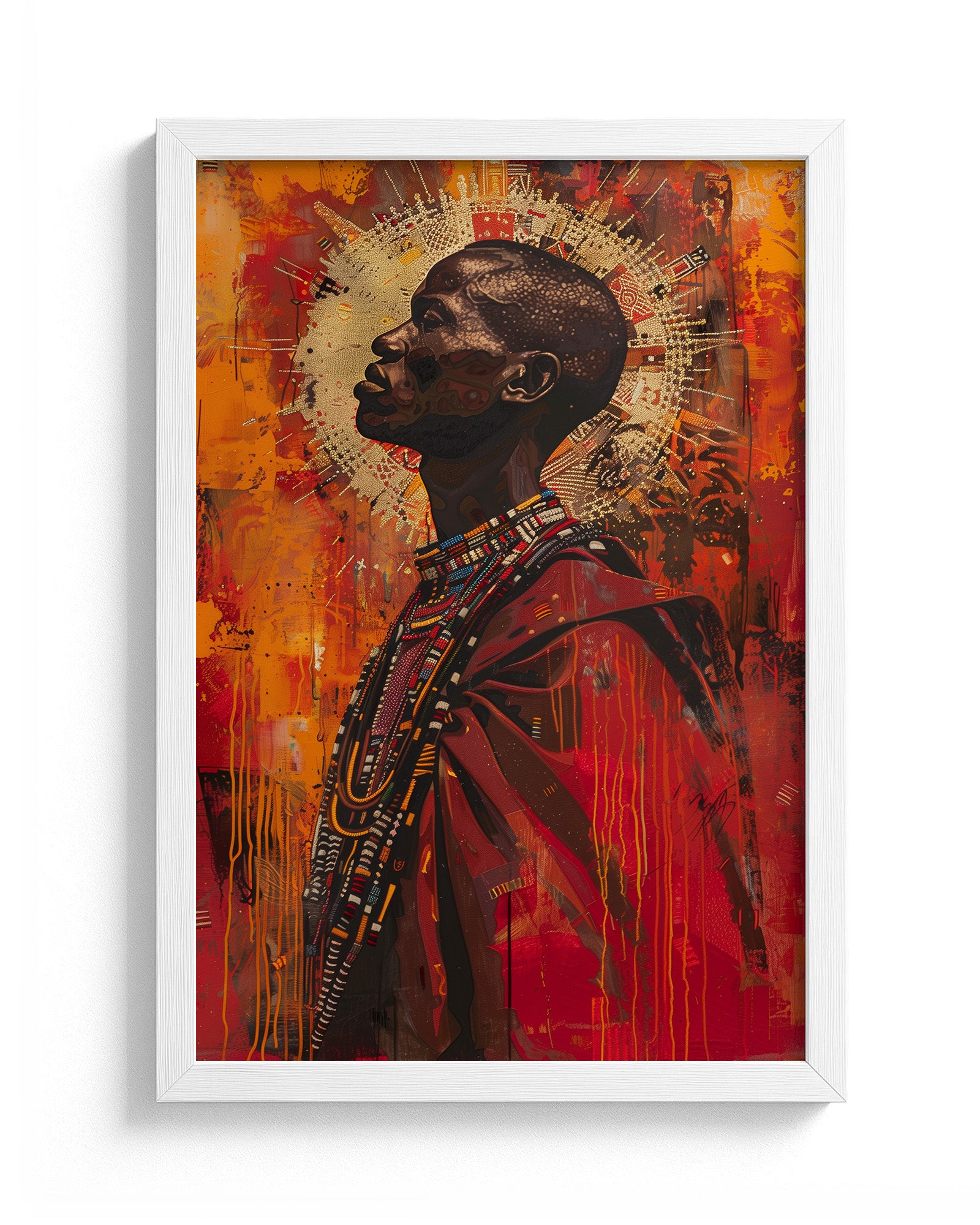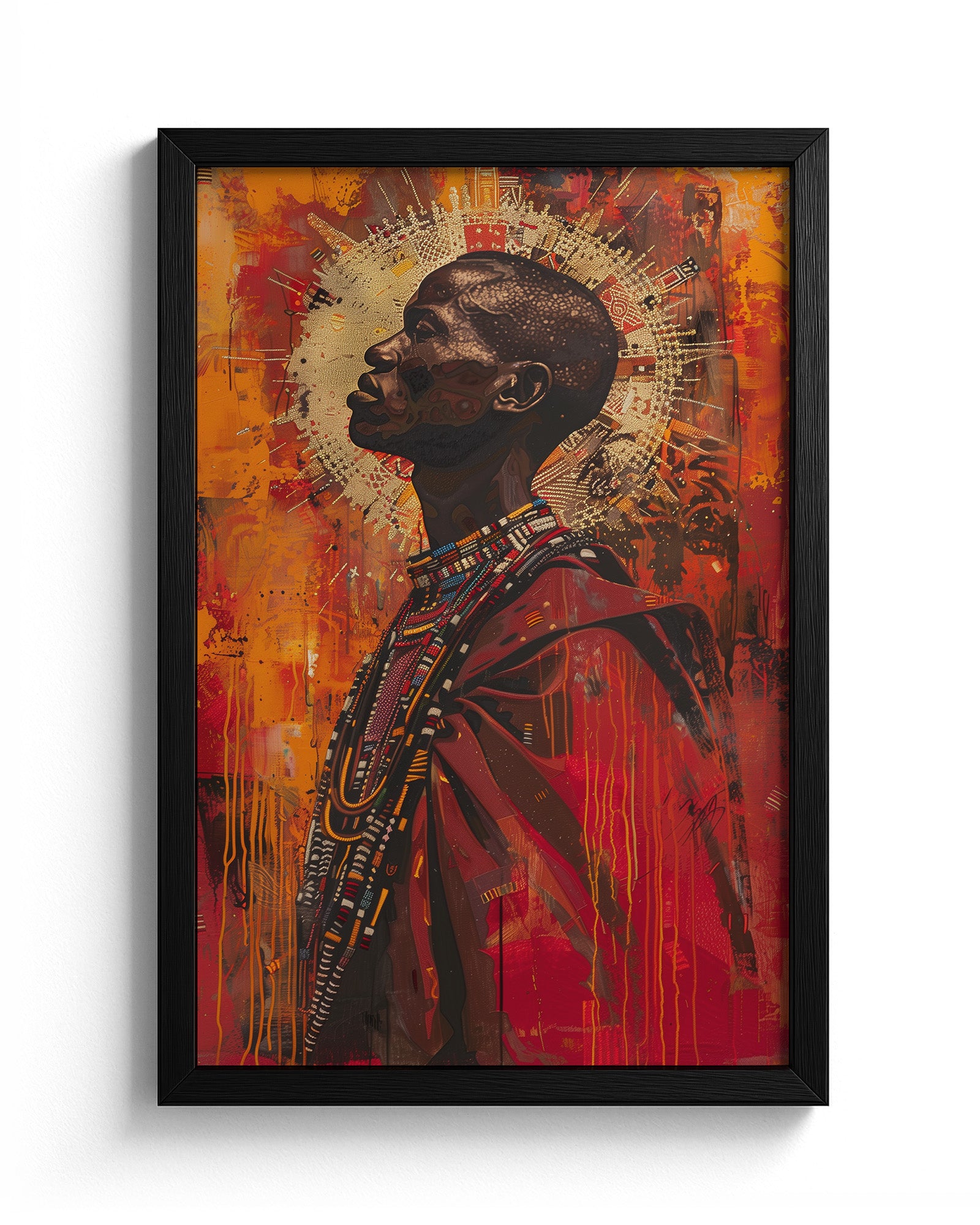 This minimalist oil painting captures the quiet strength and timeless elegance of a Maasai warrior. Rendered in soft earth tones with muted reds and browns, the piece highlights subtle beadwork details and clean, understated lines, blending cultural authenticity with modern refinement.