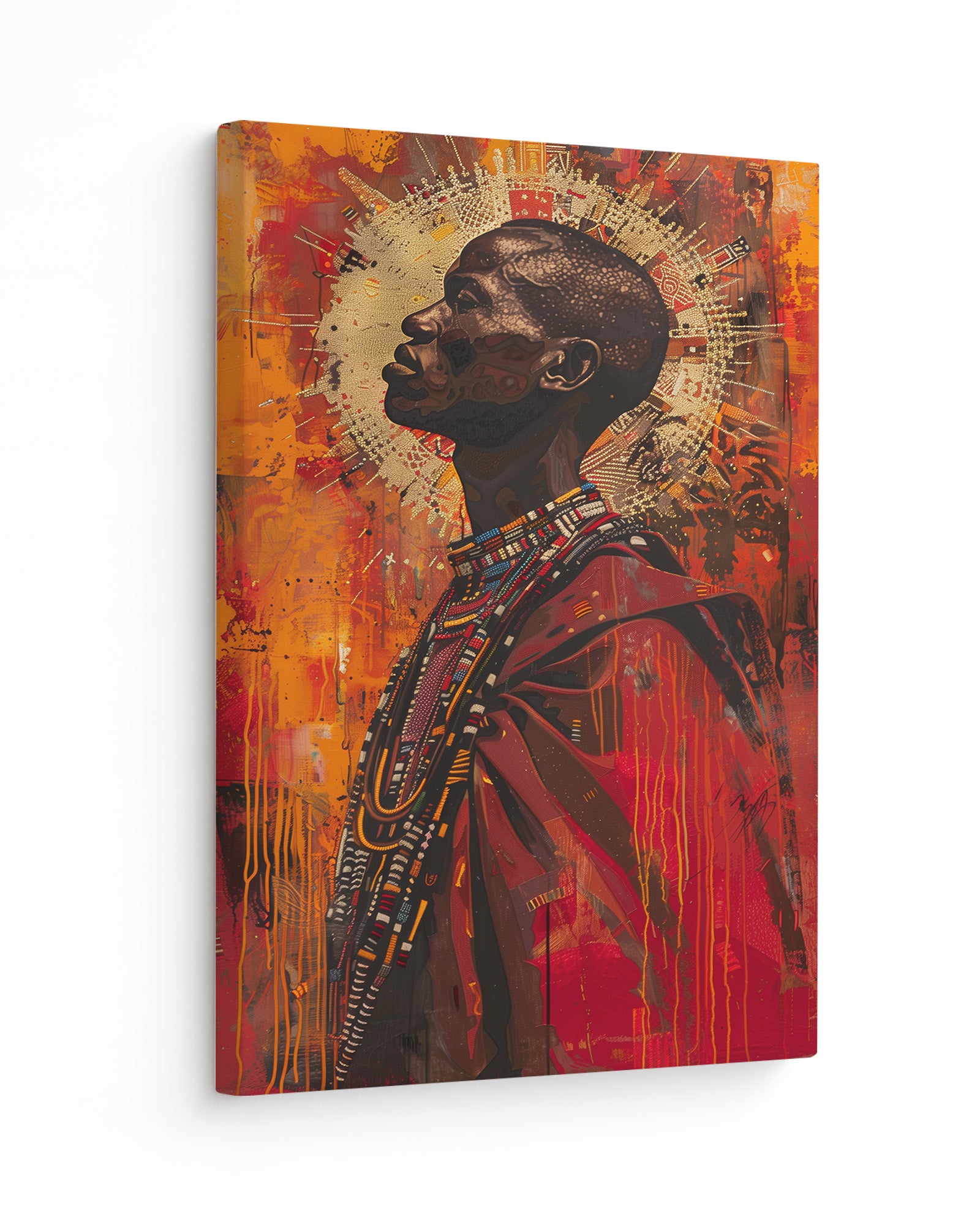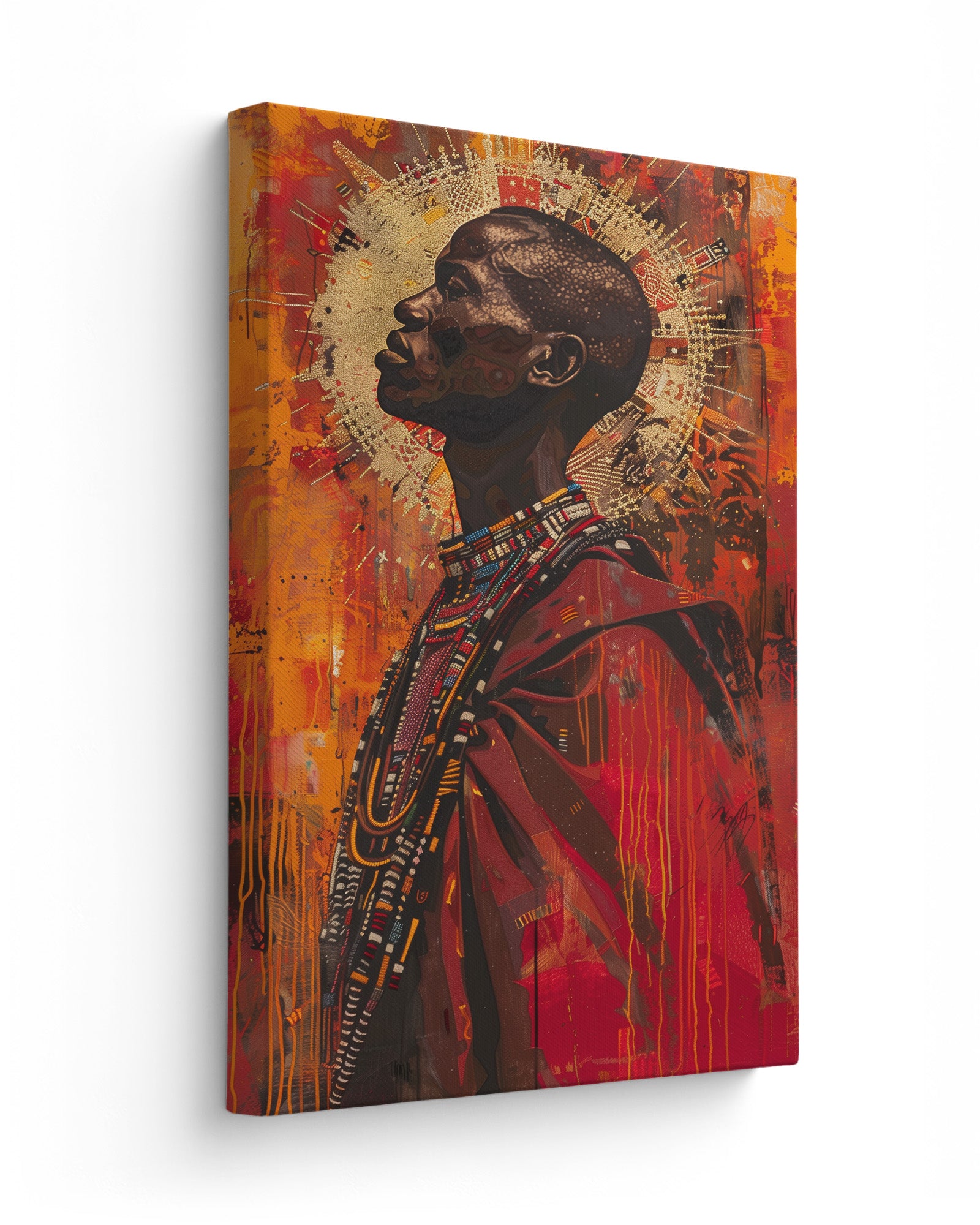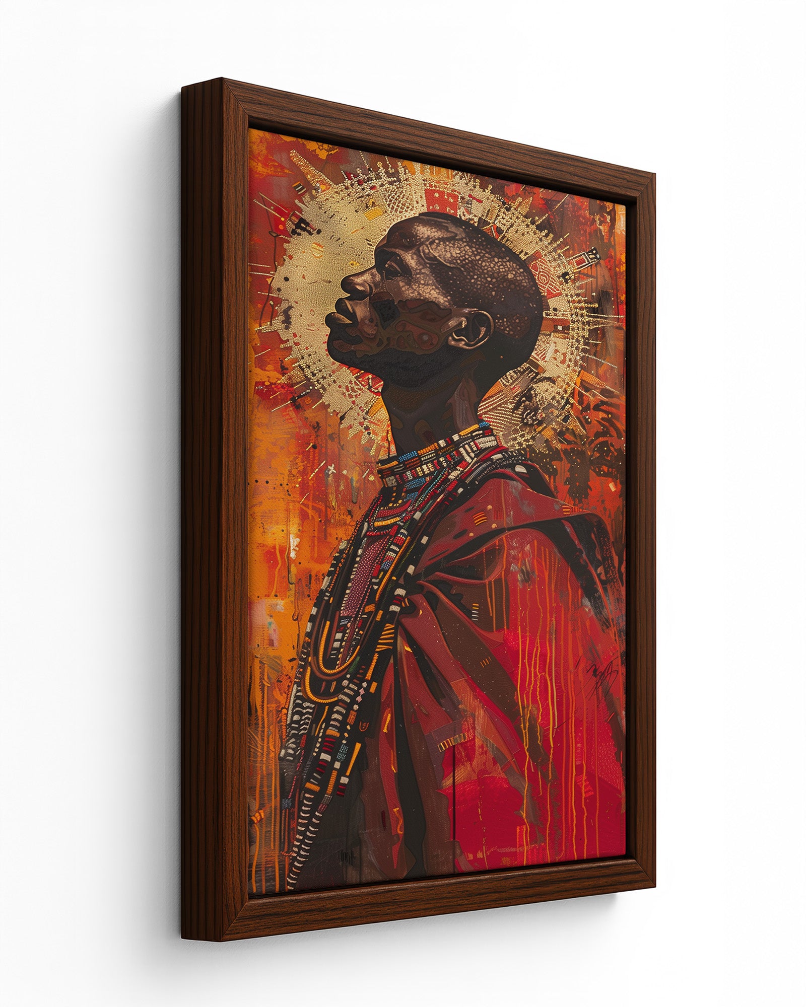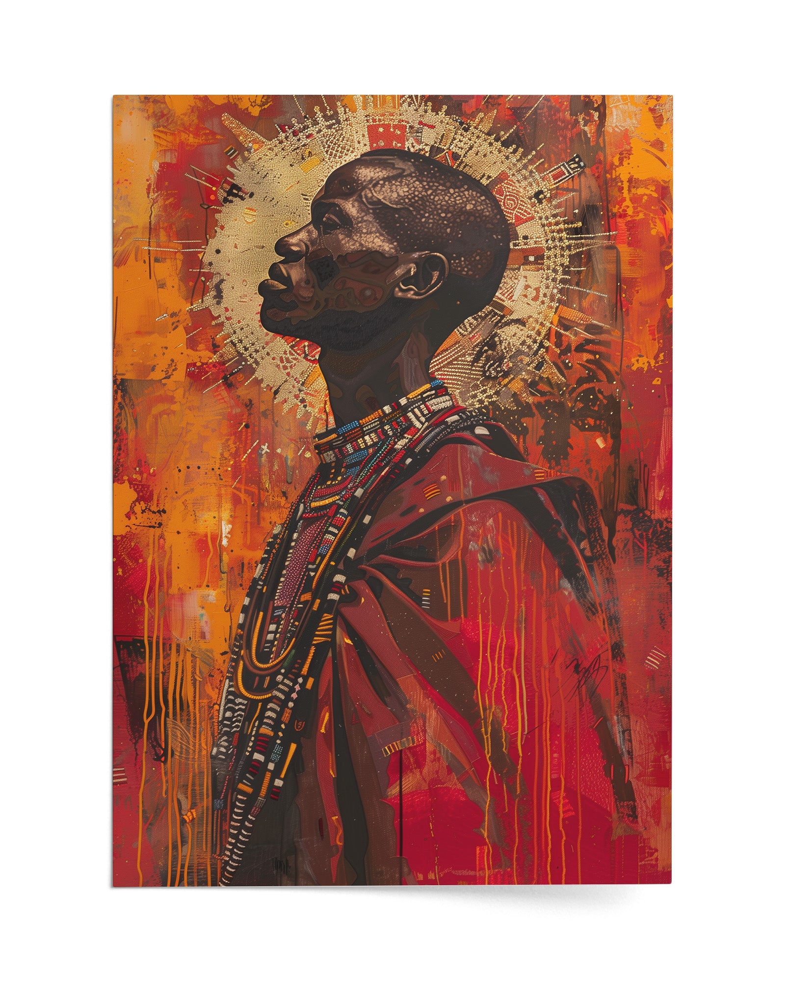 This minimalist oil painting captures the quiet strength and timeless elegance of a Maasai warrior. Rendered in soft earth tones with muted reds and browns, the piece highlights subtle beadwork details and clean, understated lines, blending cultural authenticity with modern refinement.