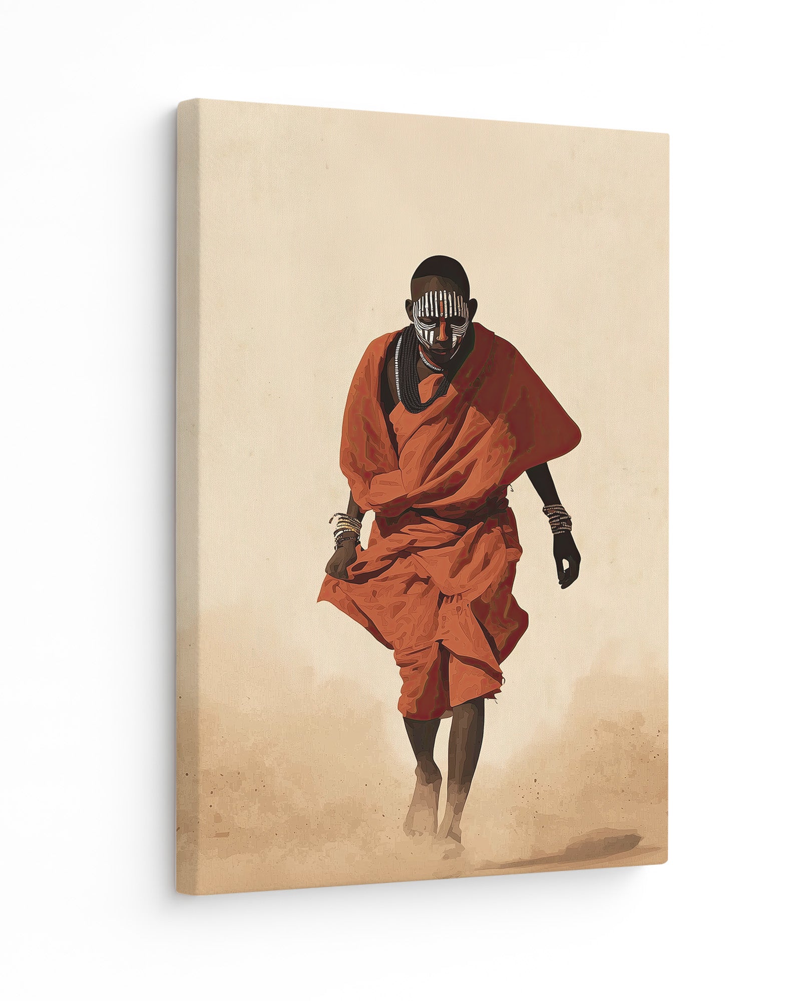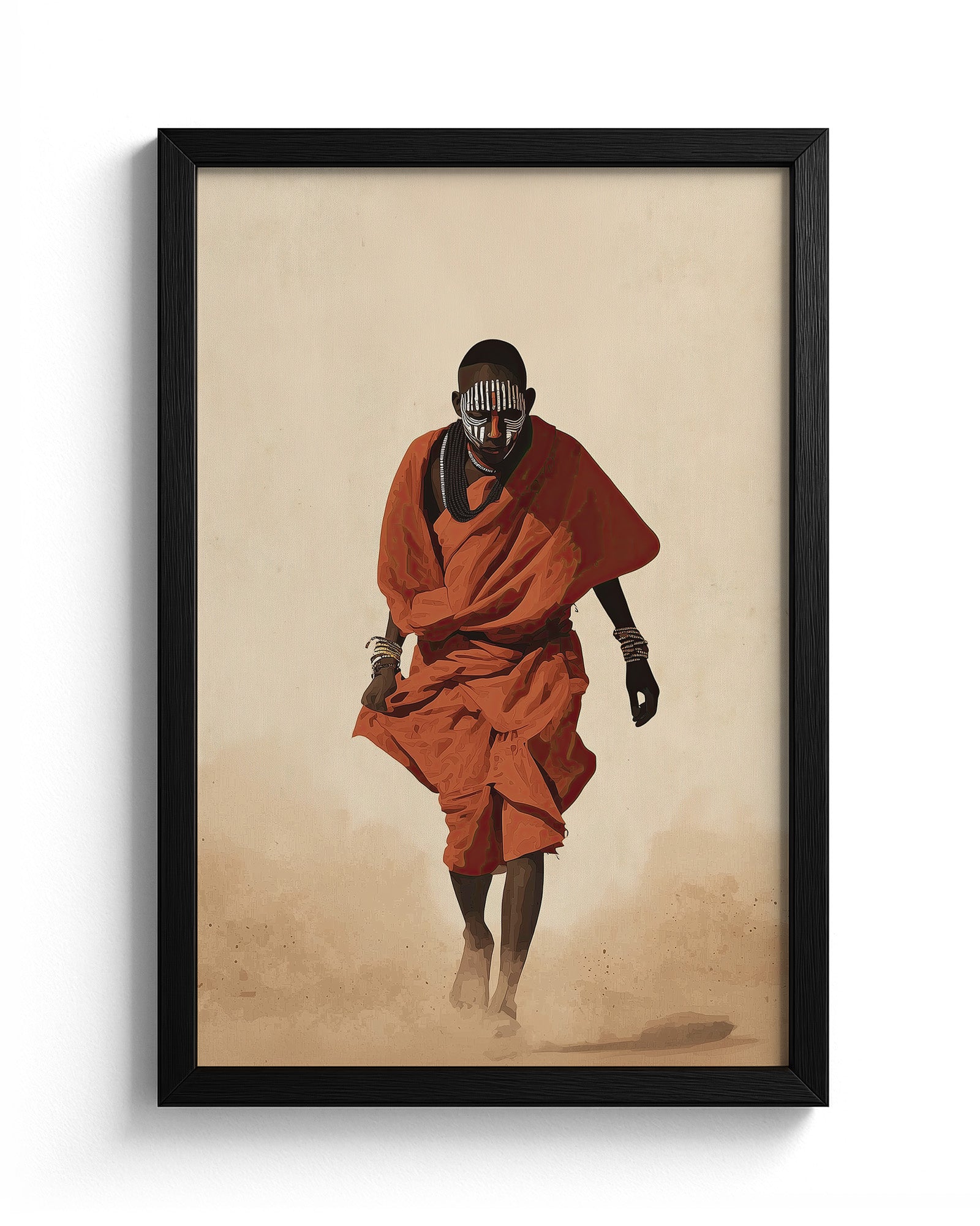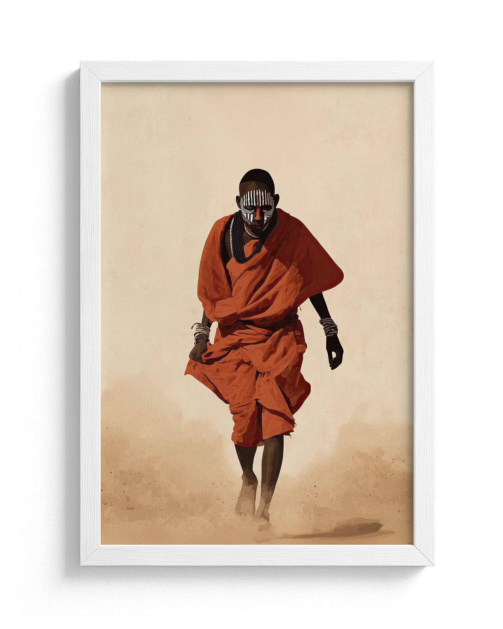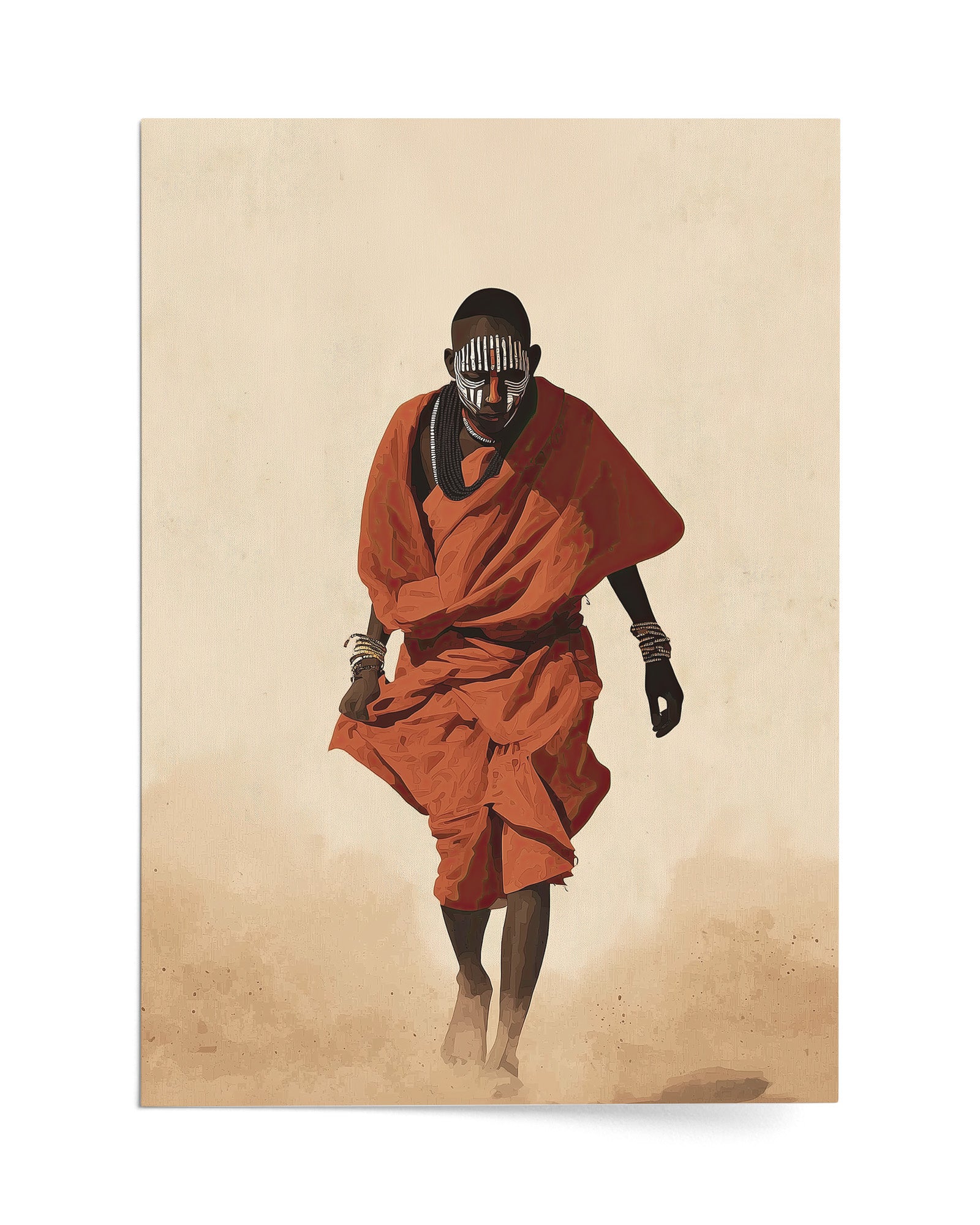 Painted Path is a striking African cultural artwork inspired by the traditions of the Mursi people of Ethiopia’s Omo Valley. The piece portrays a figure walking through warm desert dust, draped in vibrant red cloth and adorned with layered bead necklaces and symbolic face paint.