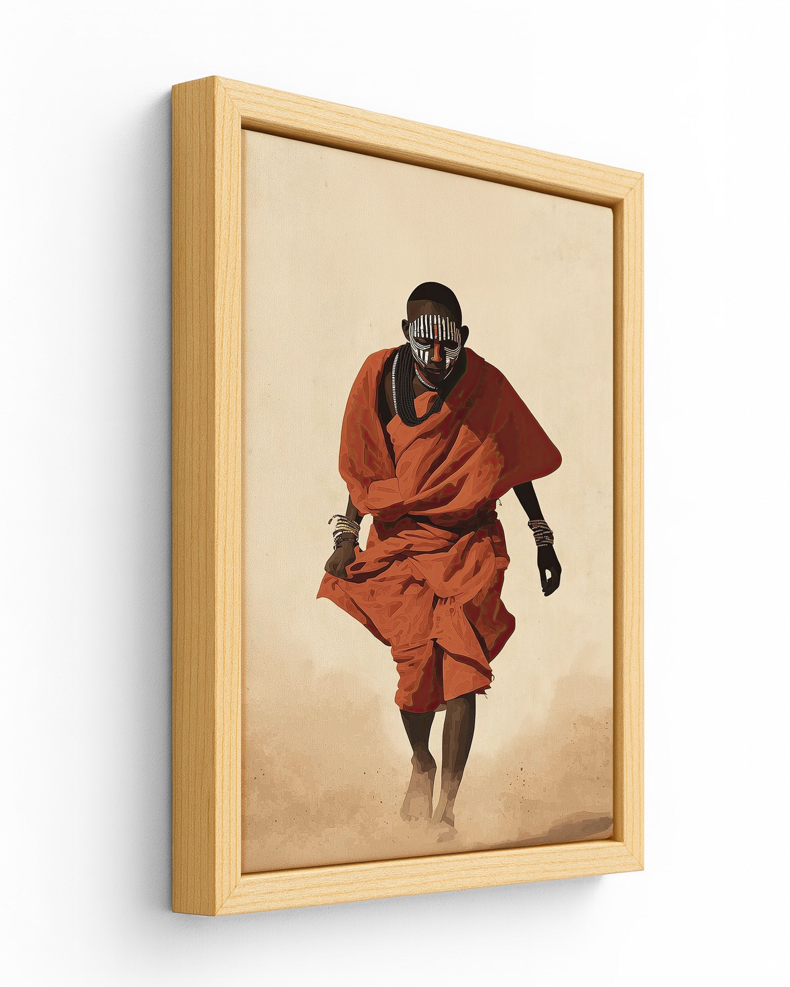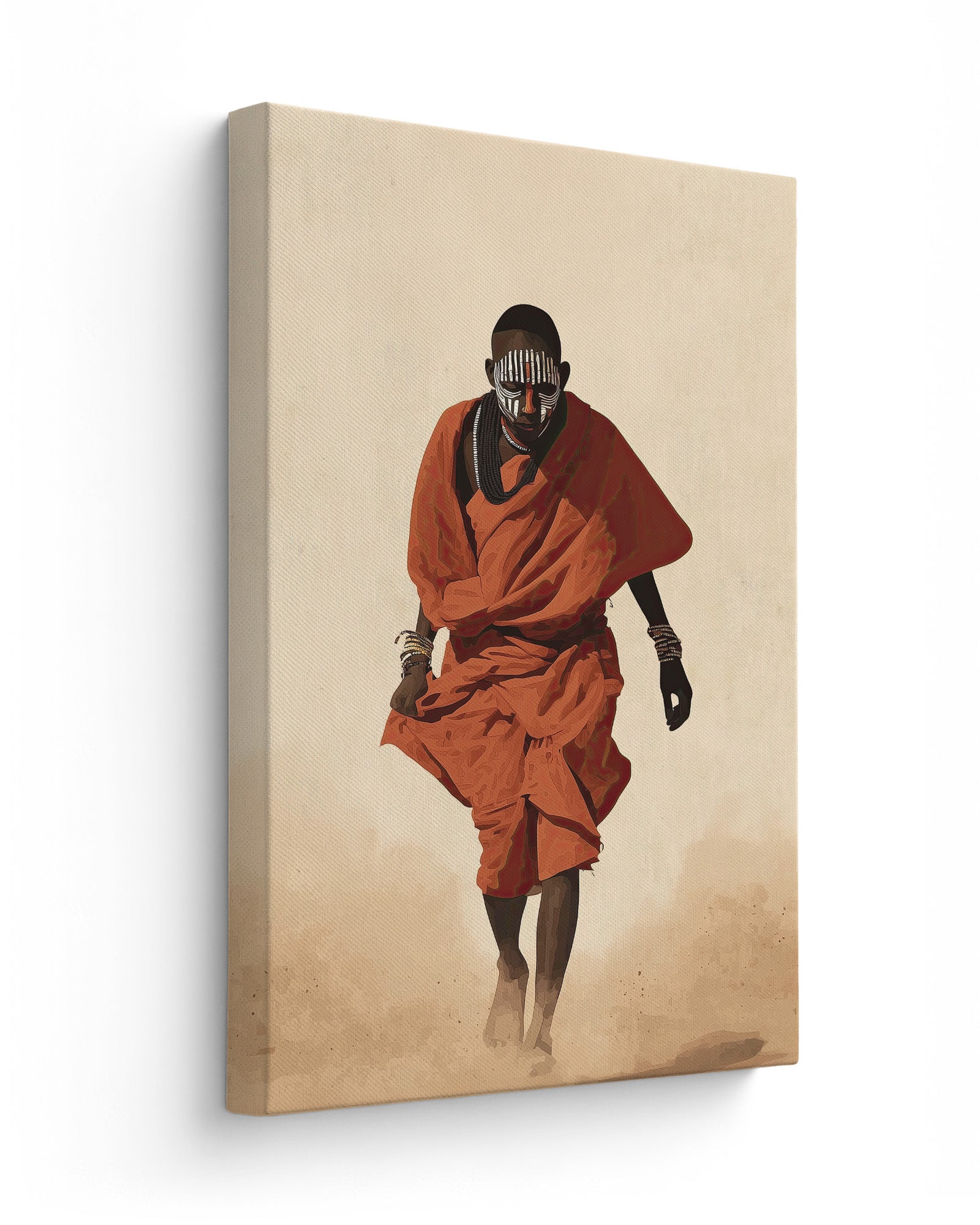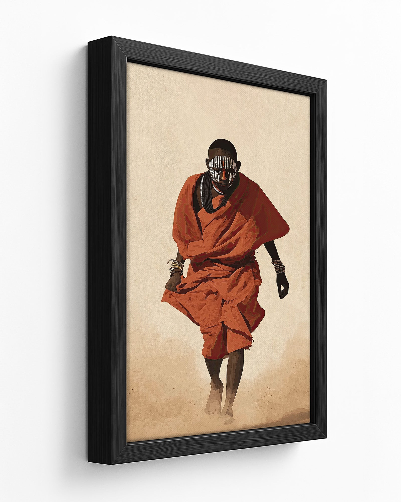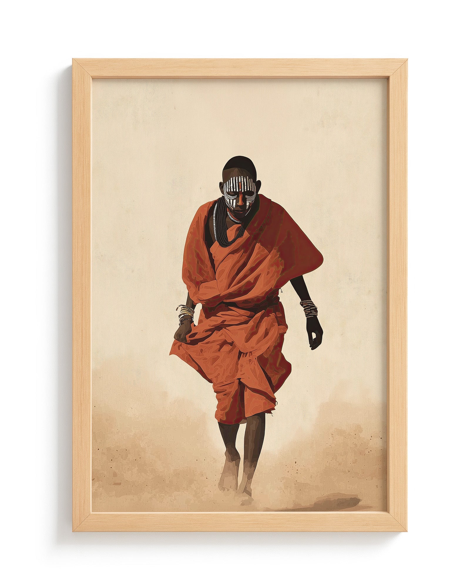 Painted Path is a striking African cultural artwork inspired by the traditions of the Mursi people of Ethiopia’s Omo Valley. The piece portrays a figure walking through warm desert dust, draped in vibrant red cloth and adorned with layered bead necklaces and symbolic face paint.