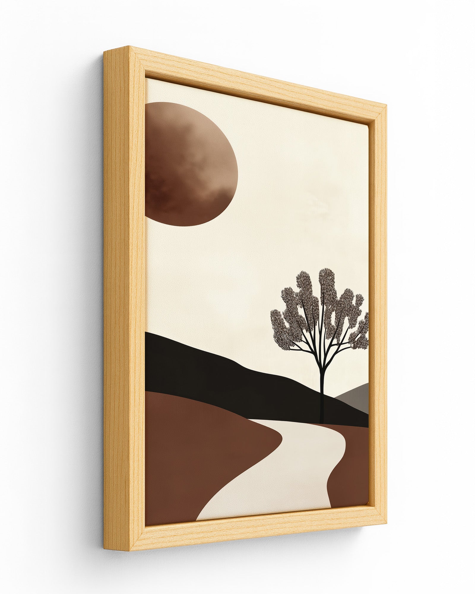 A solitary tree stands delicately formed, its fine lines spreading like whispers across the sky. Rooted atop rolling hills of black and burnt umber, it speaks of still growth and gentle strength. A modern landscape for those who feel the presence of silence in nature.