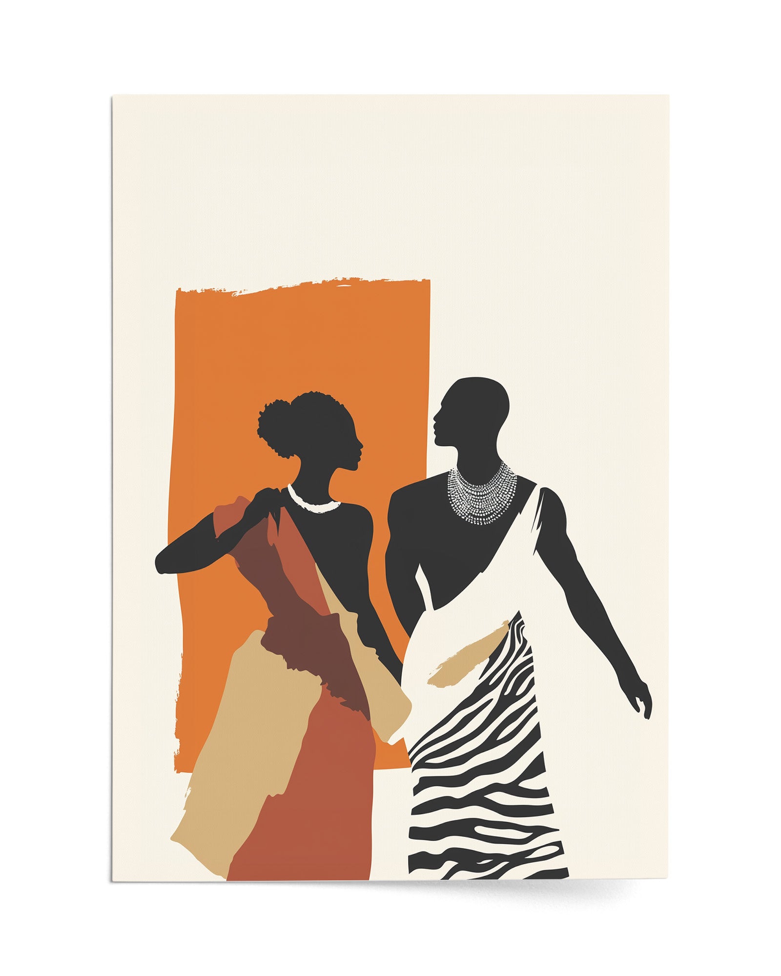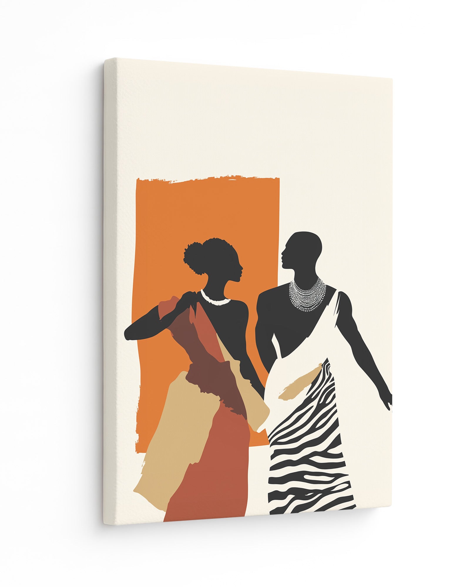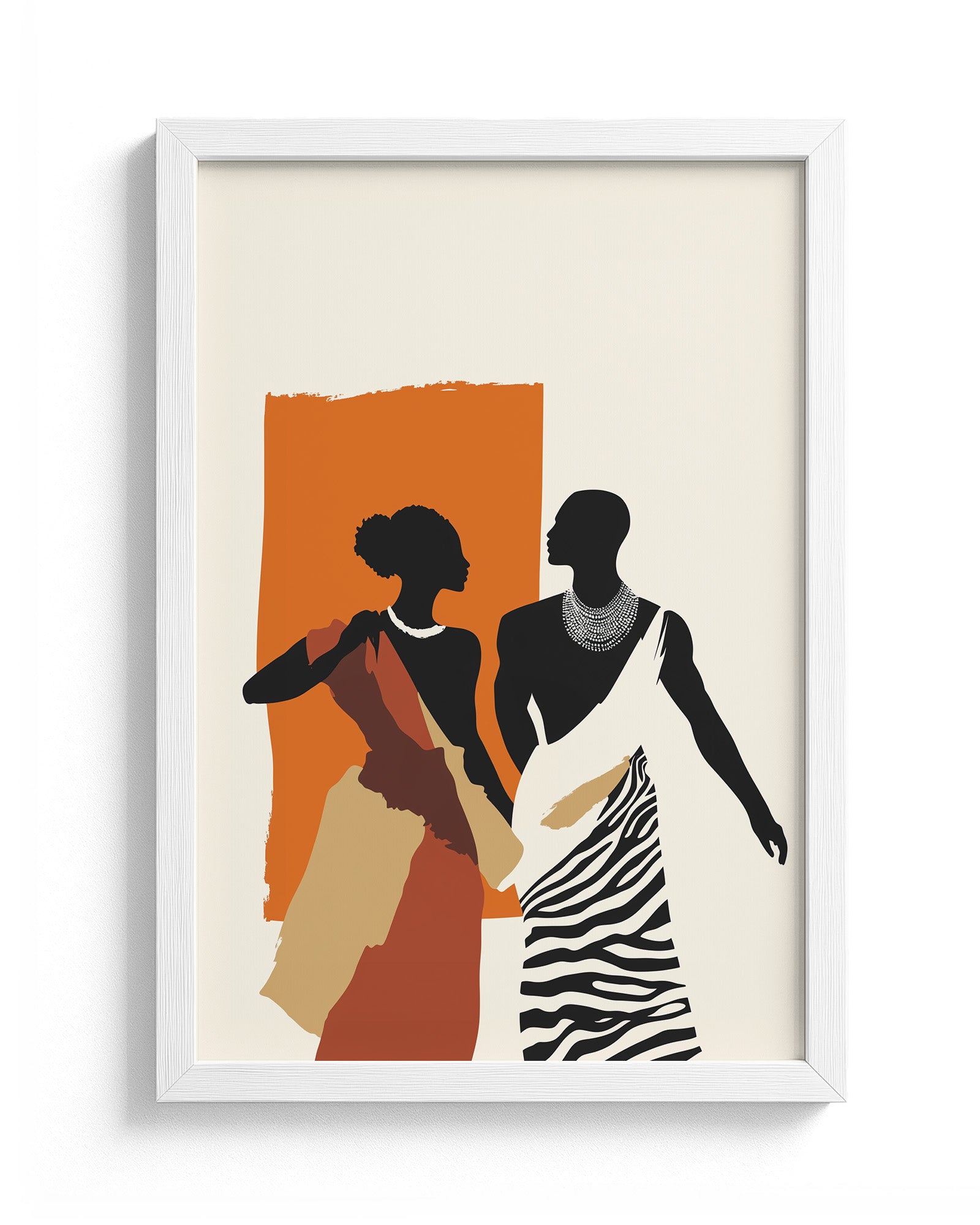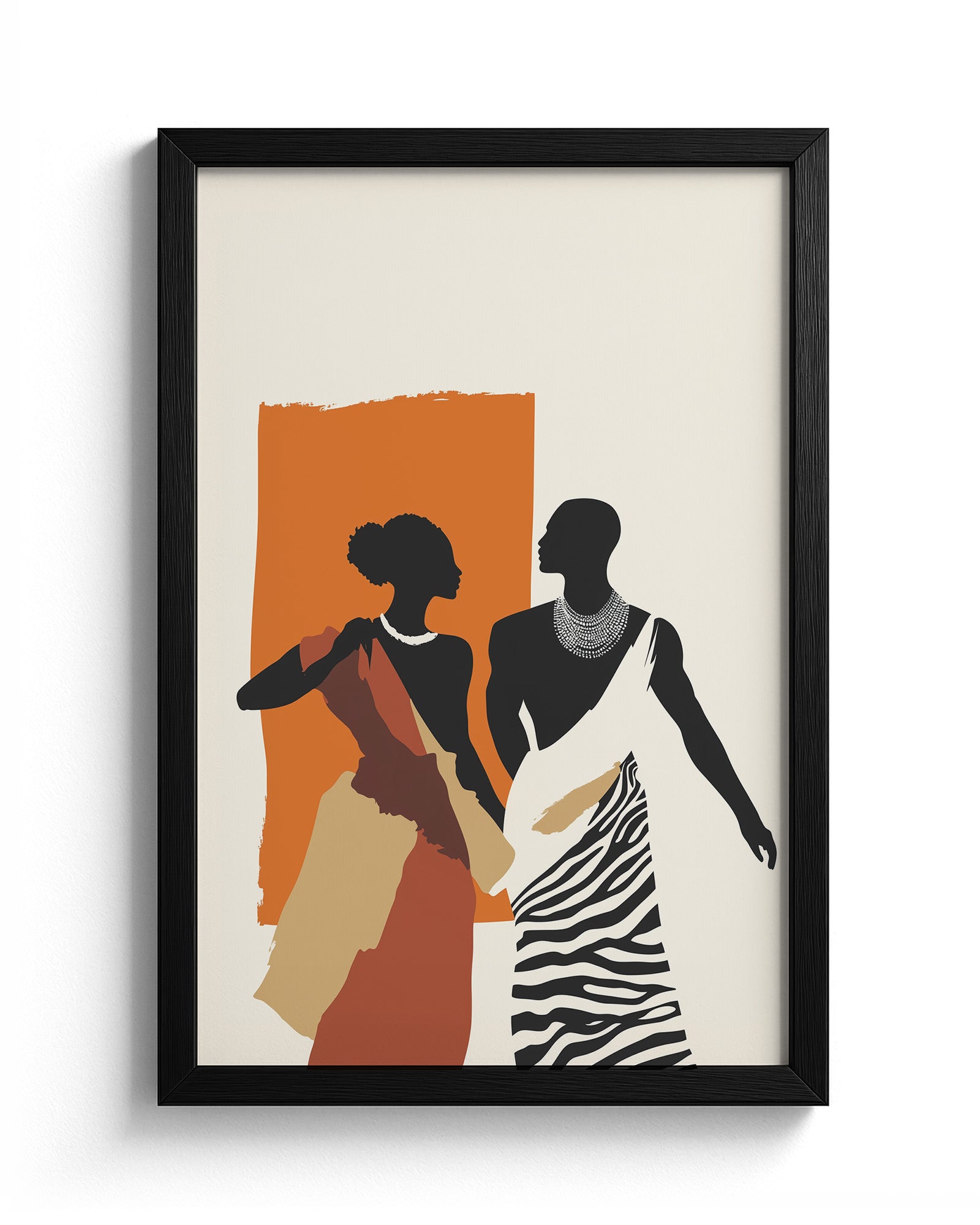 This captivating artwork portrays an intimate moment between an African couple in a tender embrace, set against a warm orange and beige background that evokes the rich tones of the African landscape. The woman's striking red dress creates a bold focal point, symbolising passion and strength, while subtle zebra patterns weave throughout the composition, connecting the subjects to their heritage and the natural world.