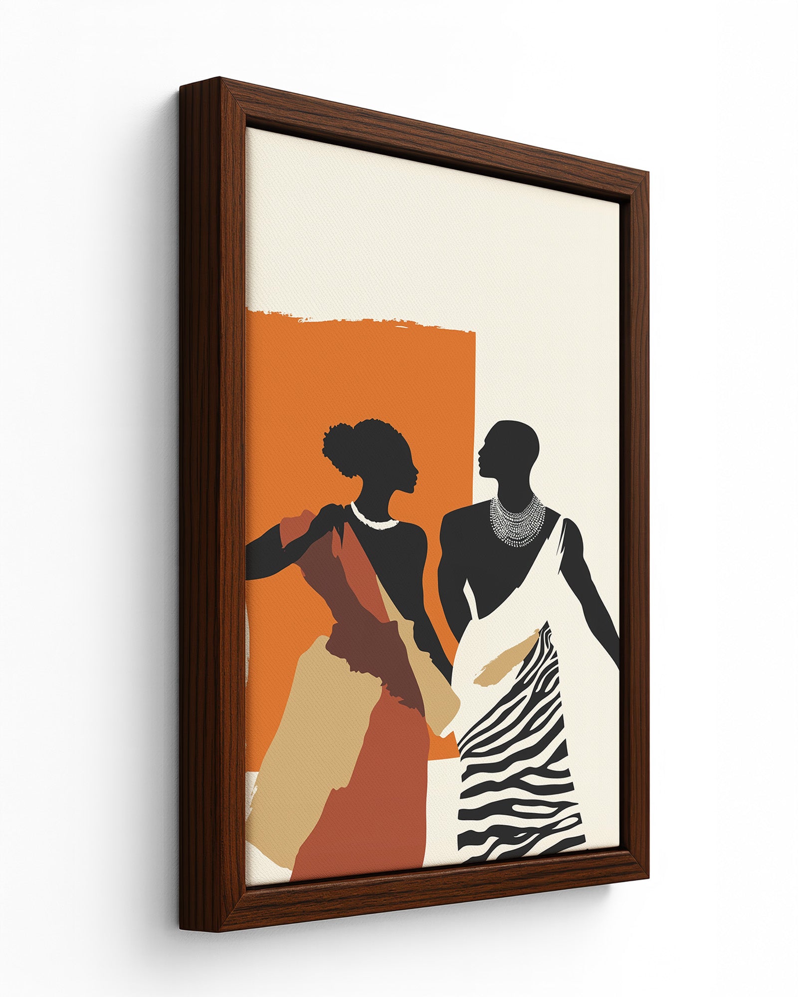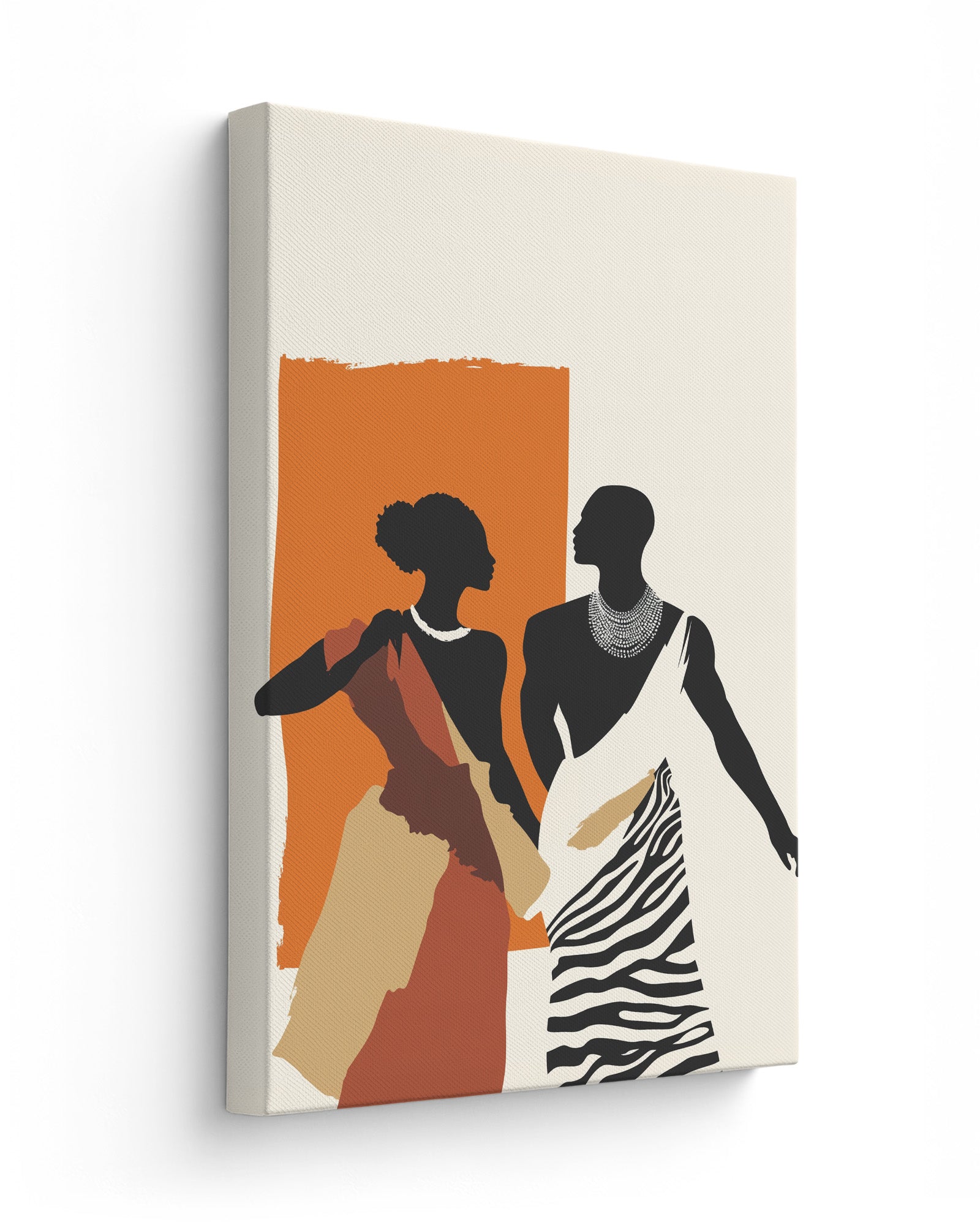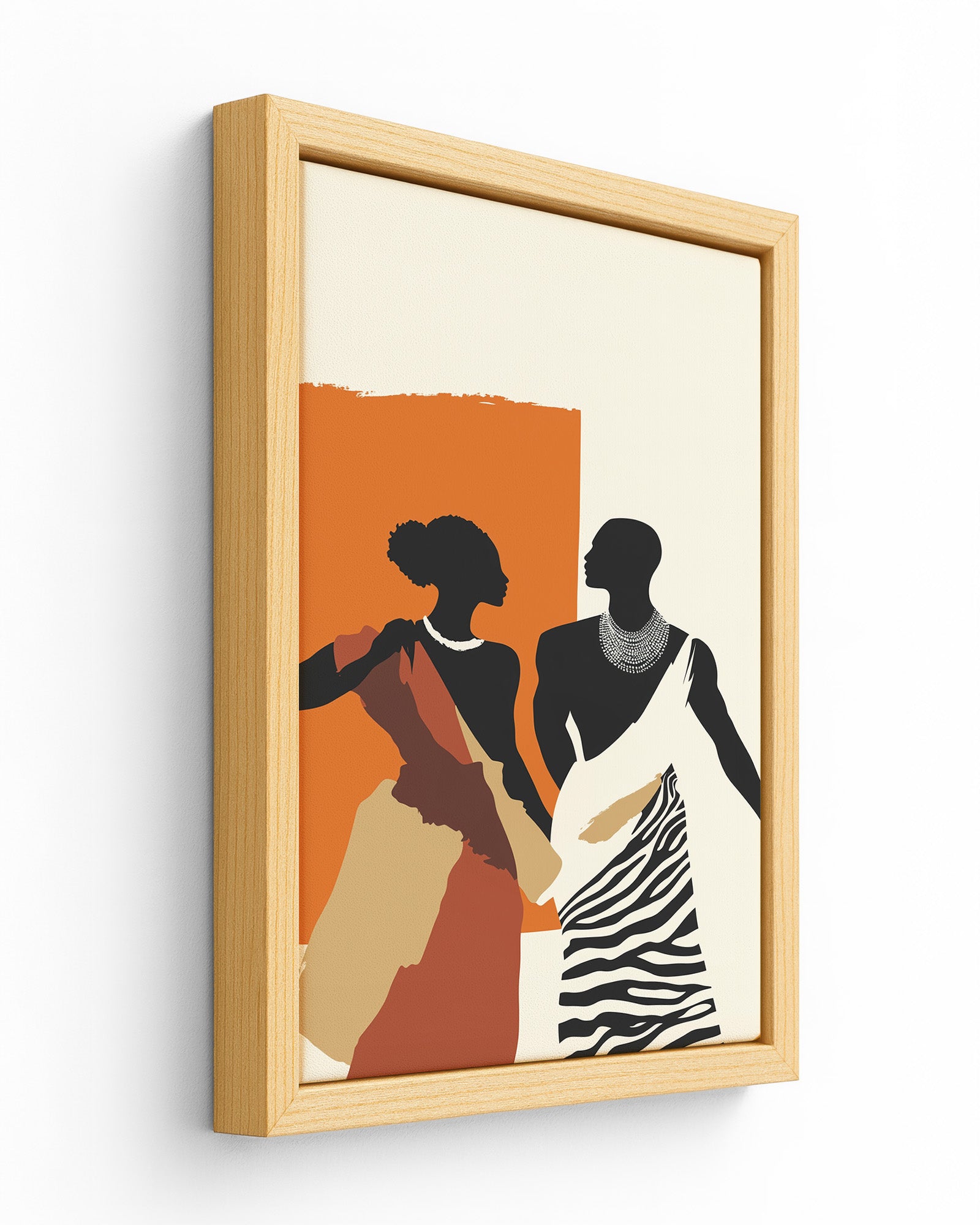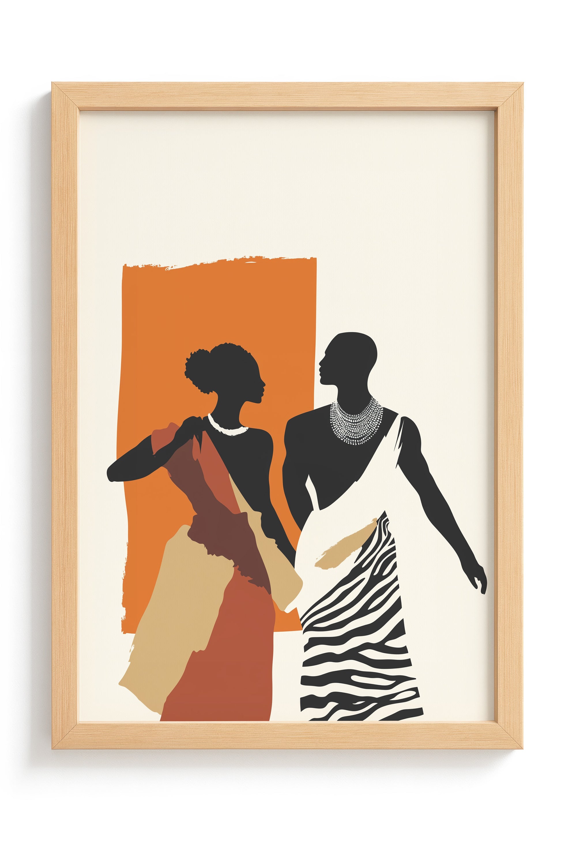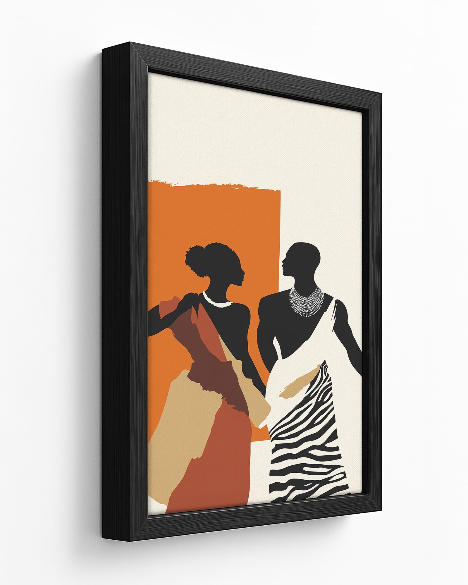 This captivating artwork portrays an intimate moment between an African couple in a tender embrace, set against a warm orange and beige background that evokes the rich tones of the African landscape. The woman's striking red dress creates a bold focal point, symbolising passion and strength, while subtle zebra patterns weave throughout the composition, connecting the subjects to their heritage and the natural world.