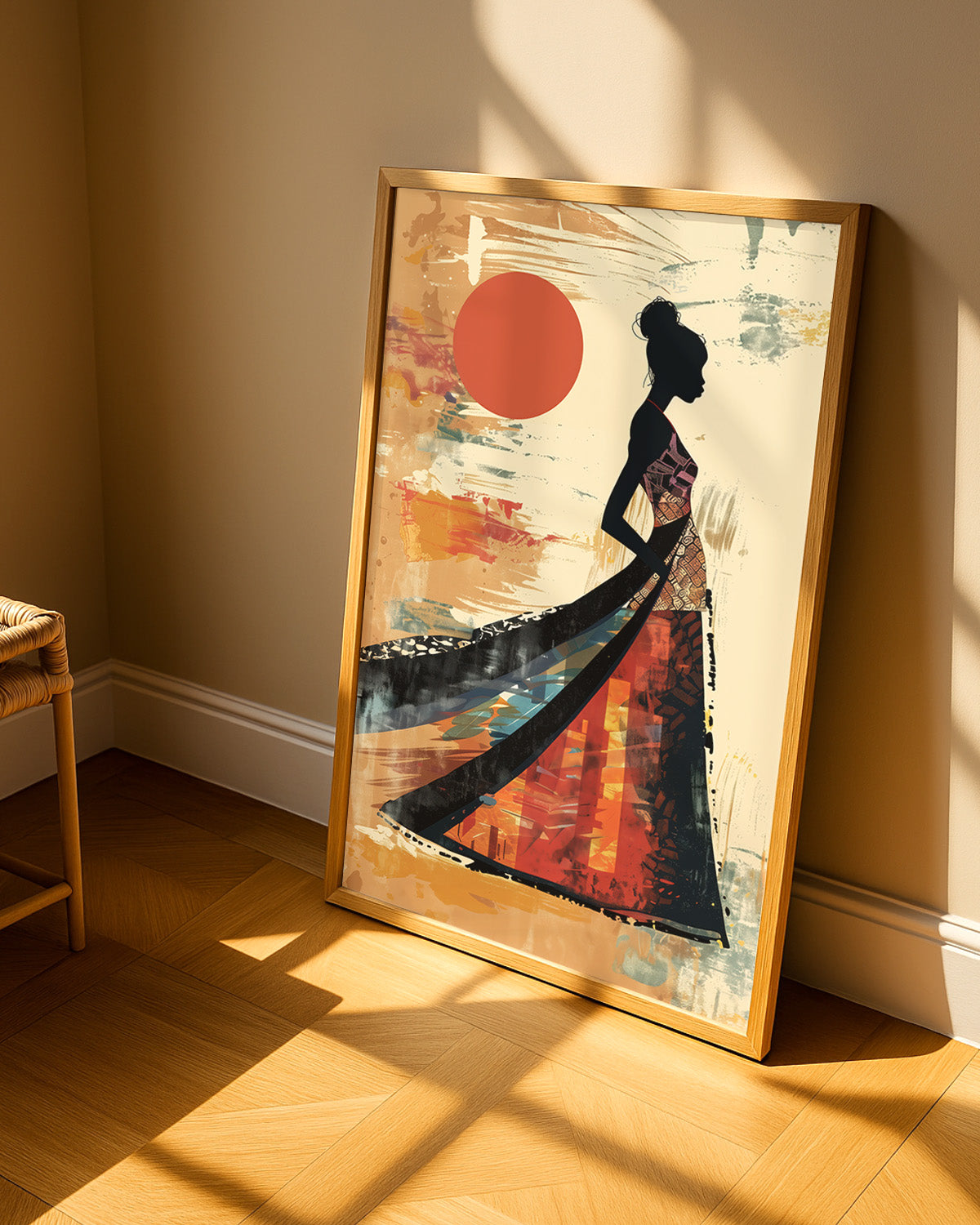 Celebrate the beauty of African heritage with this minimalist digital artwork featuring an elegant woman dressed in a long, colorful tribal-patterned dress. Inspired by the rich styles of the Ndebele and Khoisan traditions, this piece combines pastel highlights and a beige background for a modern yet timeless aesthetic.