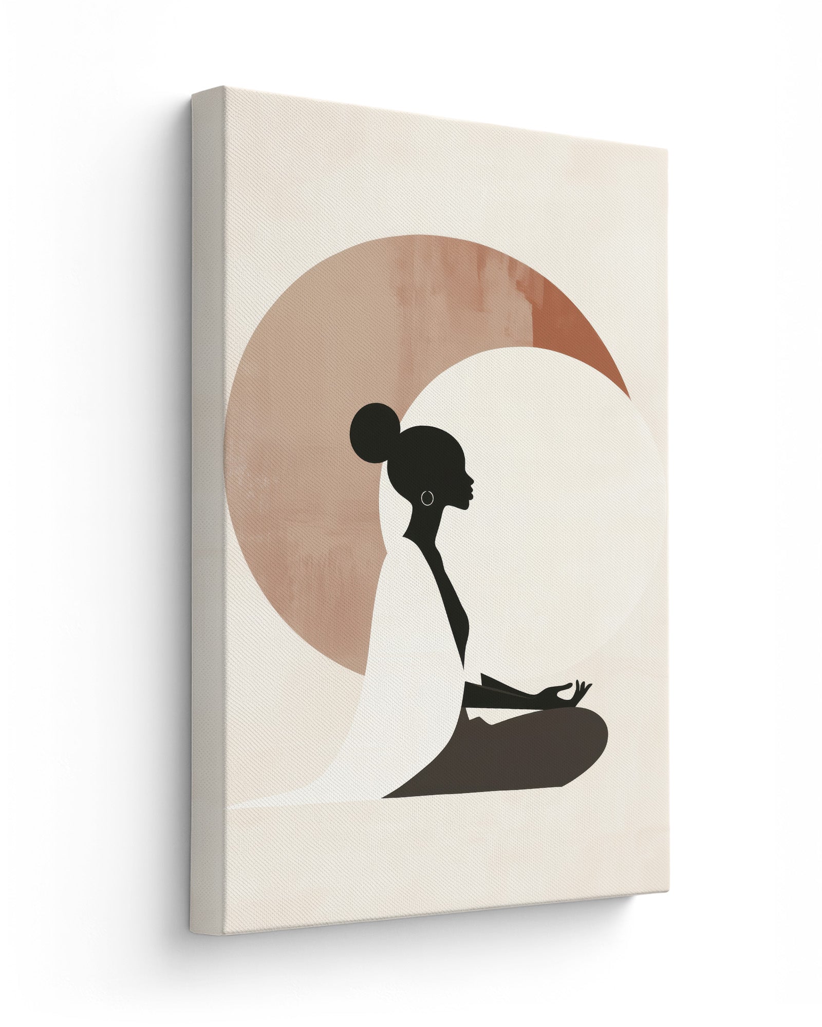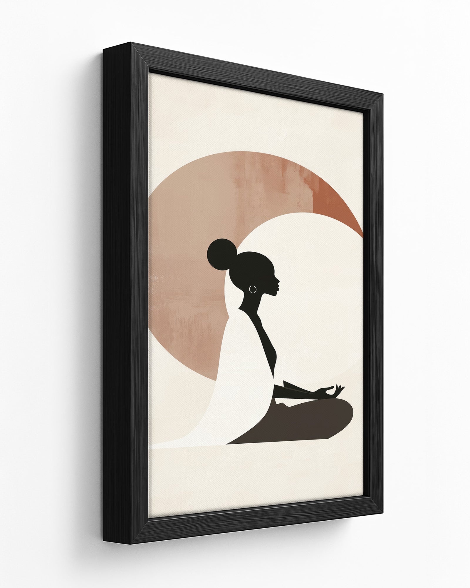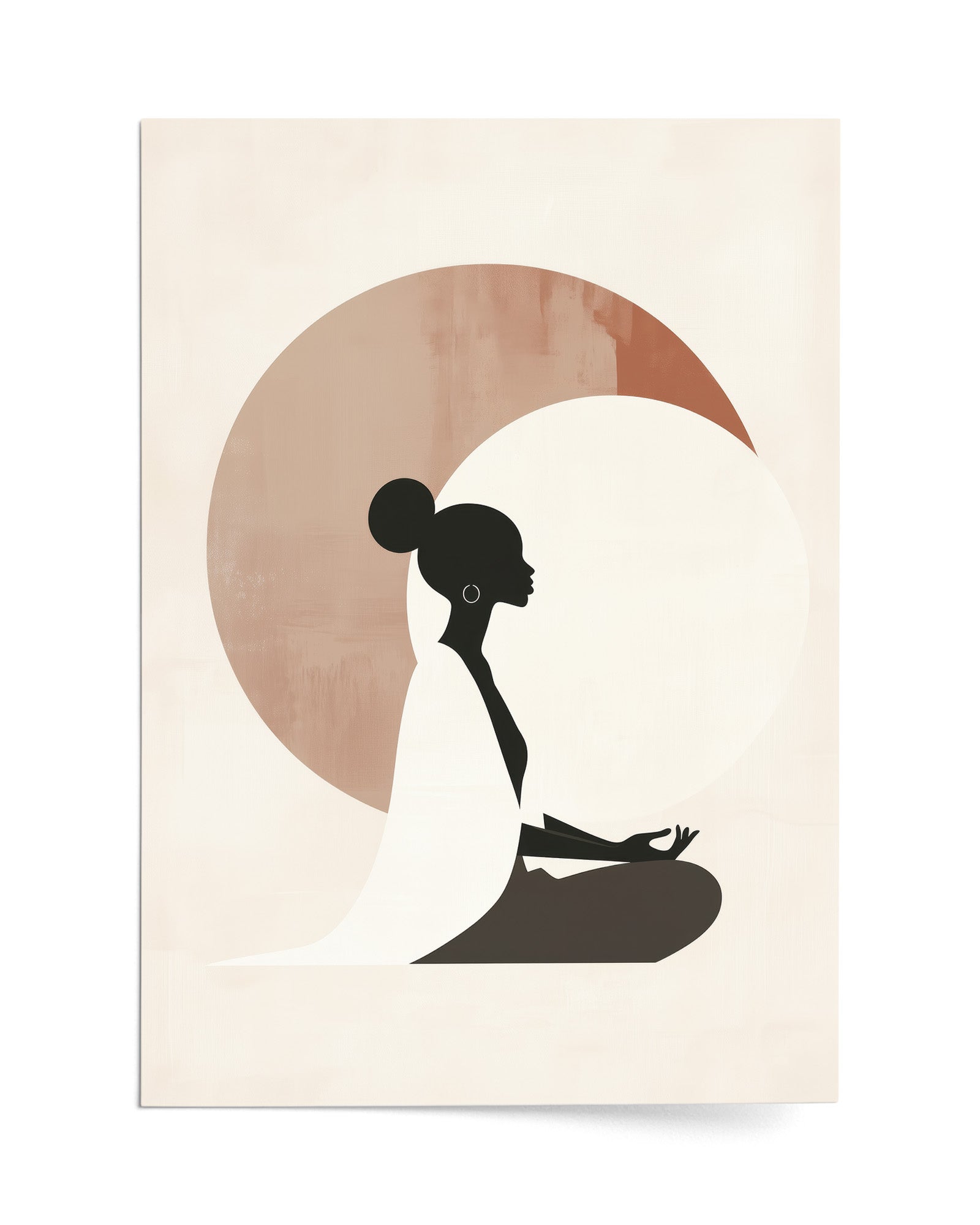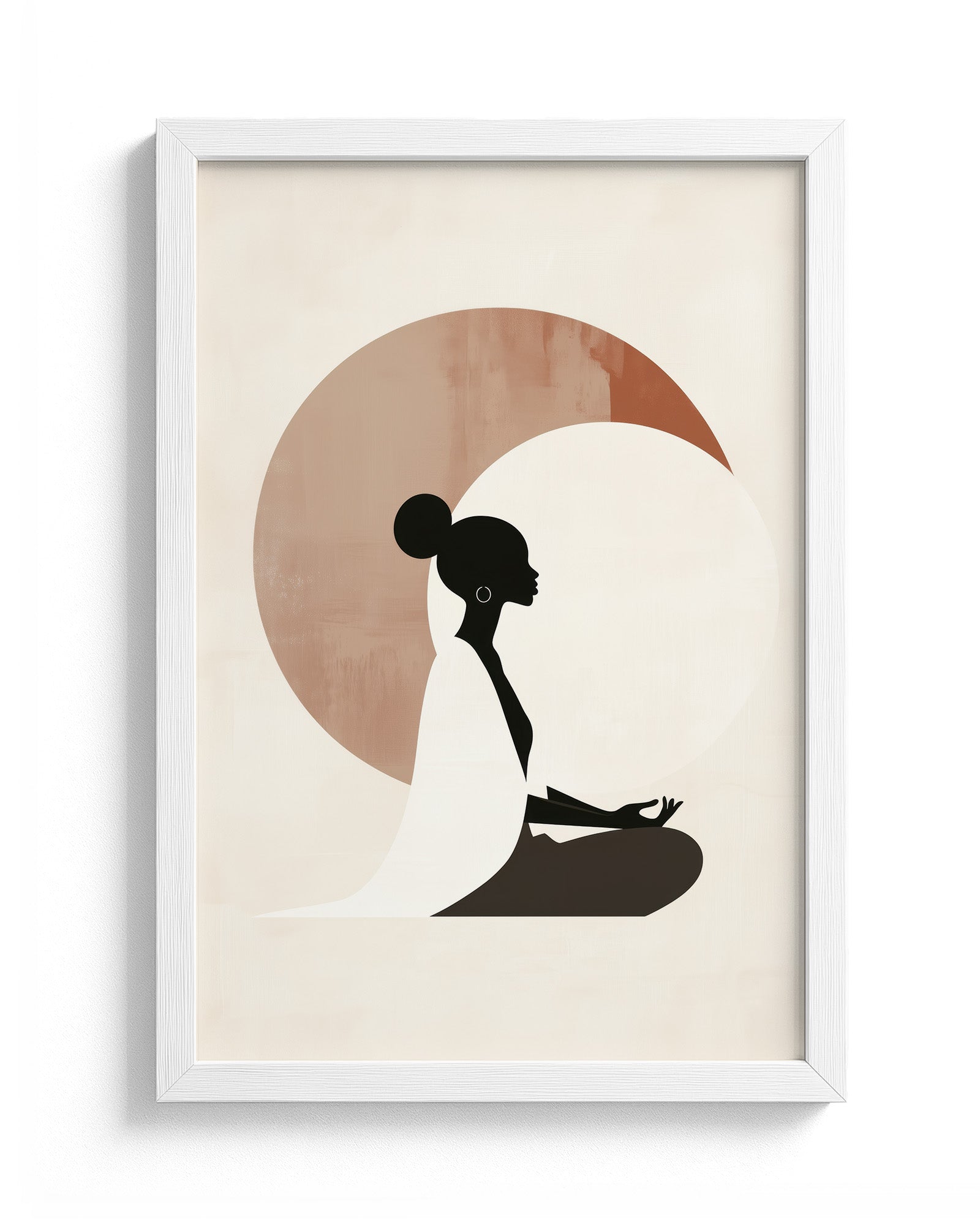 This modern minimalist artwork features a serene woman in meditation, seated in calm reflection beneath softly layered circular forms in warm clay, cream, and taupe tones. Her silhouette is strong yet graceful, adorned with a simple hoop earring and wrapped in flowing white — embodying feminine presence and balance. Perfect for meditation spaces, modern interiors, or those seeking soulful simplicity, this piece radiates calm, clarity, and timeless elegance.
