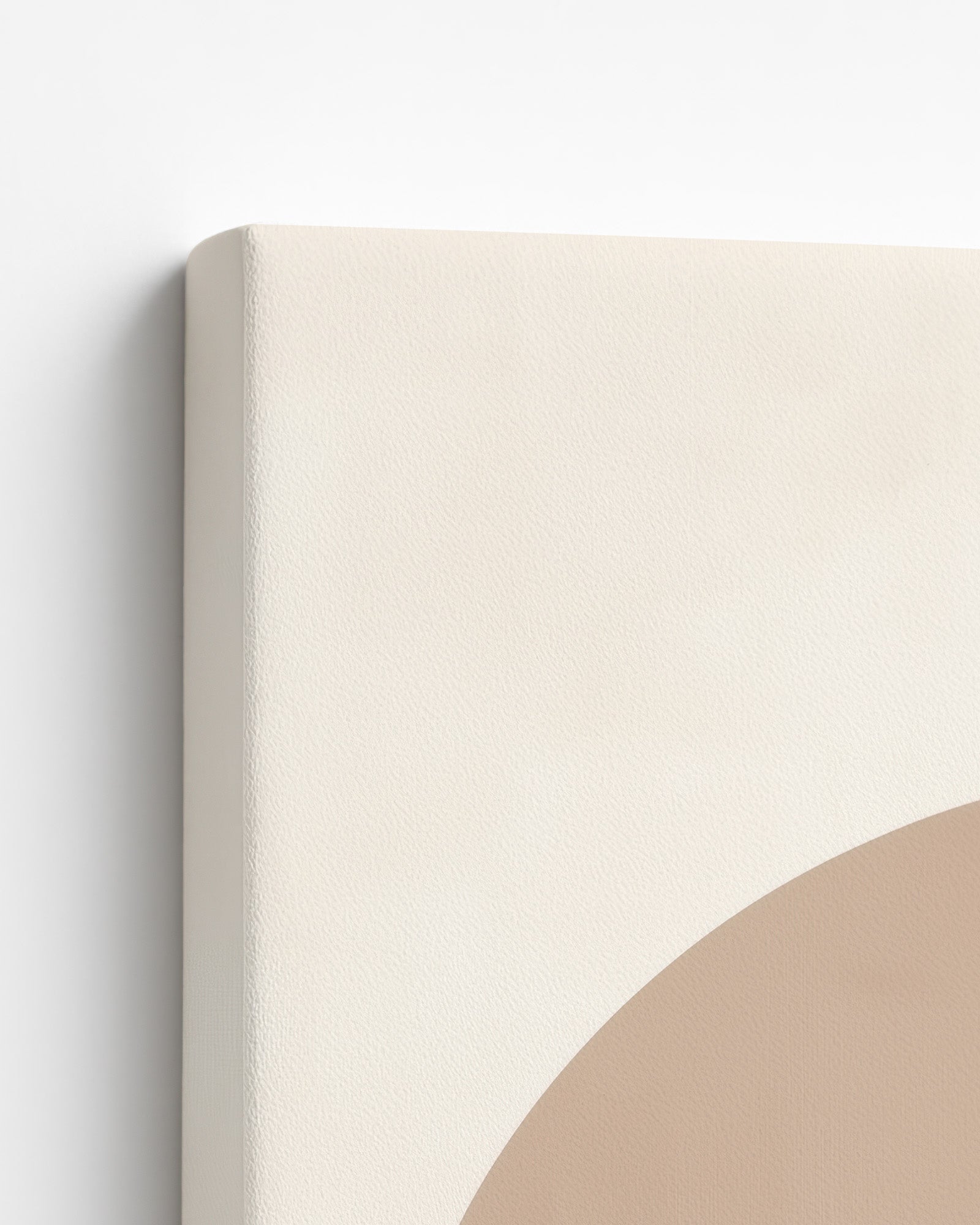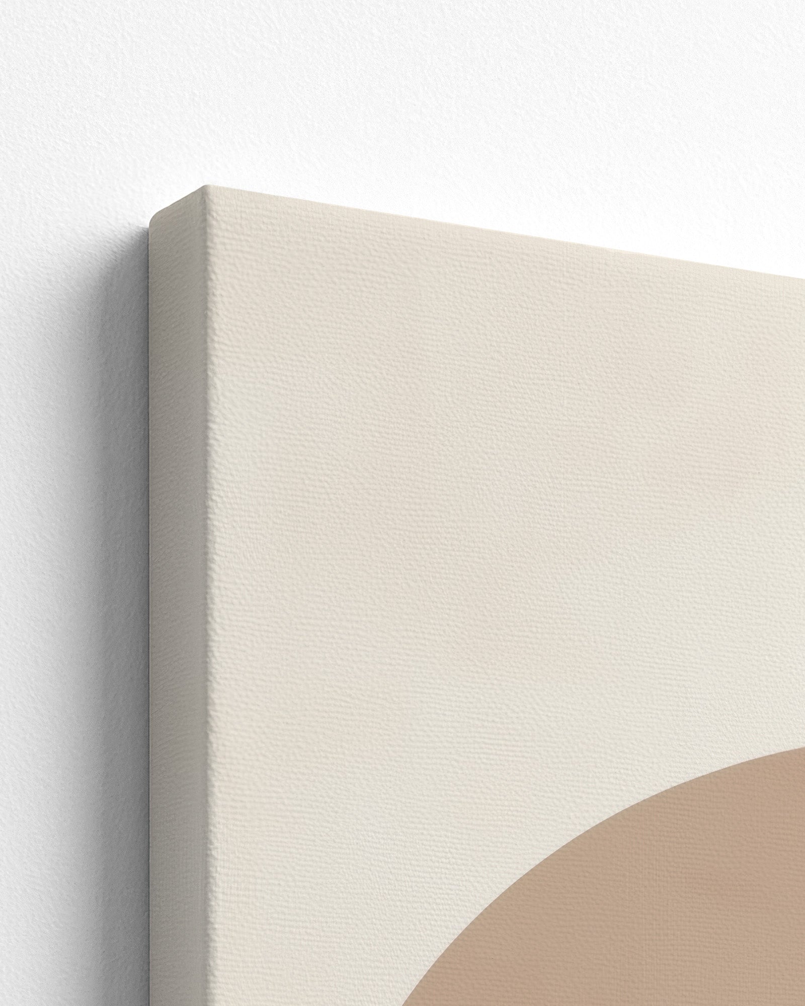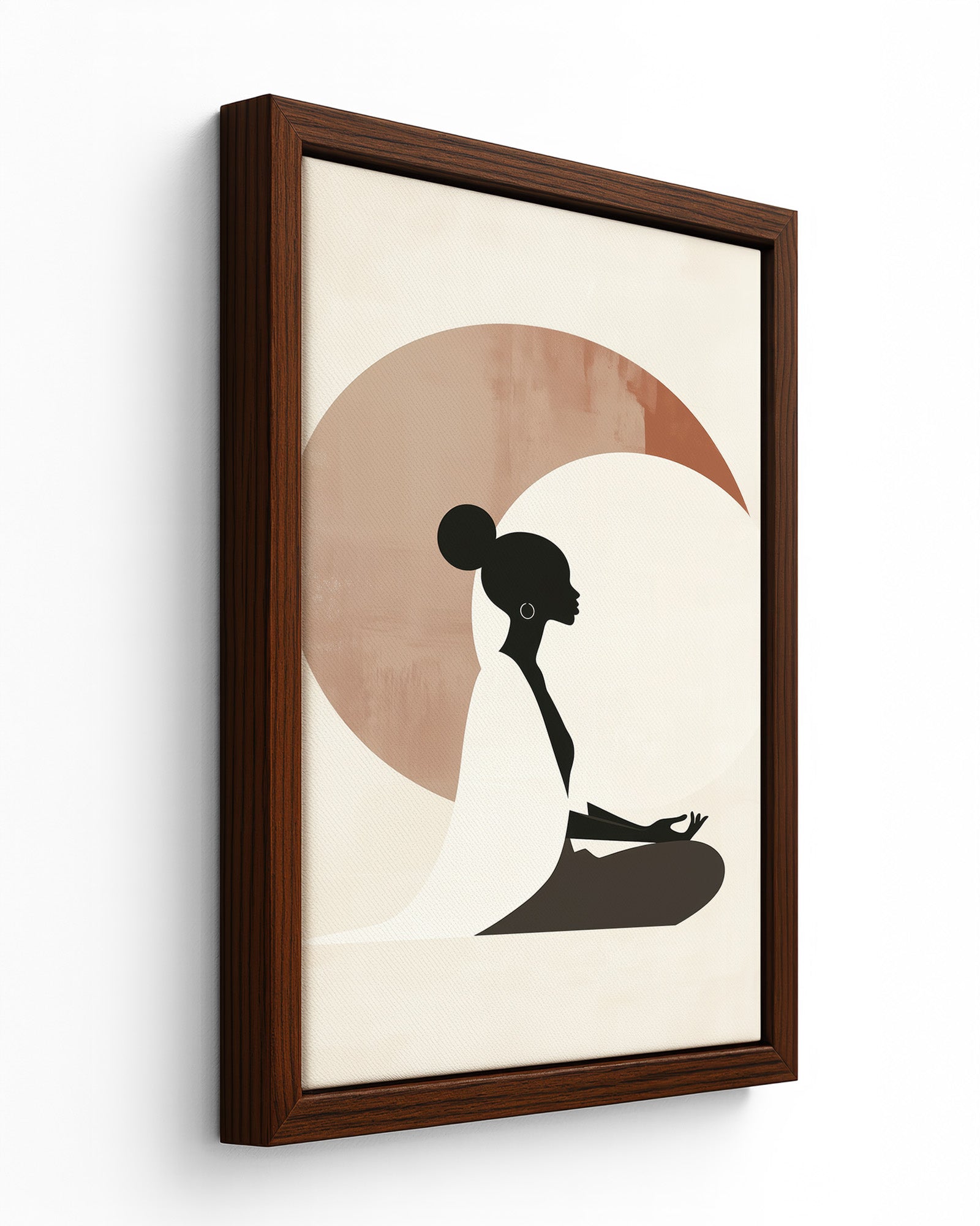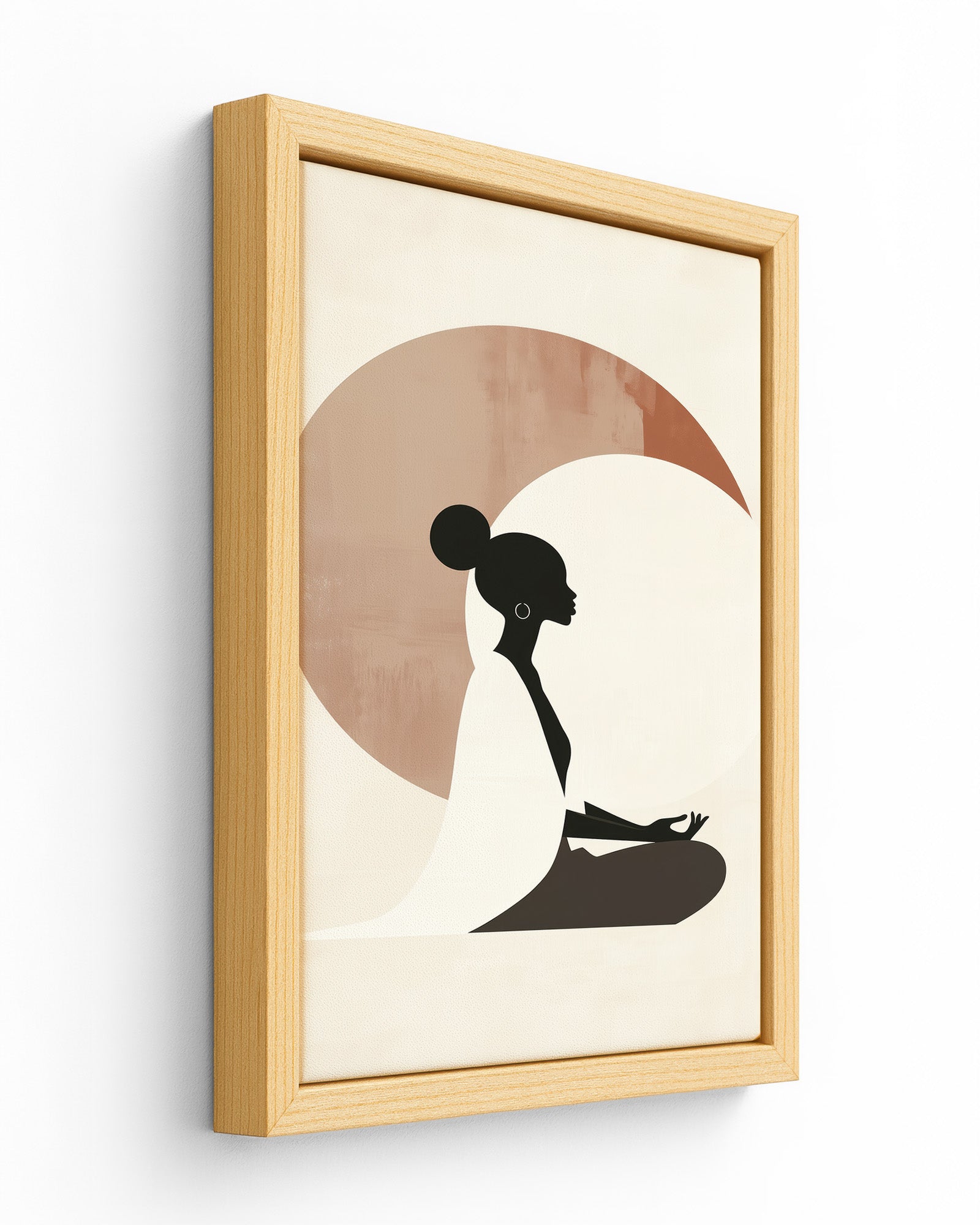 This modern minimalist artwork features a serene woman in meditation, seated in calm reflection beneath softly layered circular forms in warm clay, cream, and taupe tones. Her silhouette is strong yet graceful, adorned with a simple hoop earring and wrapped in flowing white — embodying feminine presence and balance. Perfect for meditation spaces, modern interiors, or those seeking soulful simplicity, this piece radiates calm, clarity, and timeless elegance.