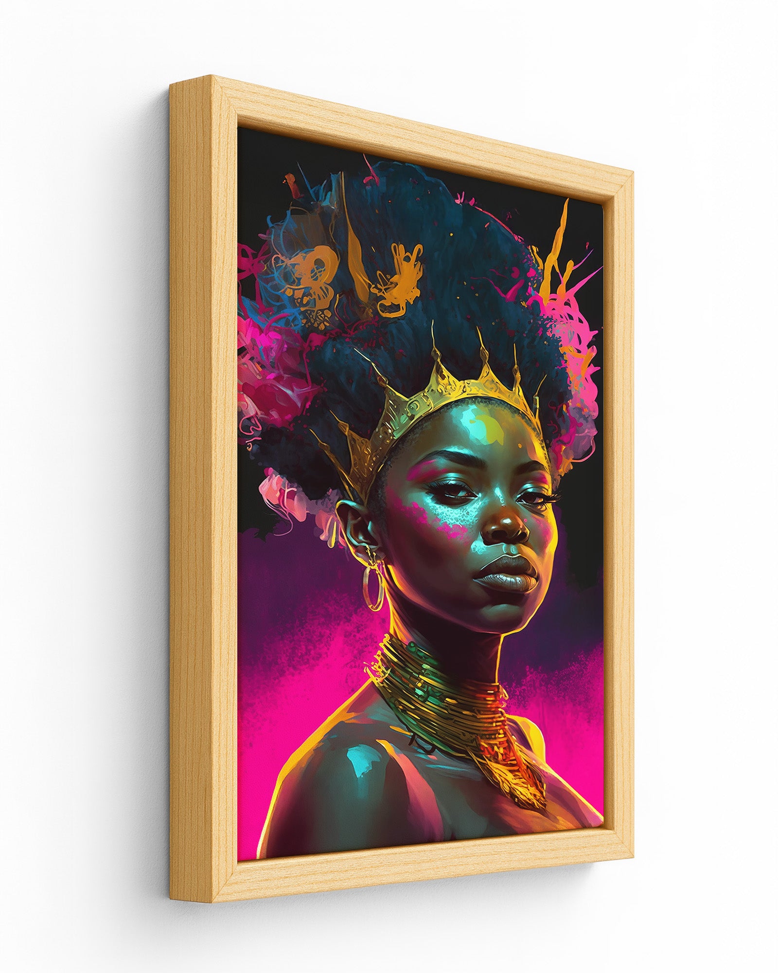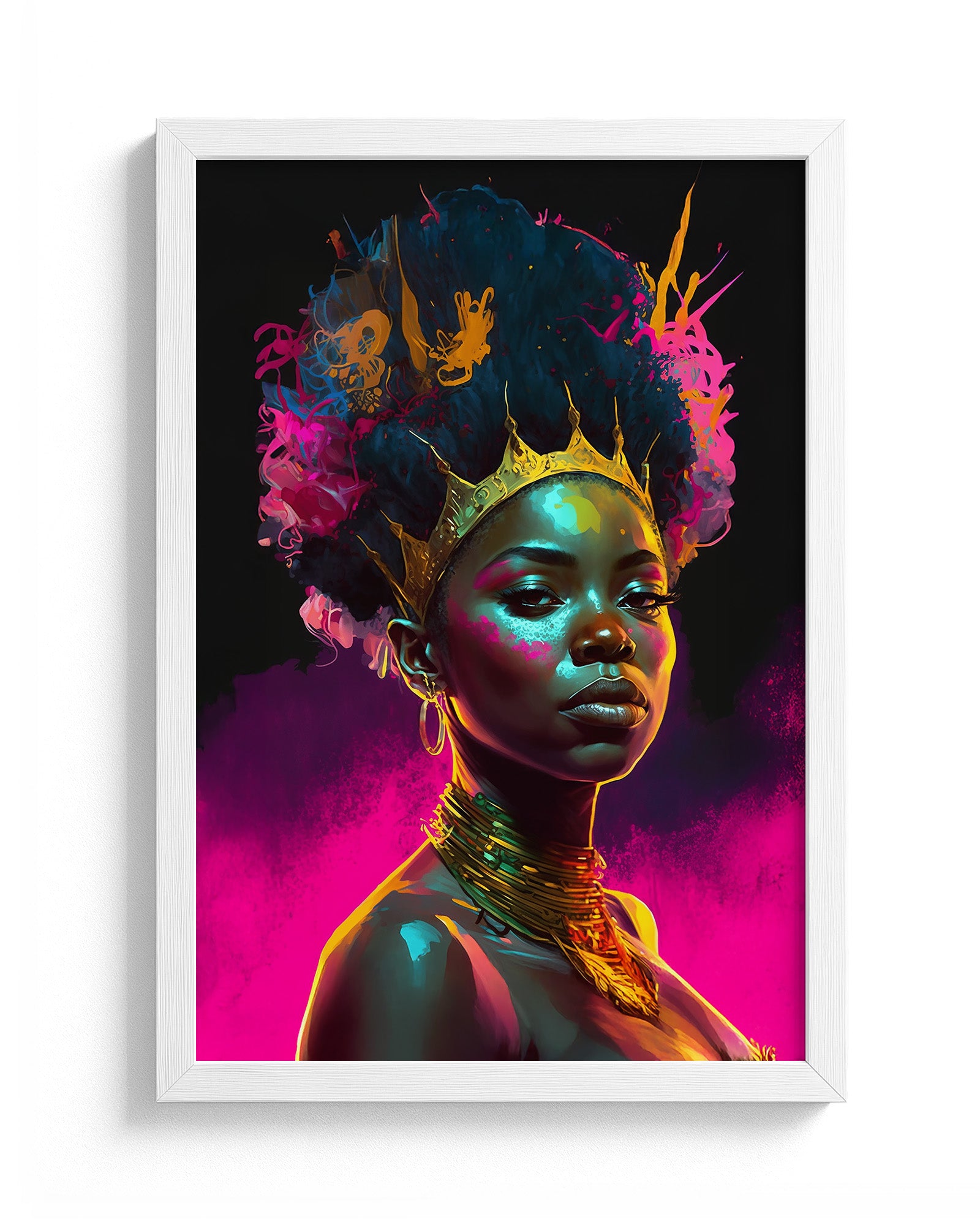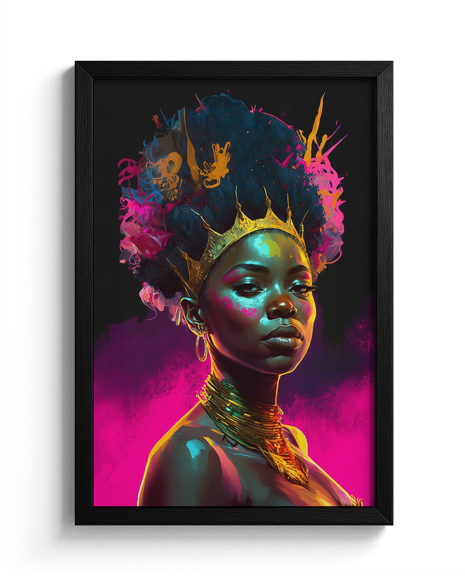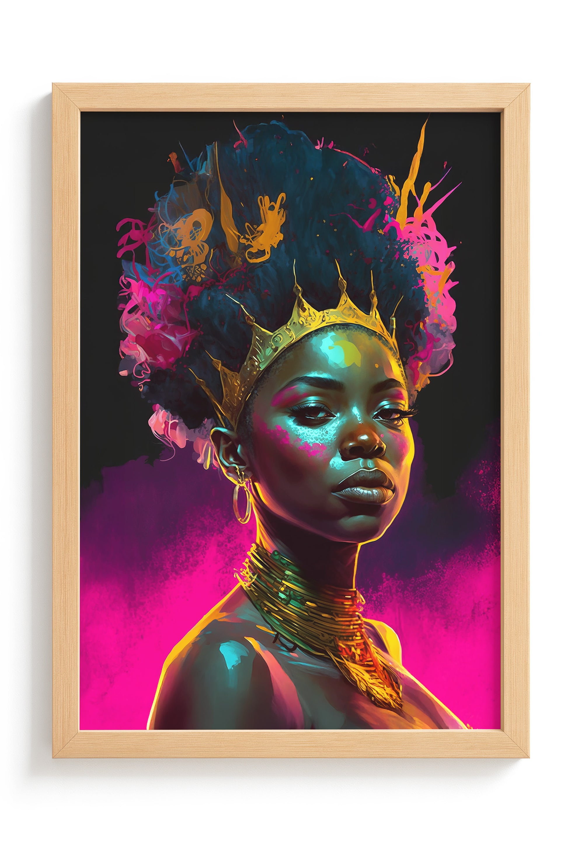 Immerse yourself in the majestic presence of our modern painting depicting a Nubian queen adorned with a crown, elegantly infused with hints of purple. This captivating artwork celebrates regal splendor and African heritage, showcasing the queen's noble expression and cultural richness.