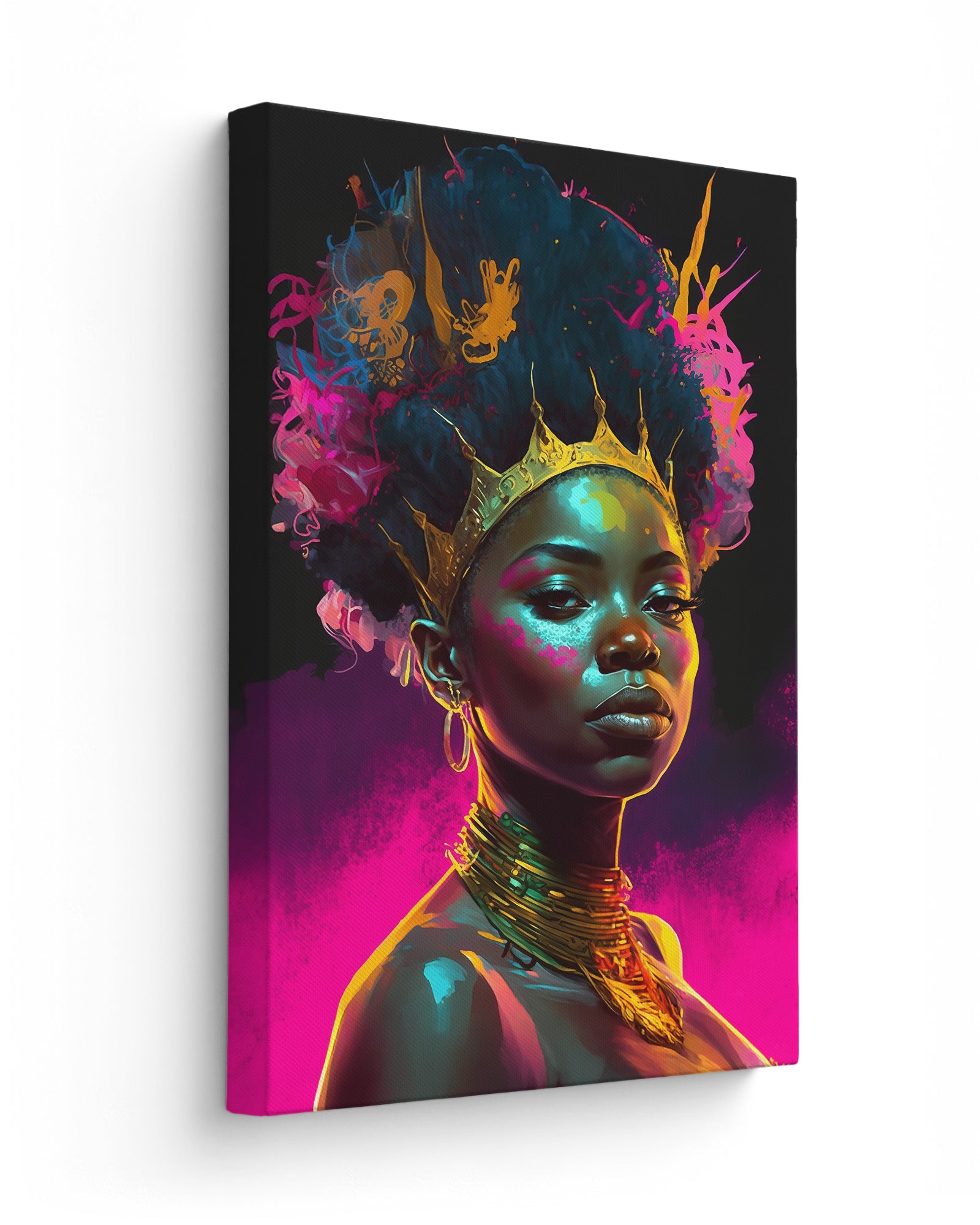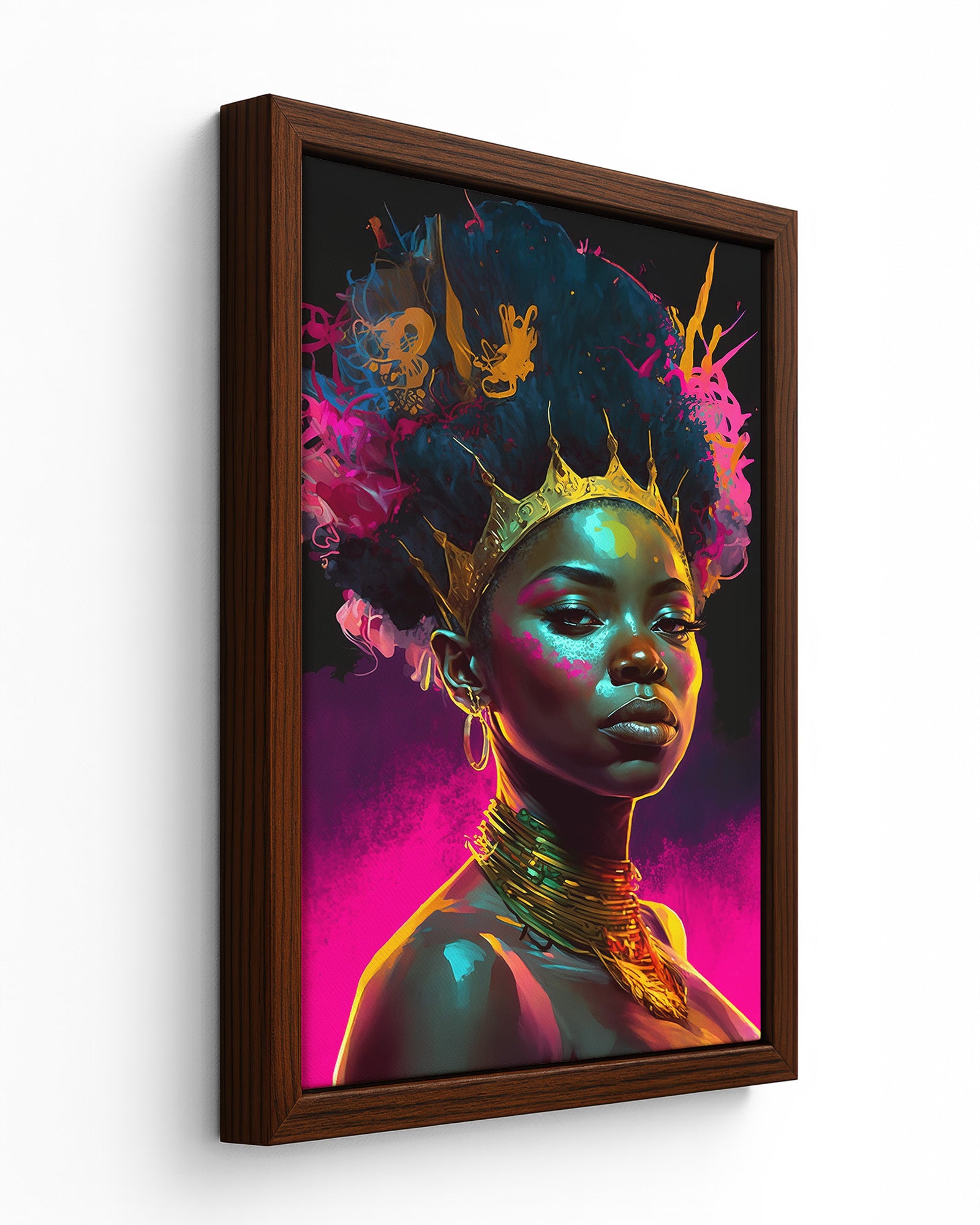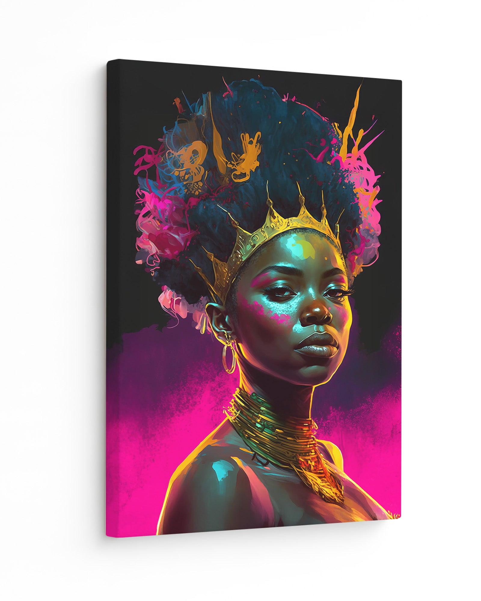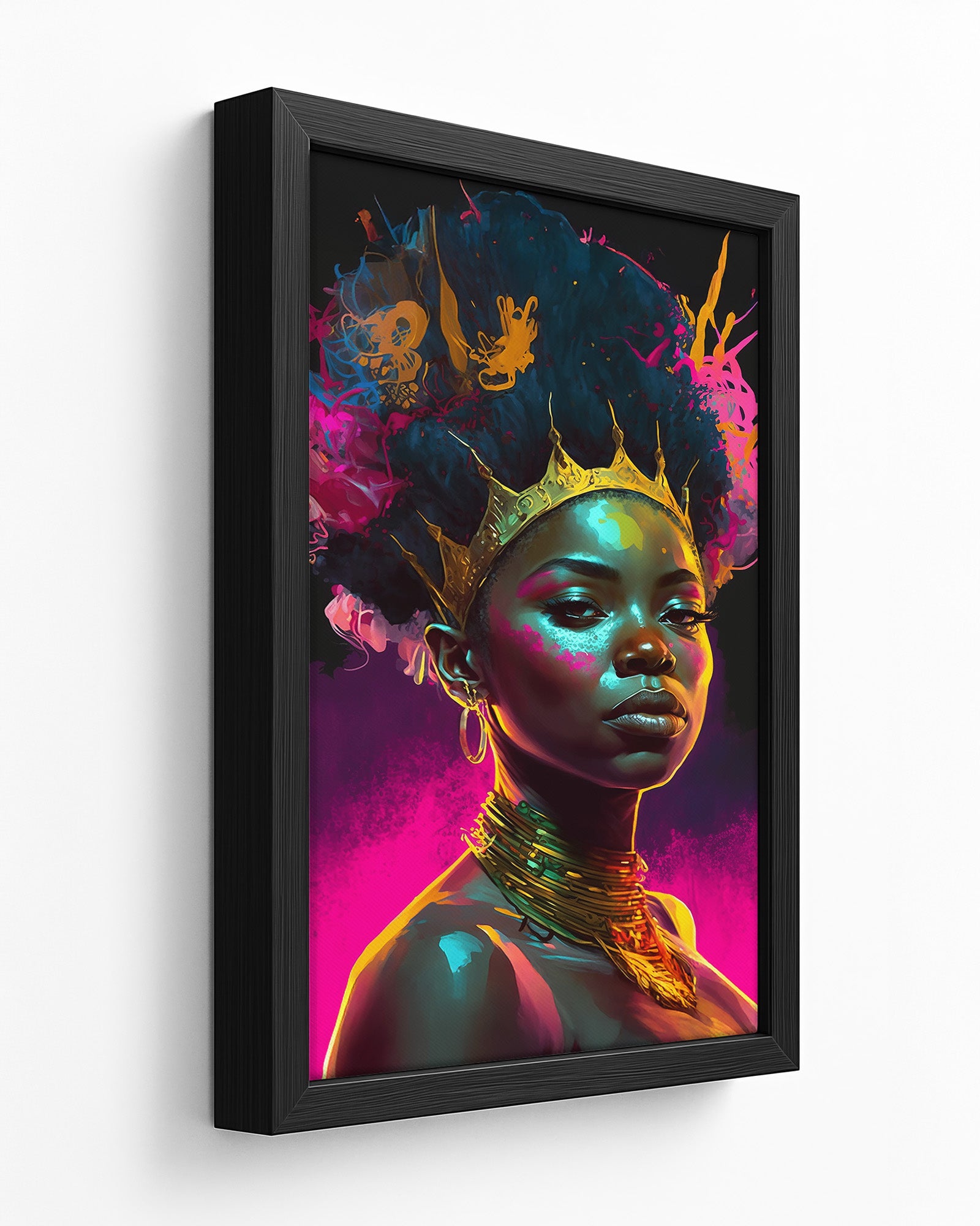 Immerse yourself in the majestic presence of our modern painting depicting a Nubian queen adorned with a crown, elegantly infused with hints of purple. This captivating artwork celebrates regal splendor and African heritage, showcasing the queen's noble expression and cultural richness.