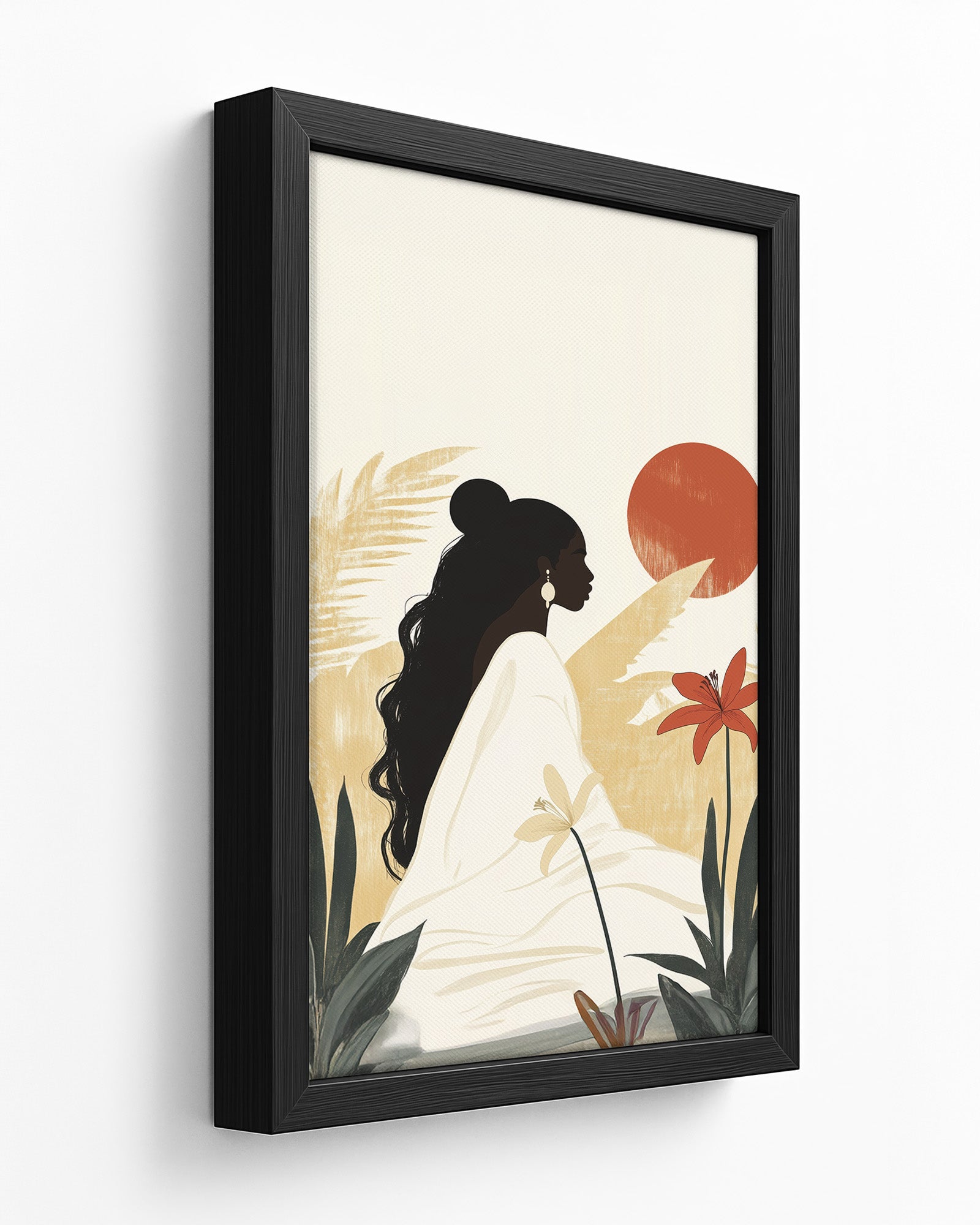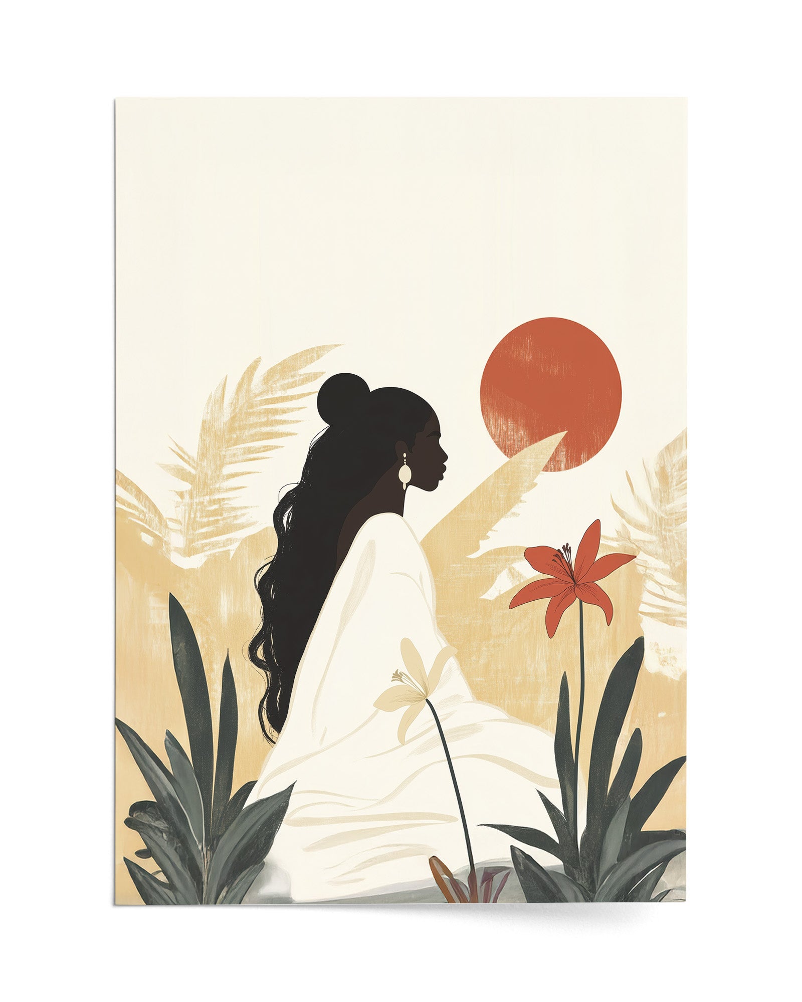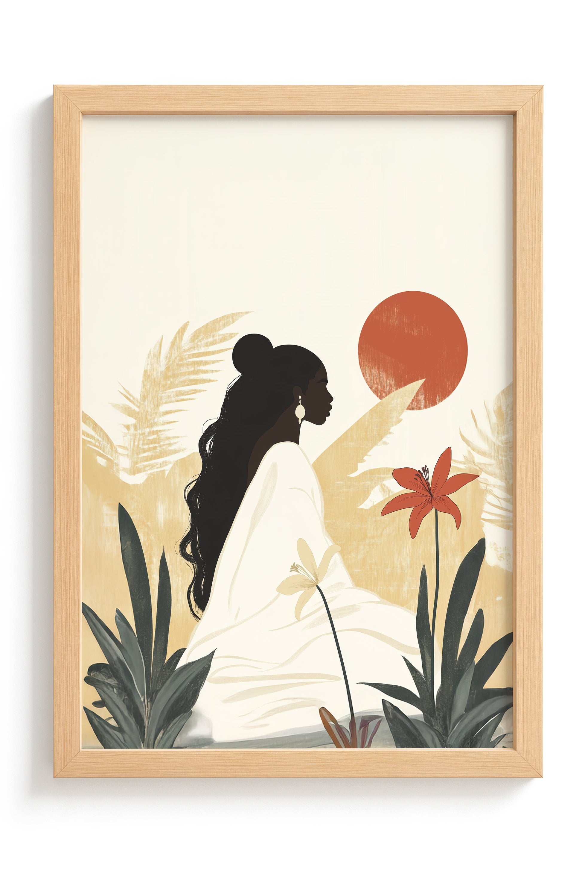 A graceful silhouette, wrapped in soft ivory and framed by bold florals and an ochre sun, this artwork pays tribute to quiet power and the eternal beauty of African heritage. With nods to tropical landscapes and ancestral presence, it evokes both elegance and groundedness.
