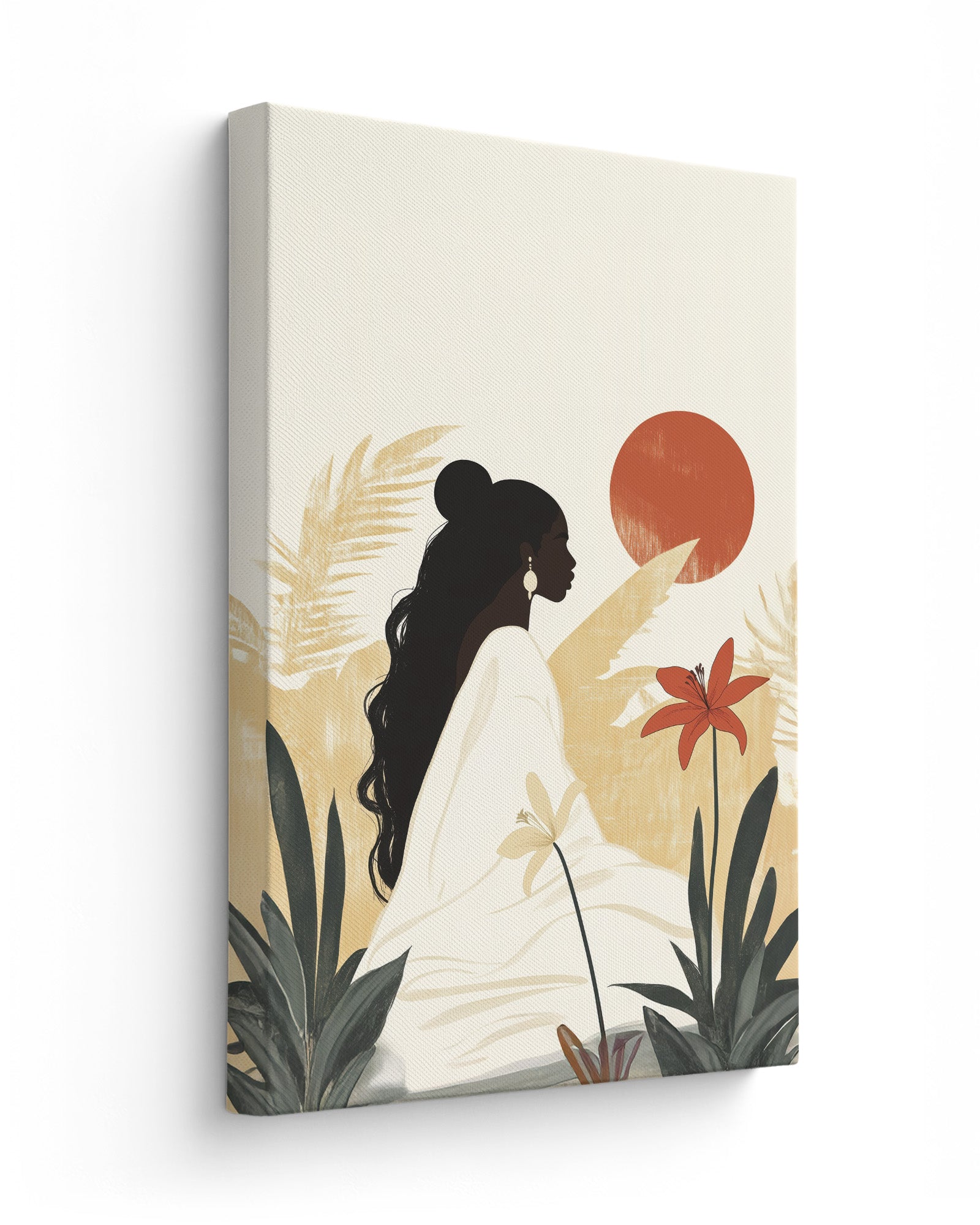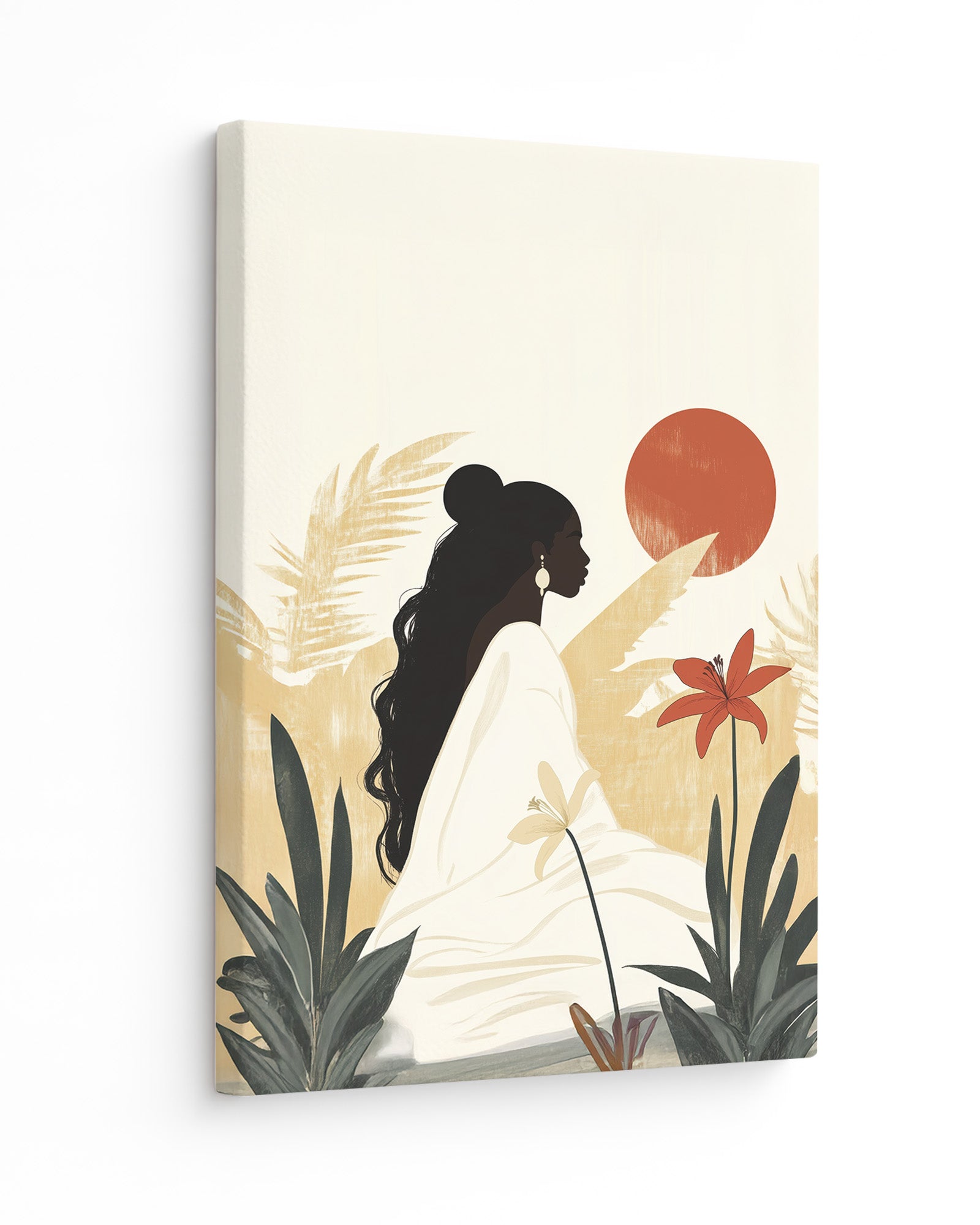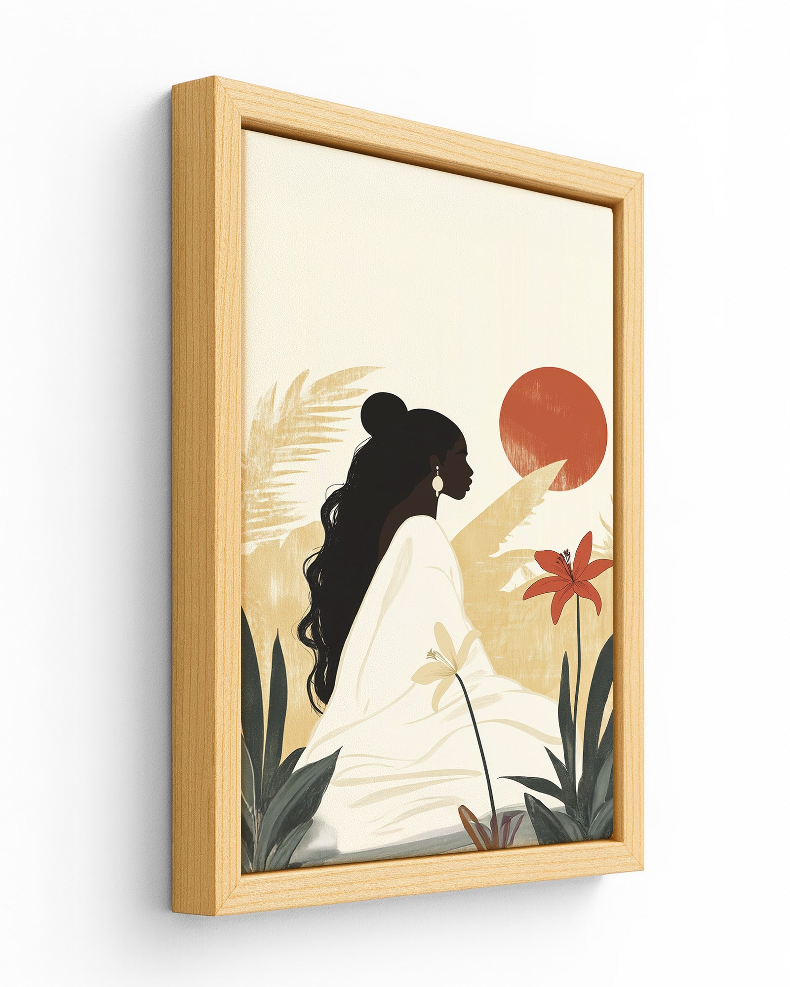 A graceful silhouette, wrapped in soft ivory and framed by bold florals and an ochre sun, this artwork pays tribute to quiet power and the eternal beauty of African heritage. With nods to tropical landscapes and ancestral presence, it evokes both elegance and groundedness.