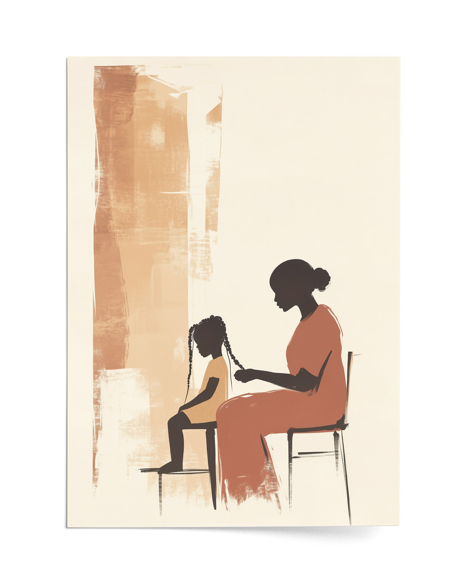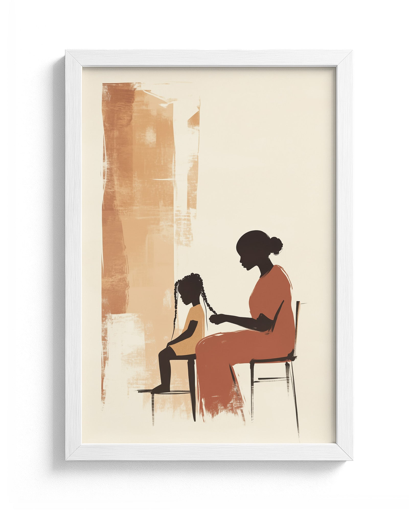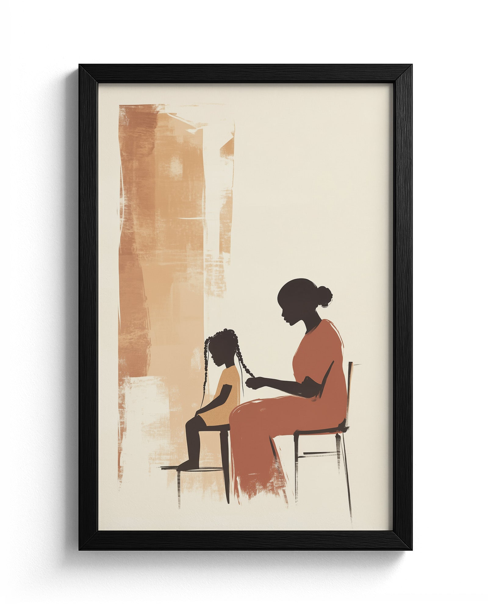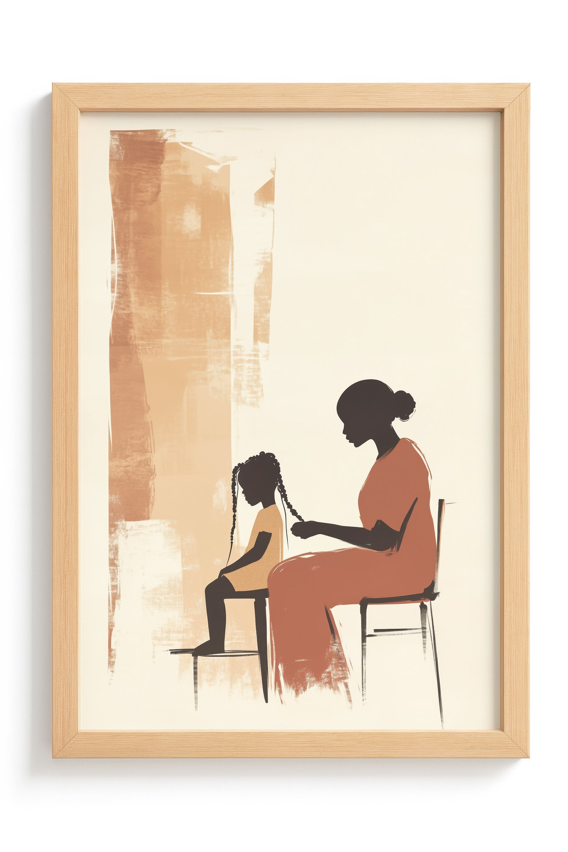 This minimalist artwork captures a quiet, cherished tradition—one woman gently braiding another’s hair, a moment rooted in care, culture, and connection. Painted in soft, earthy tones with elegant linework, the piece reflects generational rituals, patience, and the beauty of nurturing bonds.