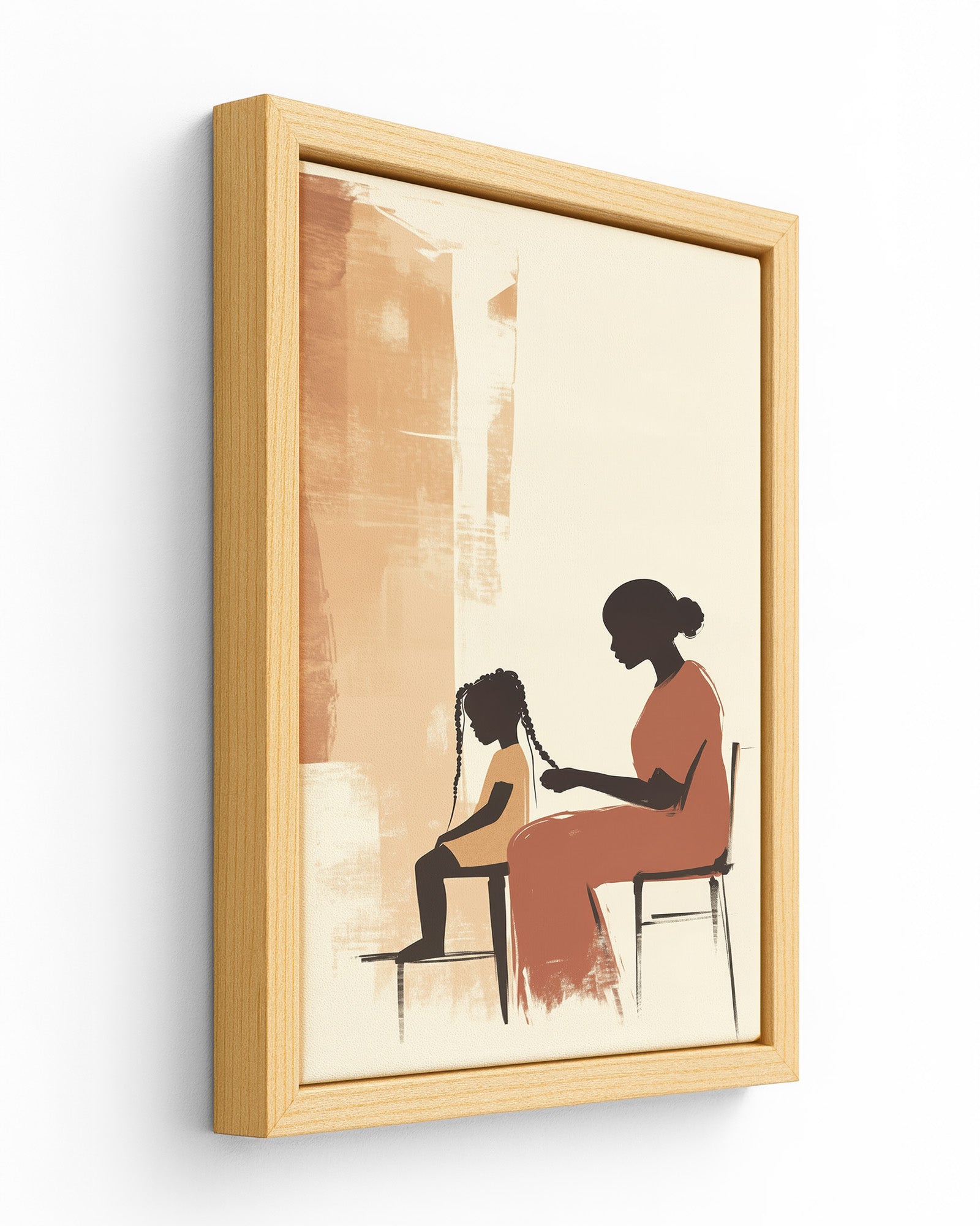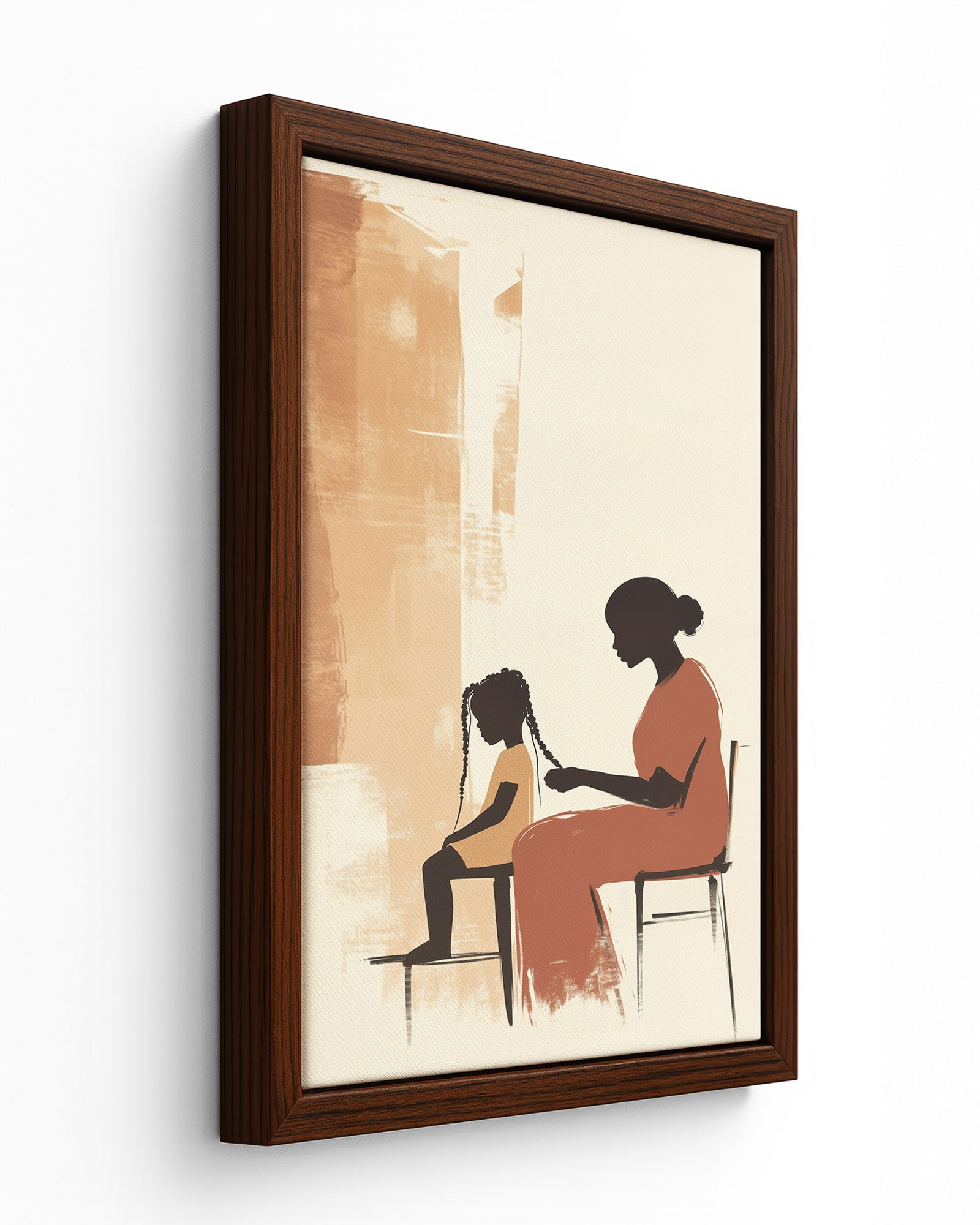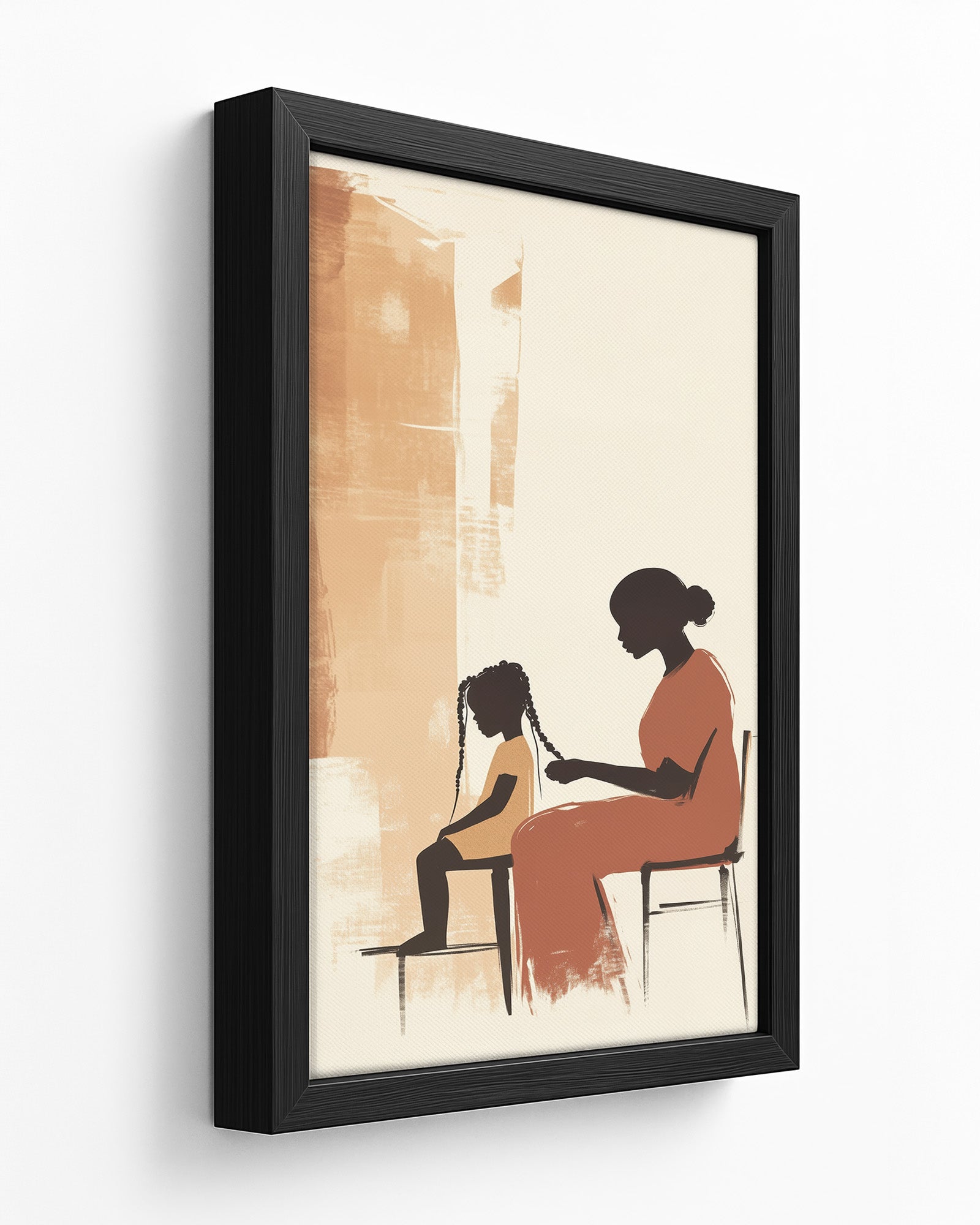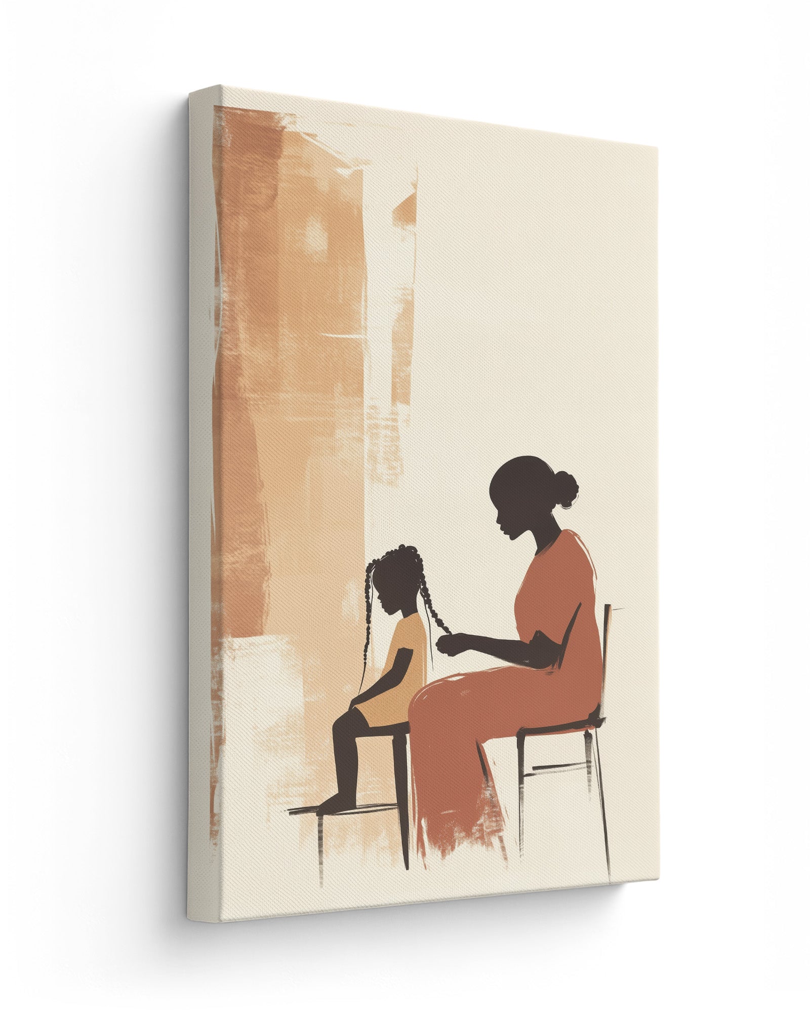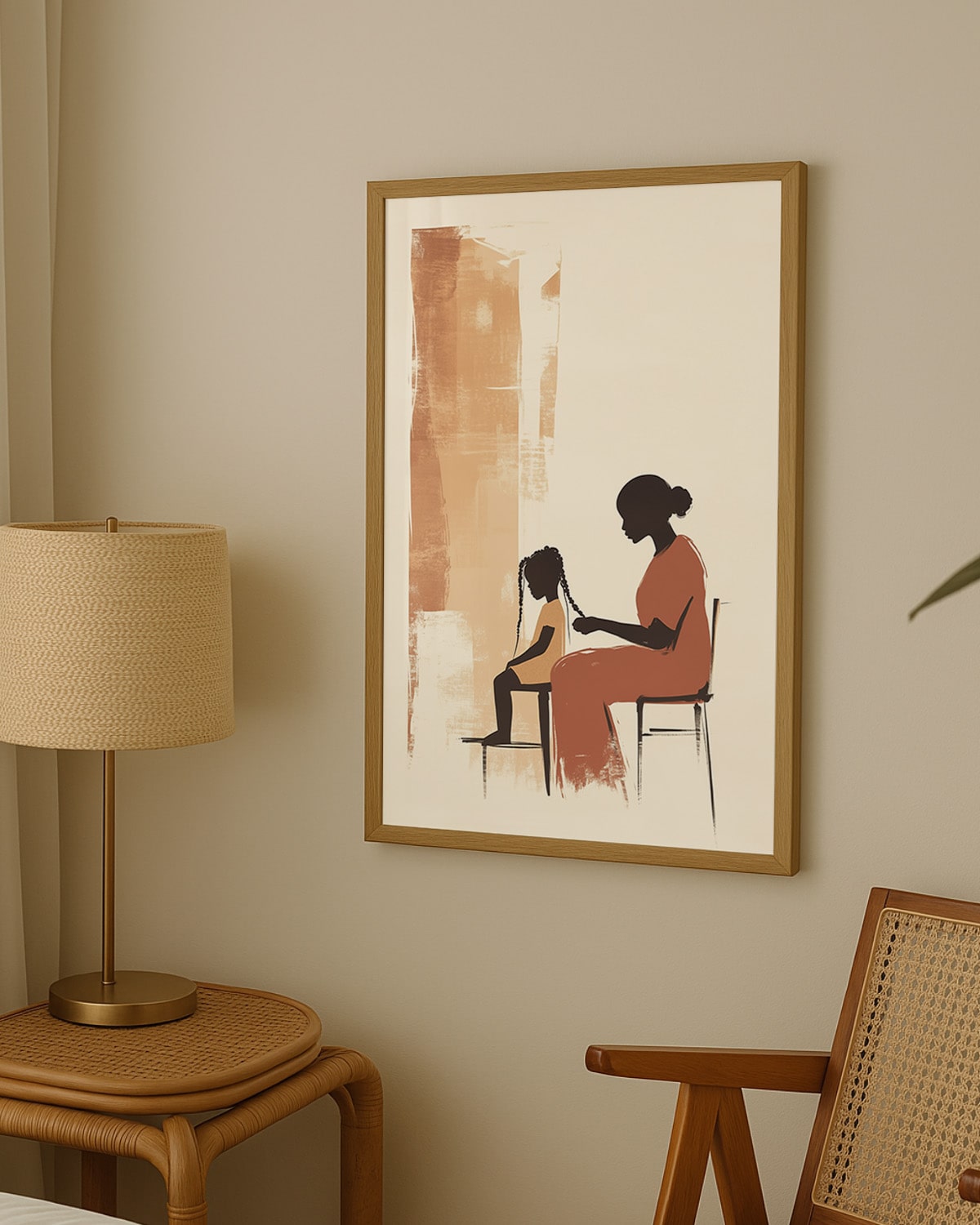 This minimalist artwork captures a quiet, cherished tradition—one woman gently braiding another’s hair, a moment rooted in care, culture, and connection. Painted in soft, earthy tones with elegant linework, the piece reflects generational rituals, patience, and the beauty of nurturing bonds.
