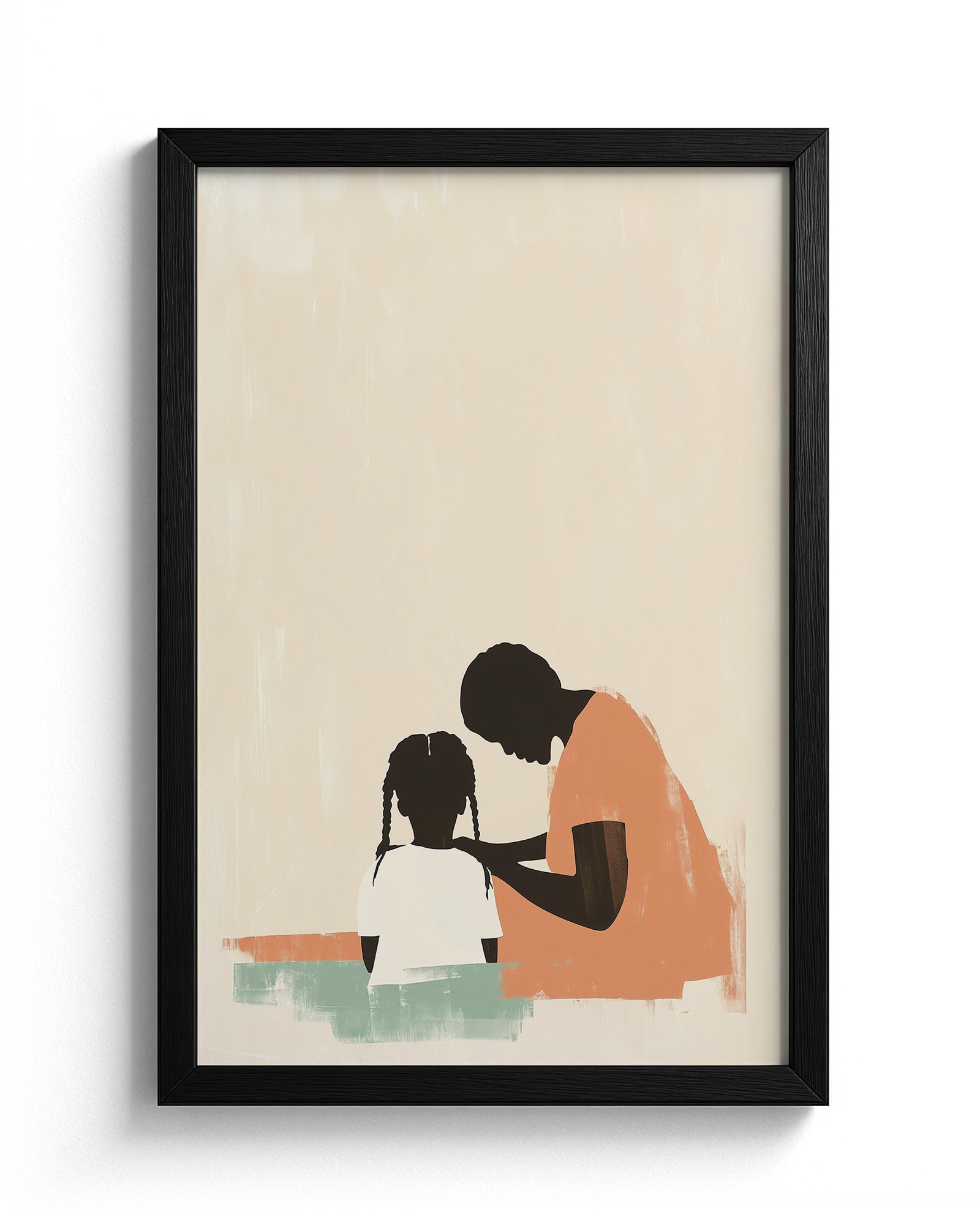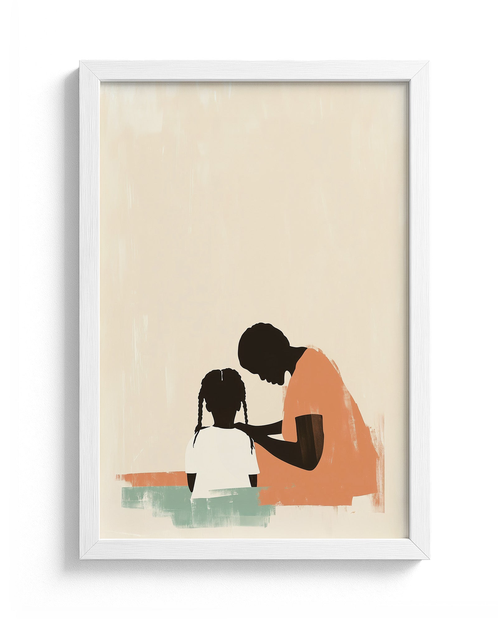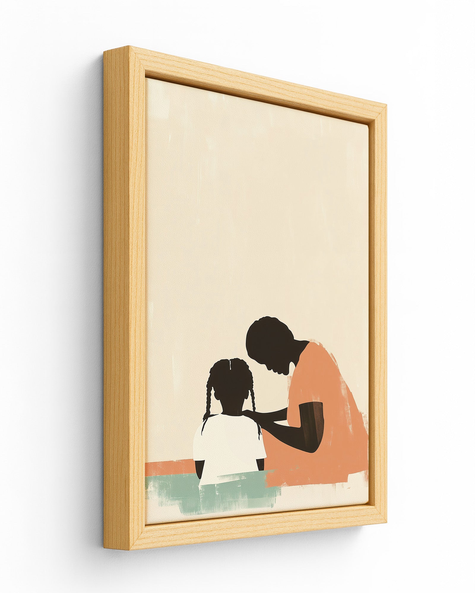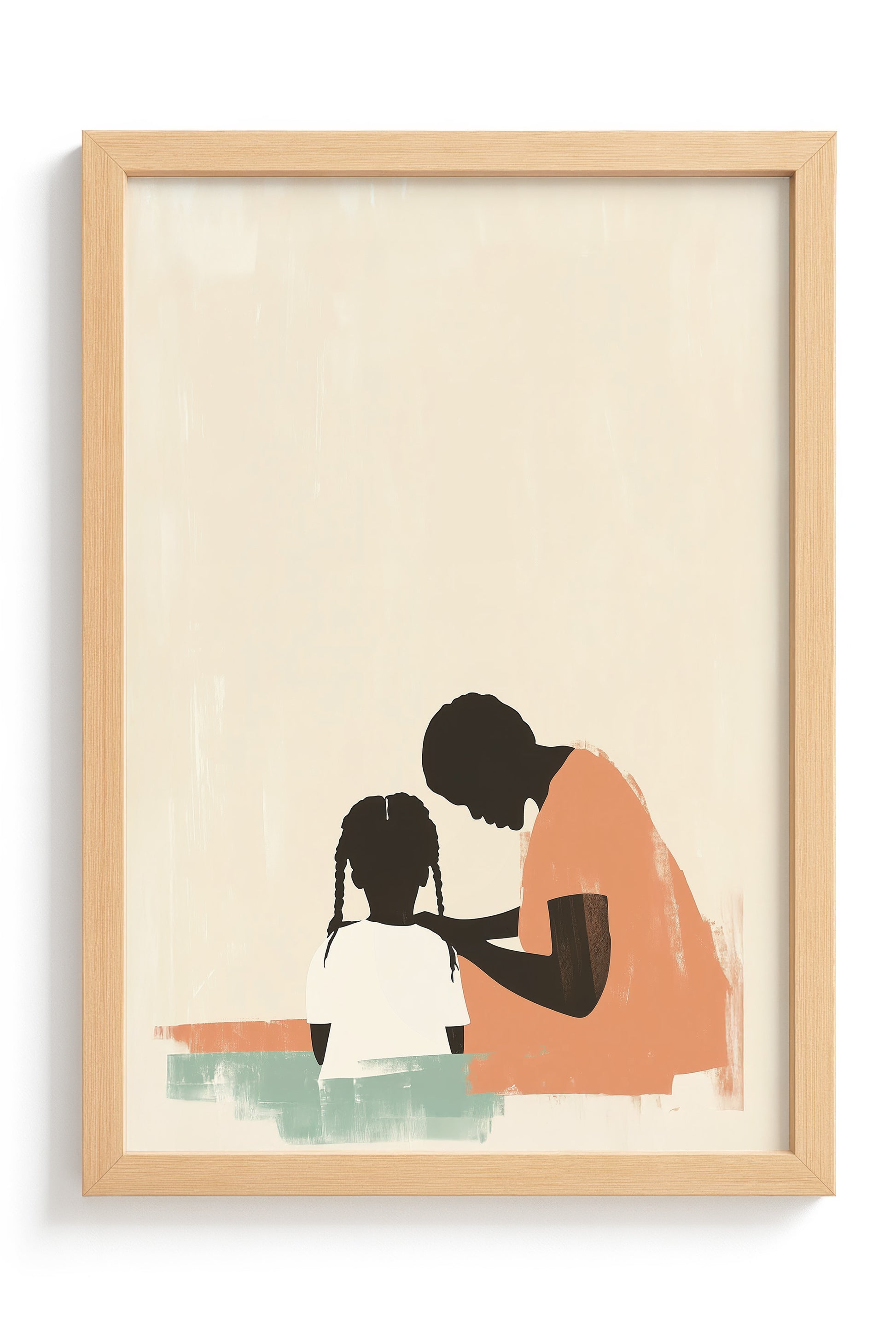 This minimalist artwork captures a quiet, cherished tradition—one woman gently braiding another’s hair, a moment rooted in care, culture, and connection. Painted in soft, earthy tones with elegant line work, the piece reflects generational rituals, patience, and the beauty of nurturing bonds.