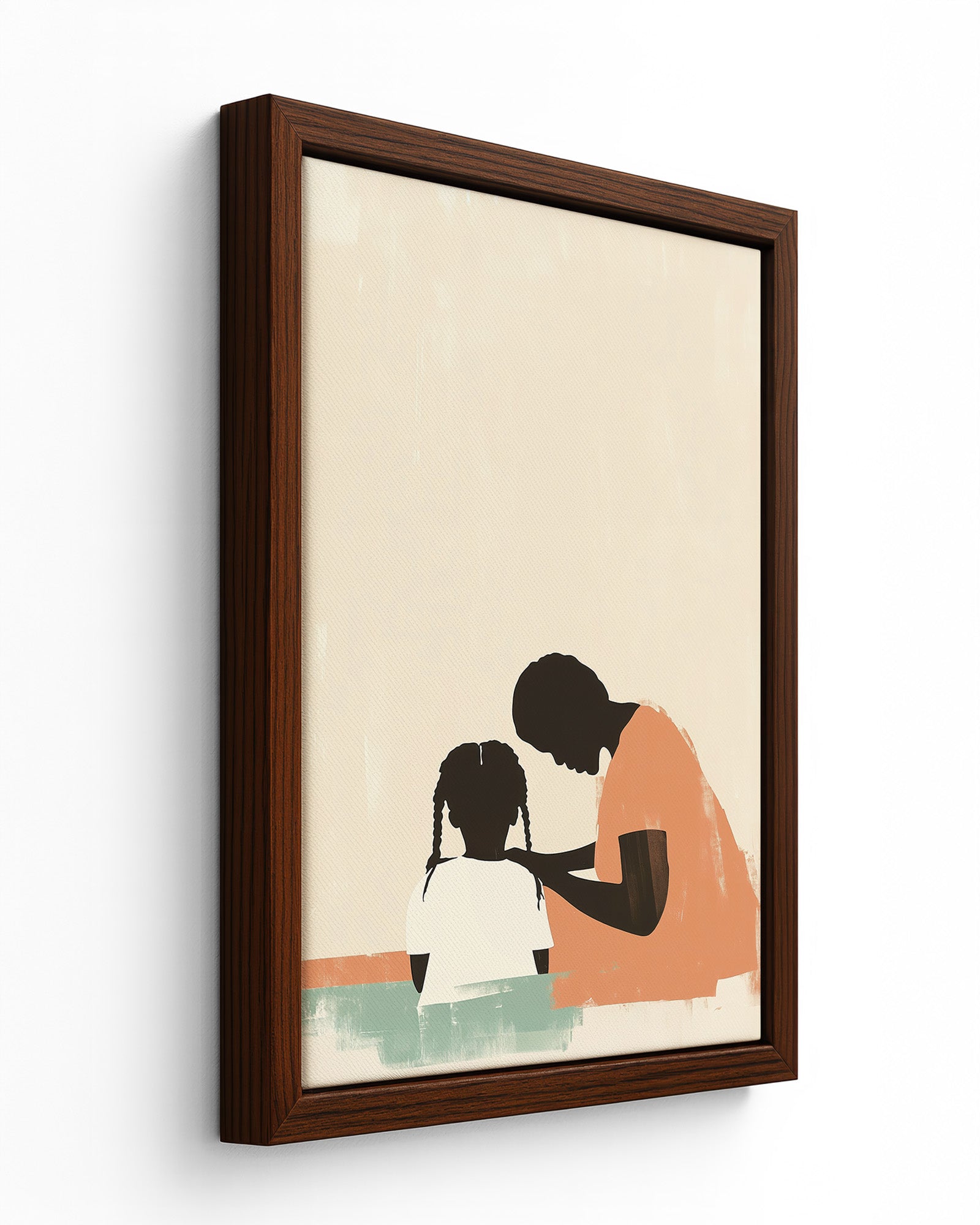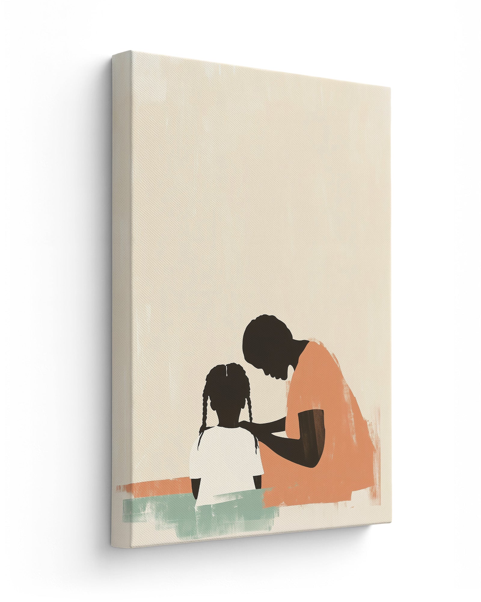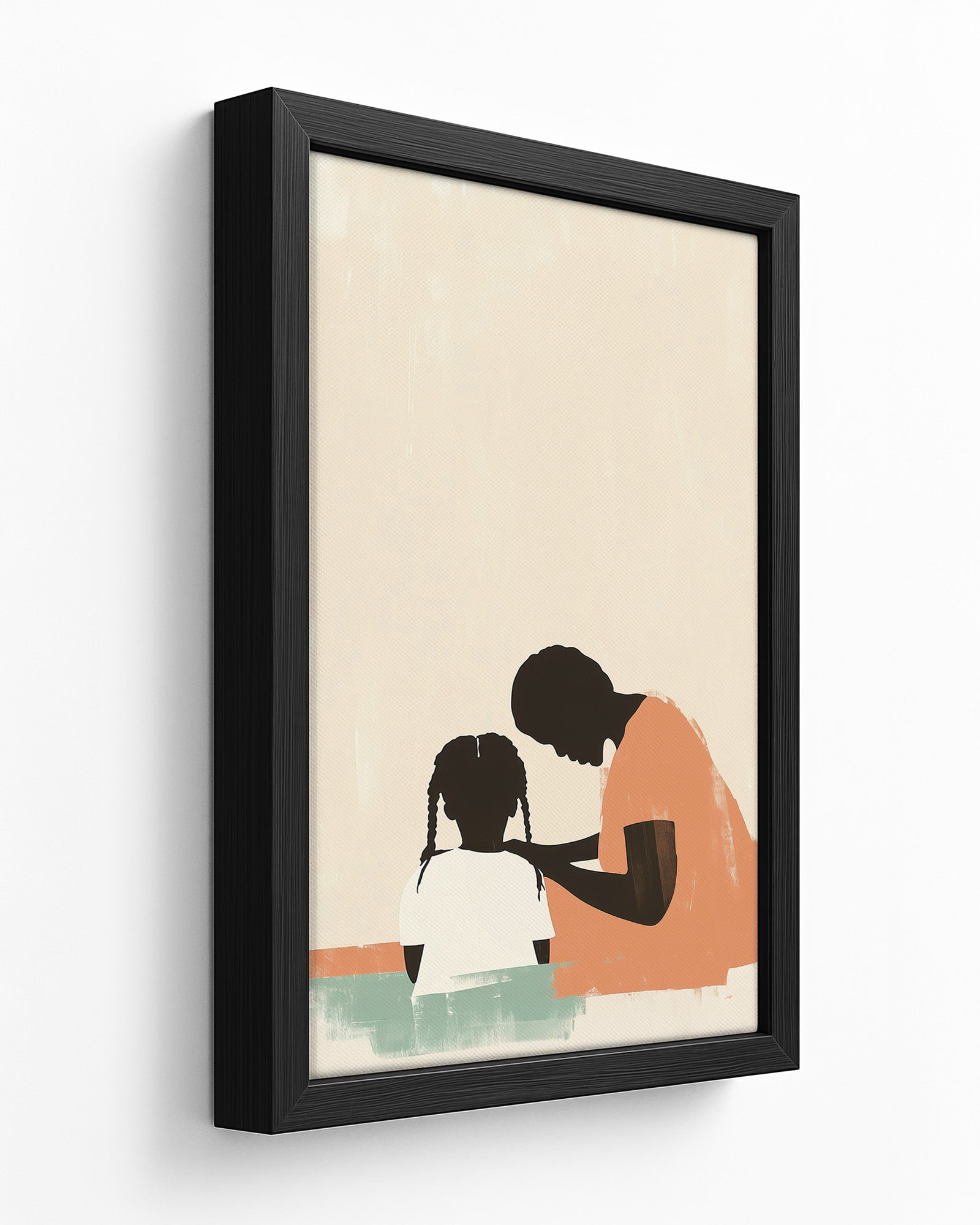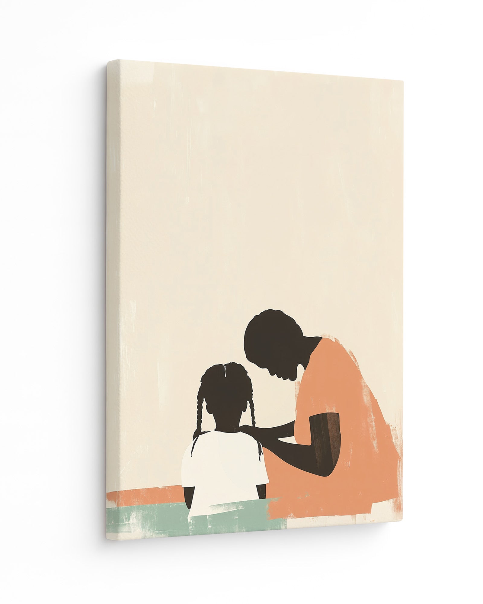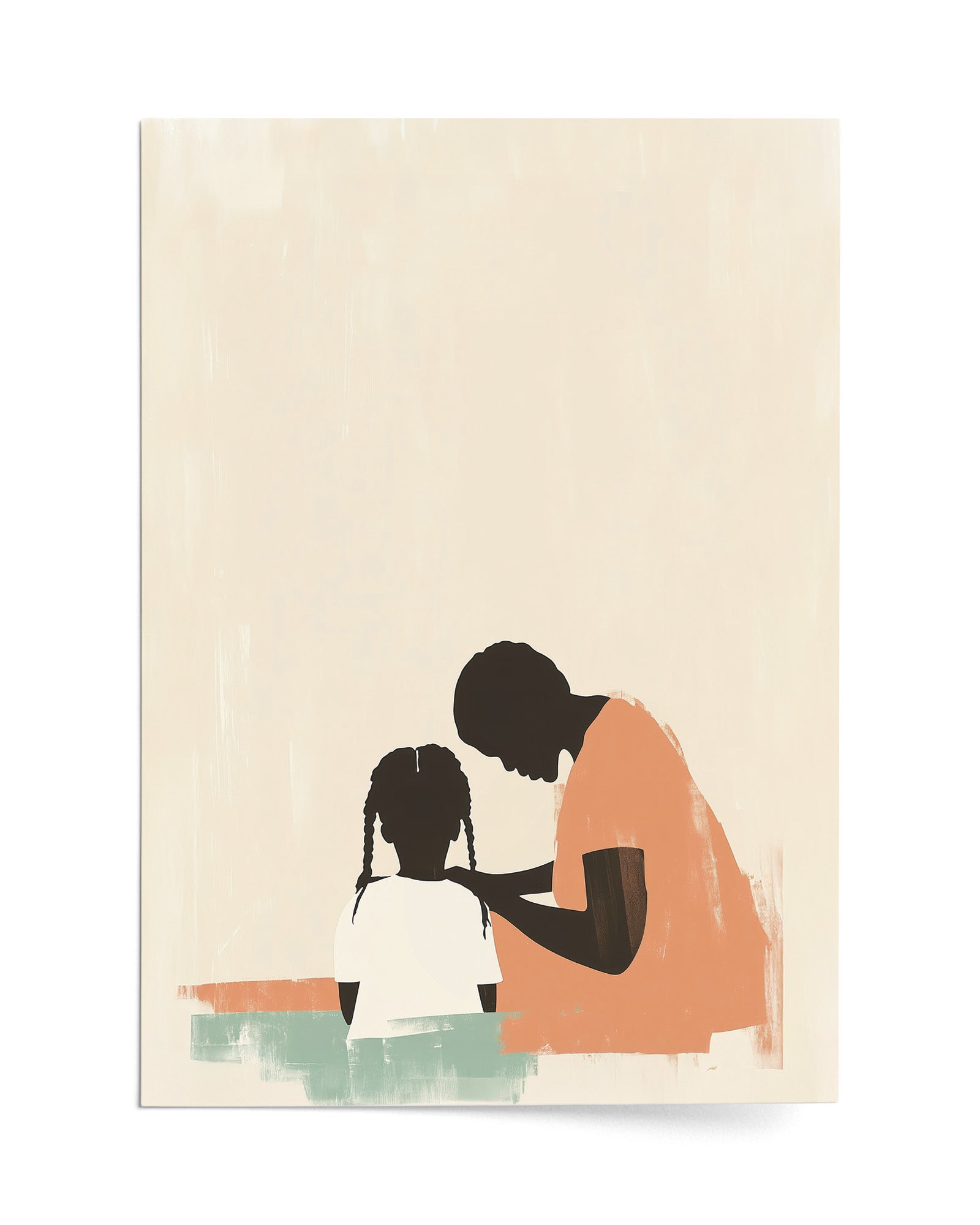 This minimalist artwork captures a quiet, cherished tradition—one woman gently braiding another’s hair, a moment rooted in care, culture, and connection. Painted in soft, earthy tones with elegant line work, the piece reflects generational rituals, patience, and the beauty of nurturing bonds.