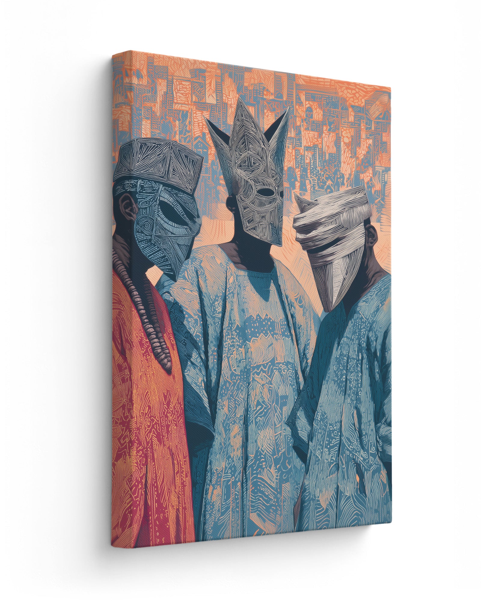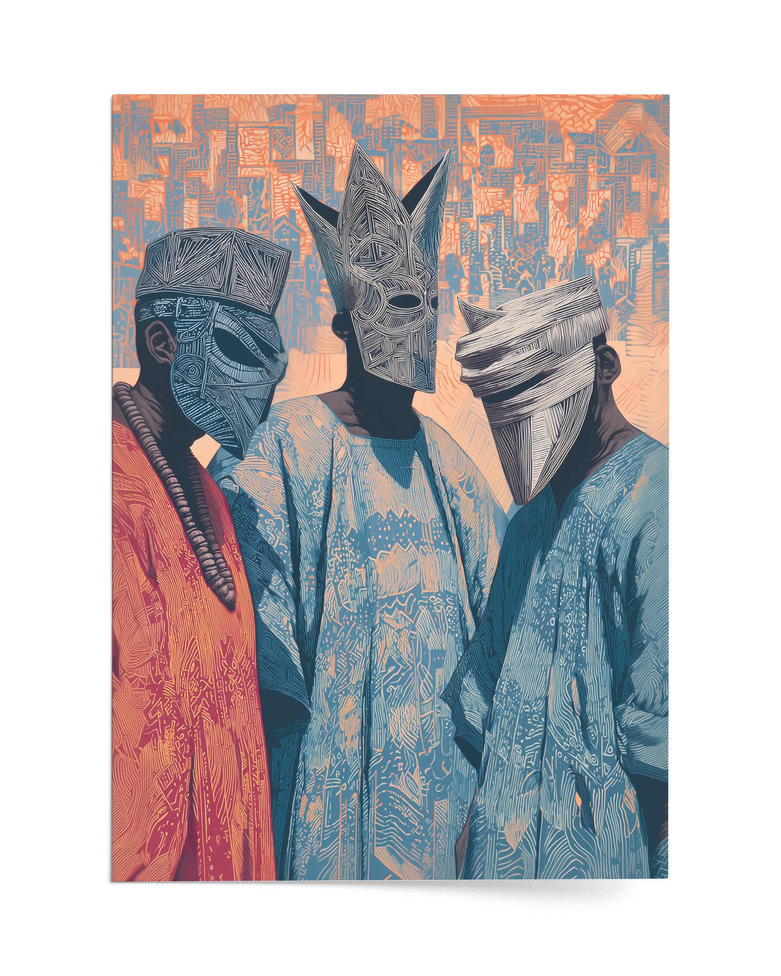A striking linocut-style artwork of Yoruba masqueraders in layered fabrics and abstract masks, adorned with intricate cultural motifs. The backdrop of urban Yoruba streets connects ancestry, spirituality, and heritage, blending tradition with modern identity.