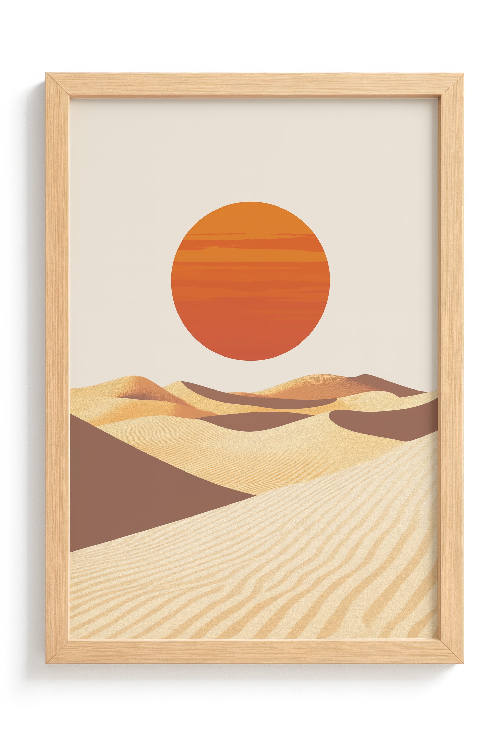 Step into the sun-soaked soul of Timbuktu with this minimalist desert masterpiece. Bathed in the golden glow of the Sahara sun, this artwork captures the quiet majesty of endless dunes and infinite skies. Clean, geometric shapes and soft gradients evoke the serene spirit of the desert, while the sun—radiant yet subtle—casts its warm embrace over the scene.