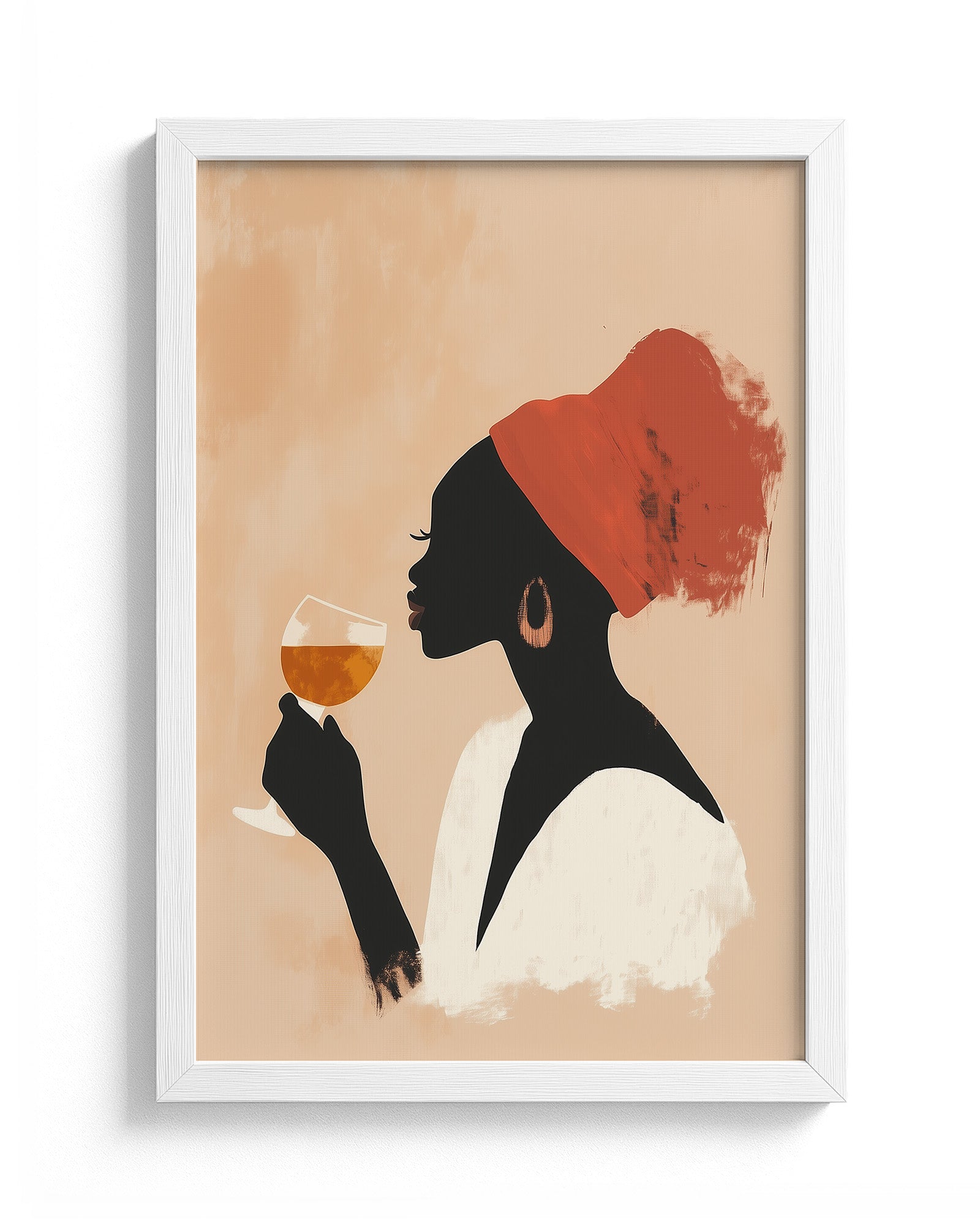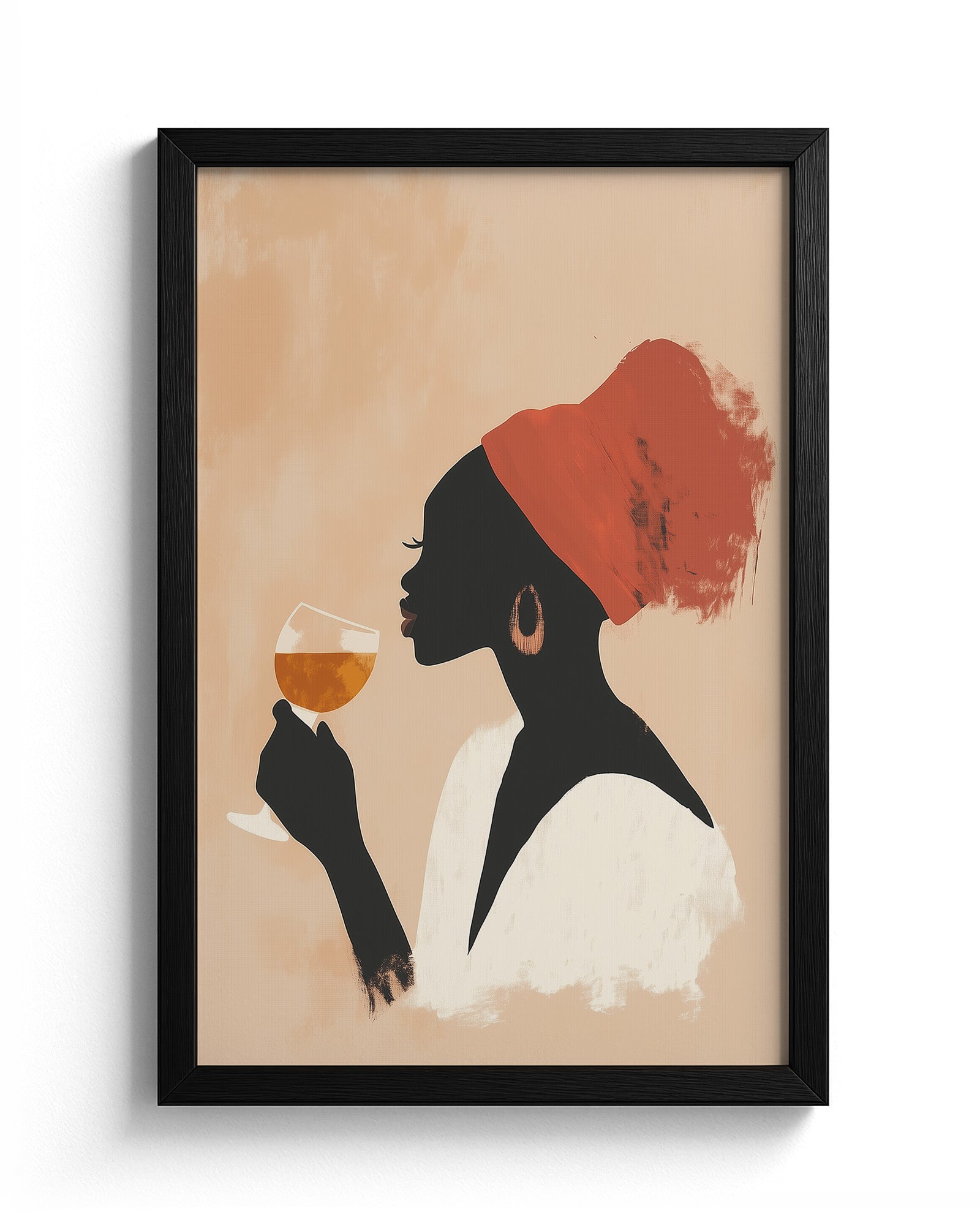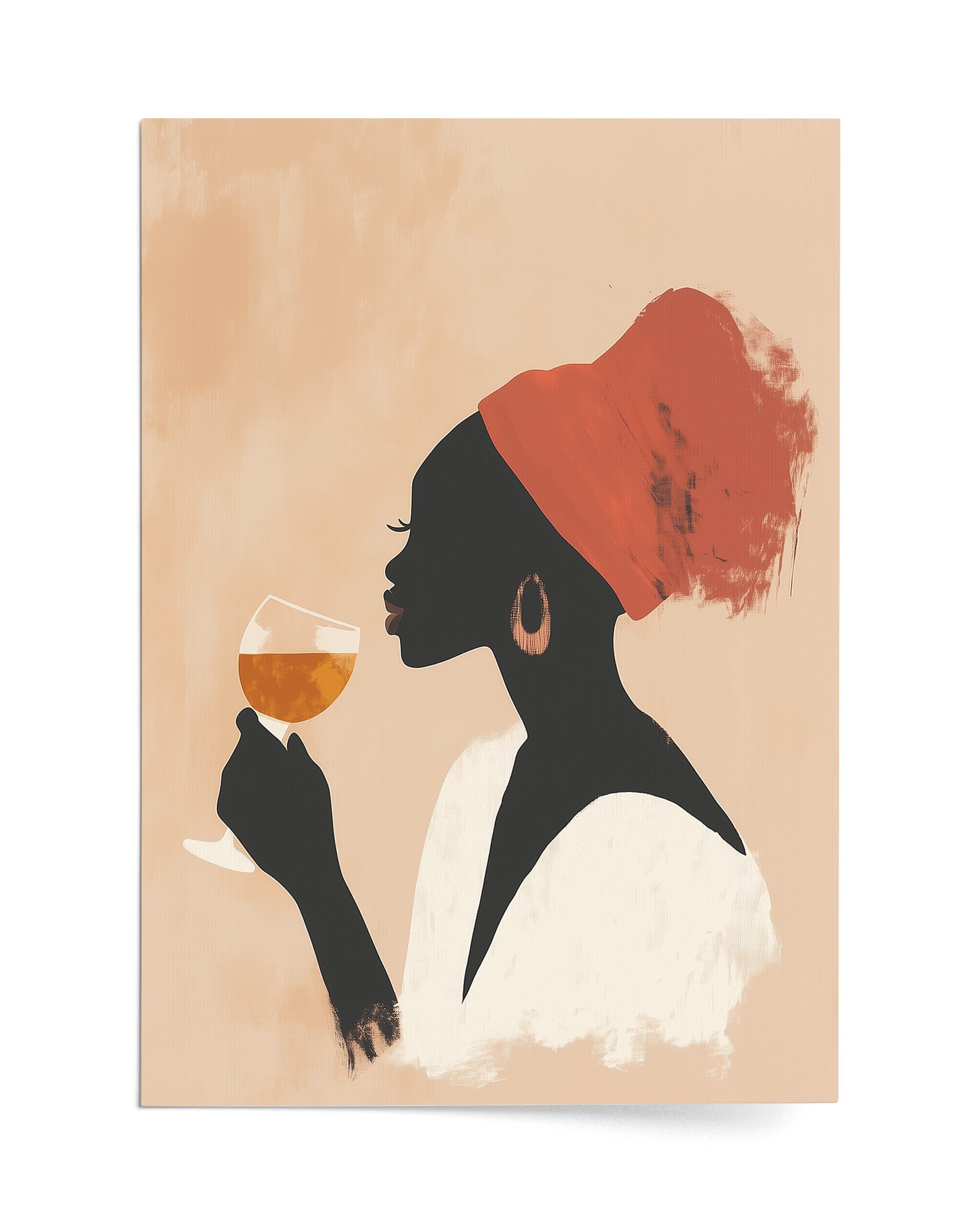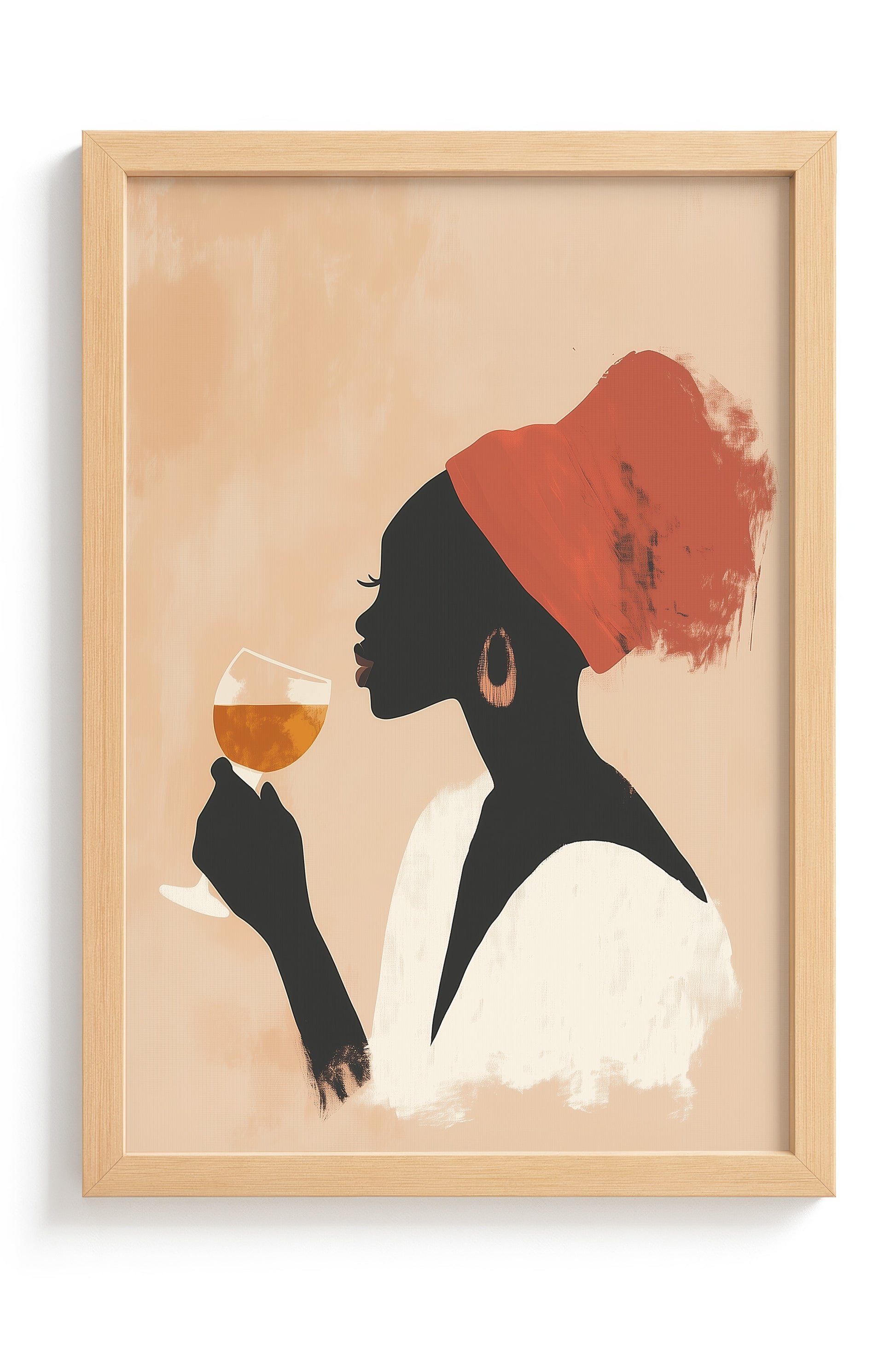 This striking minimalist artwork captures a poised woman in profile, adorned with a vivid red headwrap and holding a glass of amber wine in contemplative serenity. The soft, peach-toned backdrop contrasts gently with the silhouette, creating a visually rich composition that feels both grounded and ethereal. The brush-textured strokes add depth and artistic character, while the palette radiates warmth and quiet sophistication.