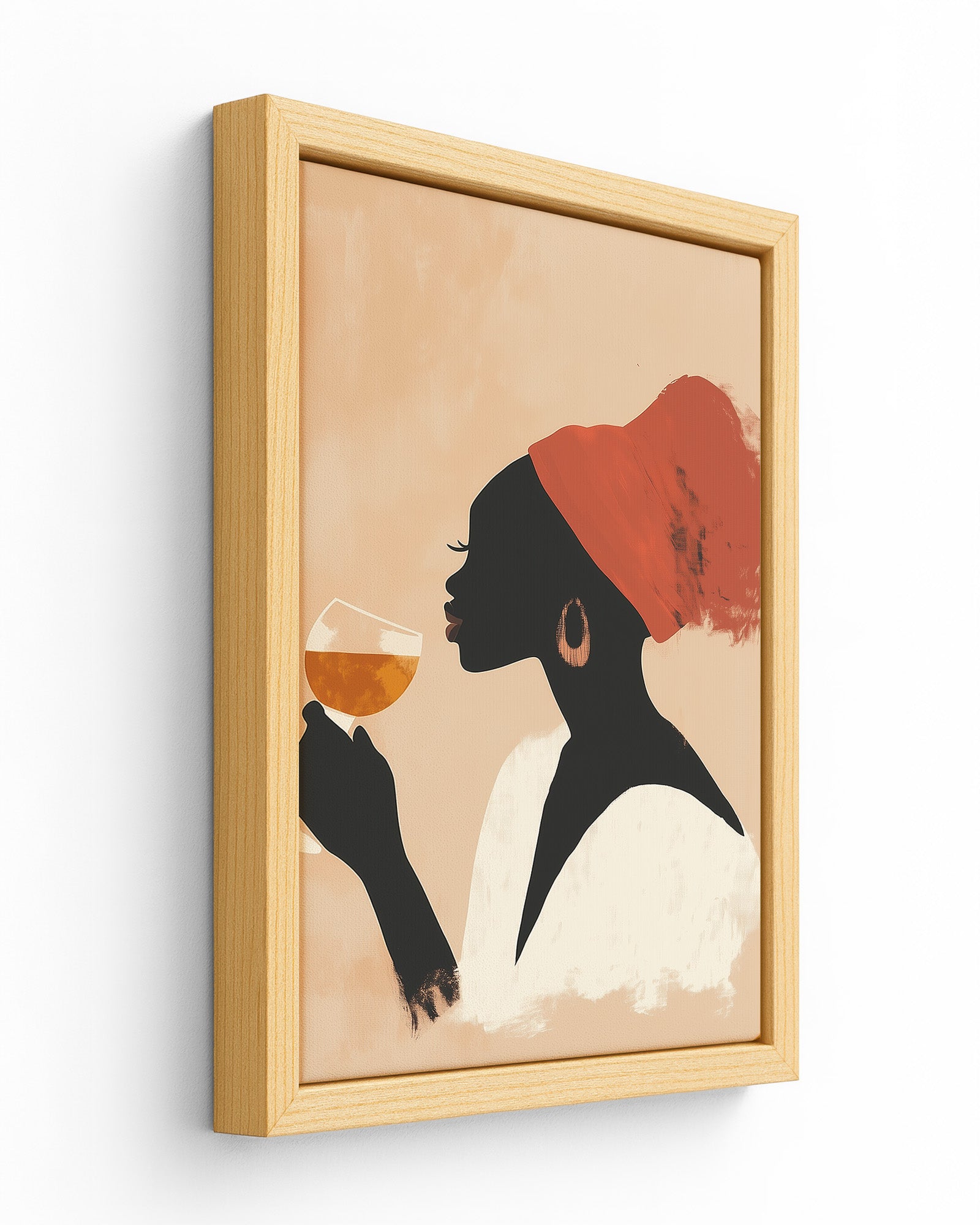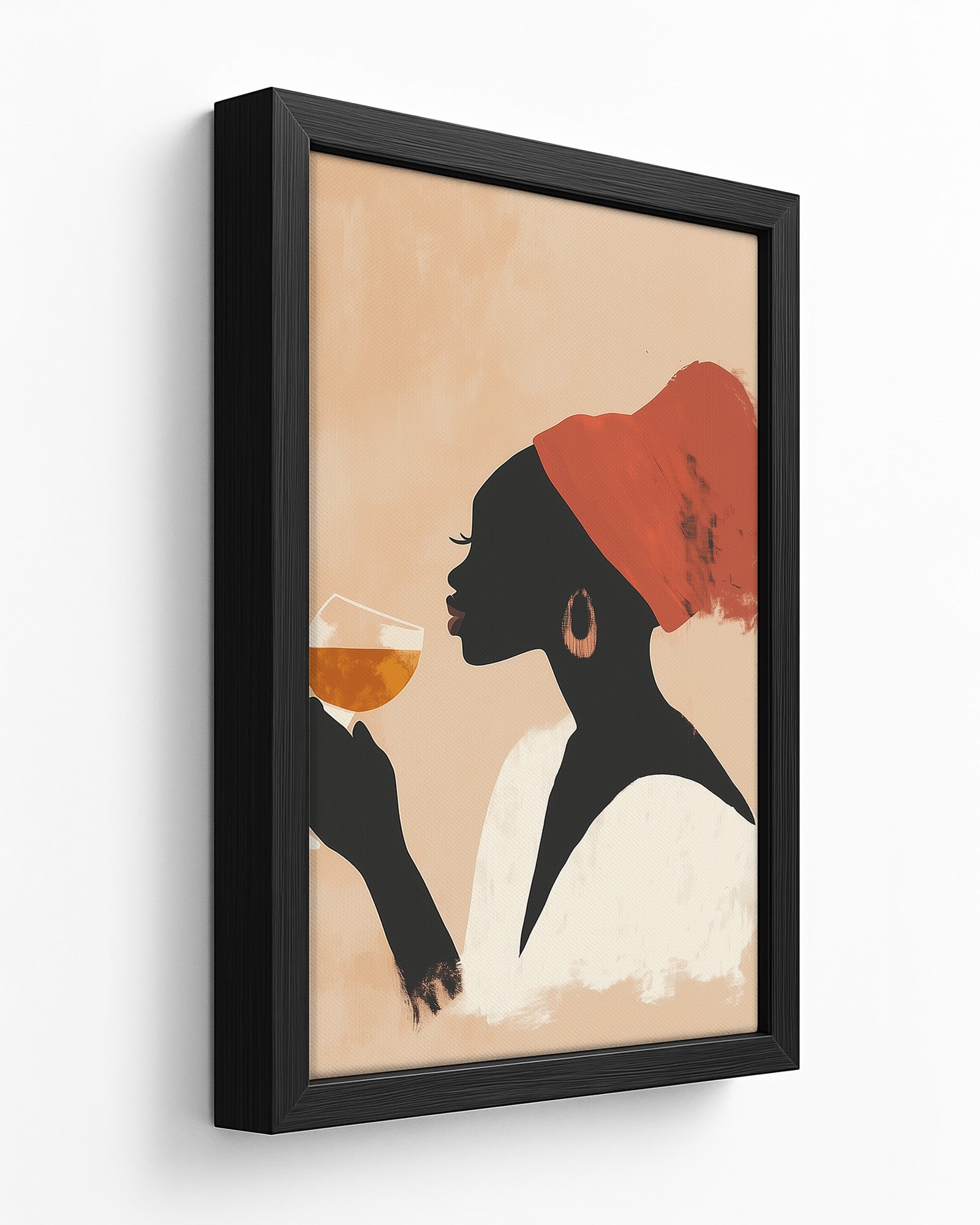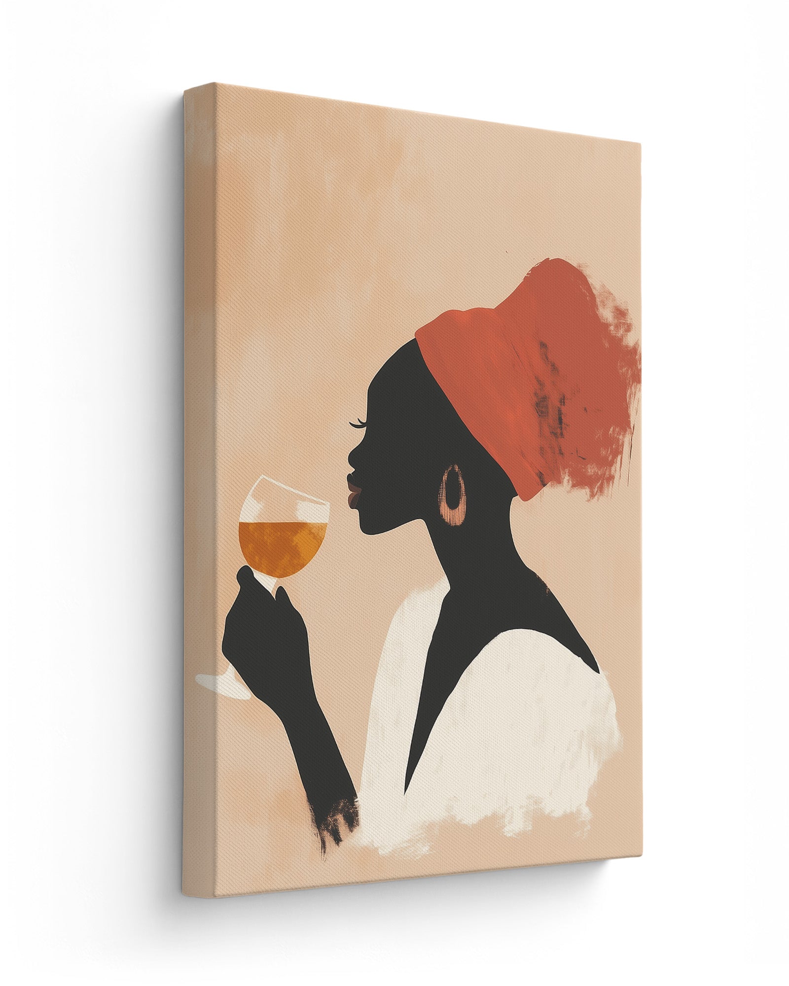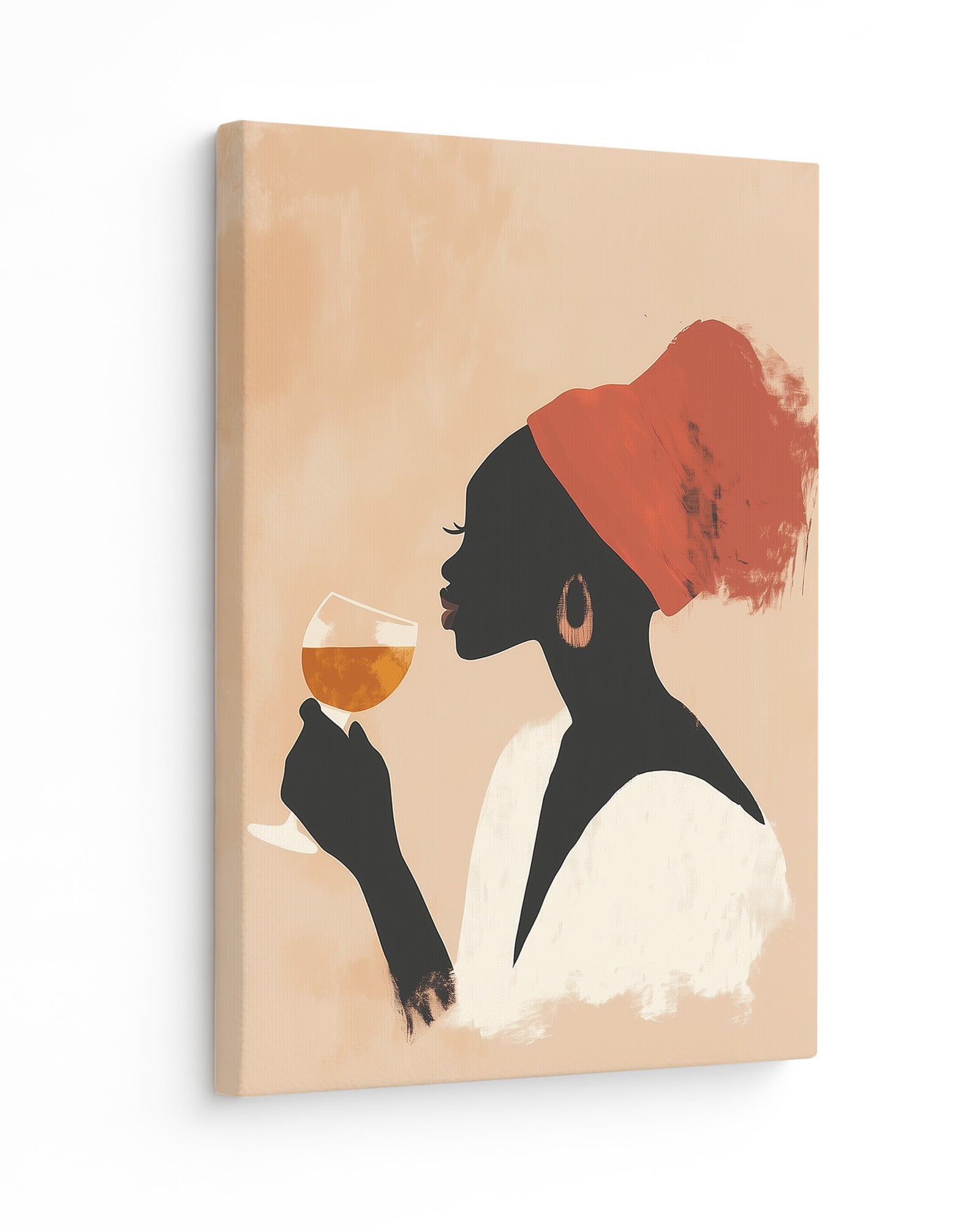 This striking minimalist artwork captures a poised woman in profile, adorned with a vivid red headwrap and holding a glass of amber wine in contemplative serenity. The soft, peach-toned backdrop contrasts gently with the silhouette, creating a visually rich composition that feels both grounded and ethereal. The brush-textured strokes add depth and artistic character, while the palette radiates warmth and quiet sophistication.