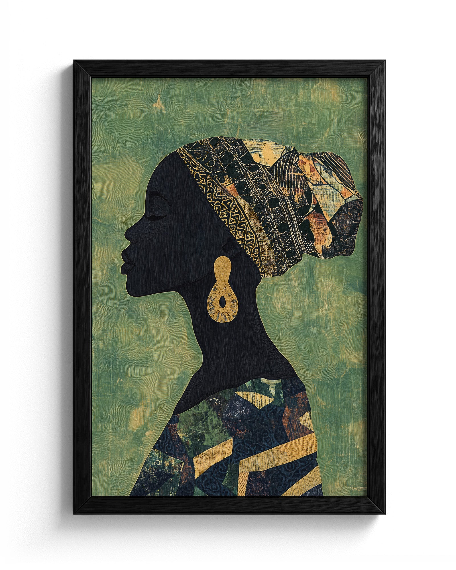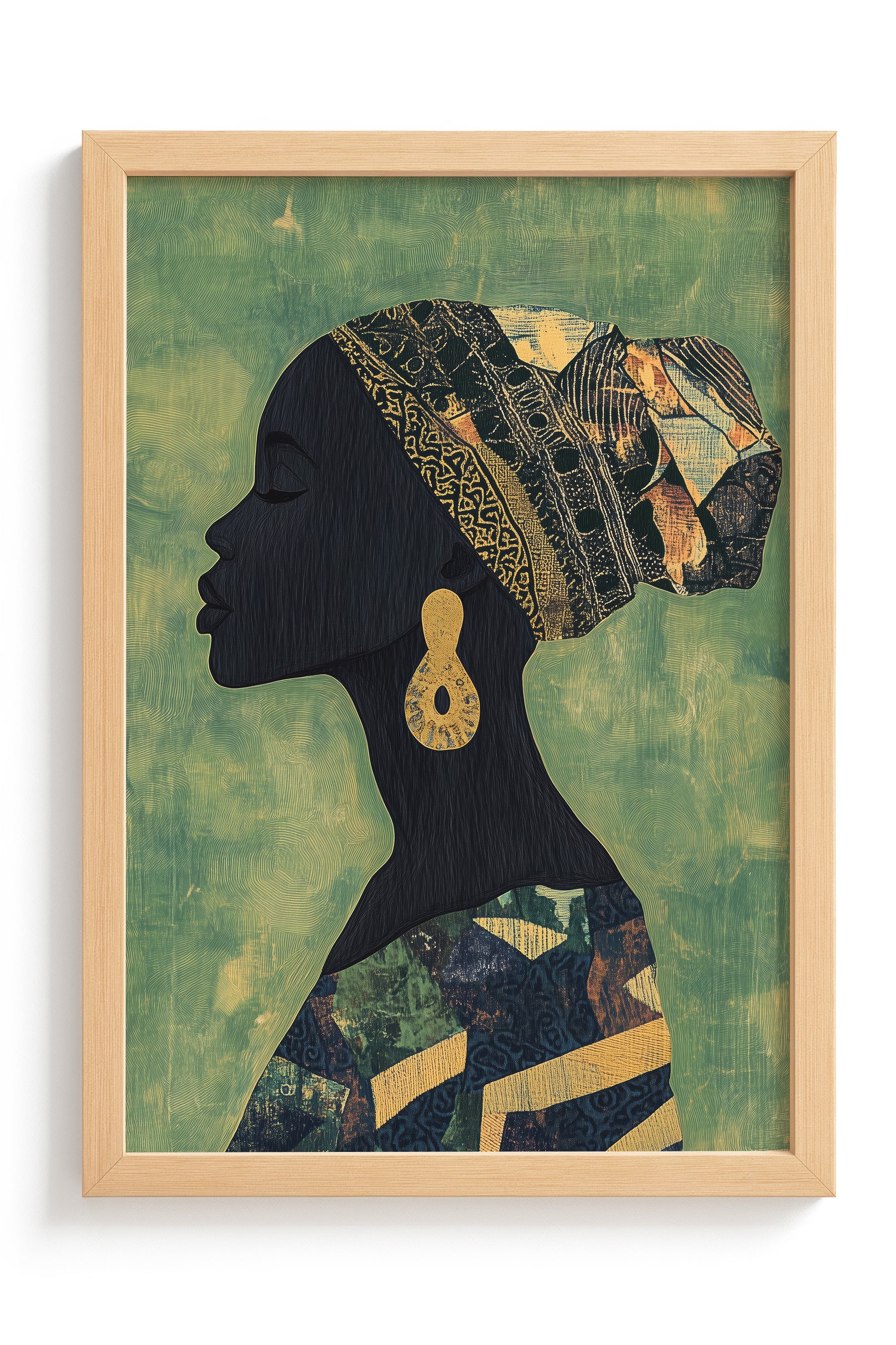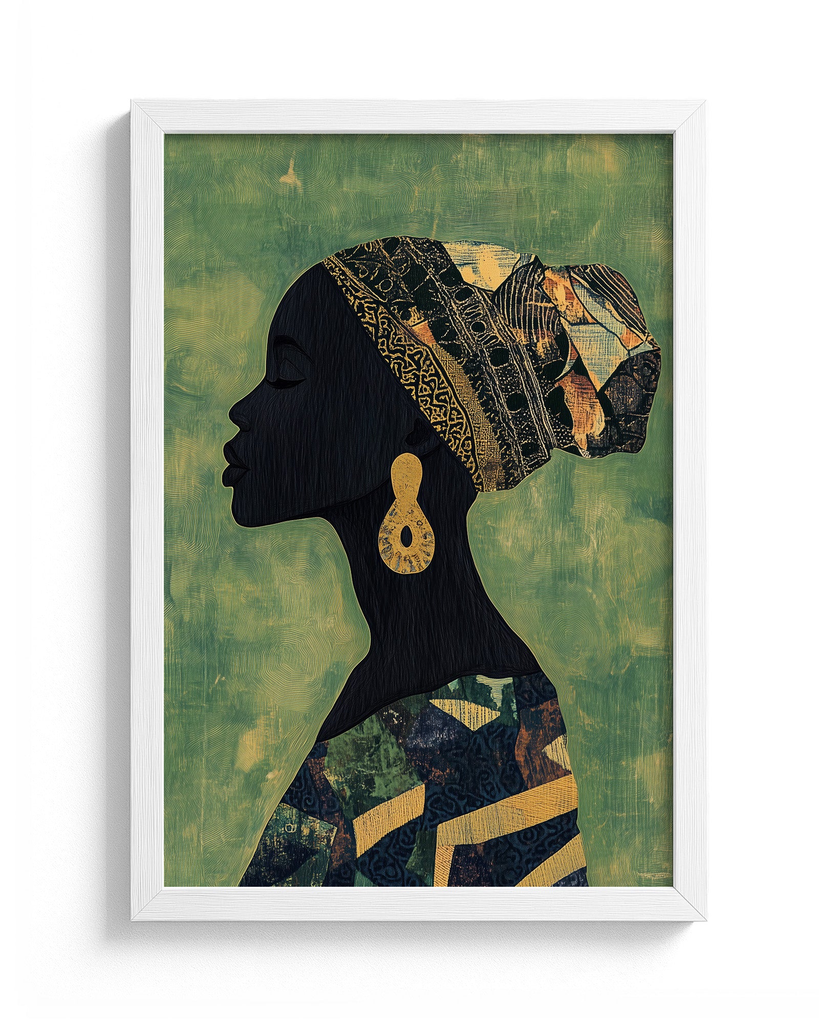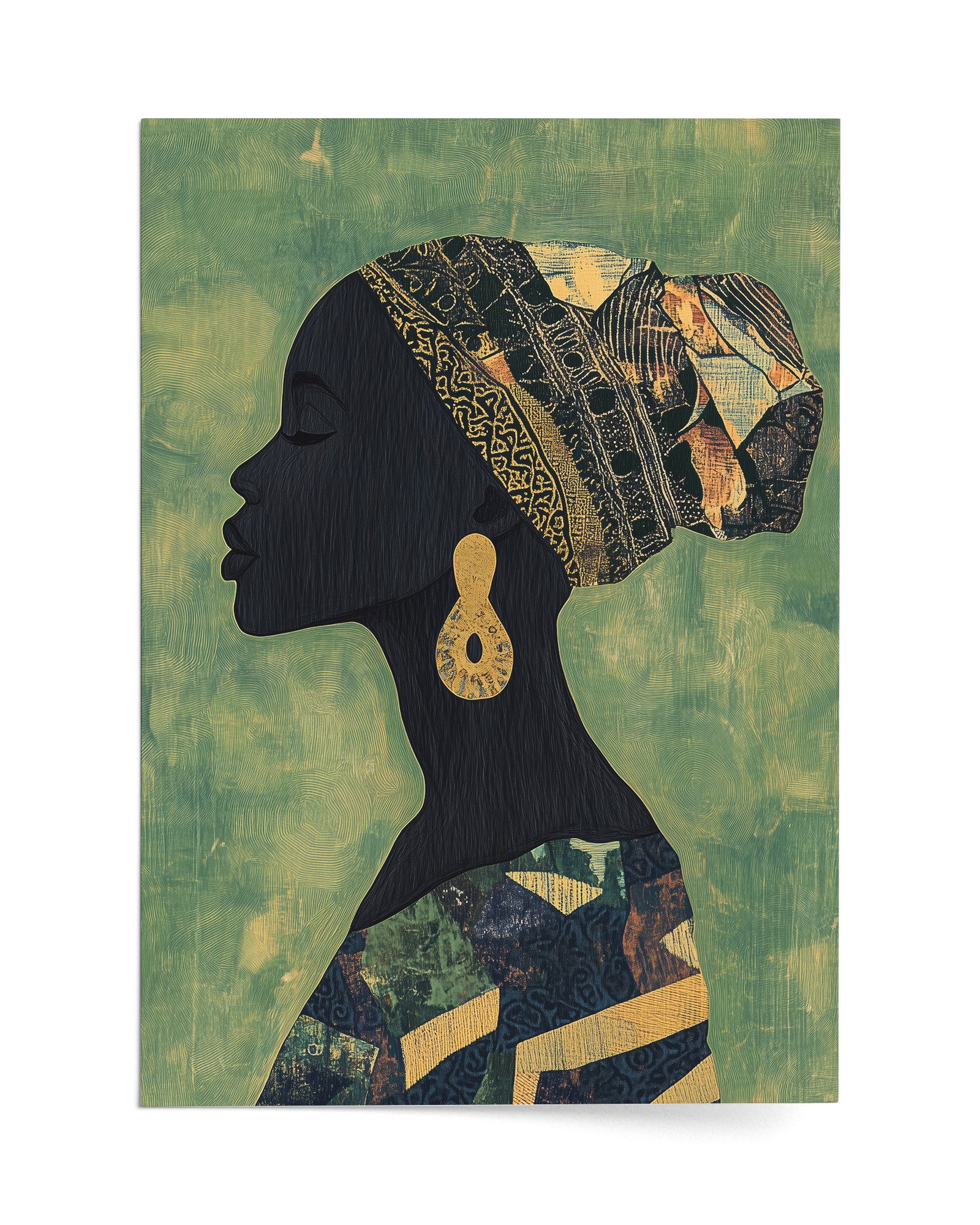 Experience the beauty of African heritage with this minimalist artwork featuring a silhouette of a woman adorned in intricate gold and beige patterns. Set against a deep olive-green background, her earrings and headscarf shimmer with cultural elegance.