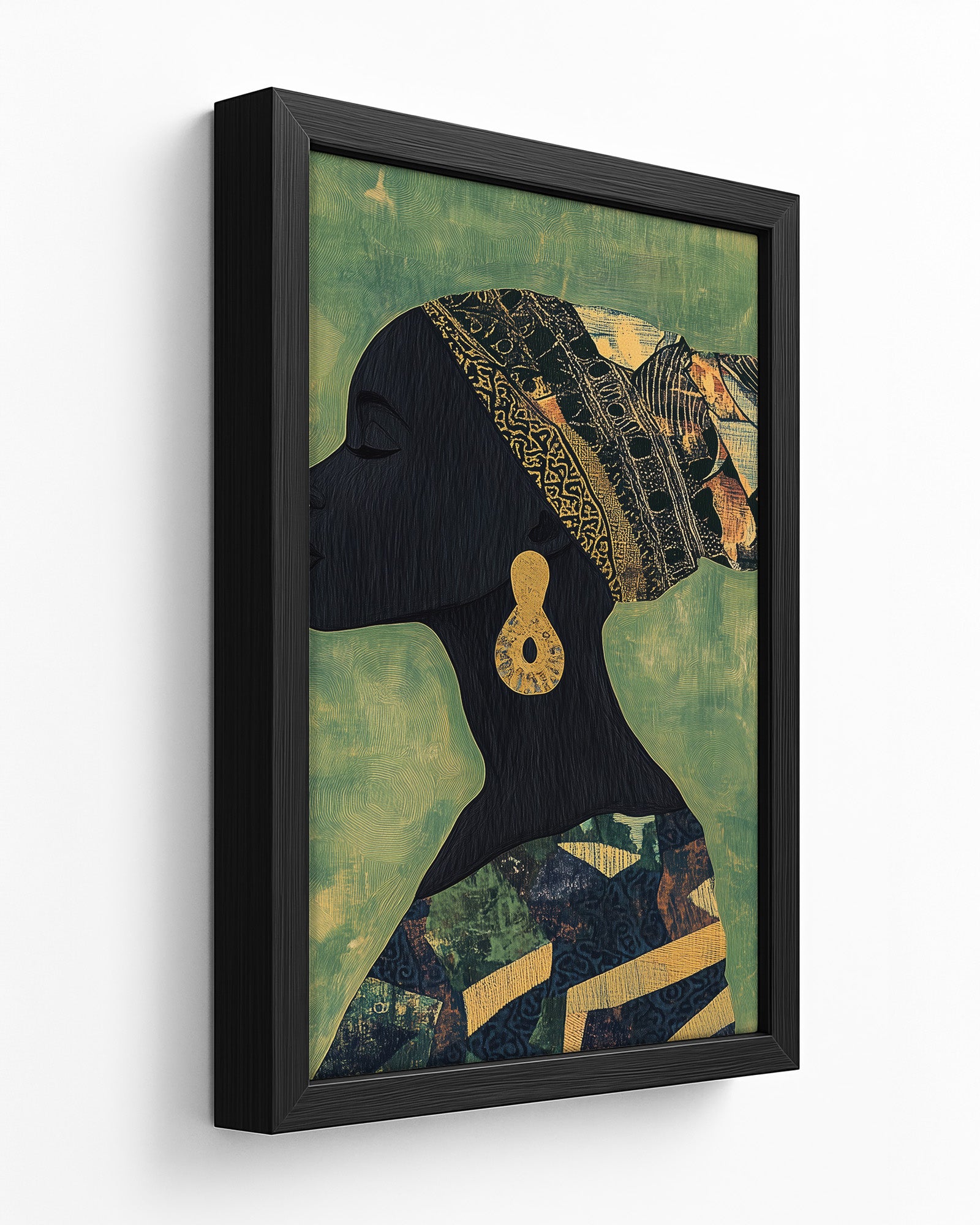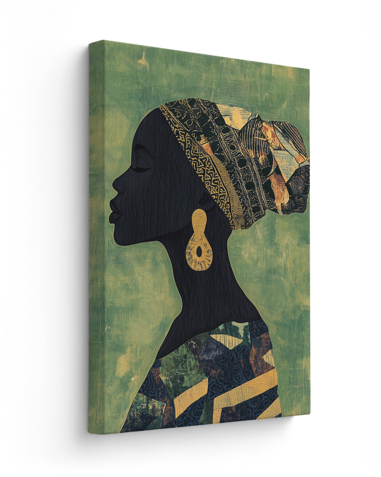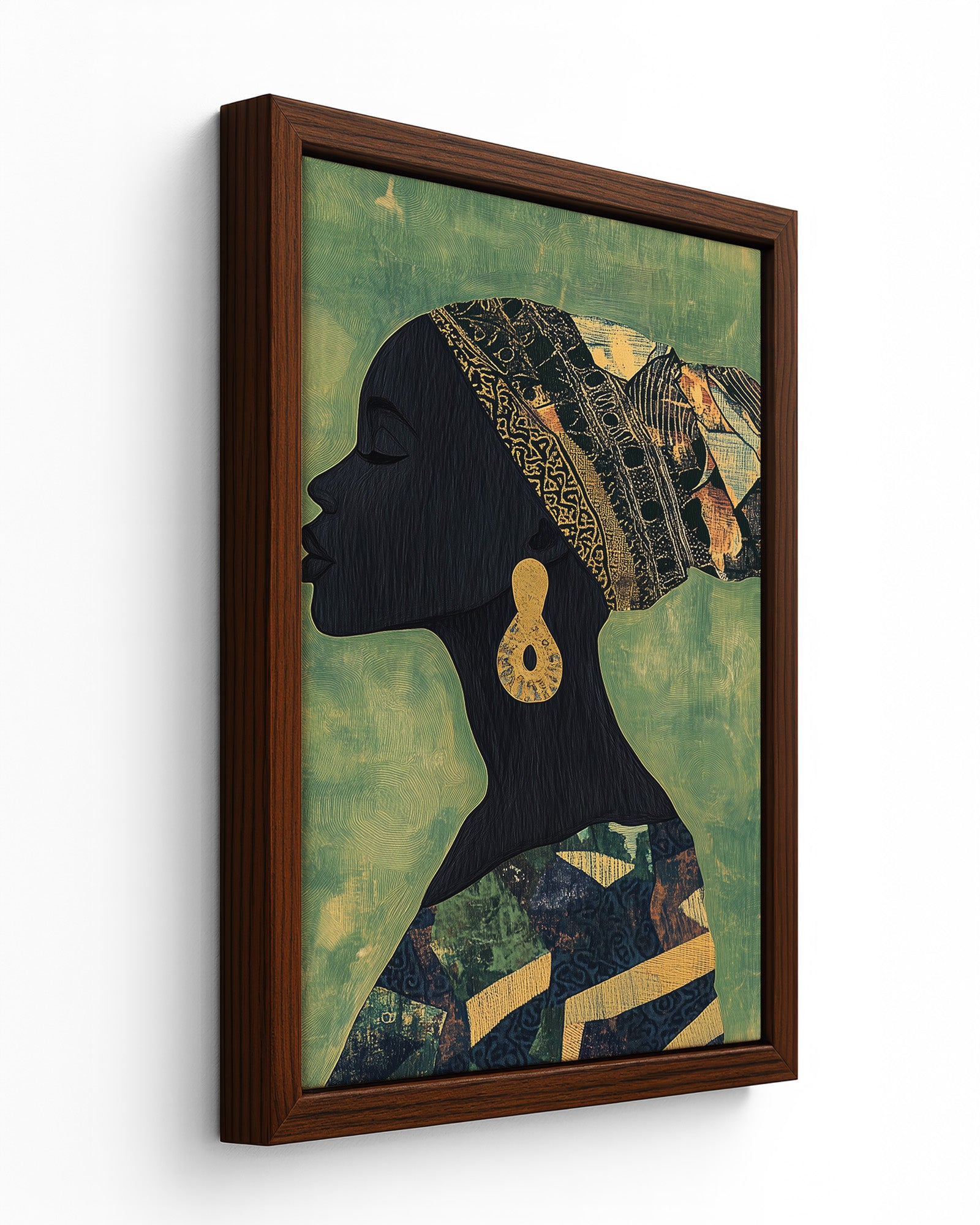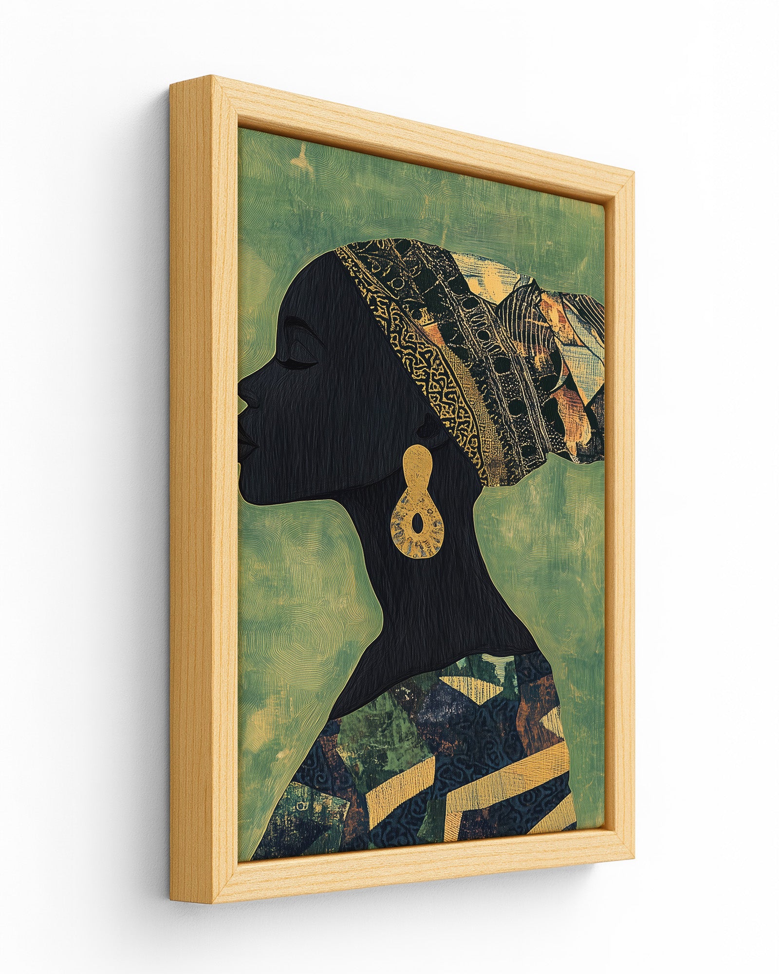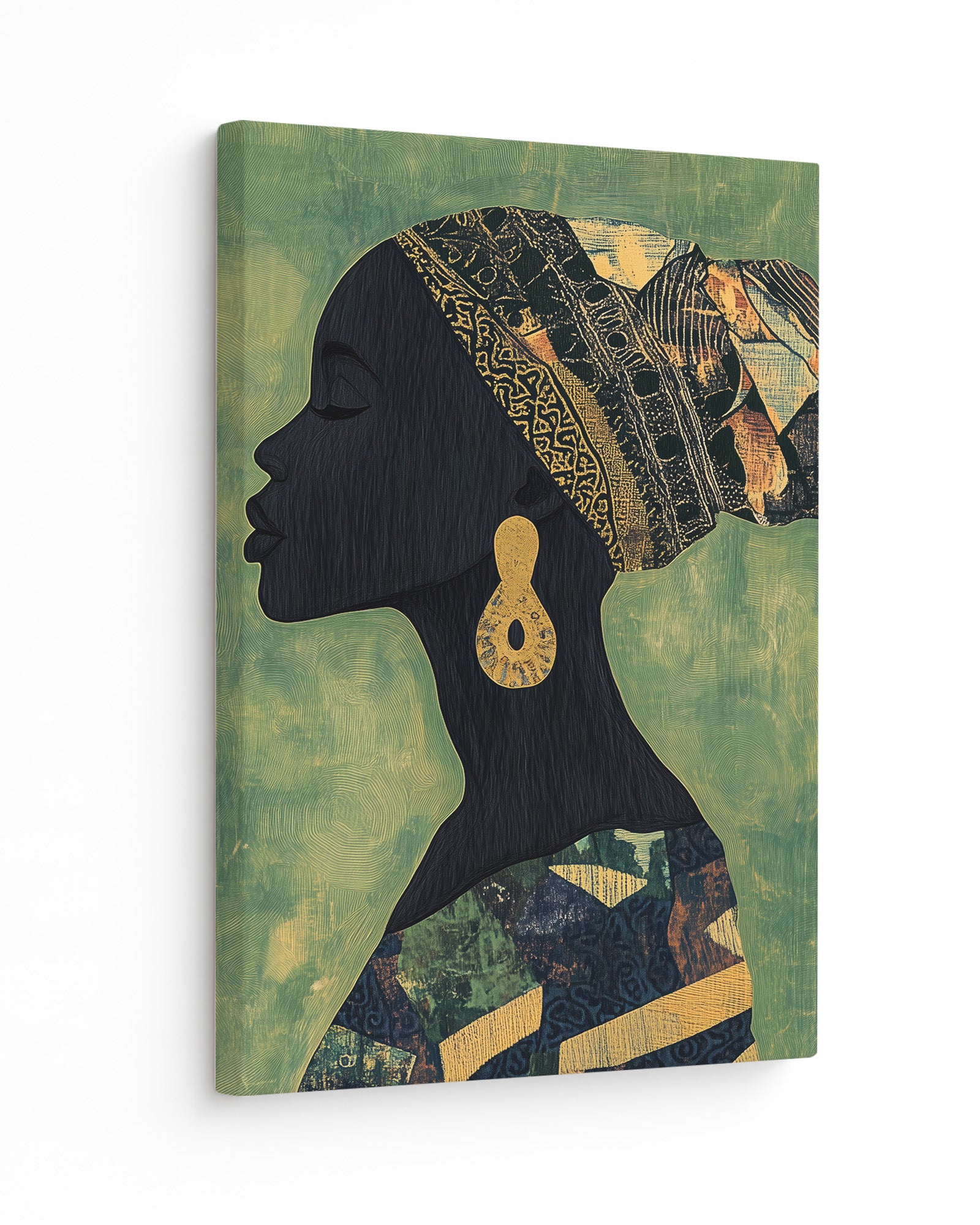 Experience the beauty of African heritage with this minimalist artwork featuring a silhouette of a woman adorned in intricate gold and beige patterns. Set against a deep olive-green background, her earrings and headscarf shimmer with cultural elegance.