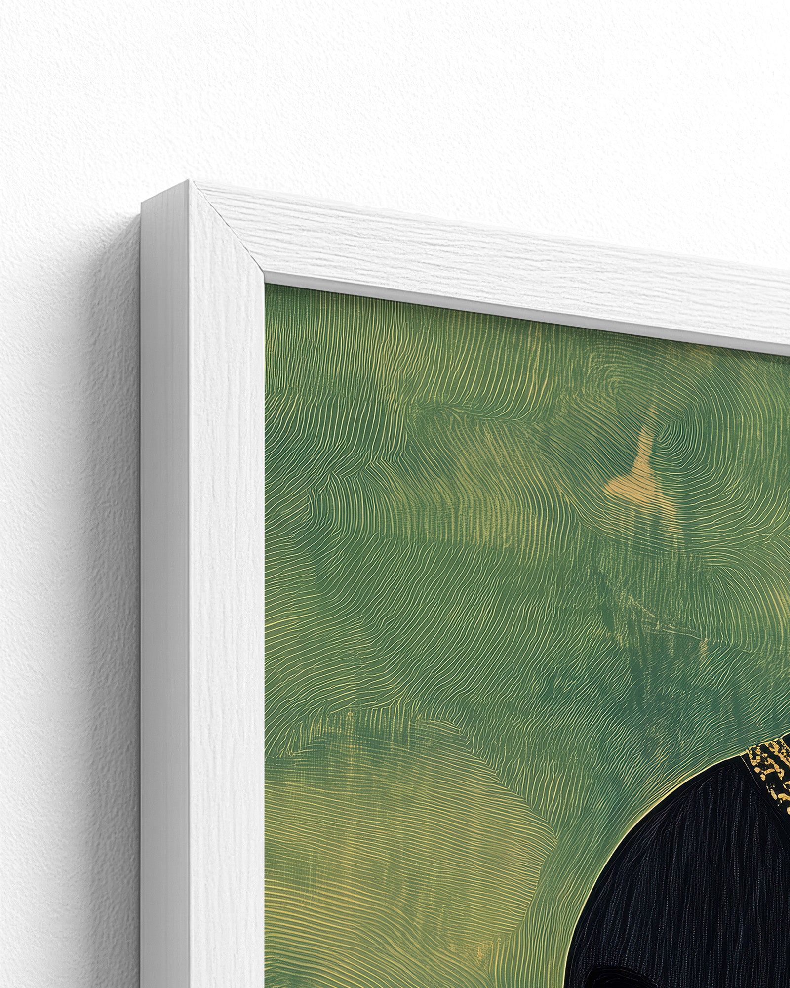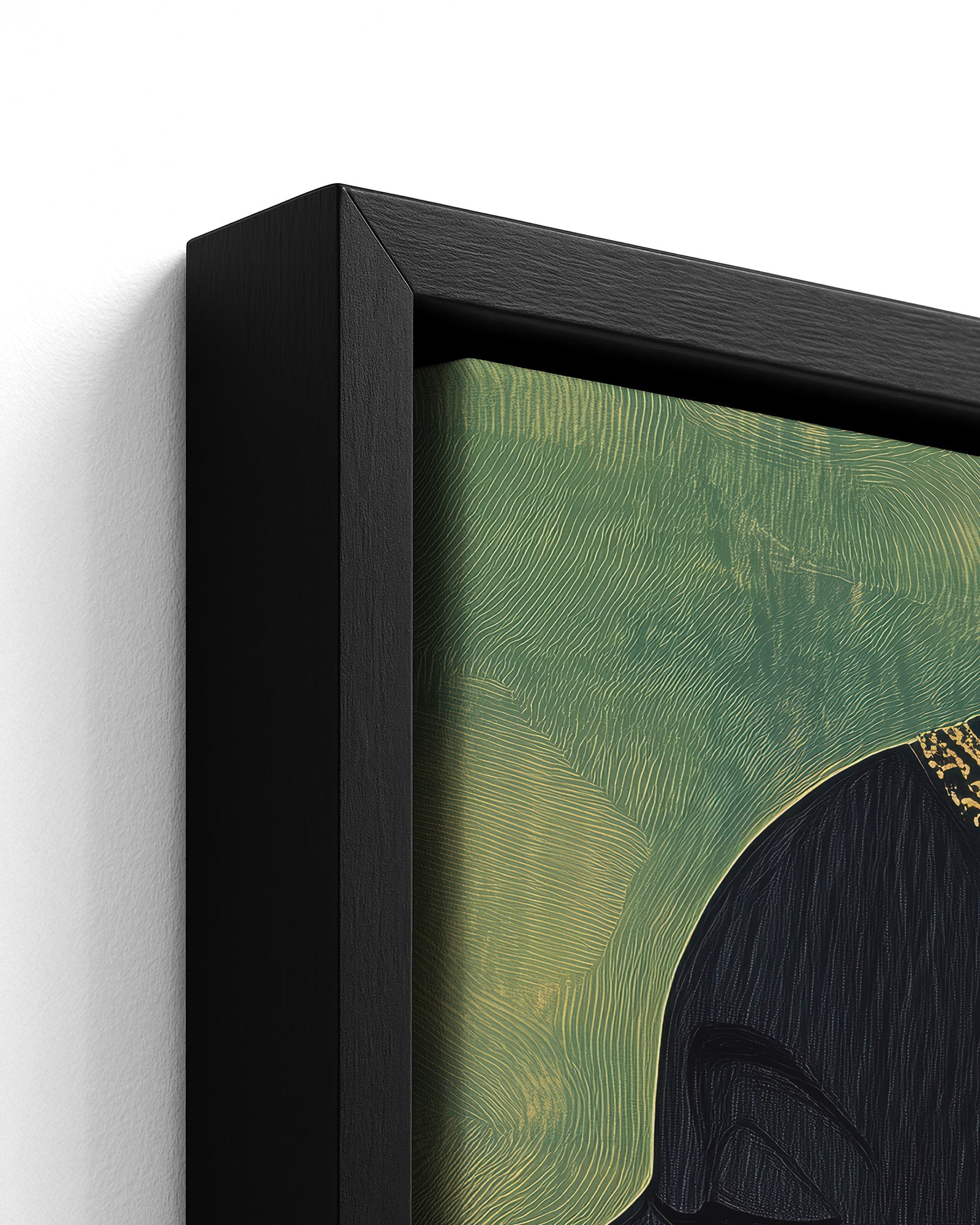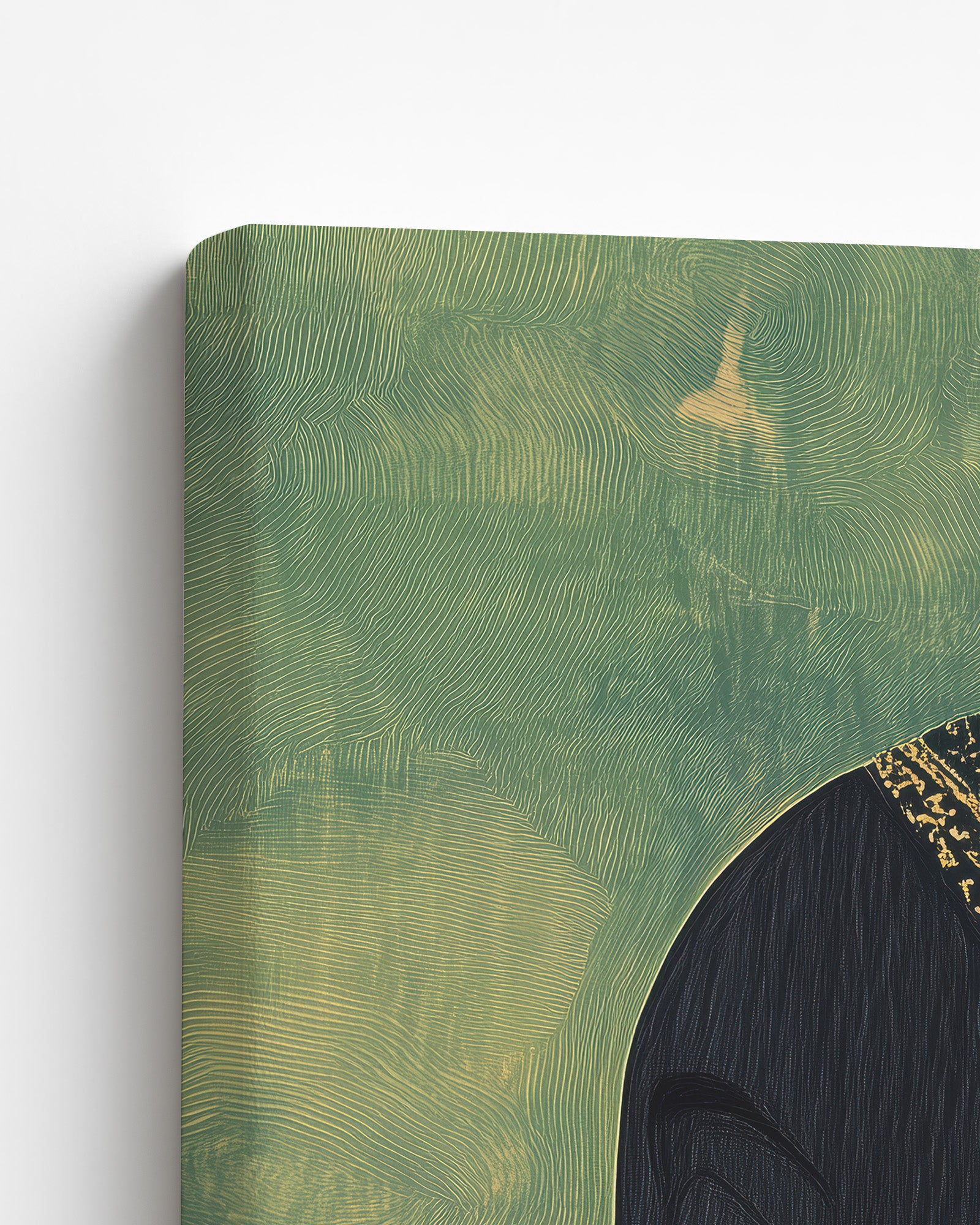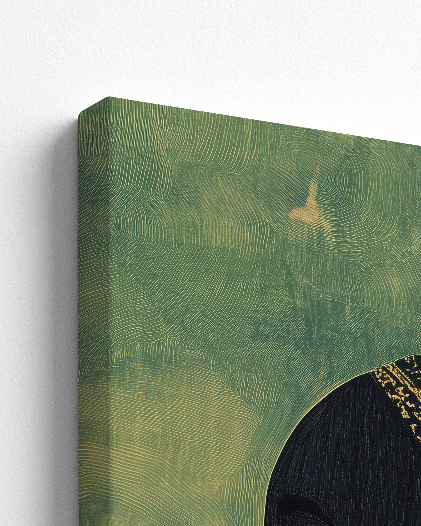 Experience the beauty of African heritage with this minimalist artwork featuring a silhouette of a woman adorned in intricate gold and beige patterns. Set against a deep olive-green background, her earrings and headscarf shimmer with cultural elegance.