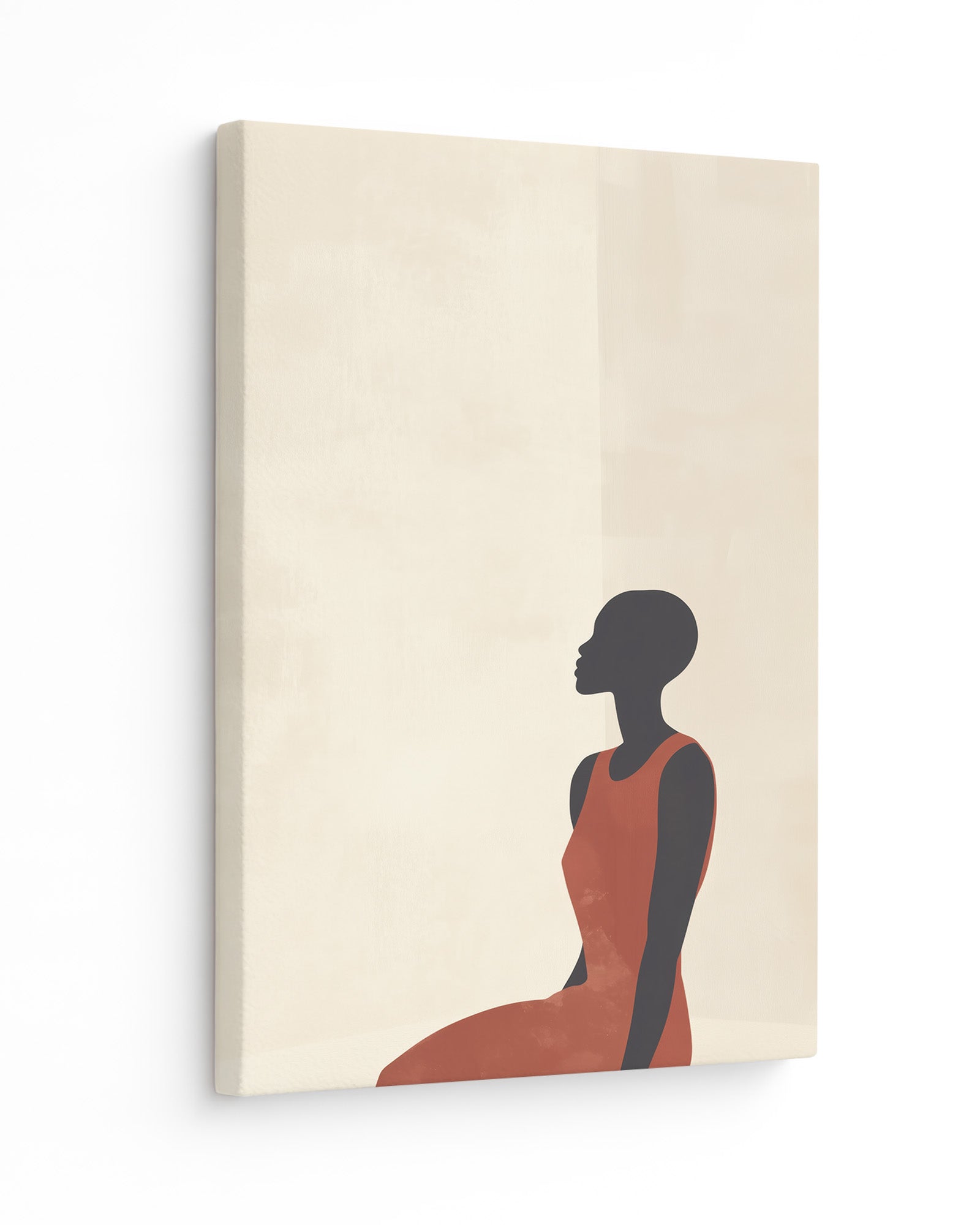 This powerful art captures an African woman in a moment of profound serenity, kneeling with her head bowed to the ground against a minimalist beige wall. Her dress flows around her form while her natural curls cascade gracefully, creating a striking contrast against the neutral backdrop. Soft, ambient lighting casts gentle shadows that enhance the meditative atmosphere, evoking themes of peace, reflection, and spiritual connection.