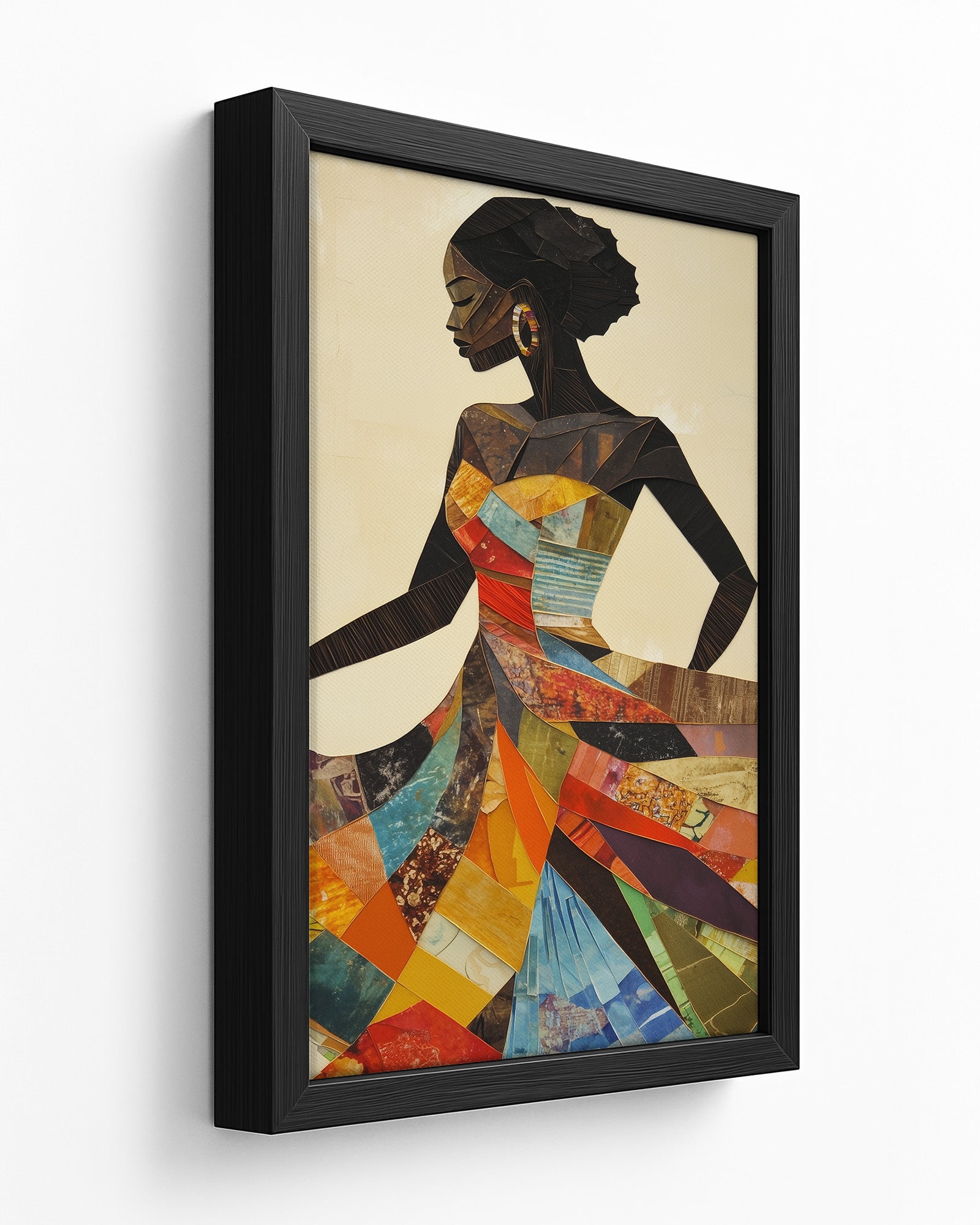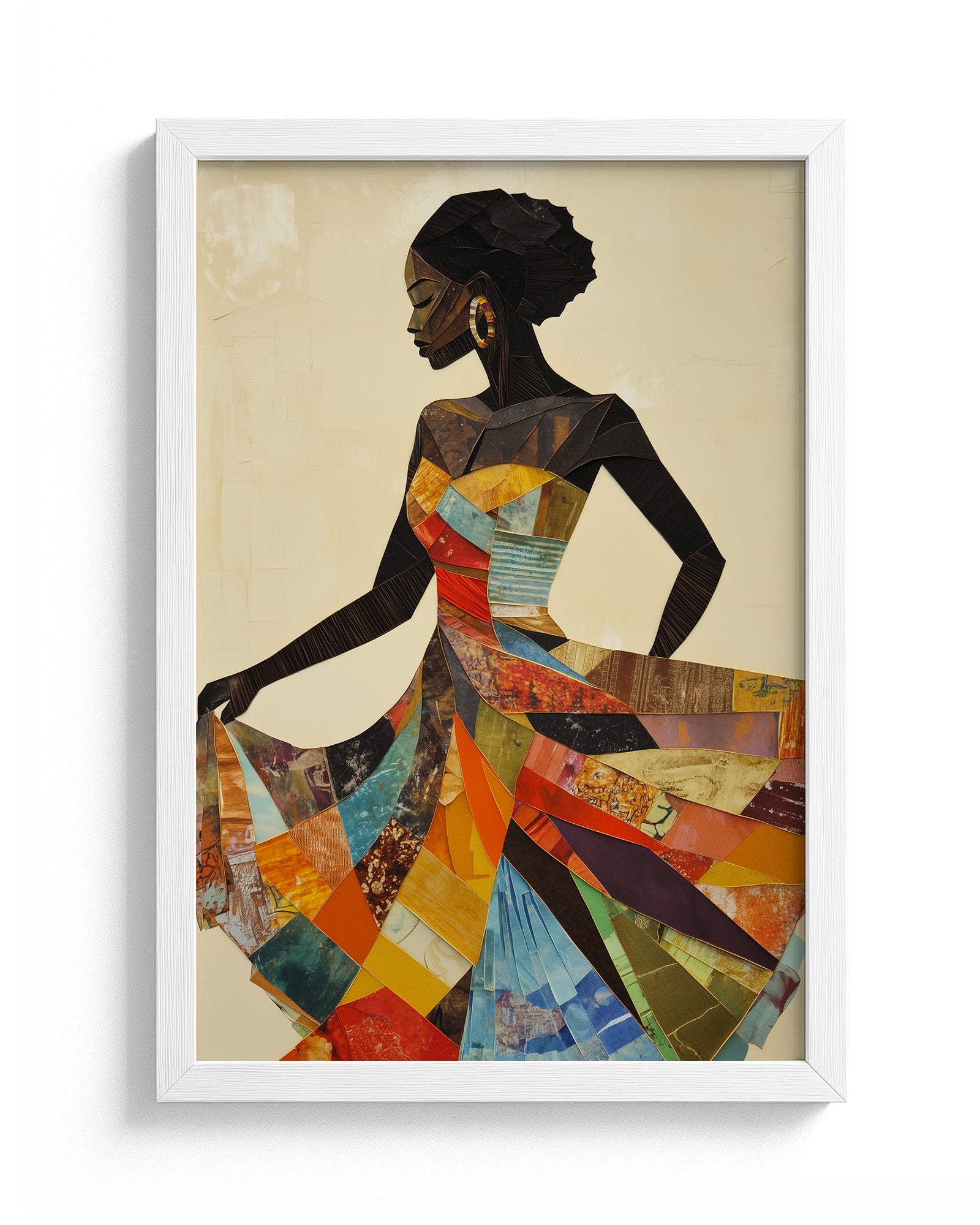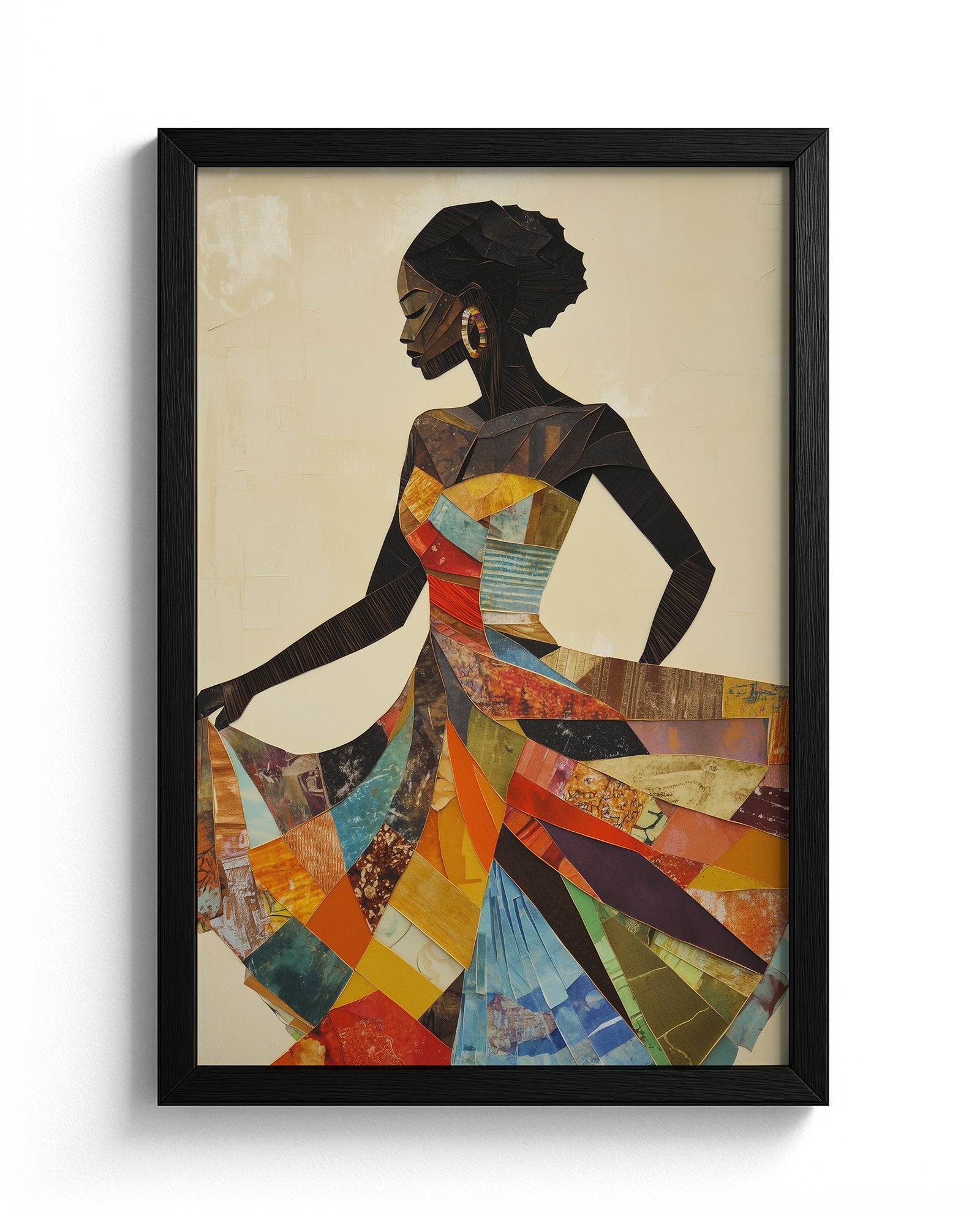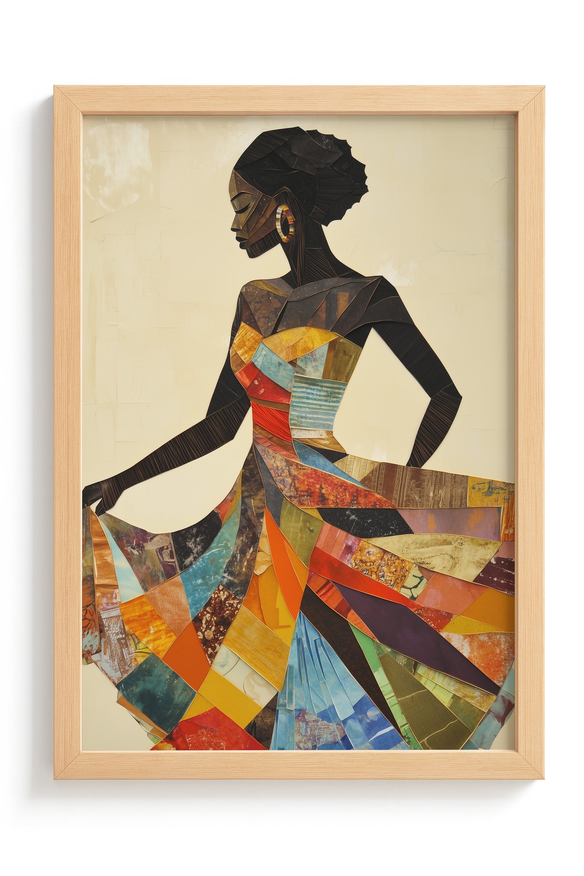 Elevate your space with this stunning minimalist collage art, celebrating African heritage and timeless elegance. A regal African woman, her silhouette adorned in vibrant, torn-paper textures, stands against a warm beige canvas.