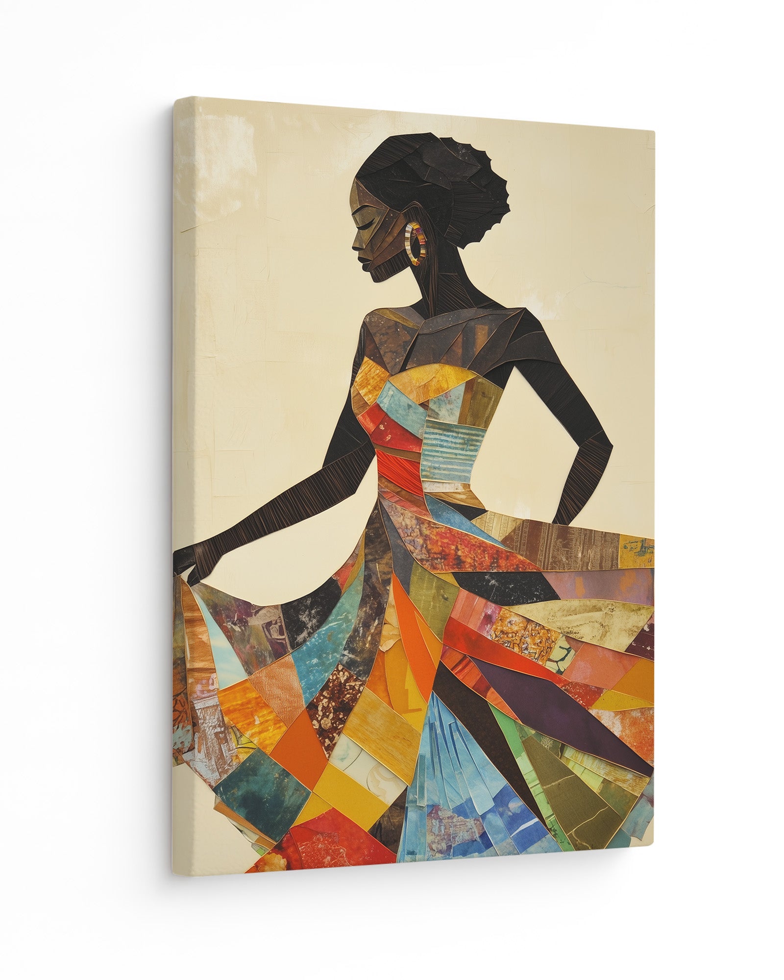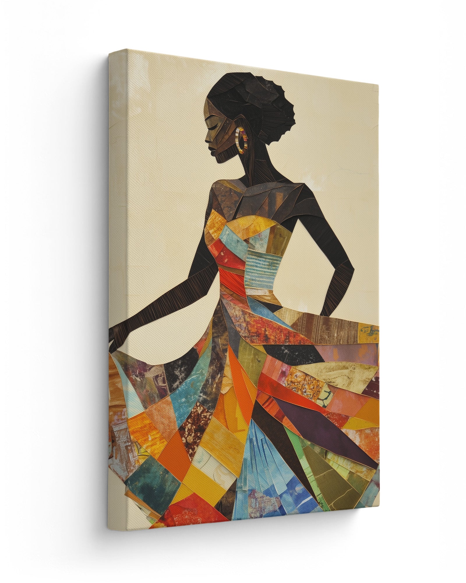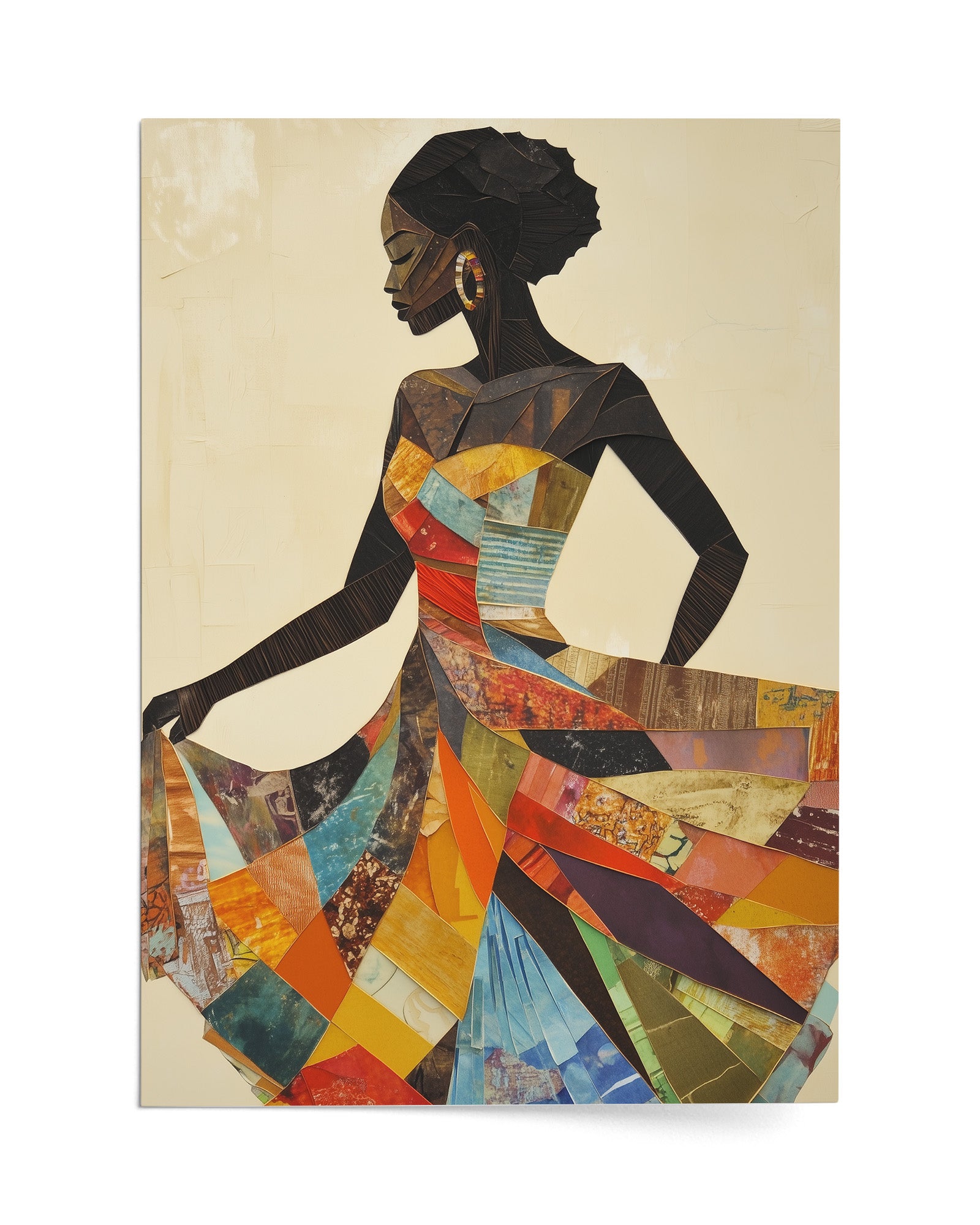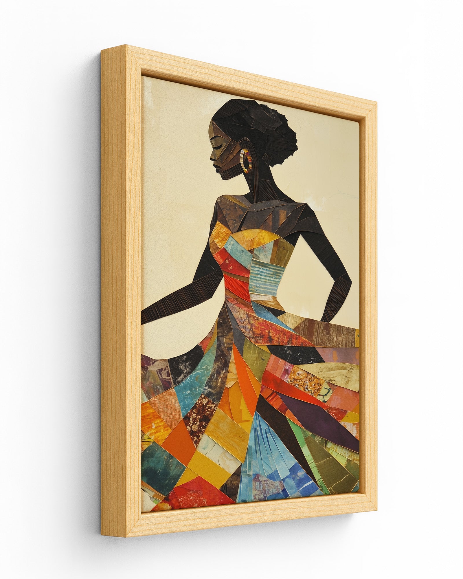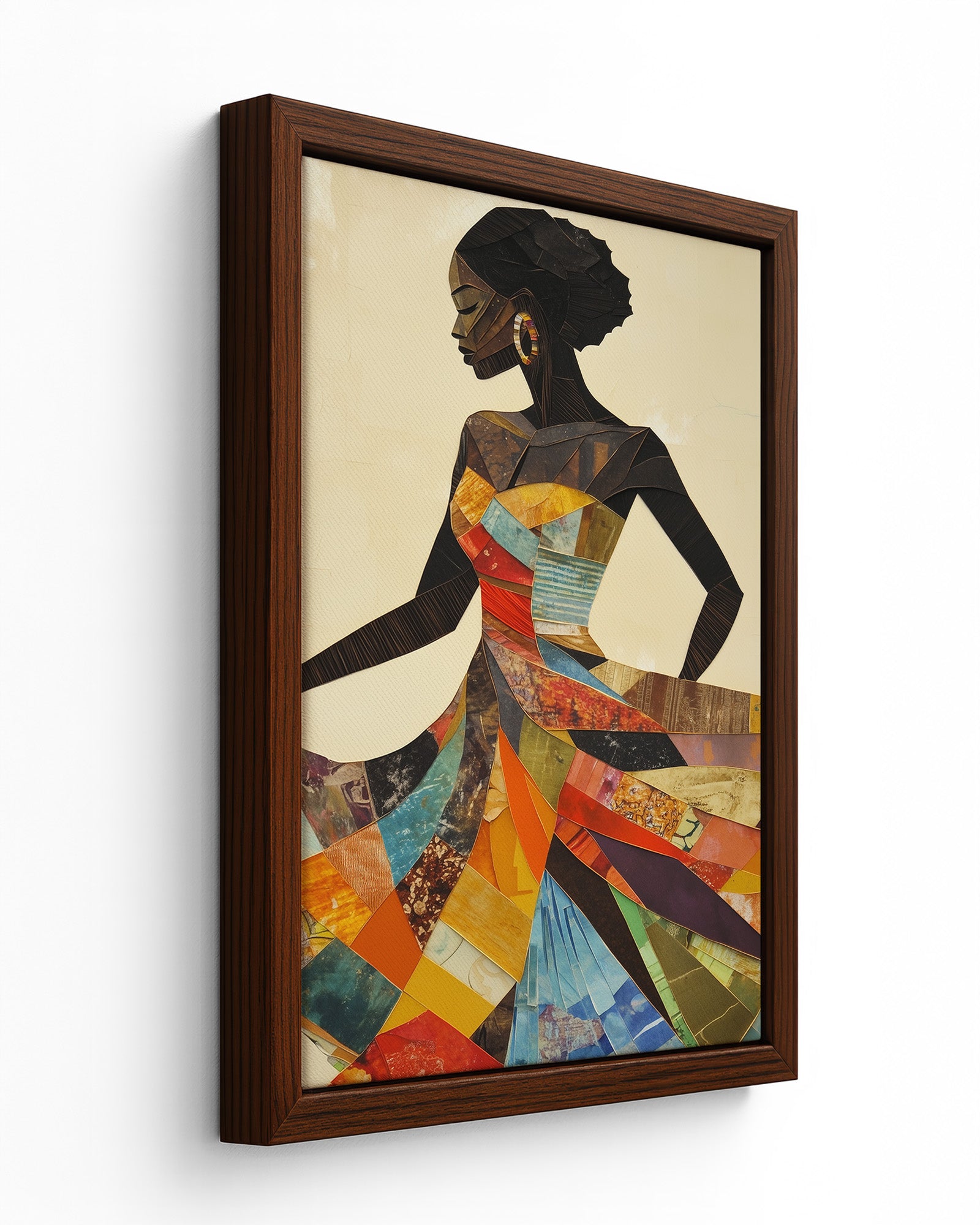 Elevate your space with this stunning minimalist collage art, celebrating African heritage and timeless elegance. A regal African woman, her silhouette adorned in vibrant, torn-paper textures, stands against a warm beige canvas.