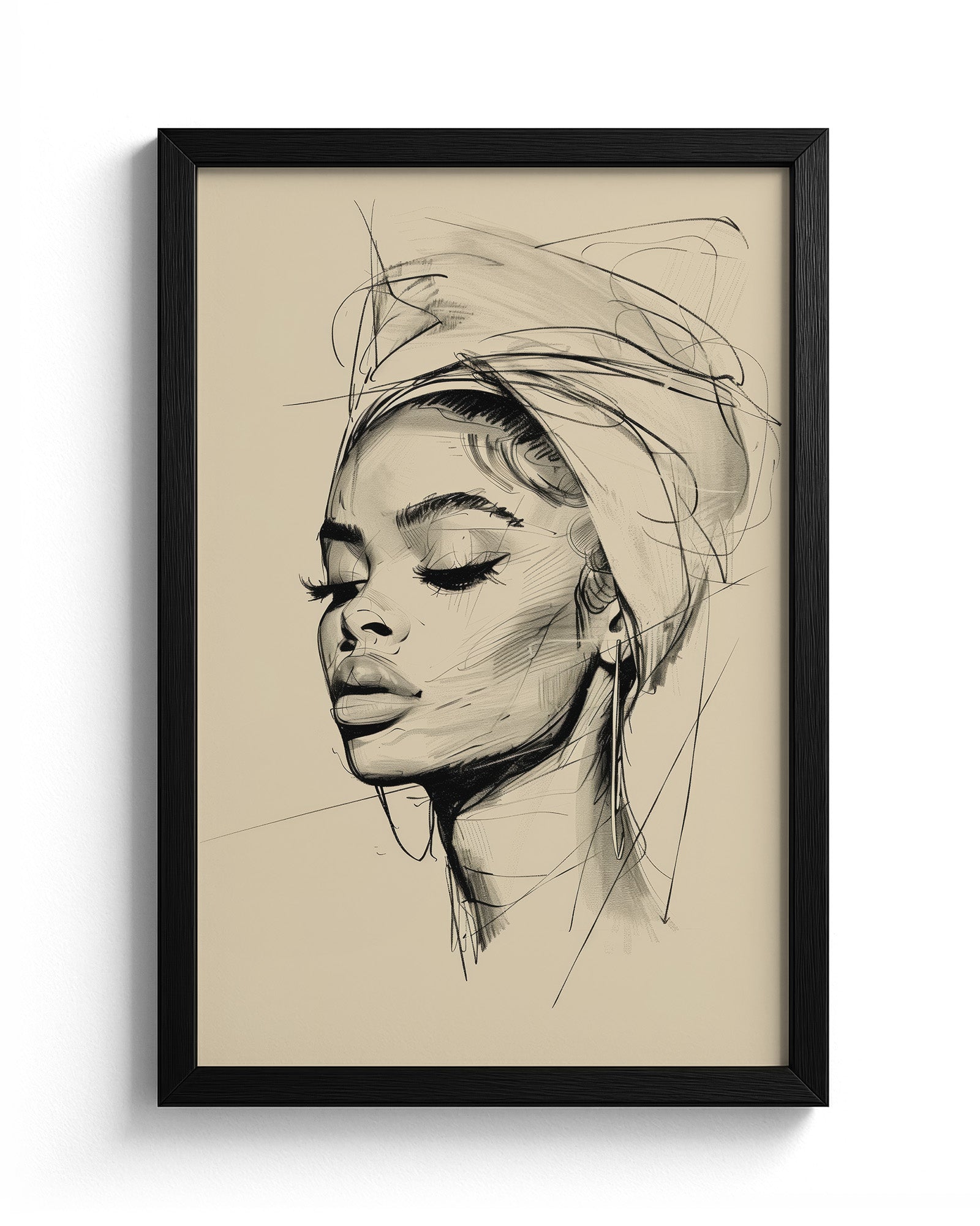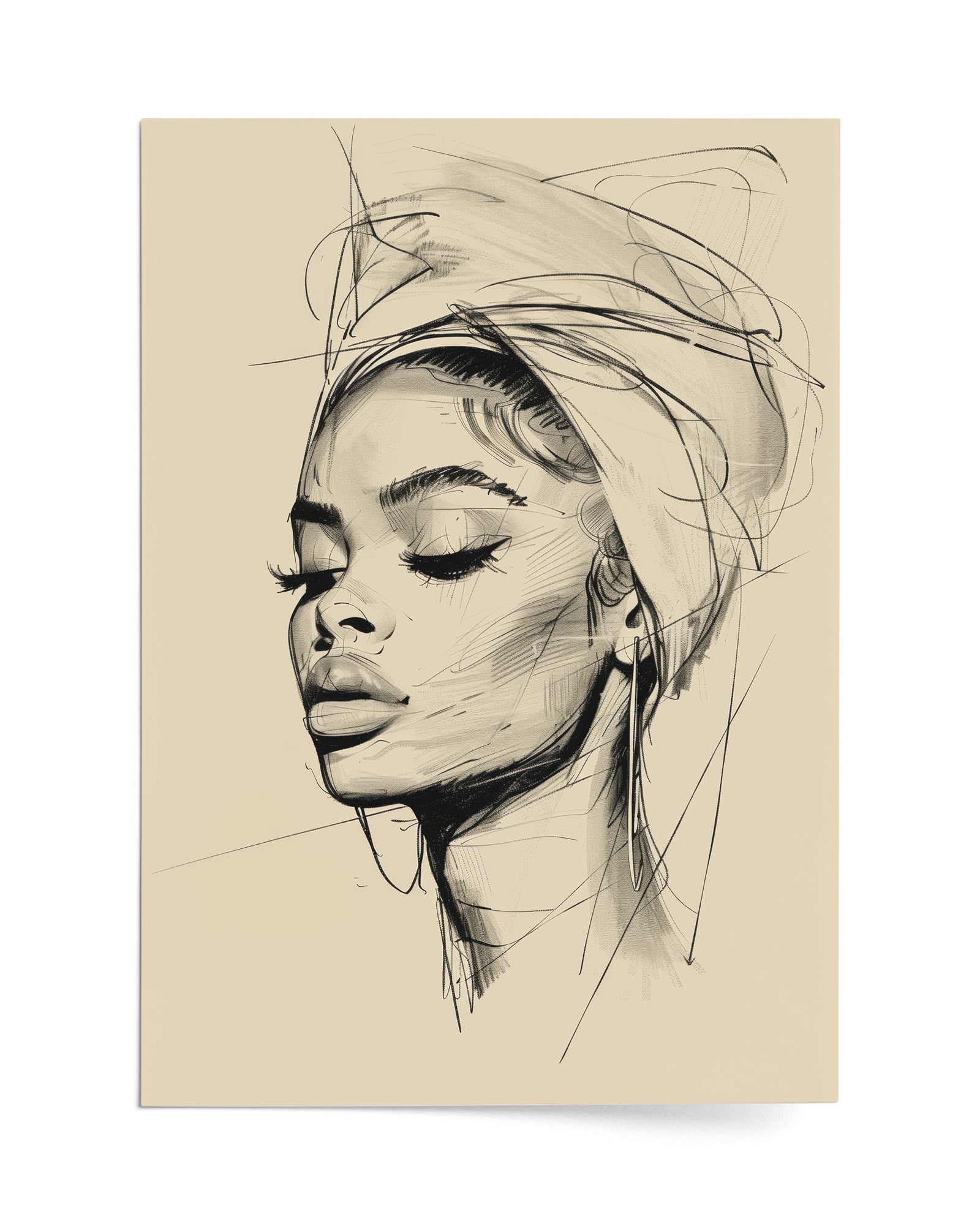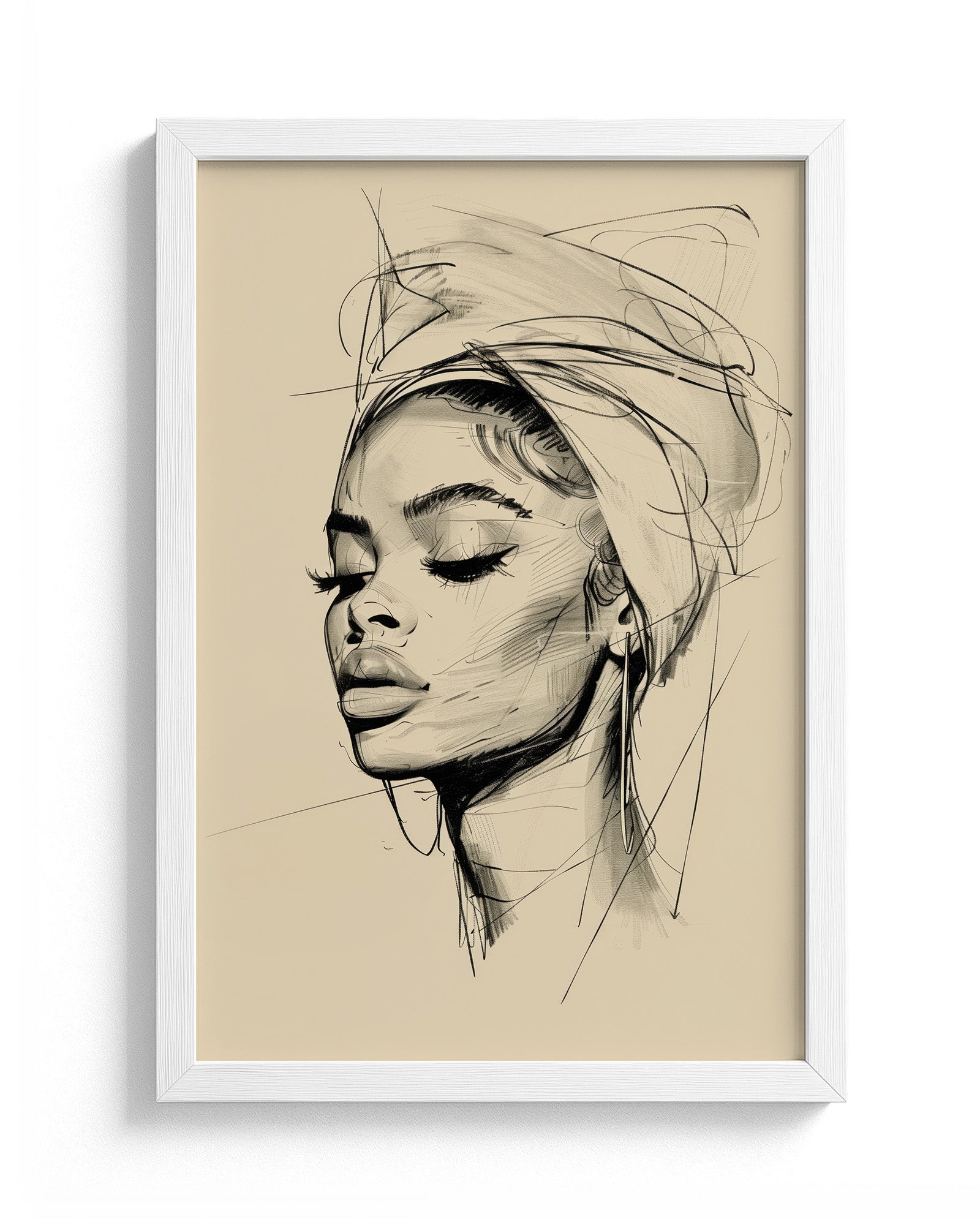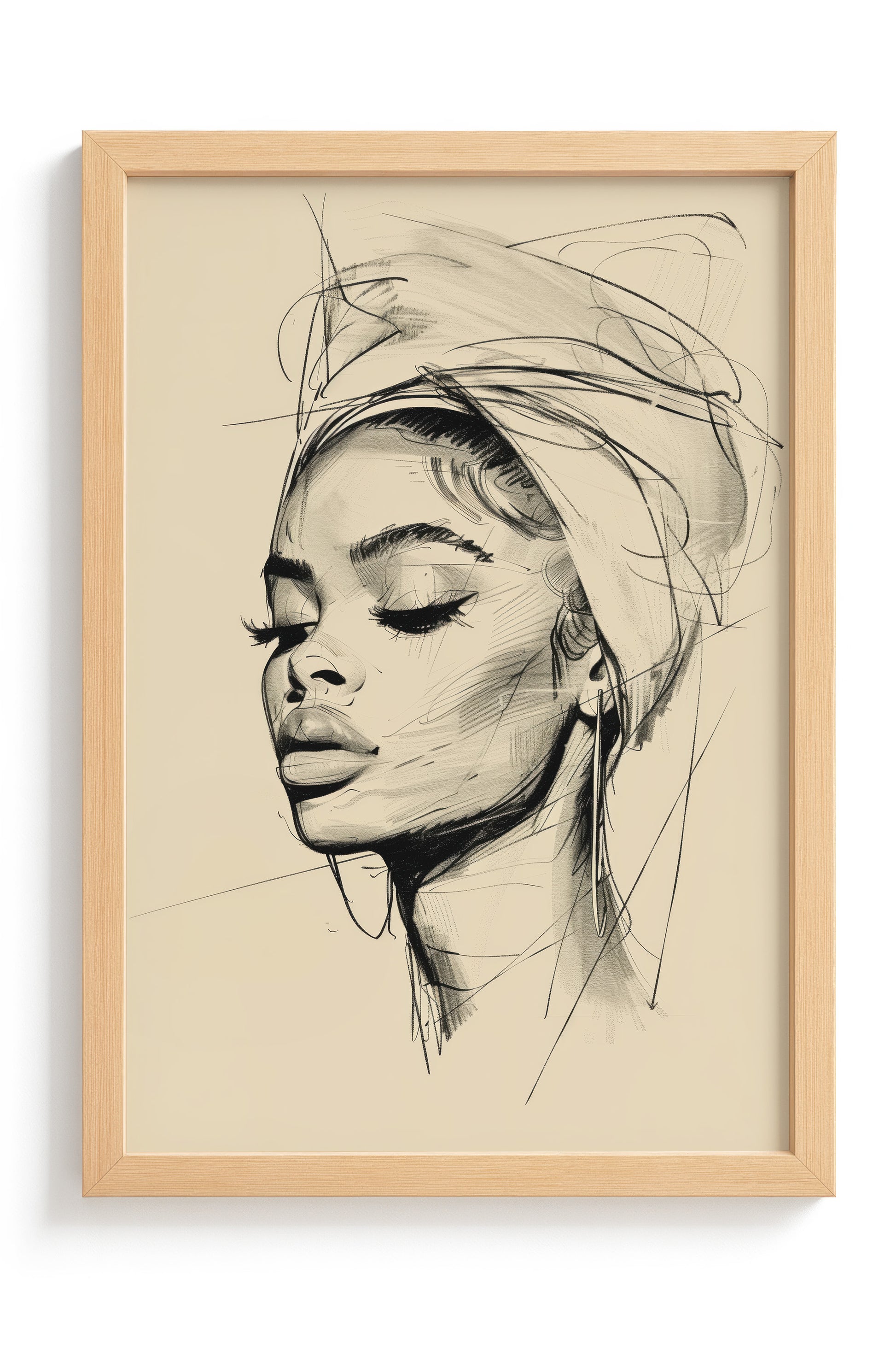 This minimalist pencil drawing captures the quiet strength and elegance of an African woman in profile, her head tilted back in a moment of serene contemplation. Delicate yet expressive pencil strokes define her features with soft shading, while her flowing ponytail adds a sense of movement and grace.