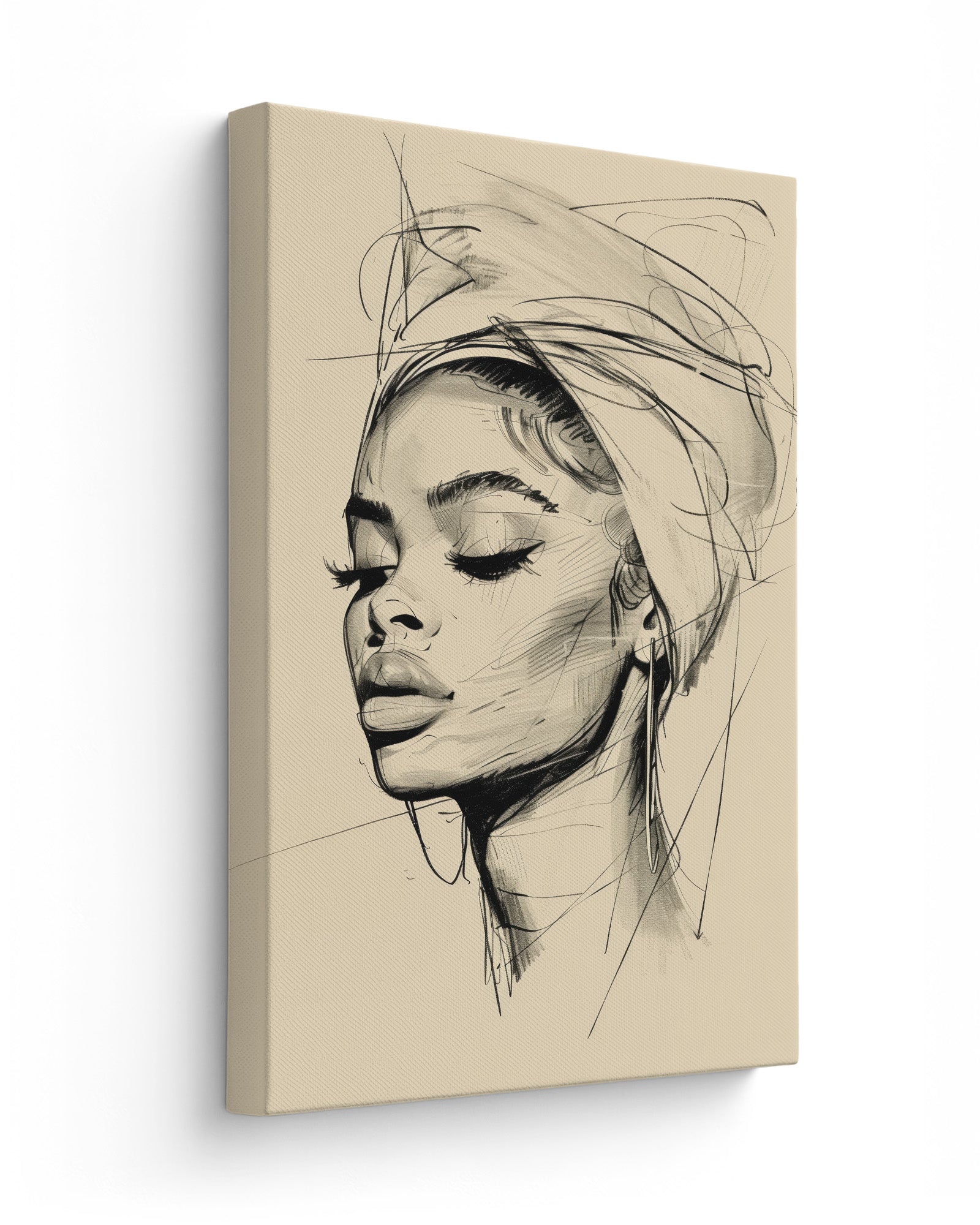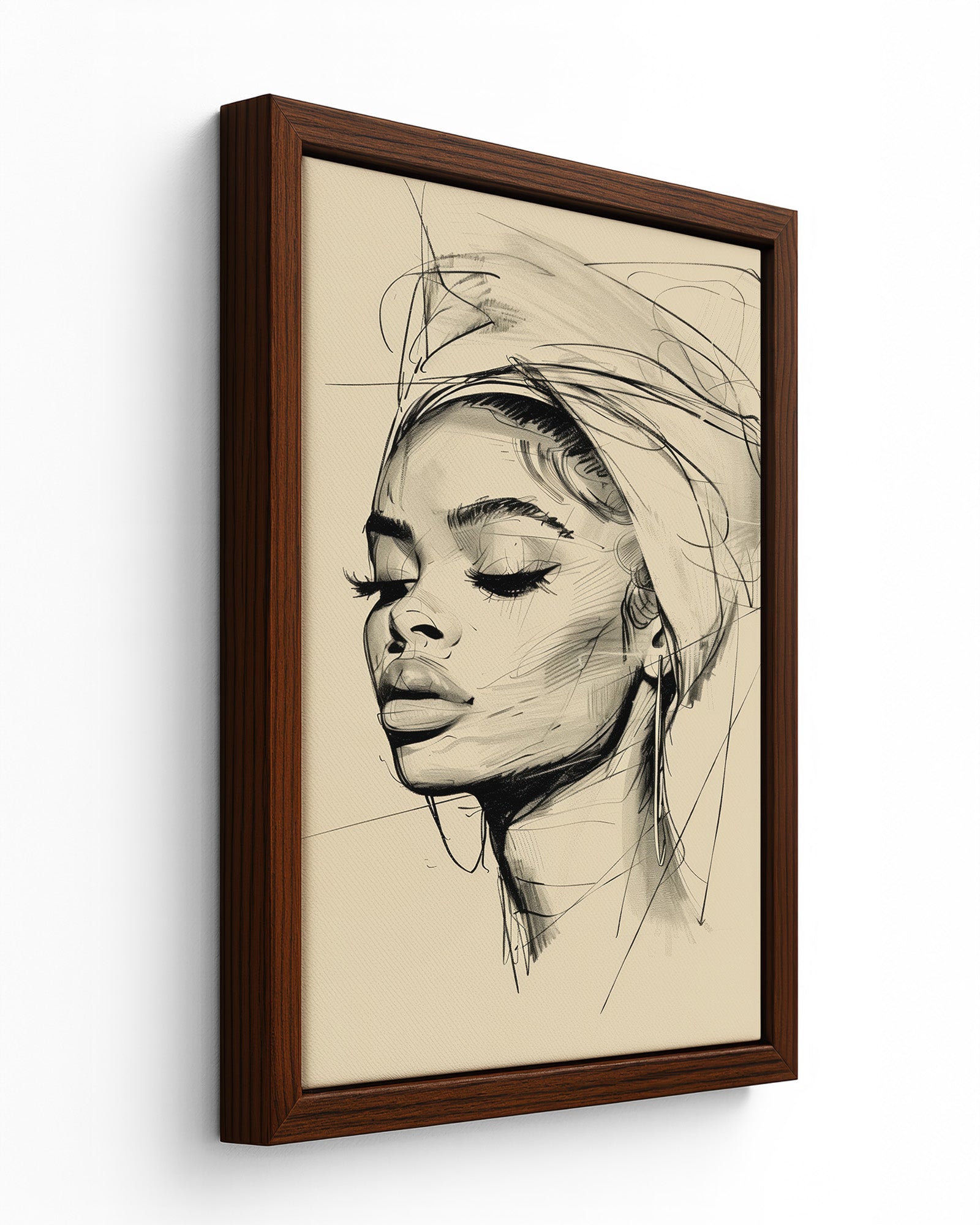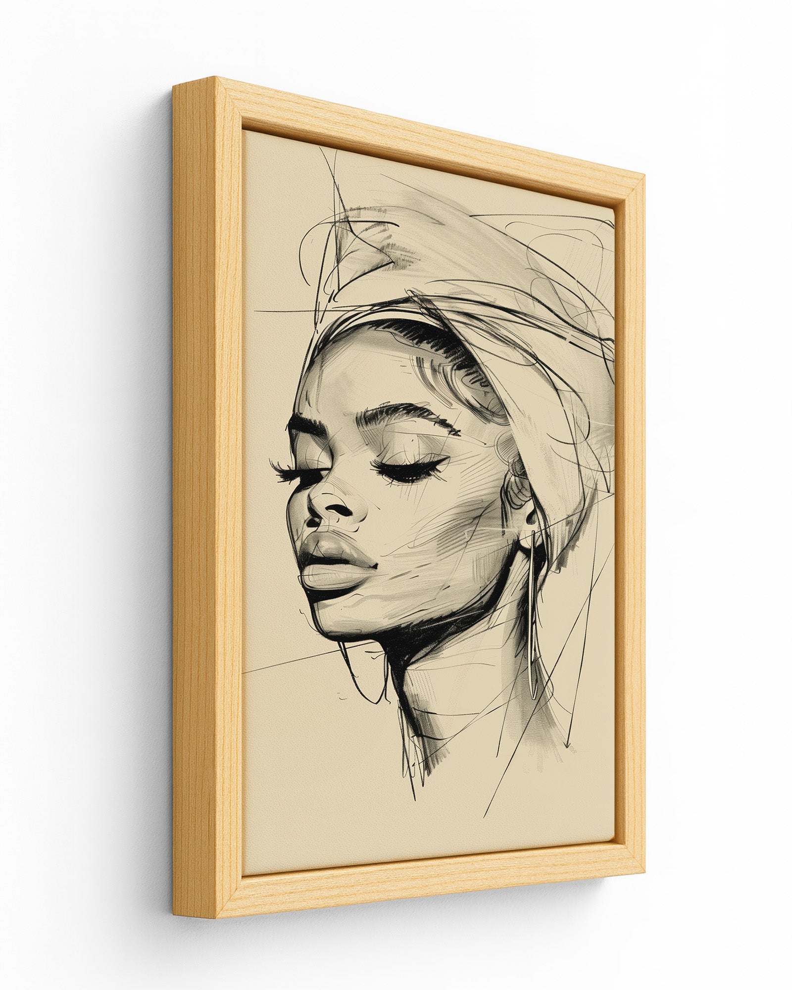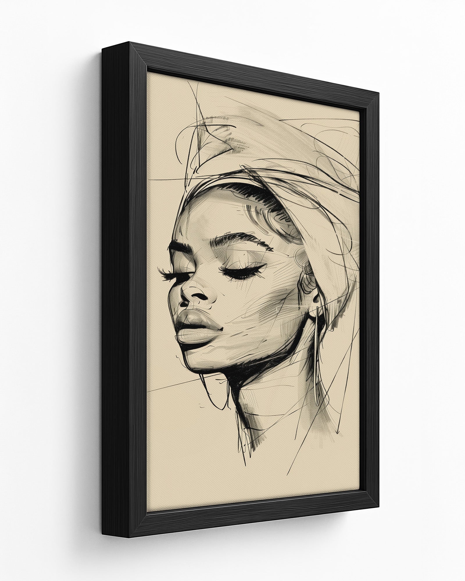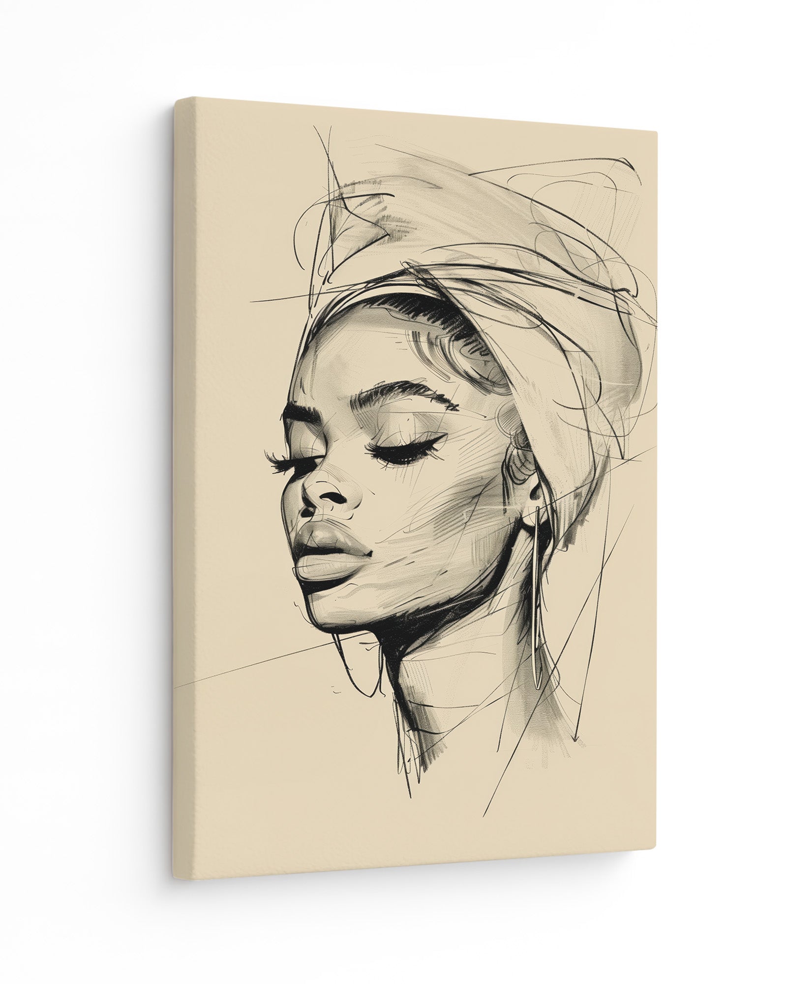 This minimalist pencil drawing captures the quiet strength and elegance of an African woman in profile, her head tilted back in a moment of serene contemplation. Delicate yet expressive pencil strokes define her features with soft shading, while her flowing ponytail adds a sense of movement and grace.