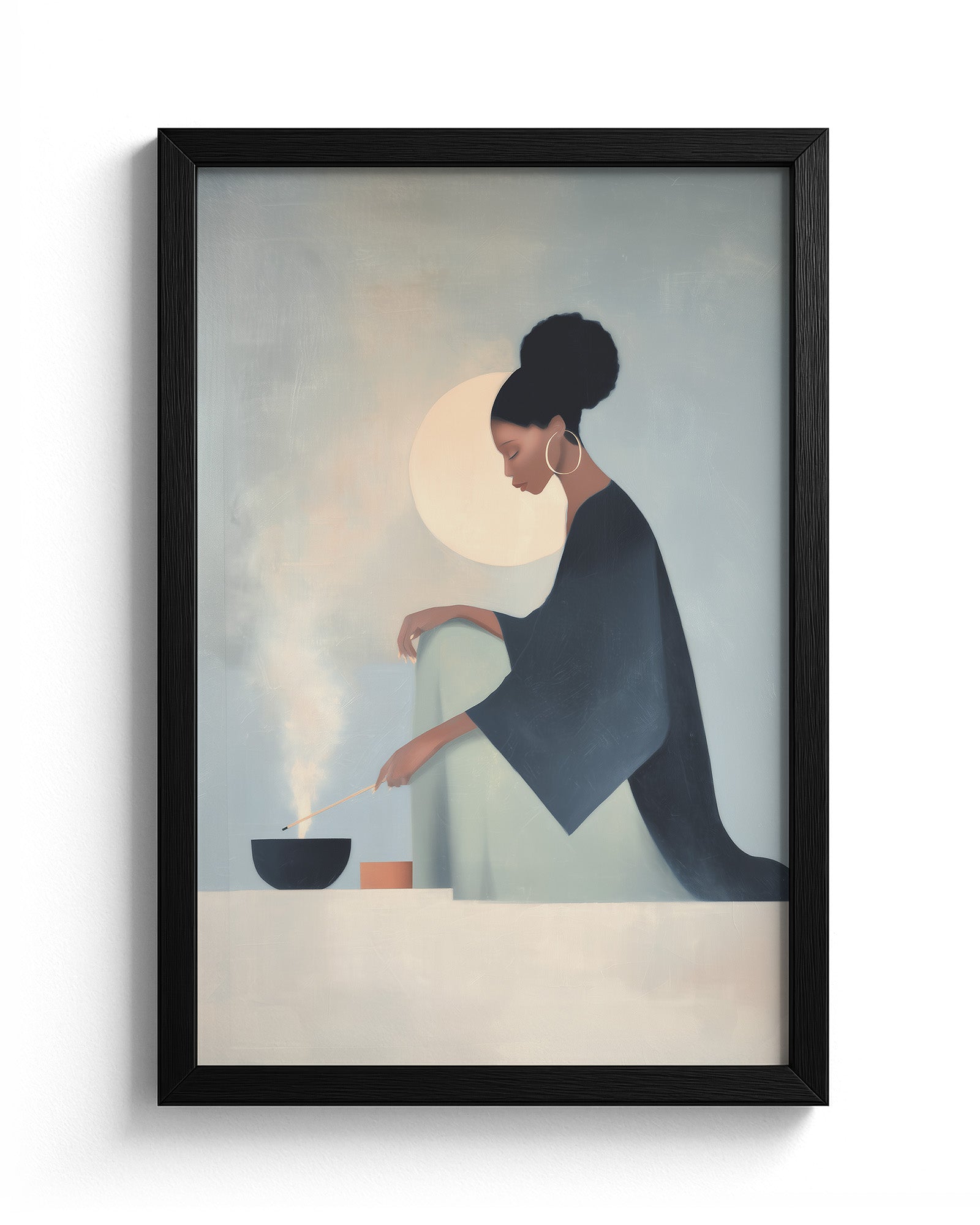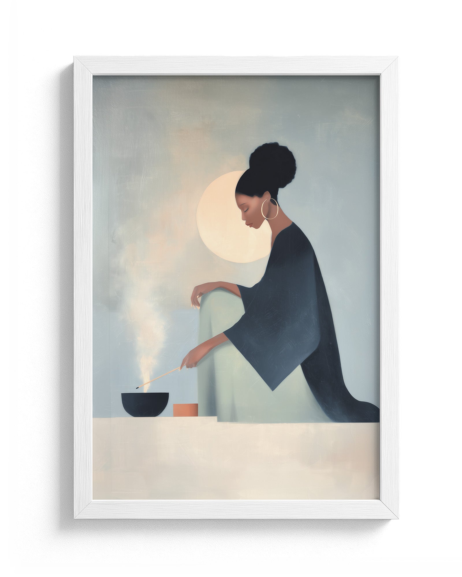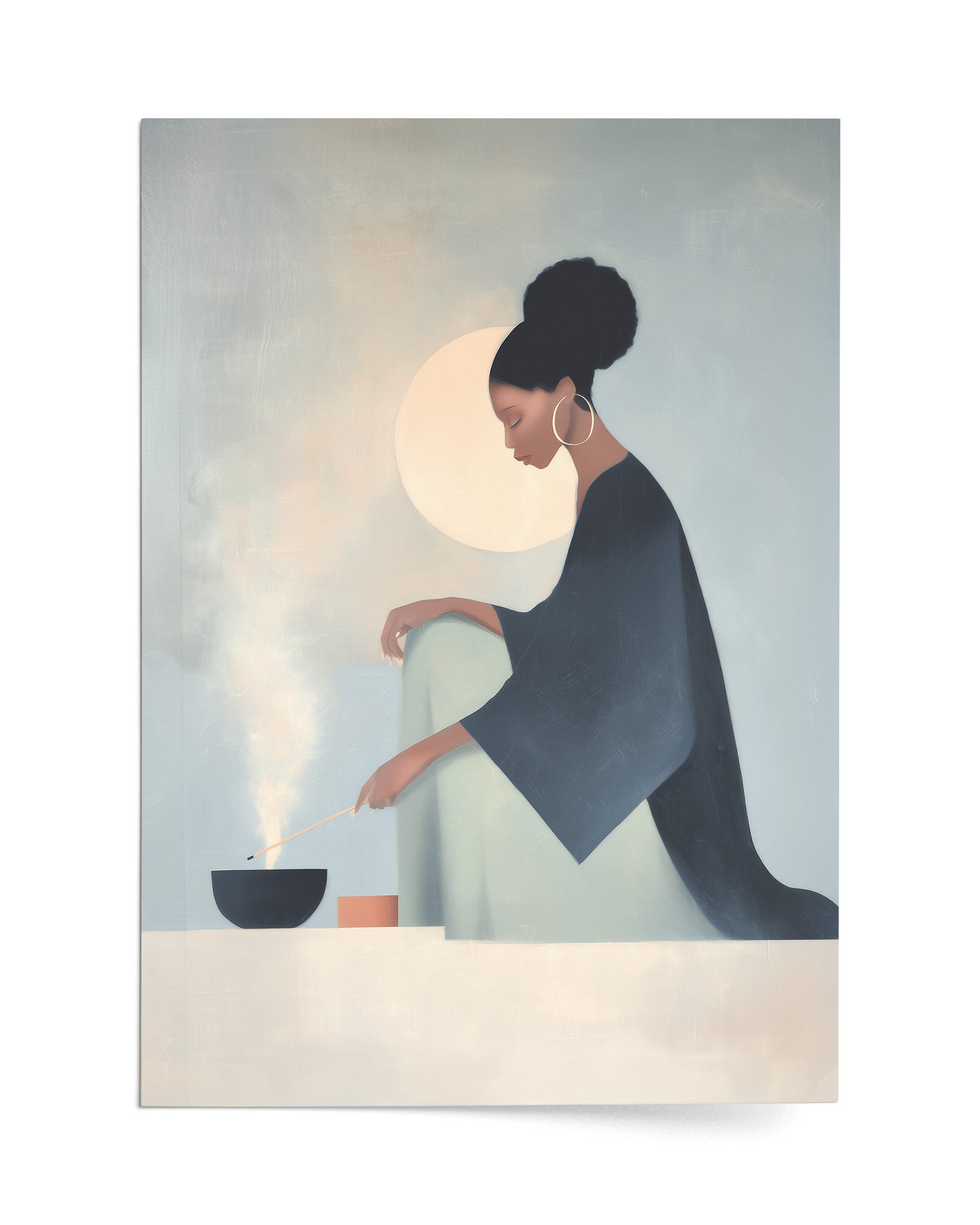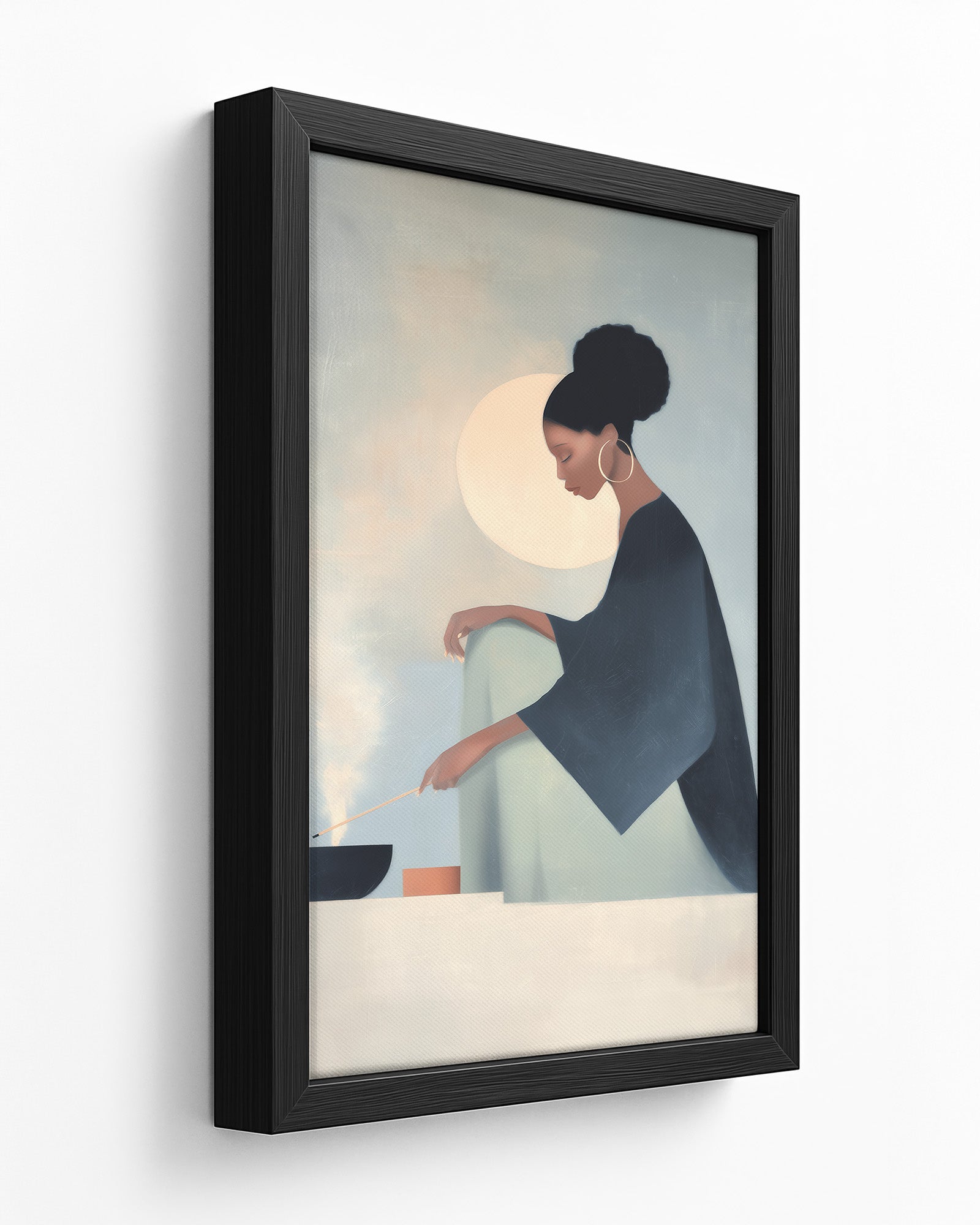 She Knows the Ritual: Art on Spiritual Practice, Self Care, and the Rituals Women Use to Ground Themselves. This luminous composition captures a woman engaged in the act of lighting incense within intimate home sanctuary, revealing how fire and smoke become instruments through which women create sacred space and call in protection.