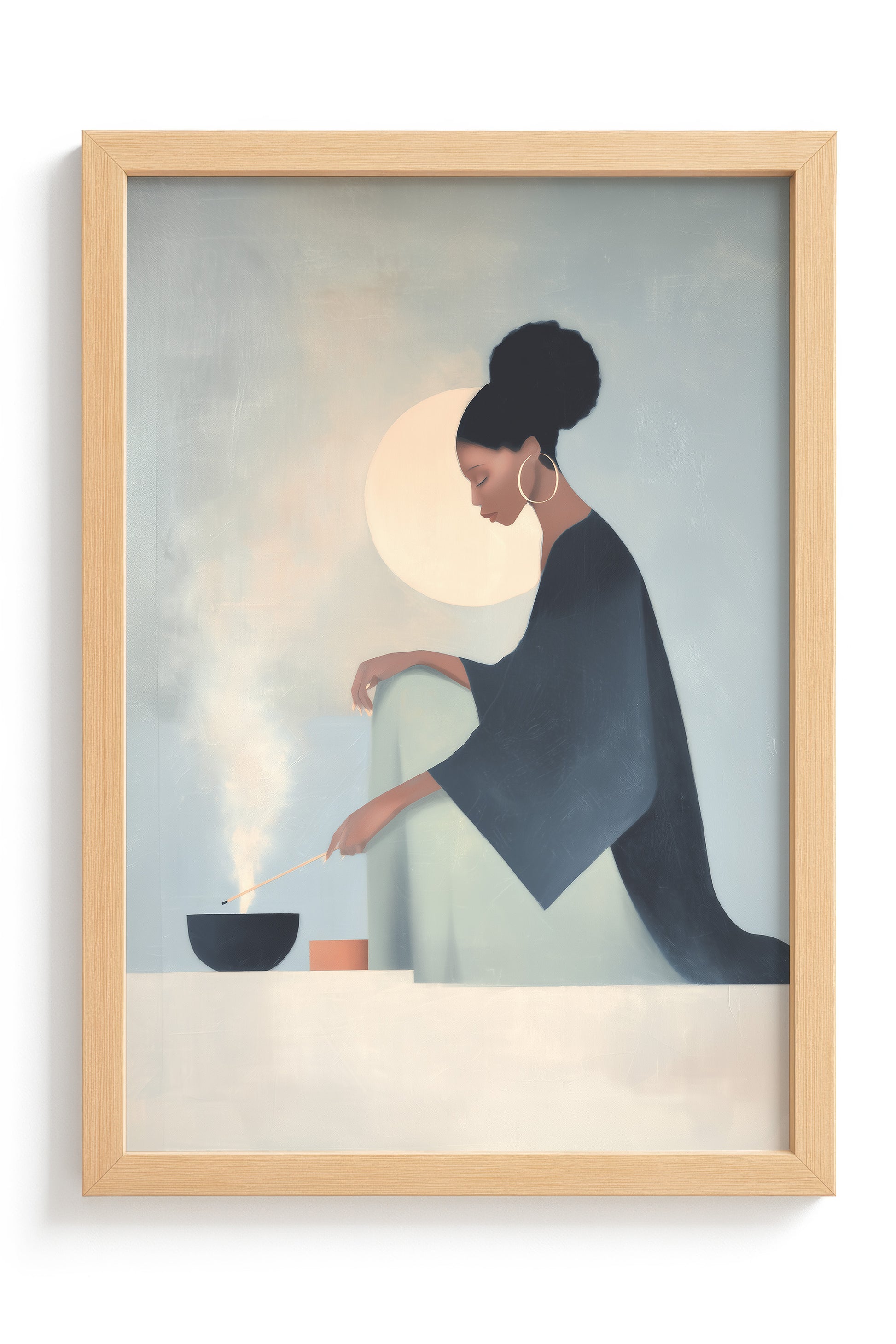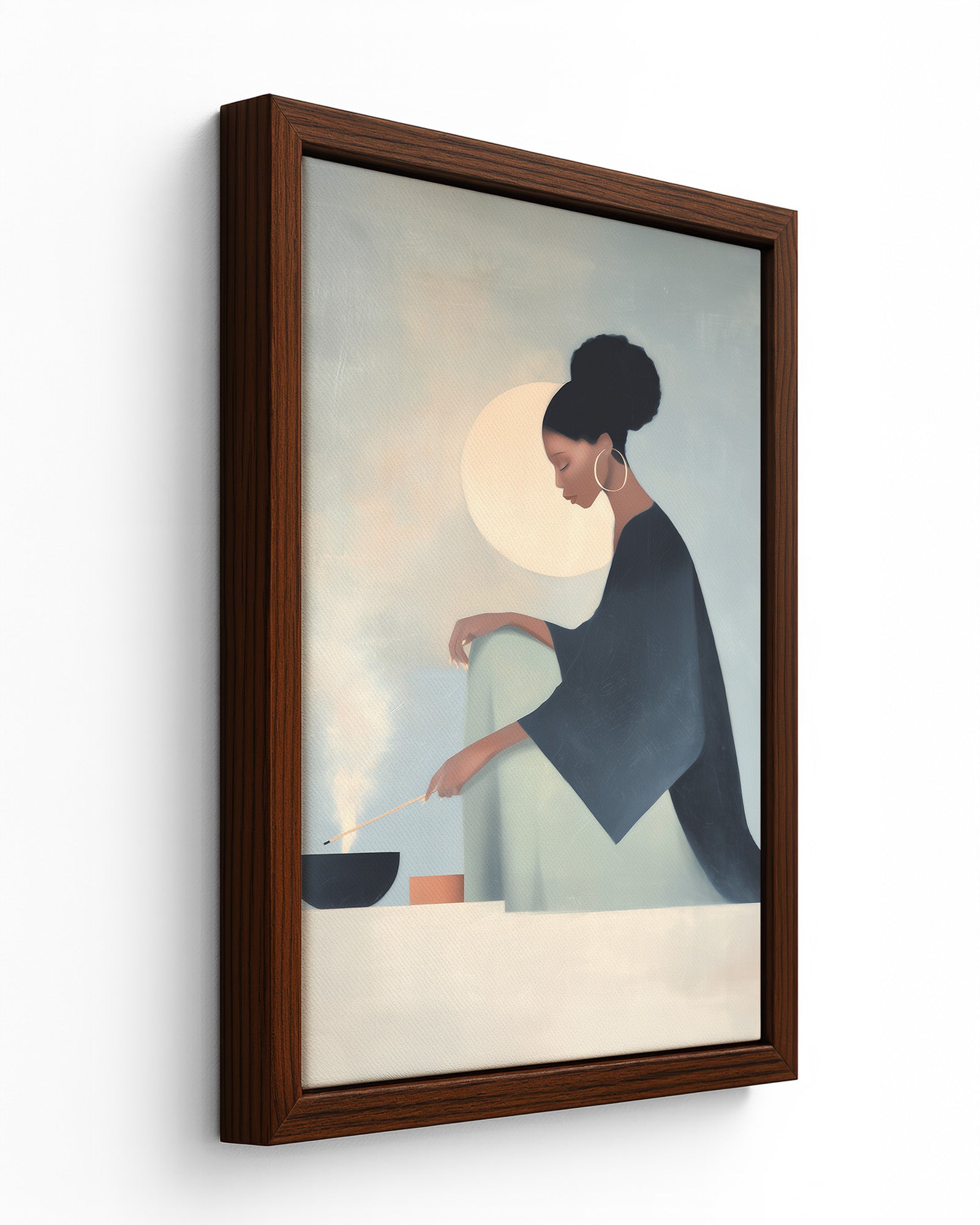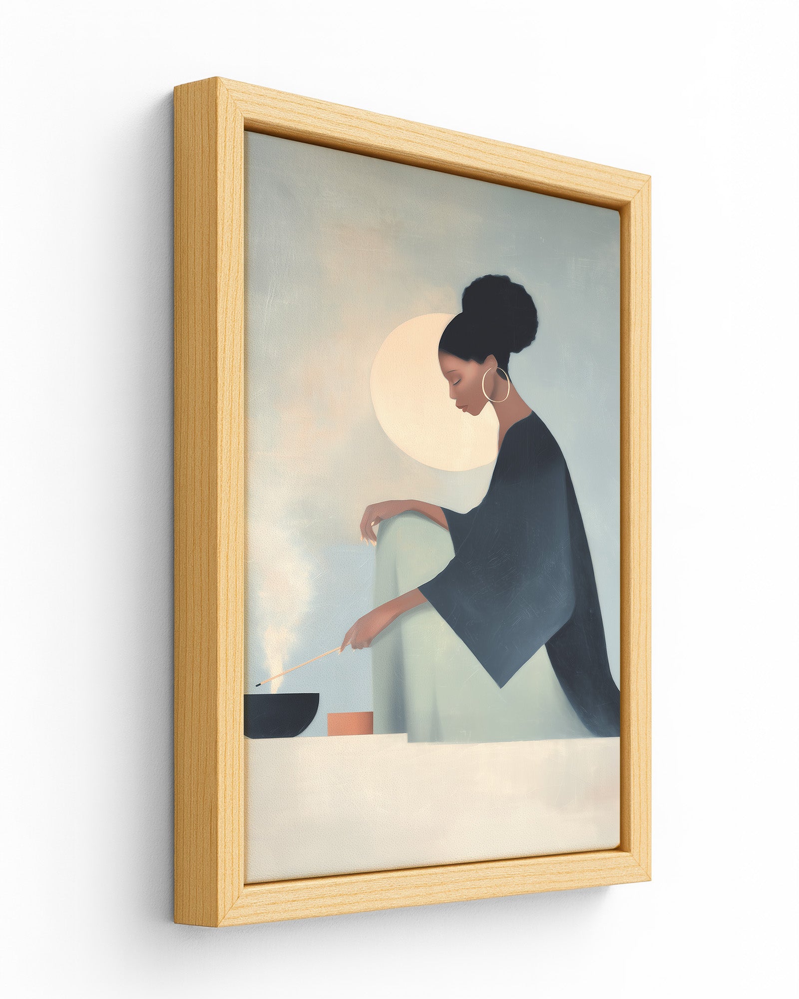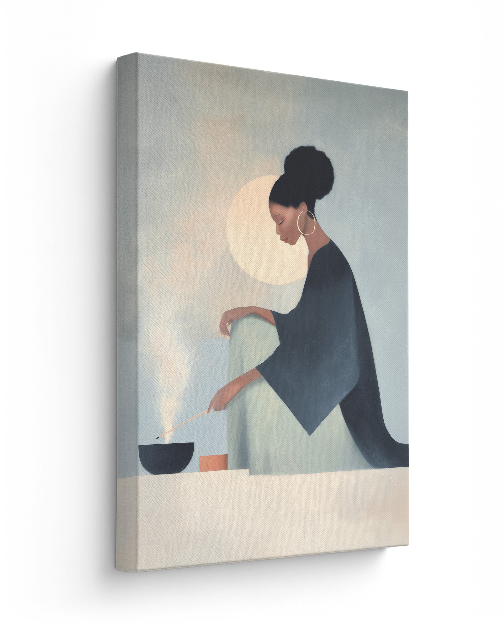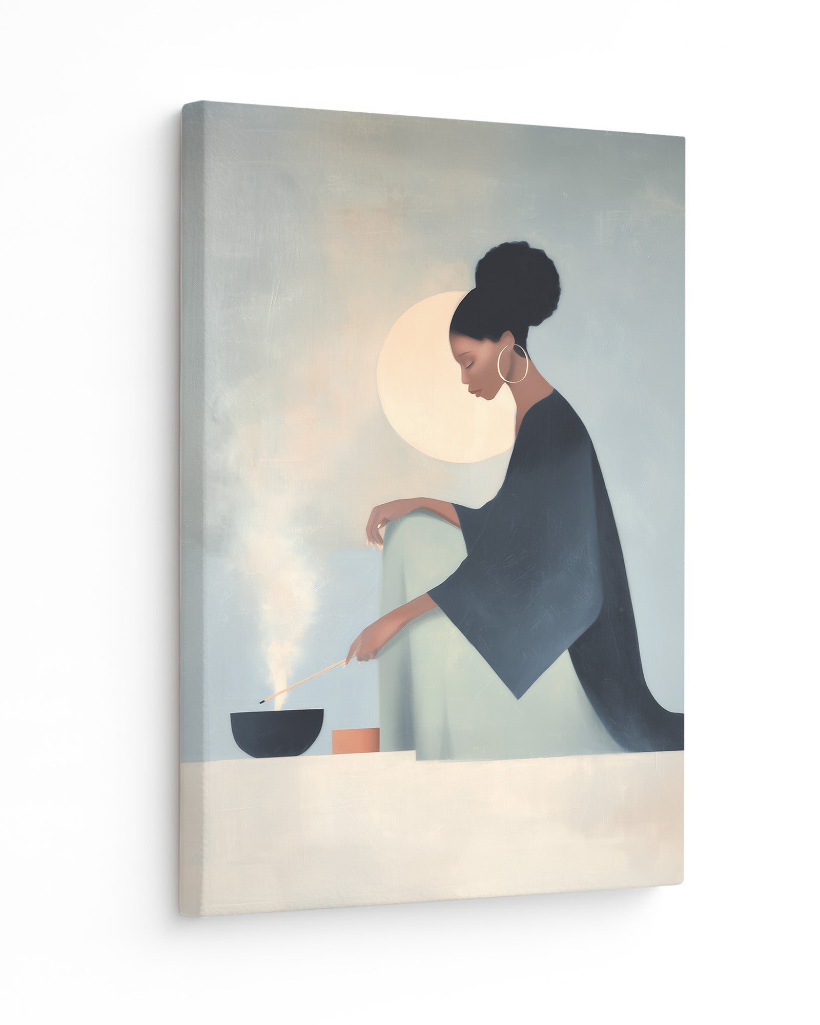 She Knows the Ritual: Art on Spiritual Practice, Self Care, and the Rituals Women Use to Ground Themselves. This luminous composition captures a woman engaged in the act of lighting incense within intimate home sanctuary, revealing how fire and smoke become instruments through which women create sacred space and call in protection.