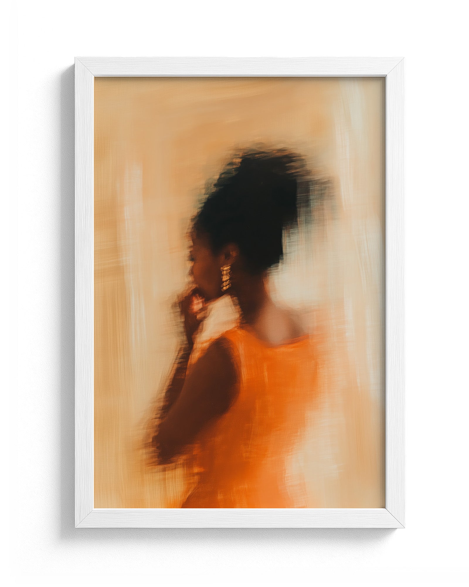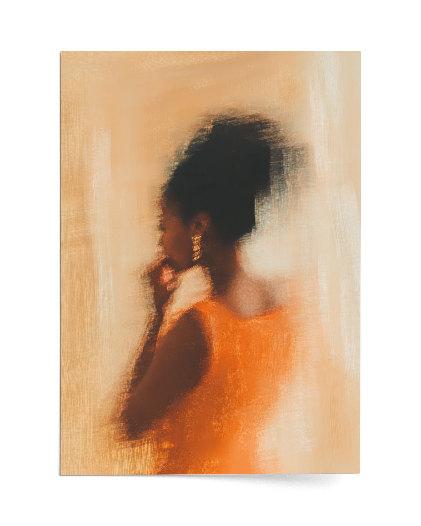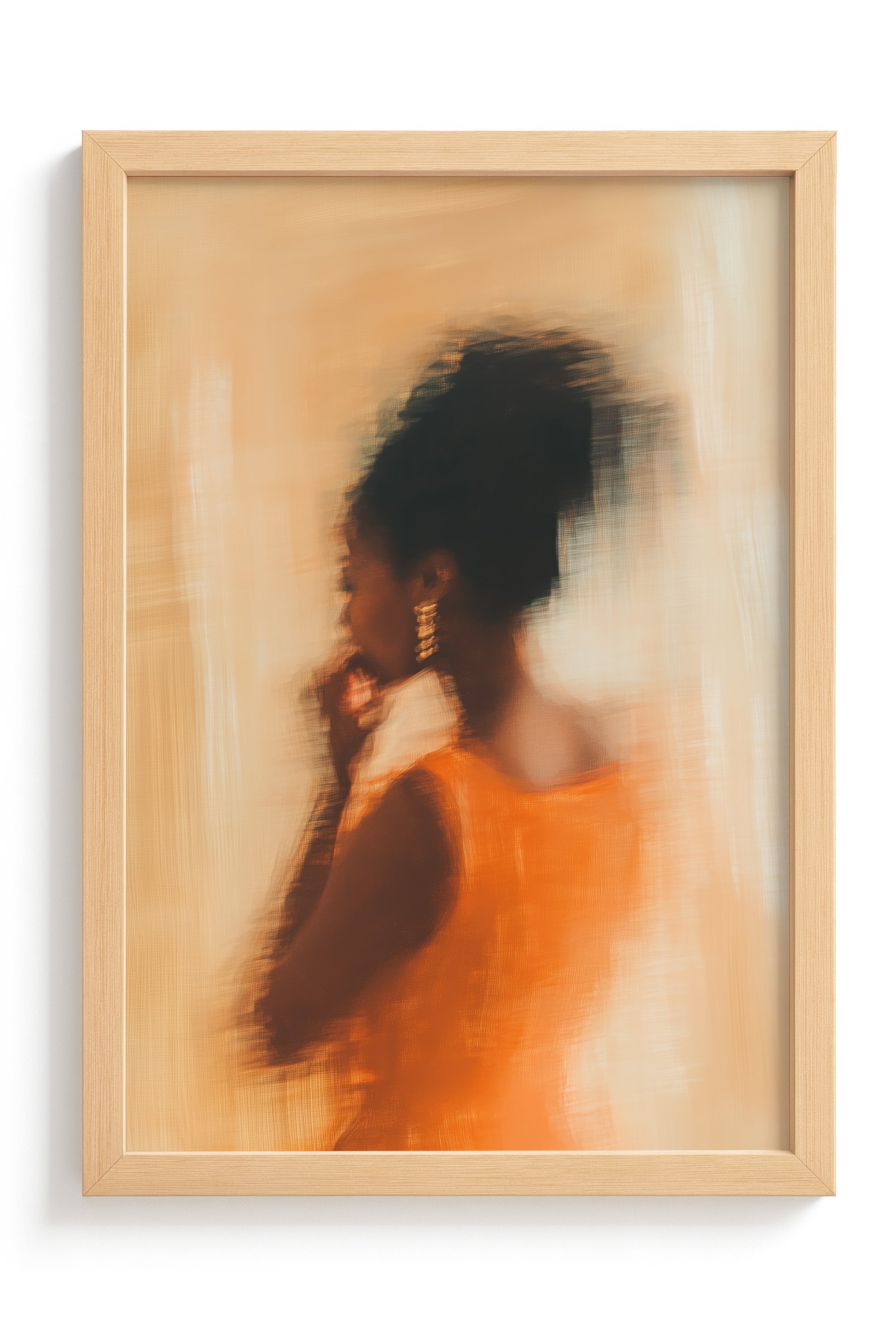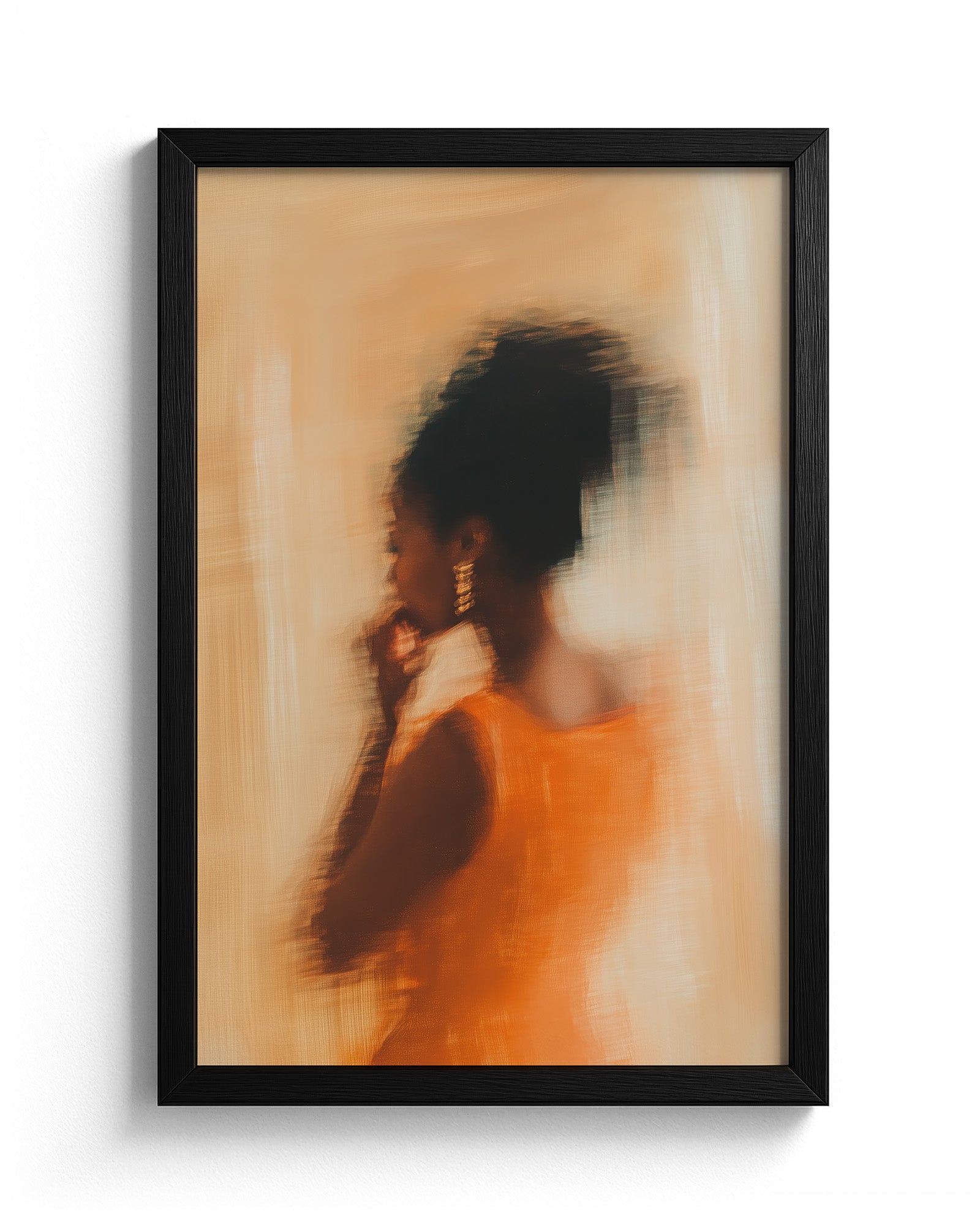 Dressed in vibrant orange, caught in a moment that blurs the line between movement and memory. Her golden earrings shimmer, her form flows, and every brushstroke radiates the confidence of someone who doesn’t chase attention — she attracts it.