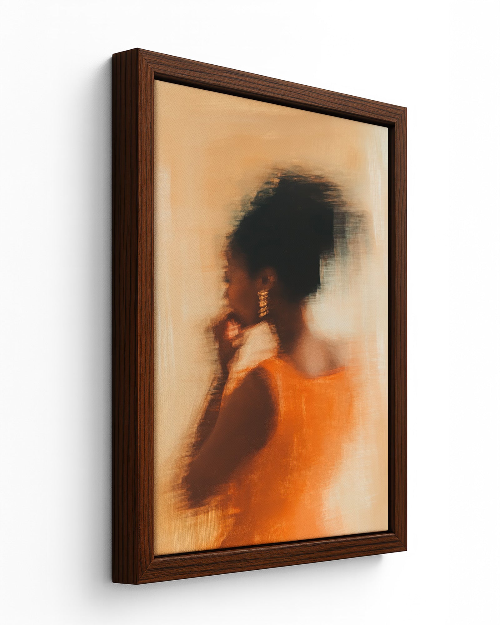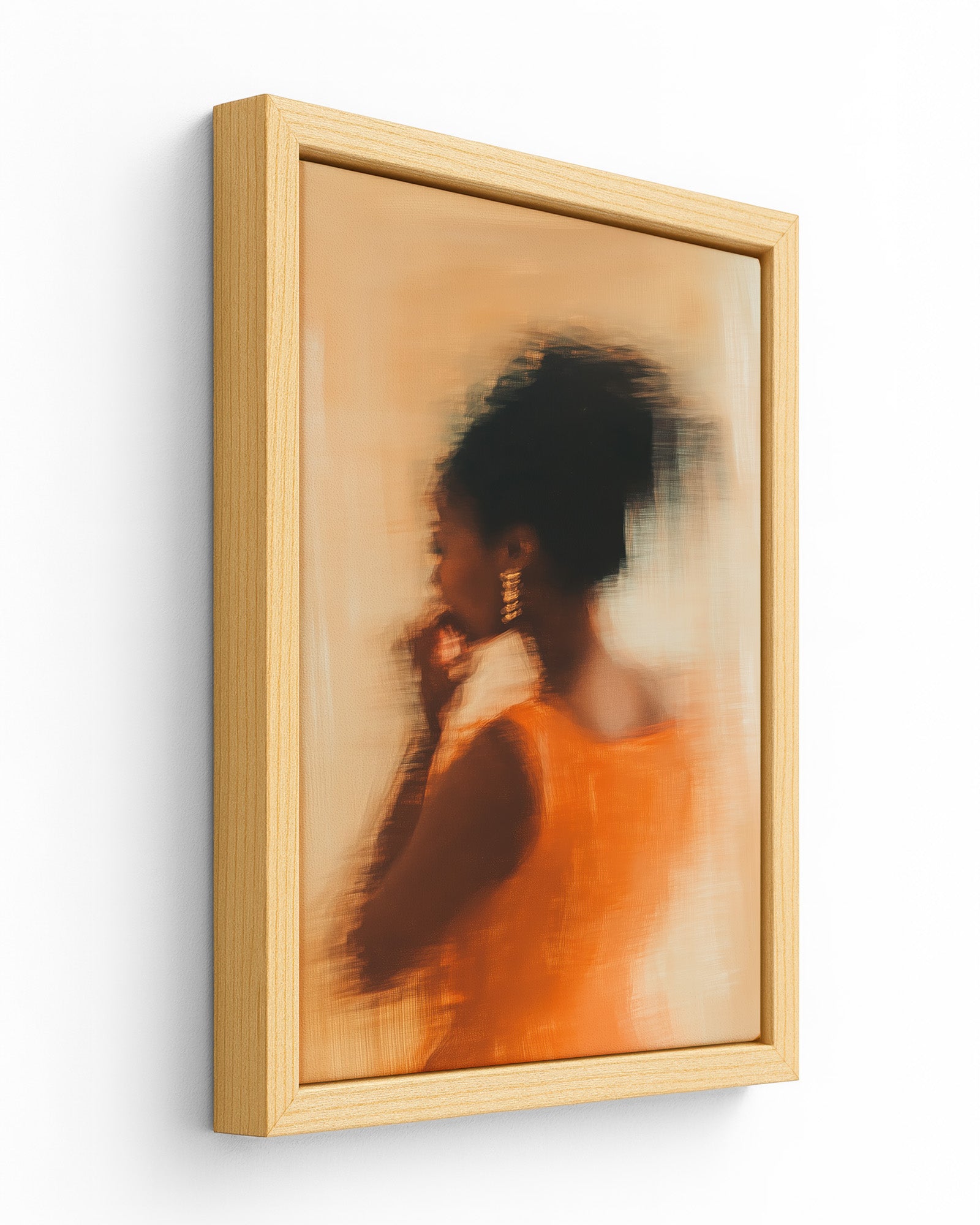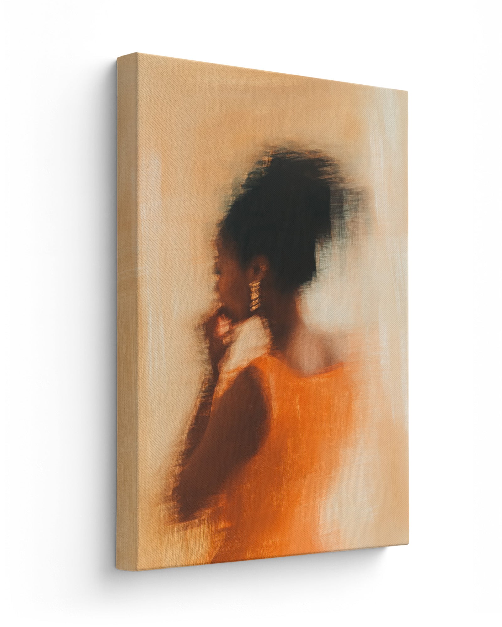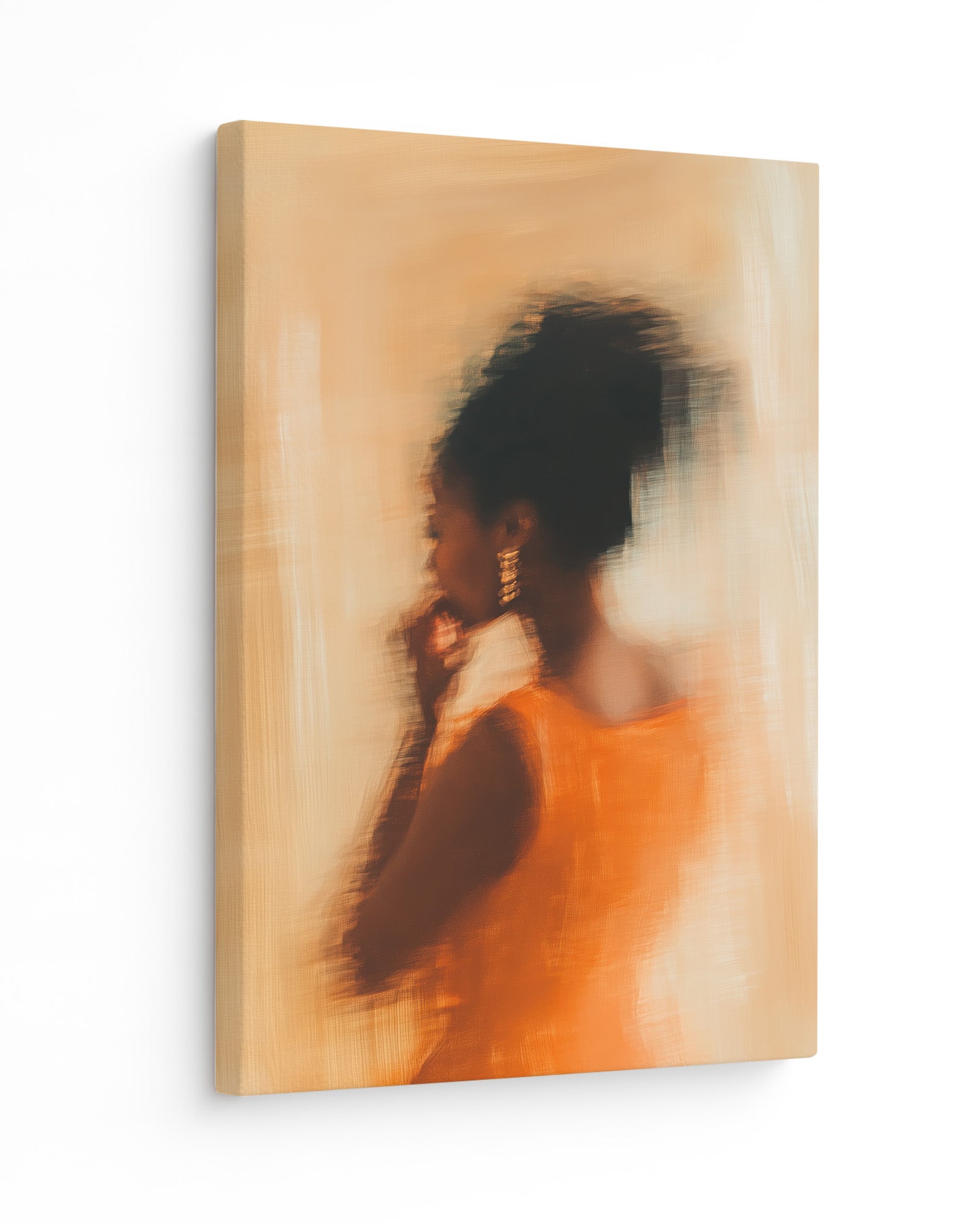 Dressed in vibrant orange, caught in a moment that blurs the line between movement and memory. Her golden earrings shimmer, her form flows, and every brushstroke radiates the confidence of someone who doesn’t chase attention — she attracts it.