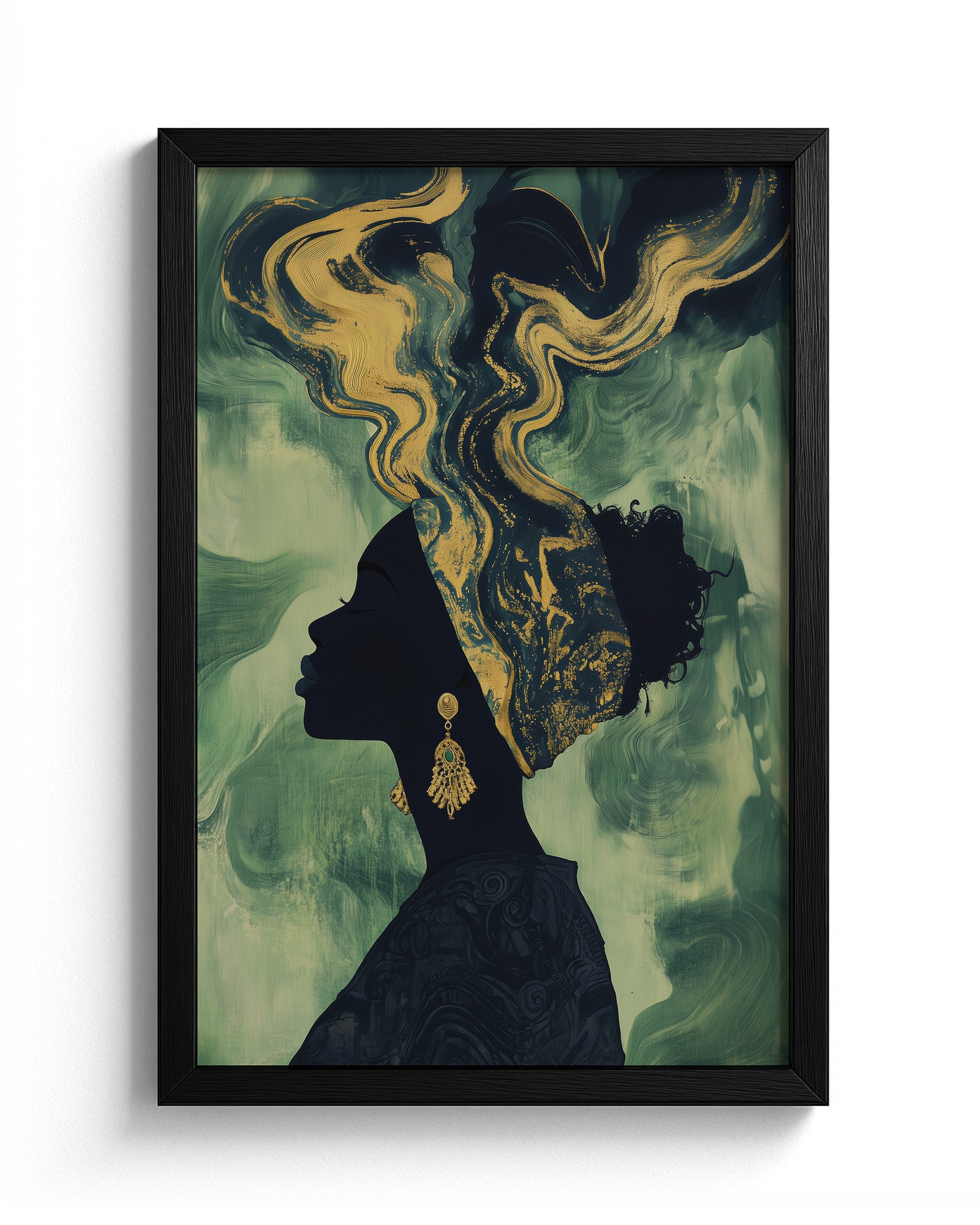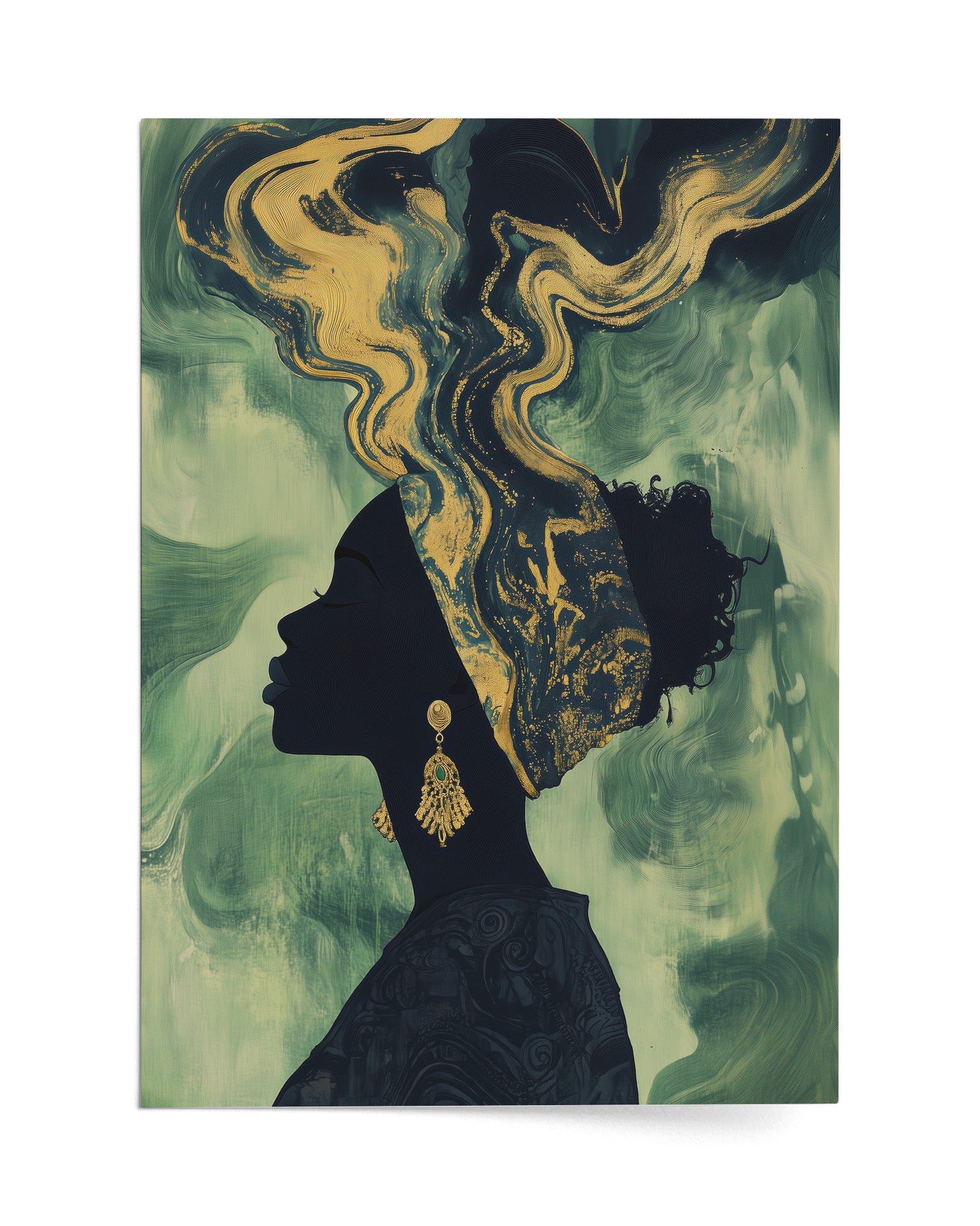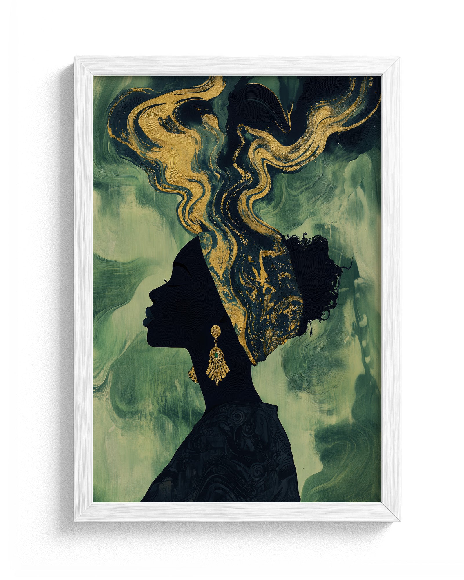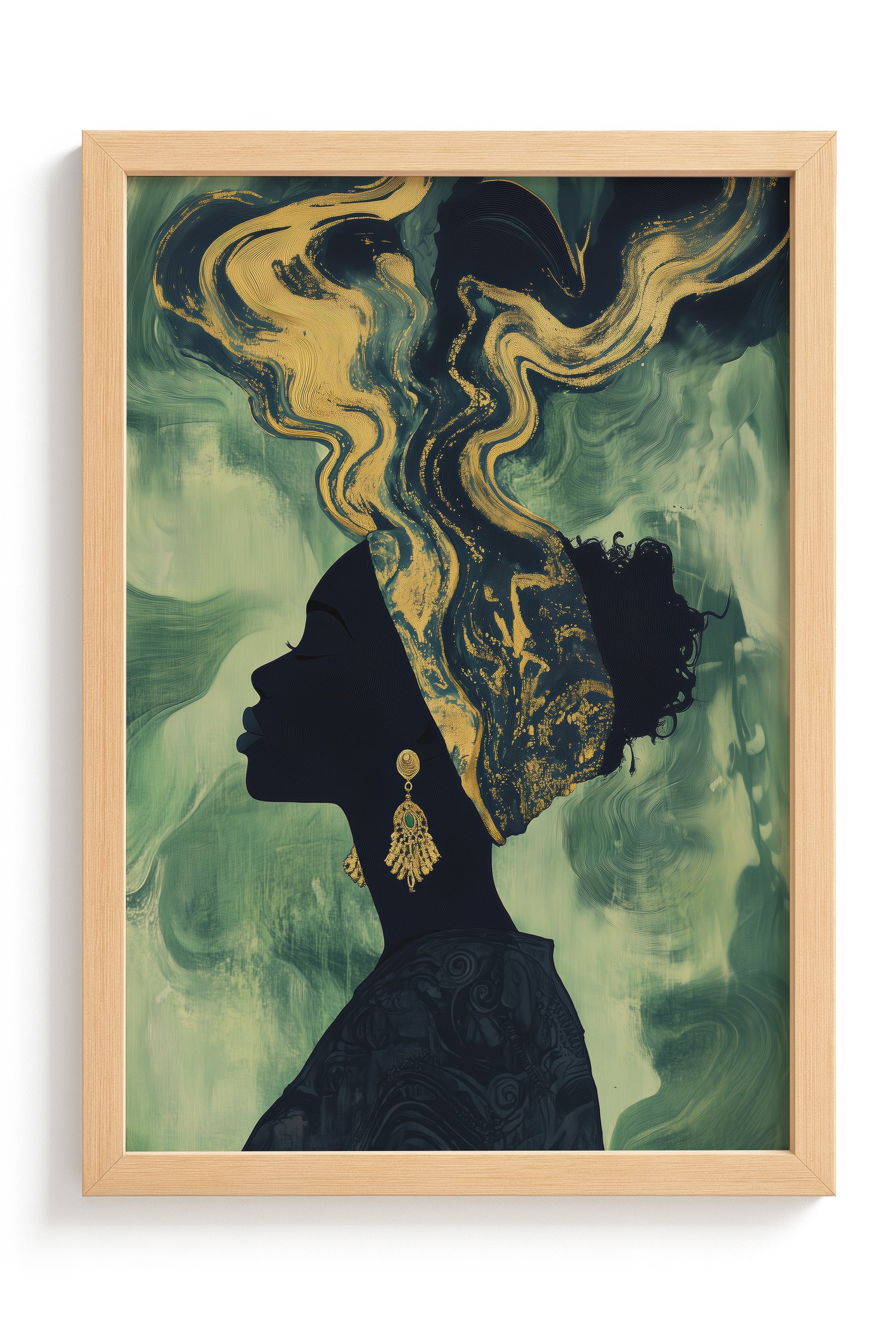 Experience the beauty of African heritage with this minimalist artwork featuring a silhouette of a woman adorned in intricate gold and beige patterns. Set against a deep olive-green background, her earrings and headscarf shimmer with cultural elegance.