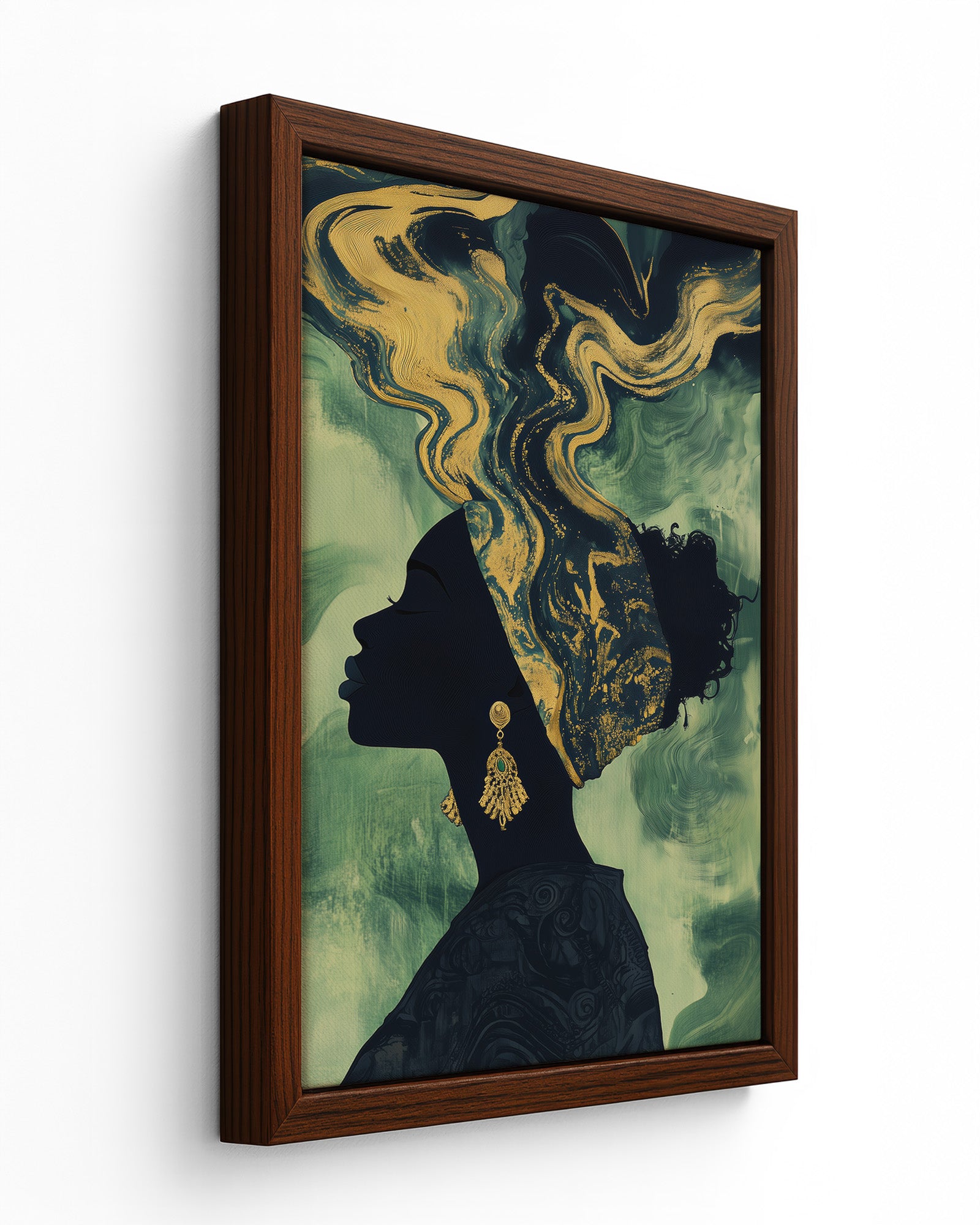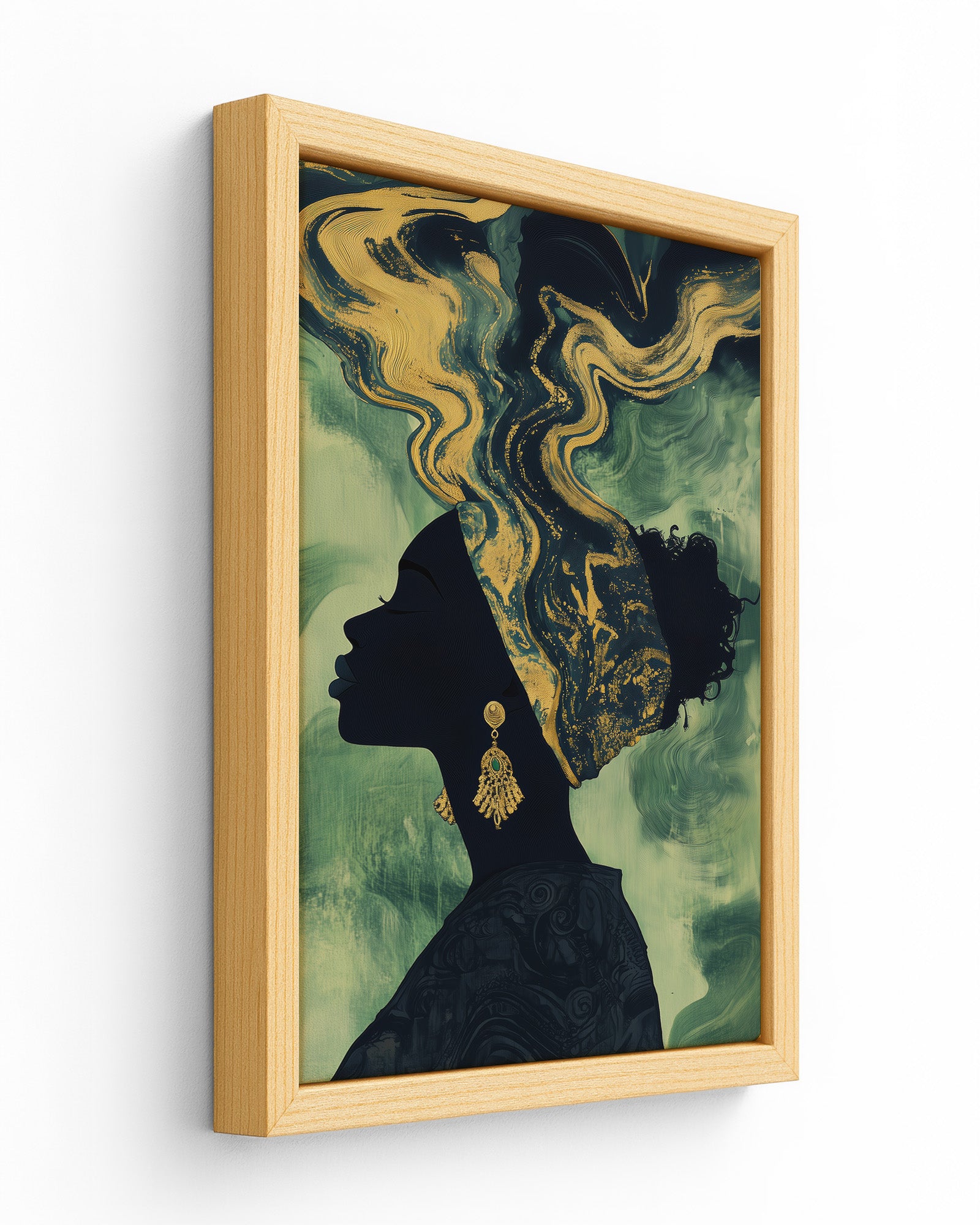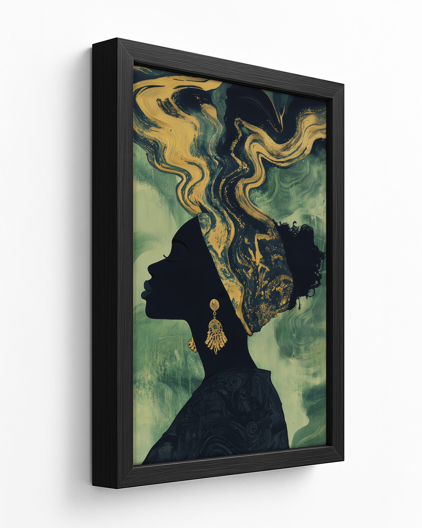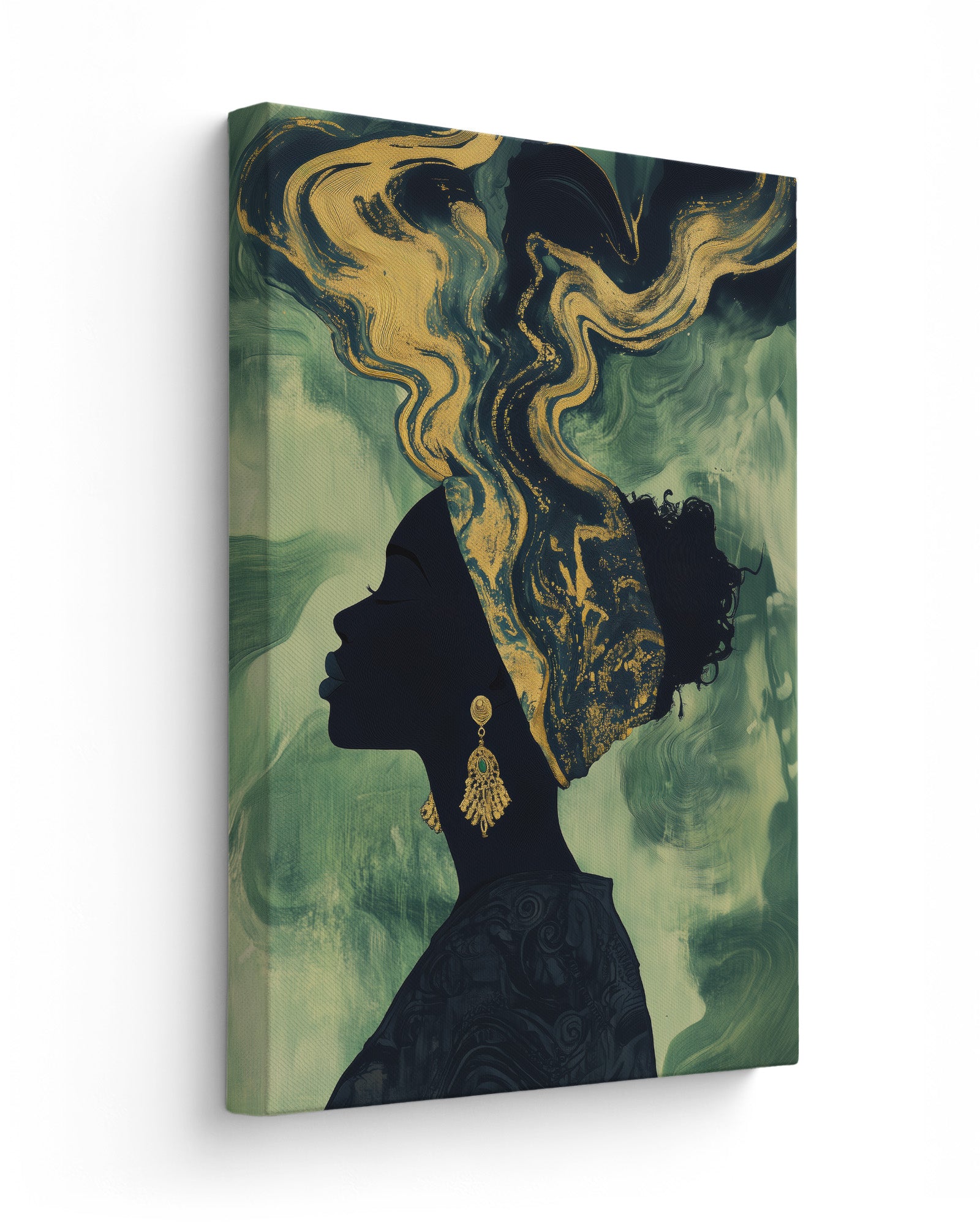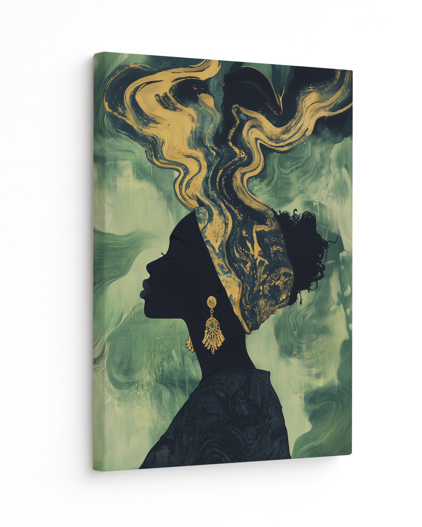 Experience the beauty of African heritage with this minimalist artwork featuring a silhouette of a woman adorned in intricate gold and beige patterns. Set against a deep olive-green background, her earrings and headscarf shimmer with cultural elegance.