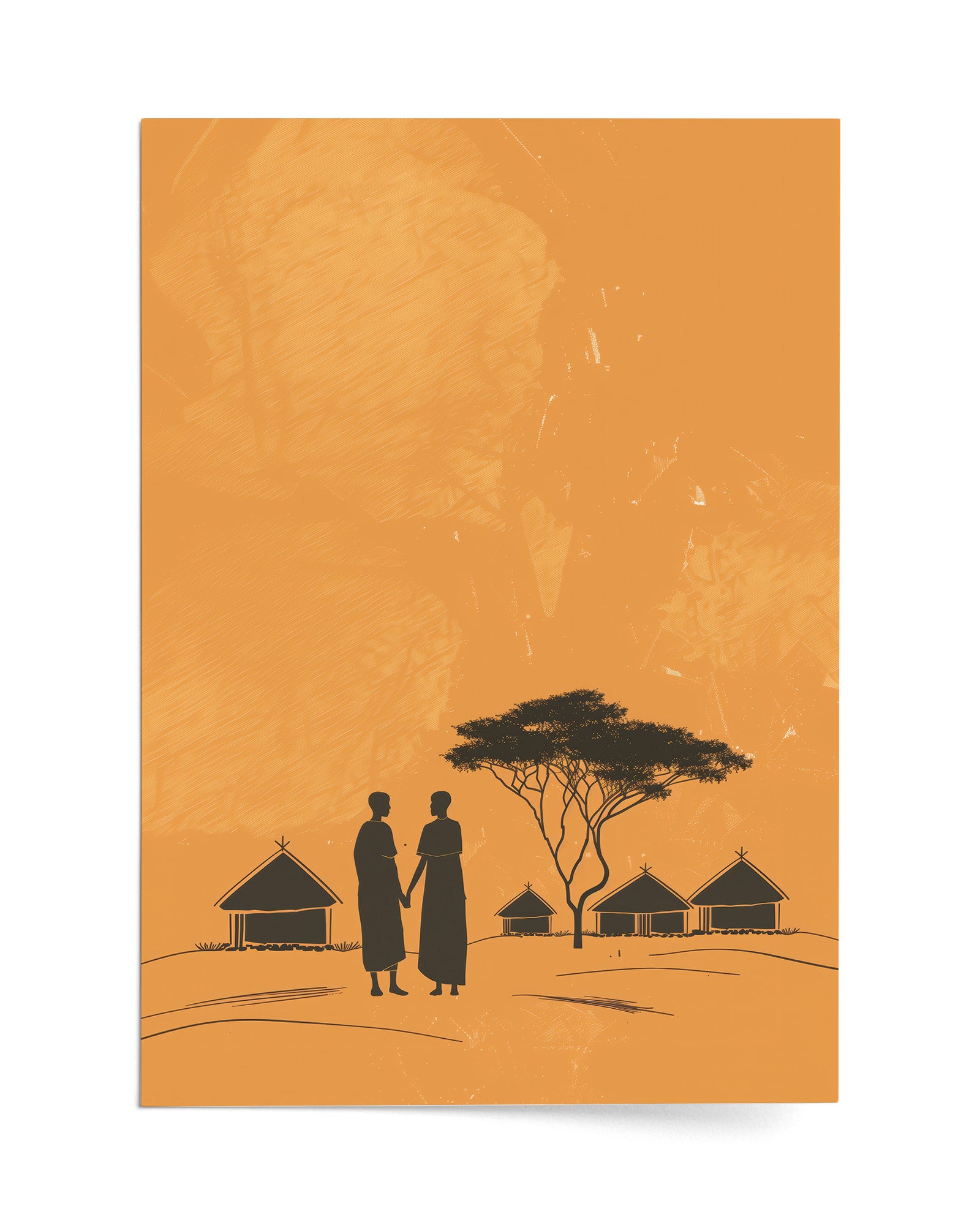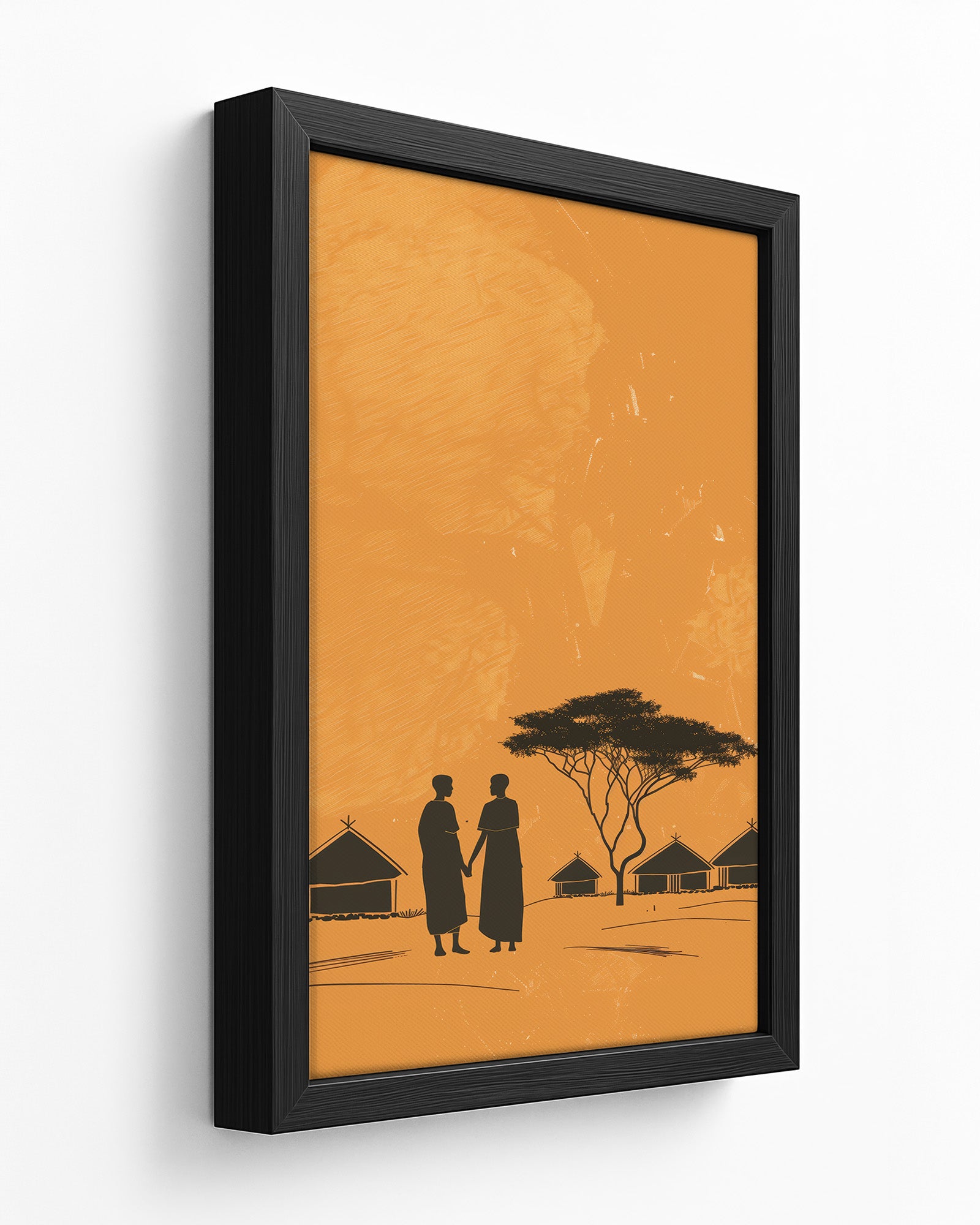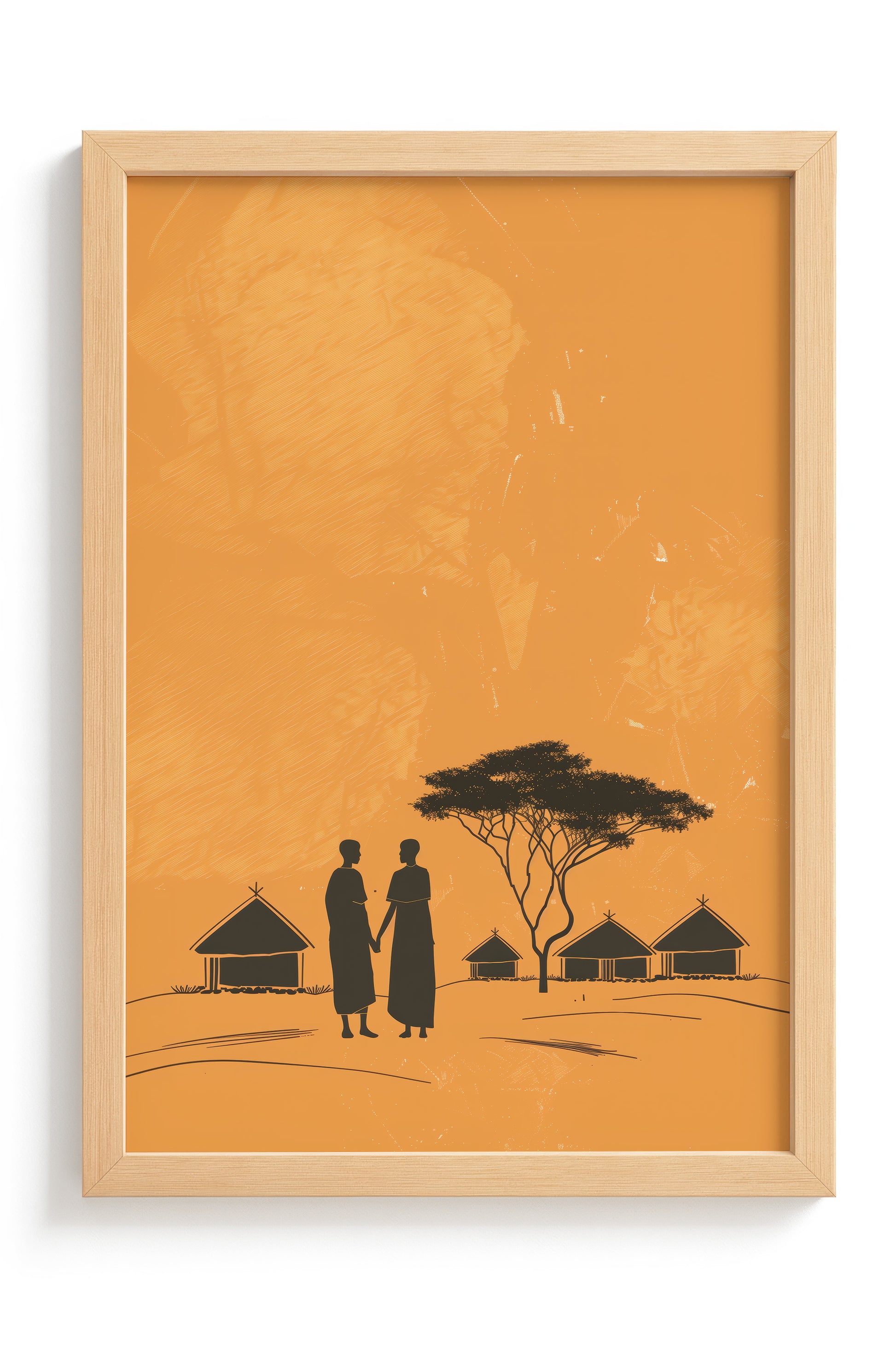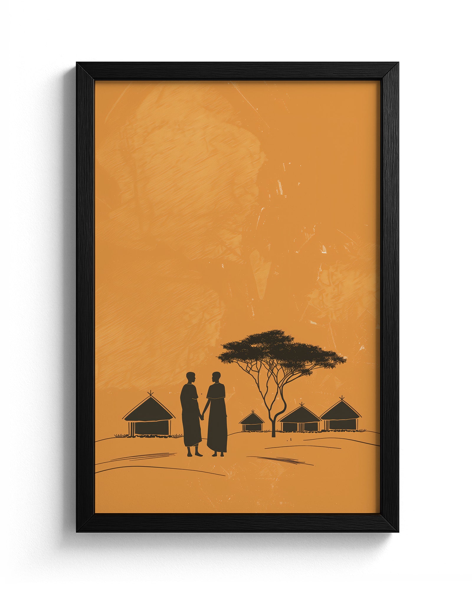 A minimalist yet deeply evocative line art piece that captures the essence of motherhood, sisterhood, and community in an African village. Two graceful mothers, their figures intertwined in a moment of shared warmth.
