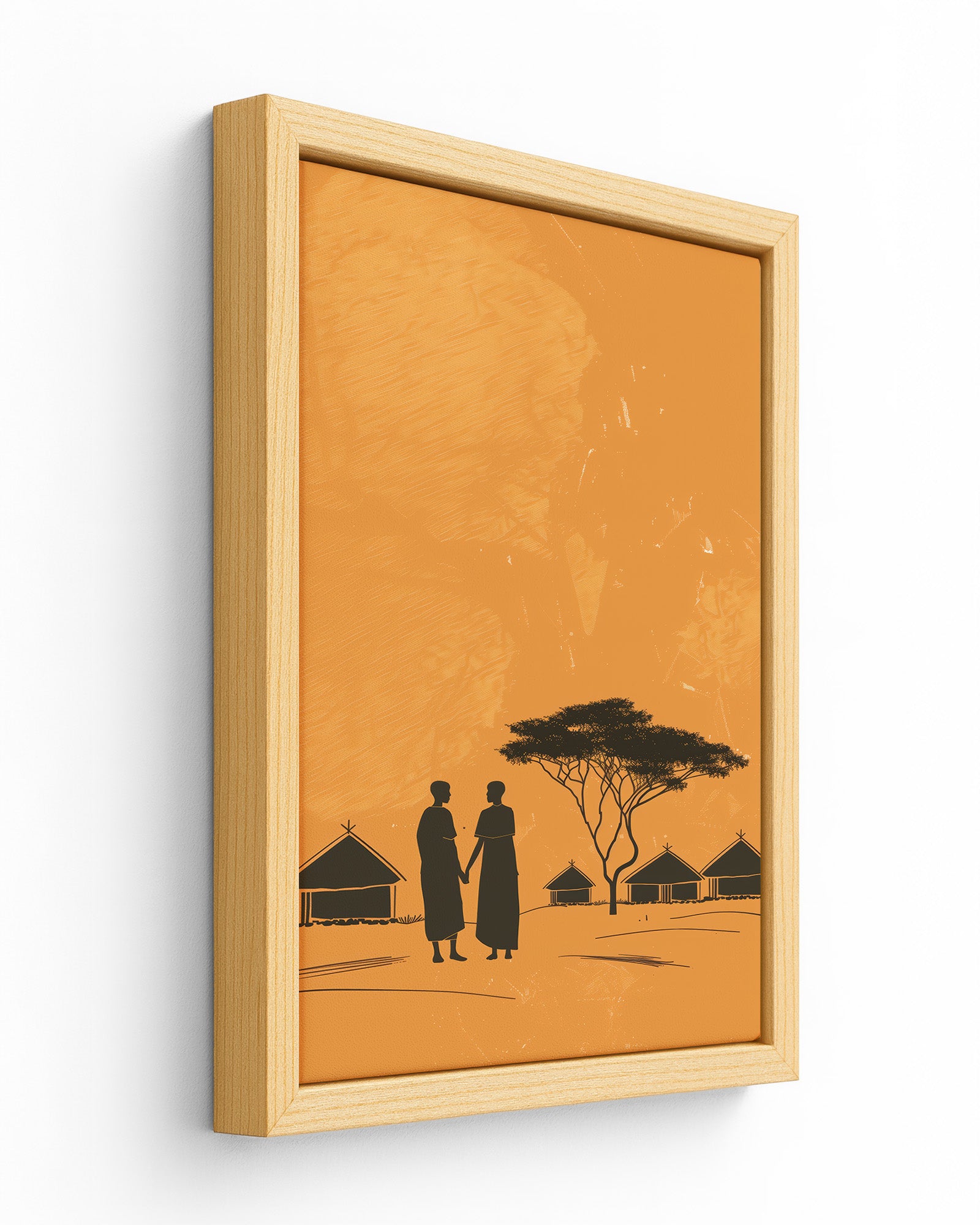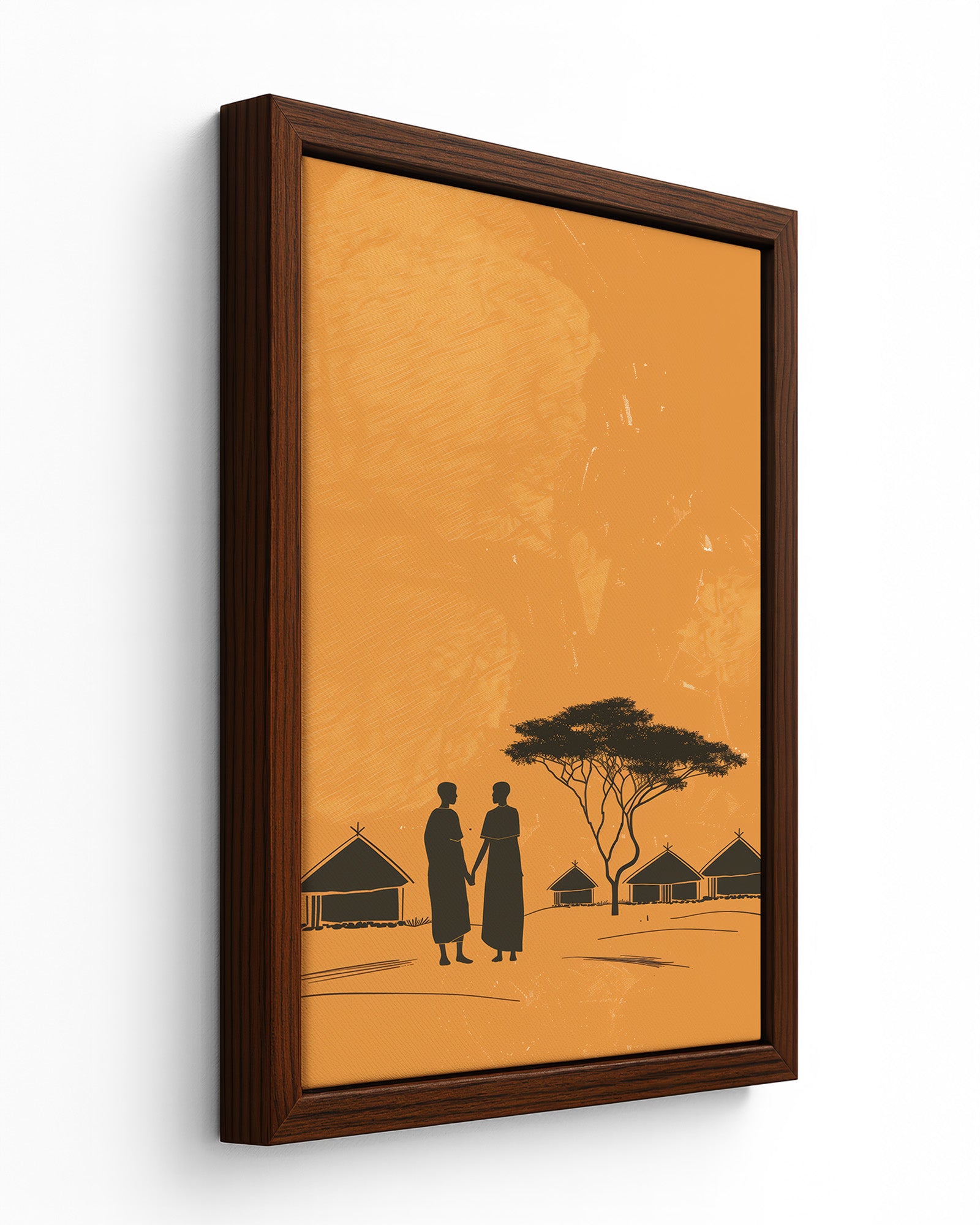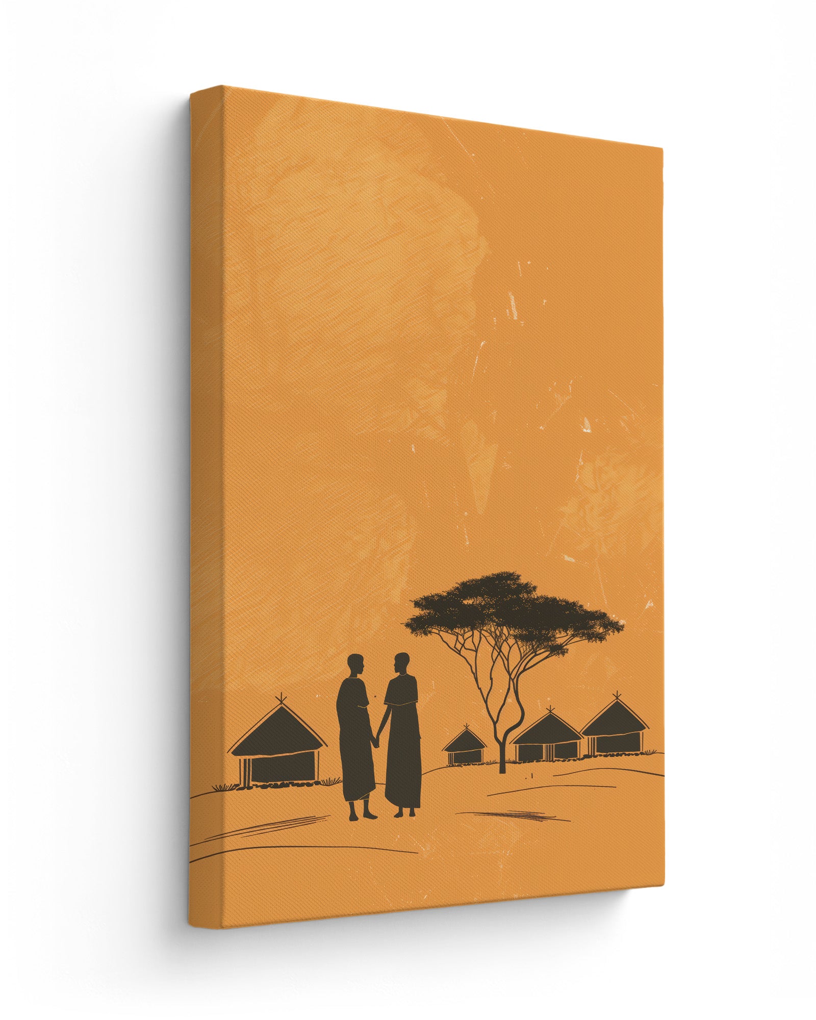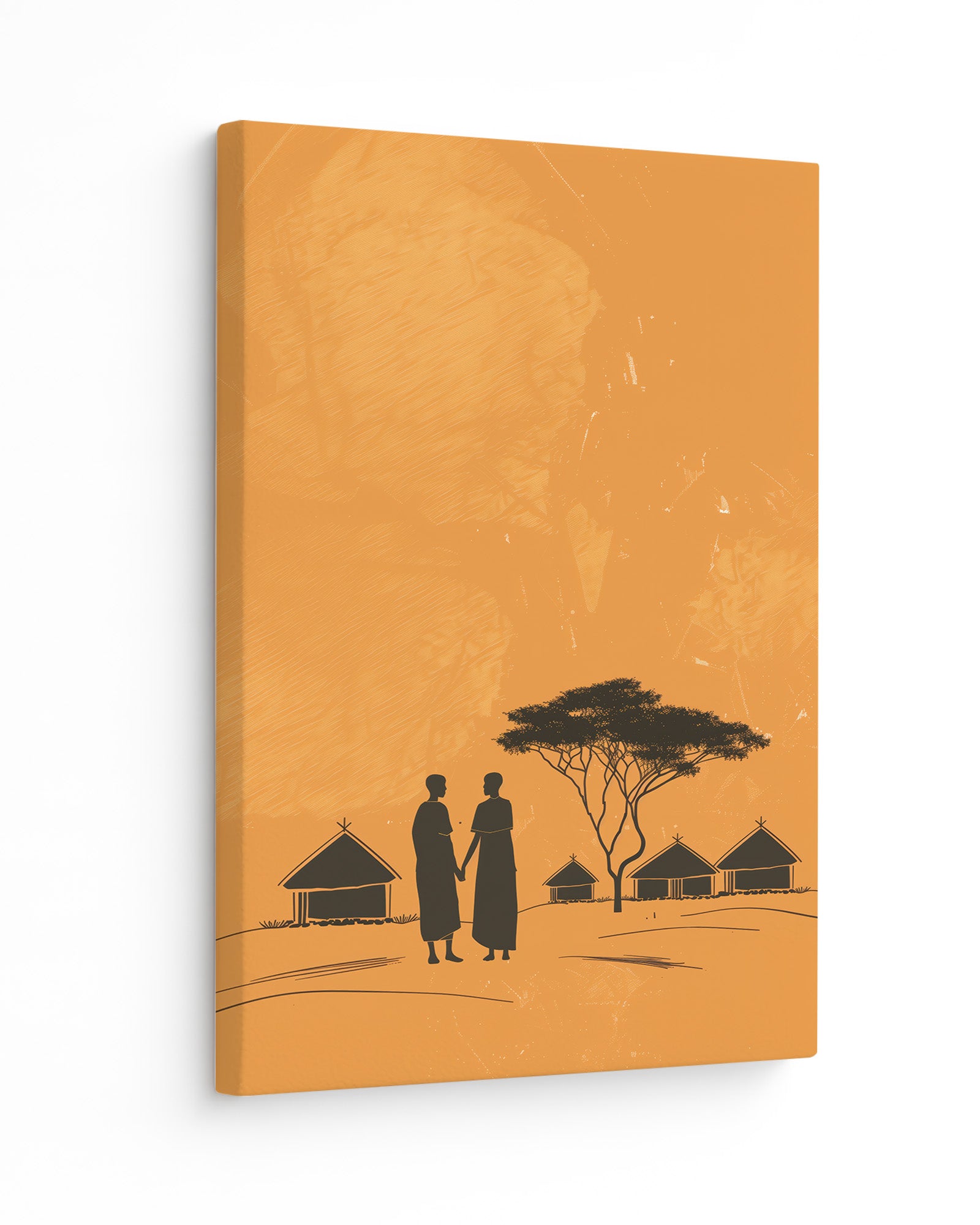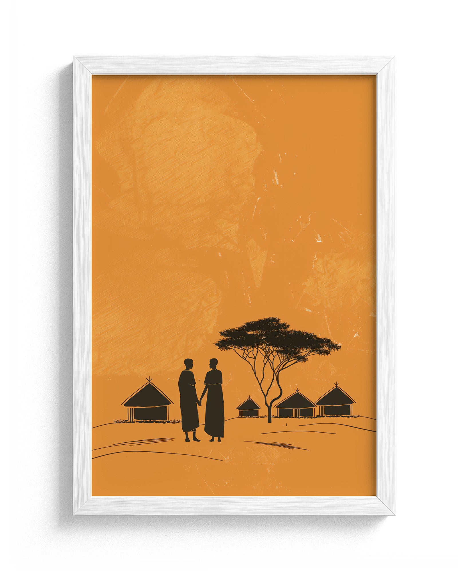 A minimalist yet deeply evocative line art piece that captures the essence of motherhood, sisterhood, and community in an African village. Two graceful mothers, their figures intertwined in a moment of shared warmth.