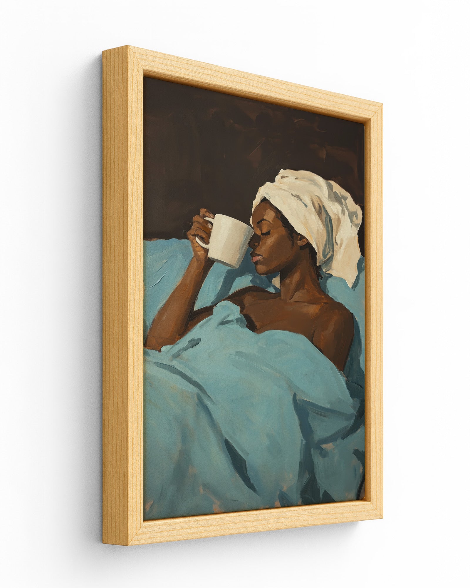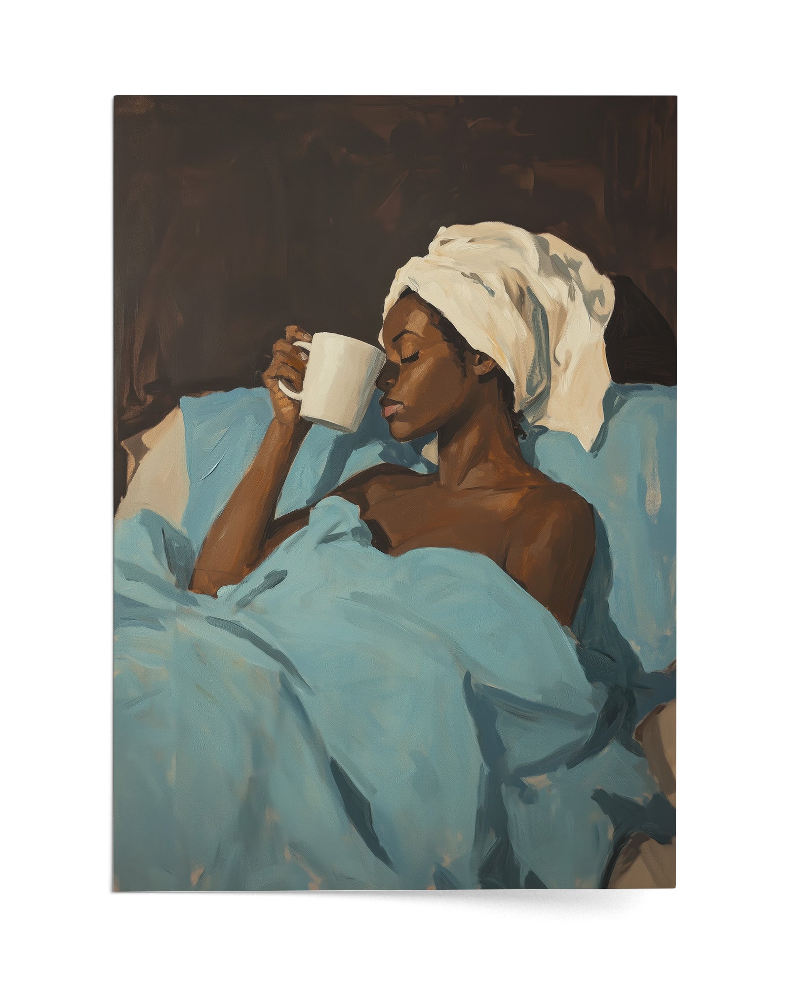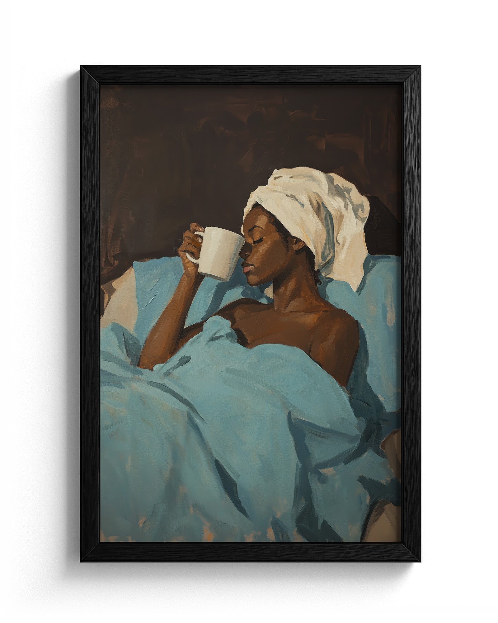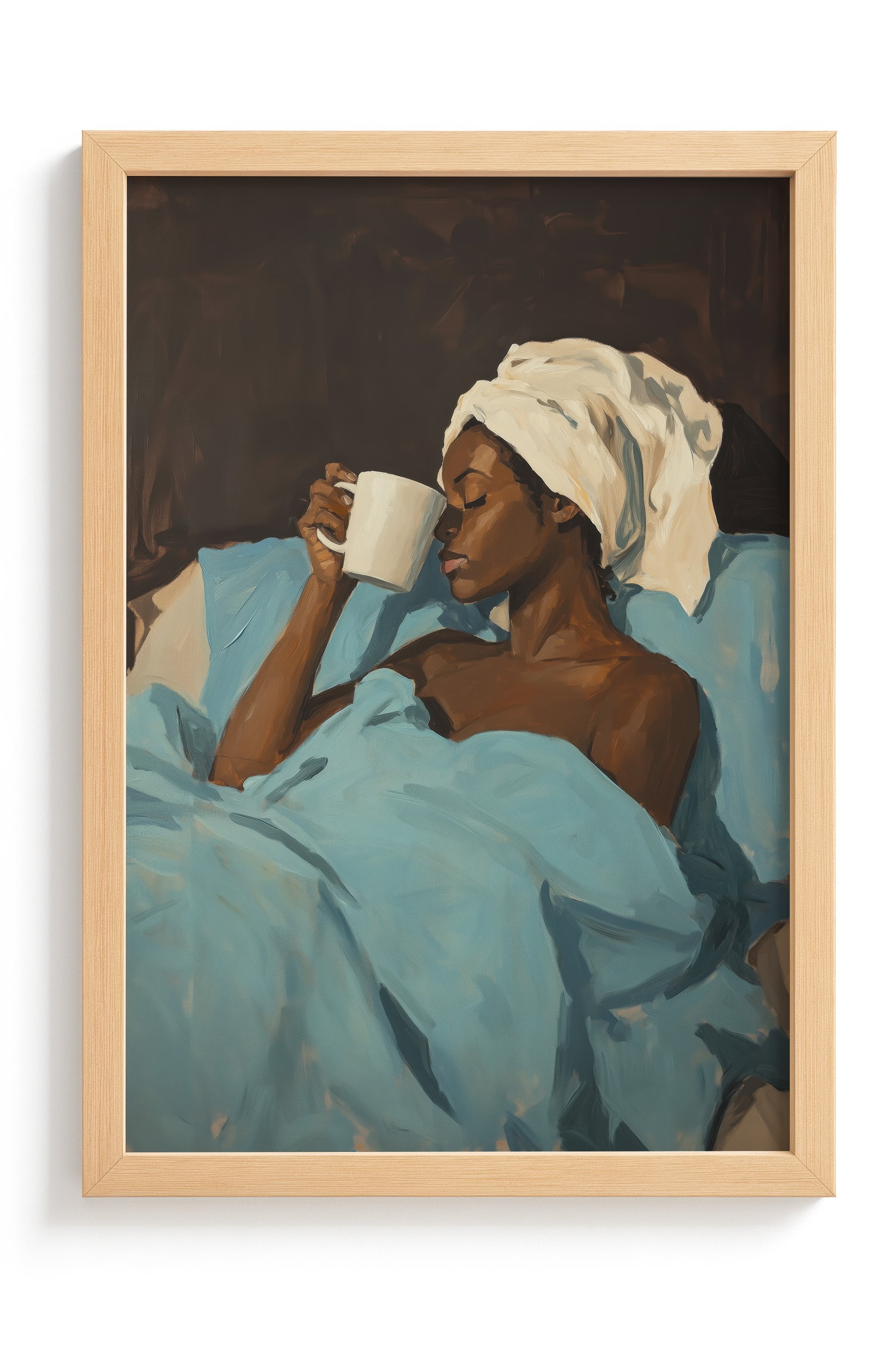 Rendered in expressive brushstrokes and warm tones, this oil-style artwork is perfect for bedrooms, self-care corners, or curated spaces that value restoration, reflection, and the power of pause.