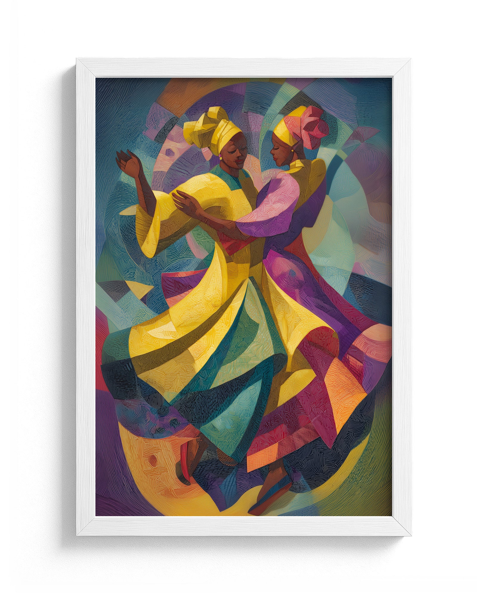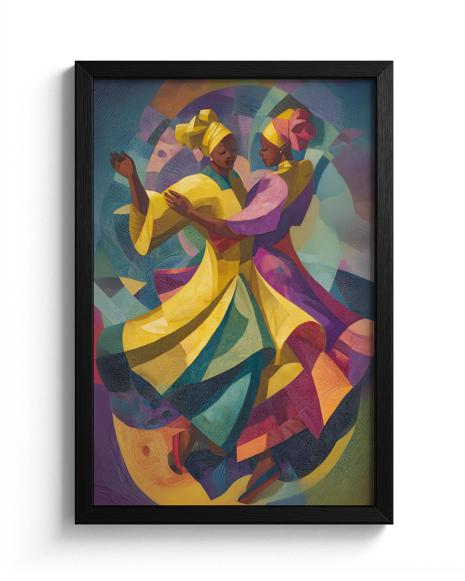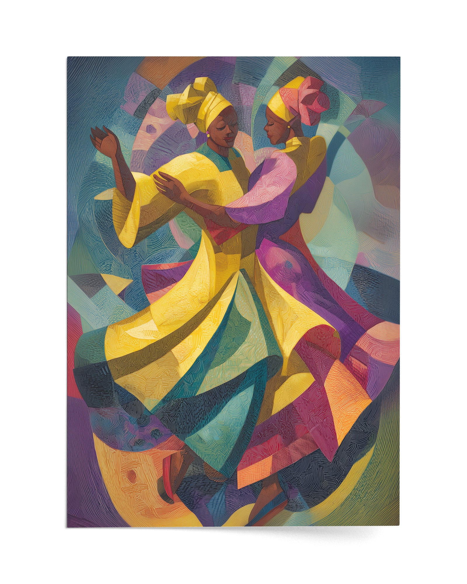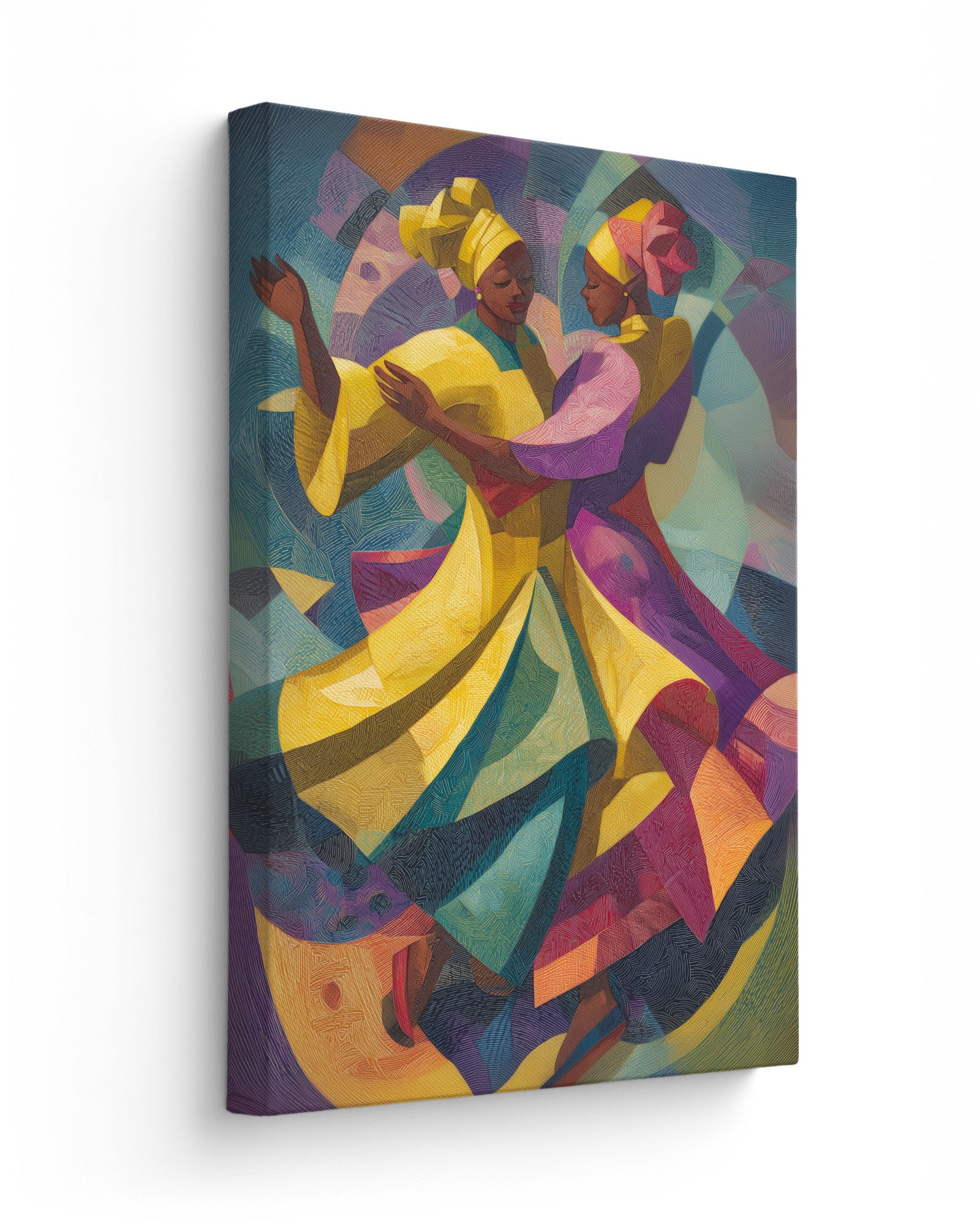 A vibrant cubist-inspired painting of Yoruba women dancing in swirling motion, adorned in radiant yellows and purples. The geometric textures and flowing lines capture the spirit of rhythm, joy, and cultural celebration through movement and color.