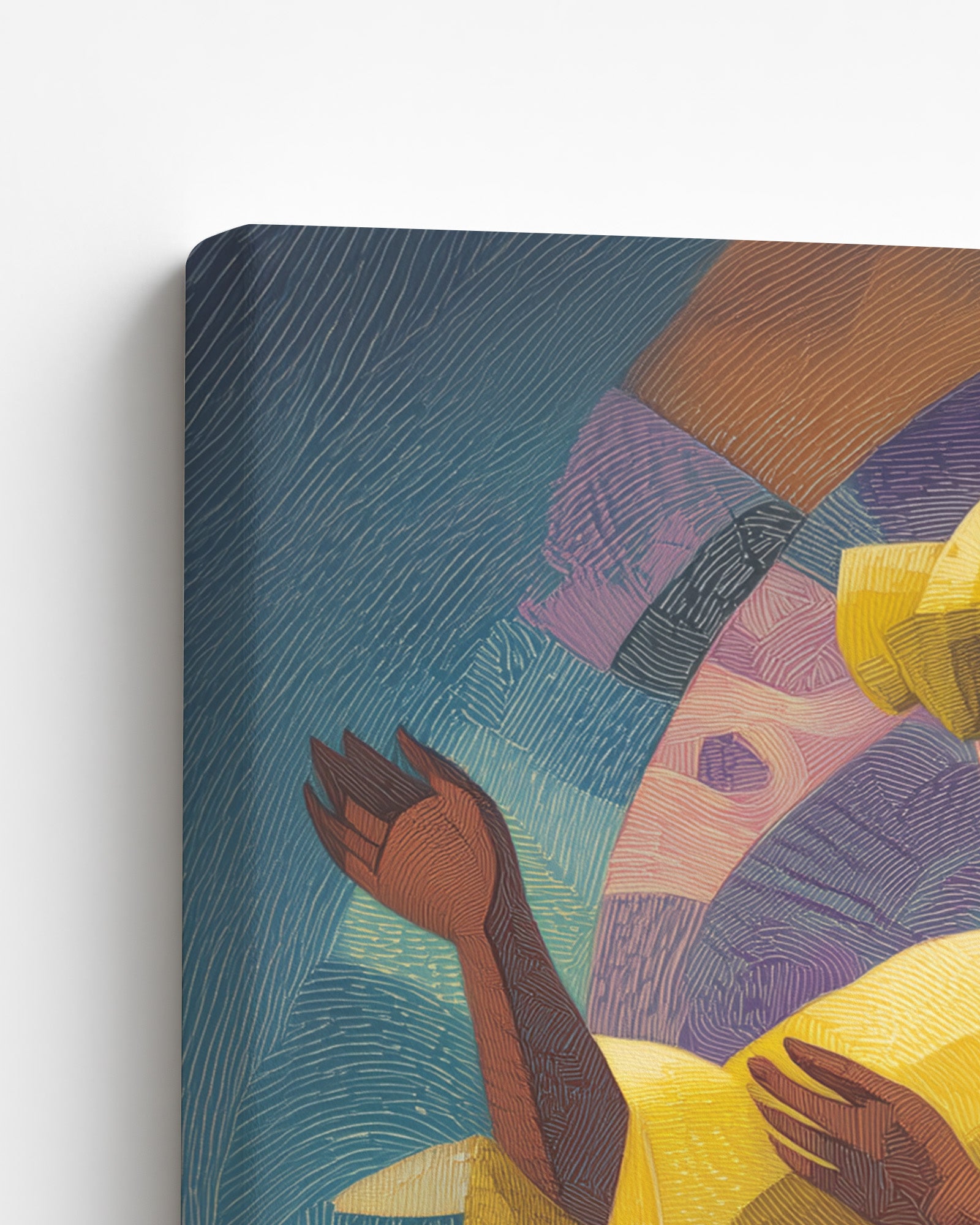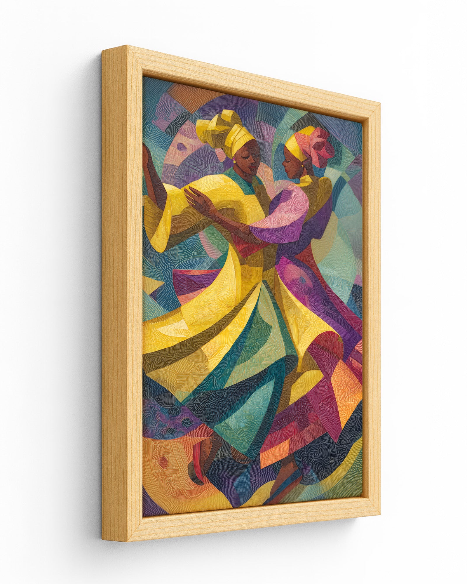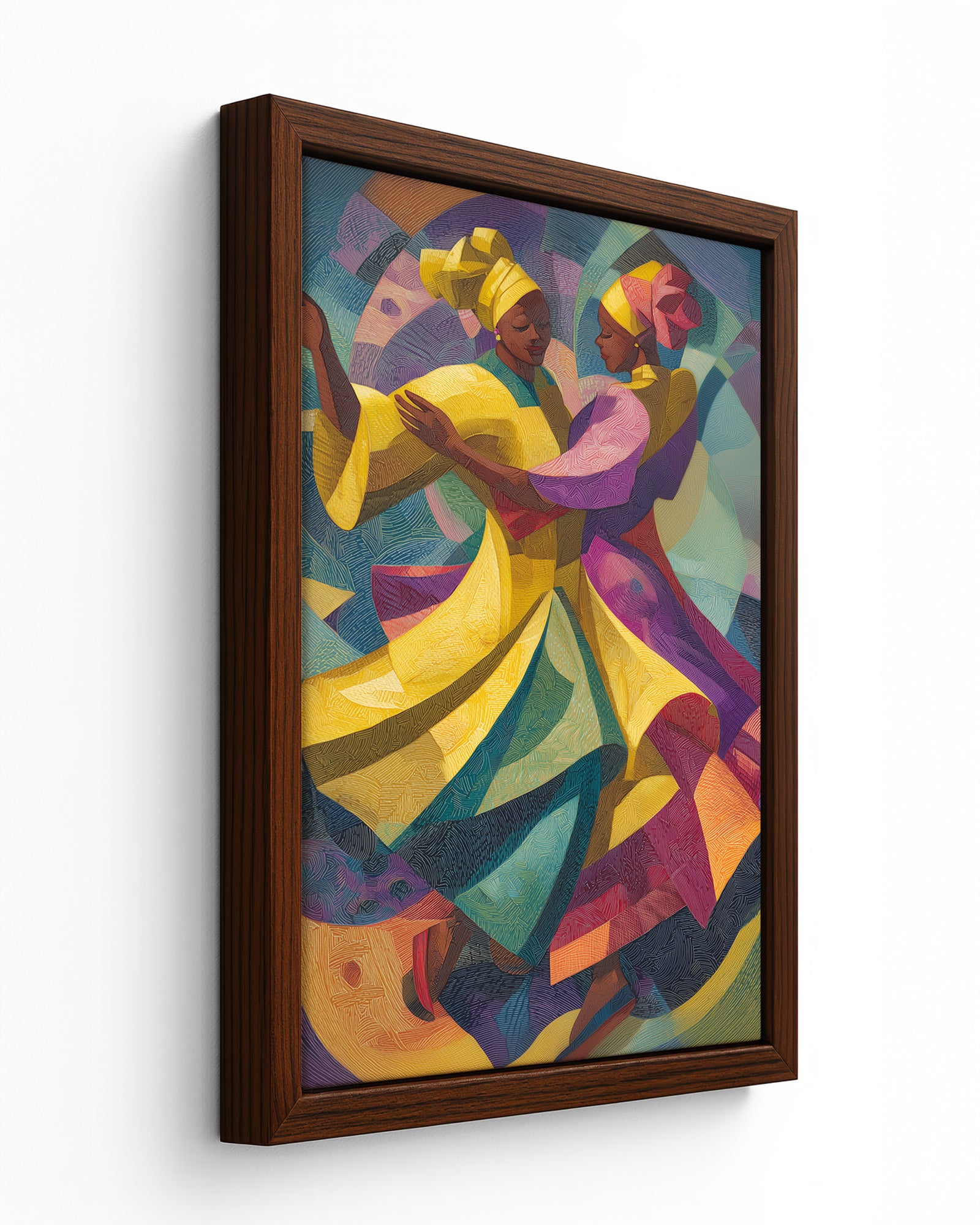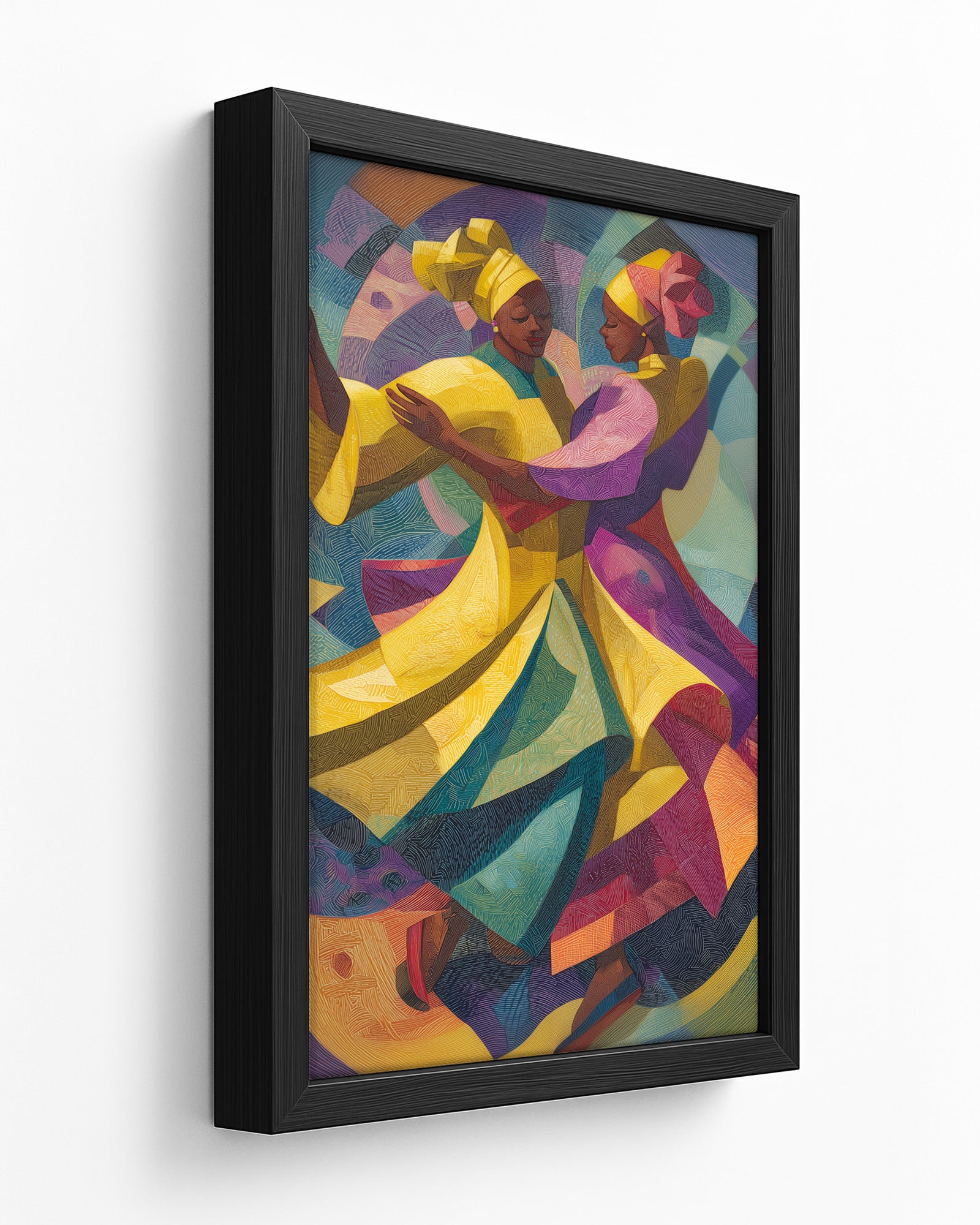 A vibrant cubist-inspired painting of Yoruba women dancing in swirling motion, adorned in radiant yellows and purples. The geometric textures and flowing lines capture the spirit of rhythm, joy, and cultural celebration through movement and color.