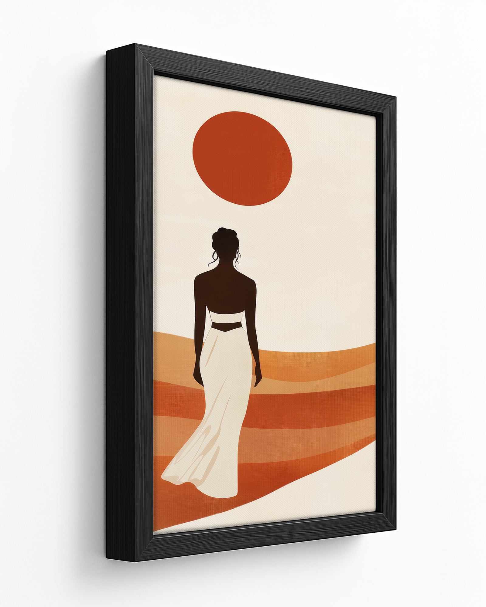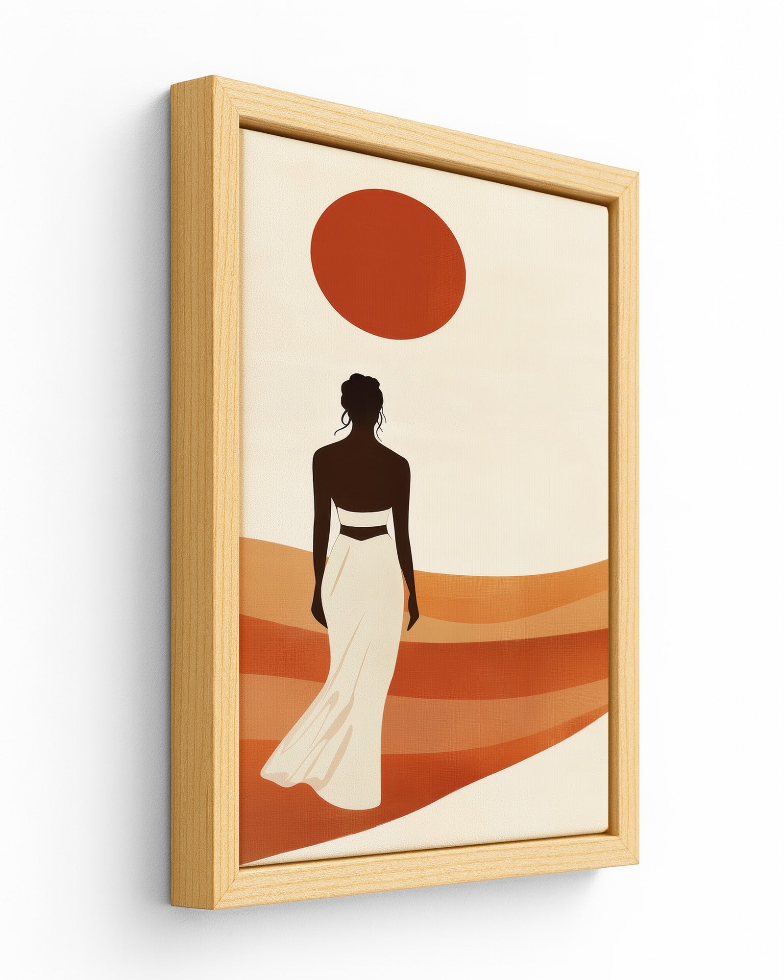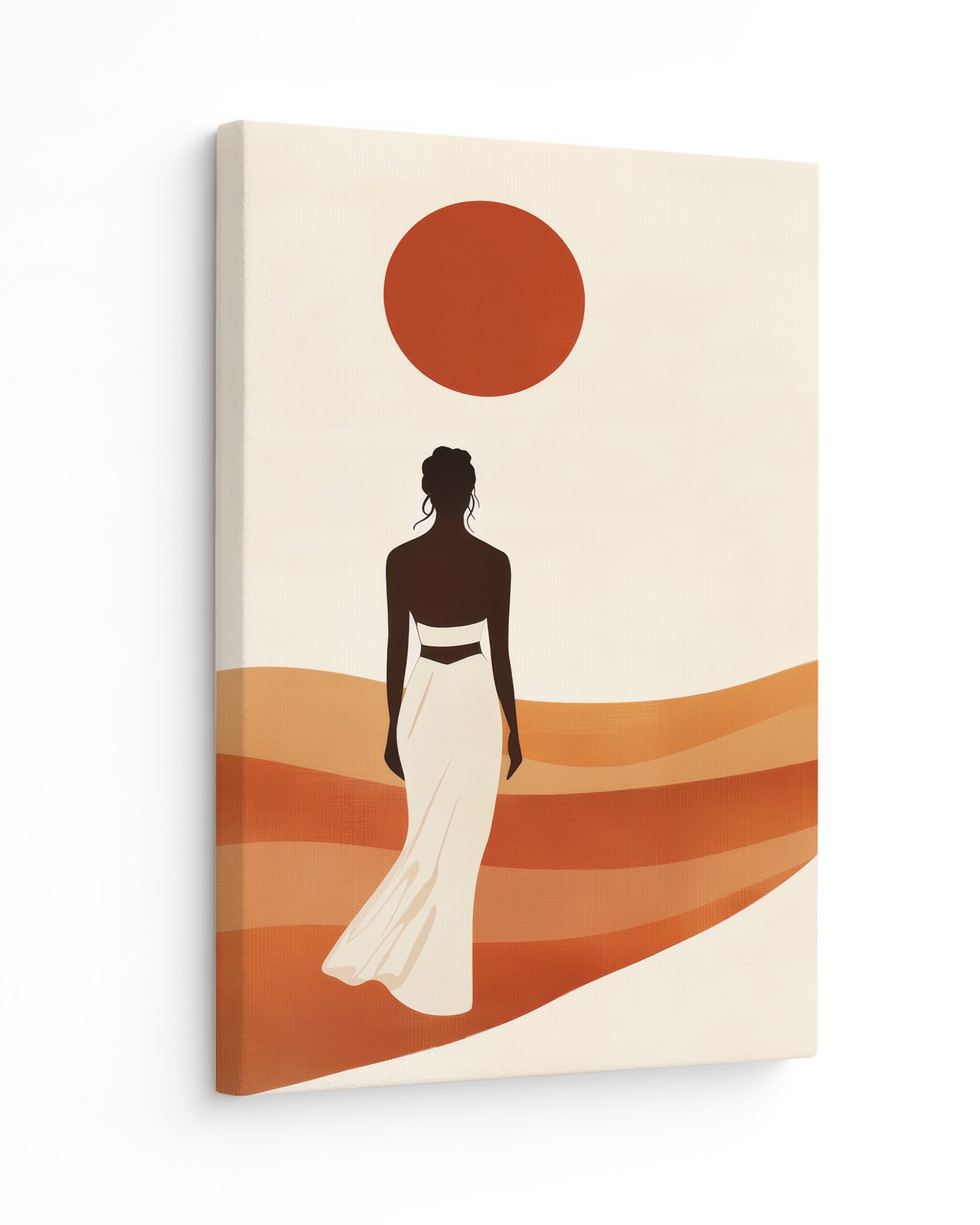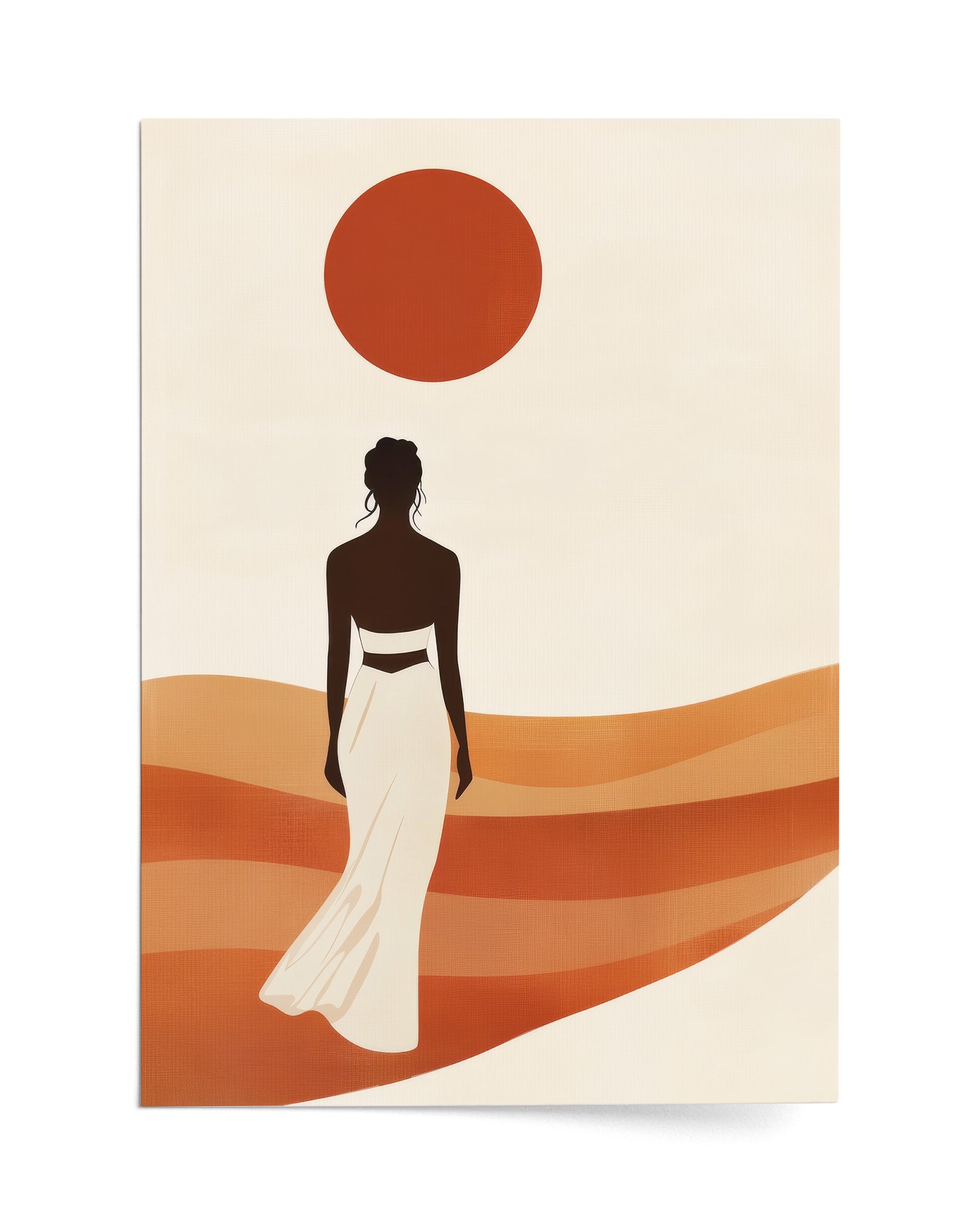 A graceful figure walks barefoot across terracotta dunes, her dress catching the warm breeze as a blazing sun hangs high above. This artwork captures movement toward possibility — bold, balanced, and radiant. A powerful portrayal of walking forward in purpose and peace.