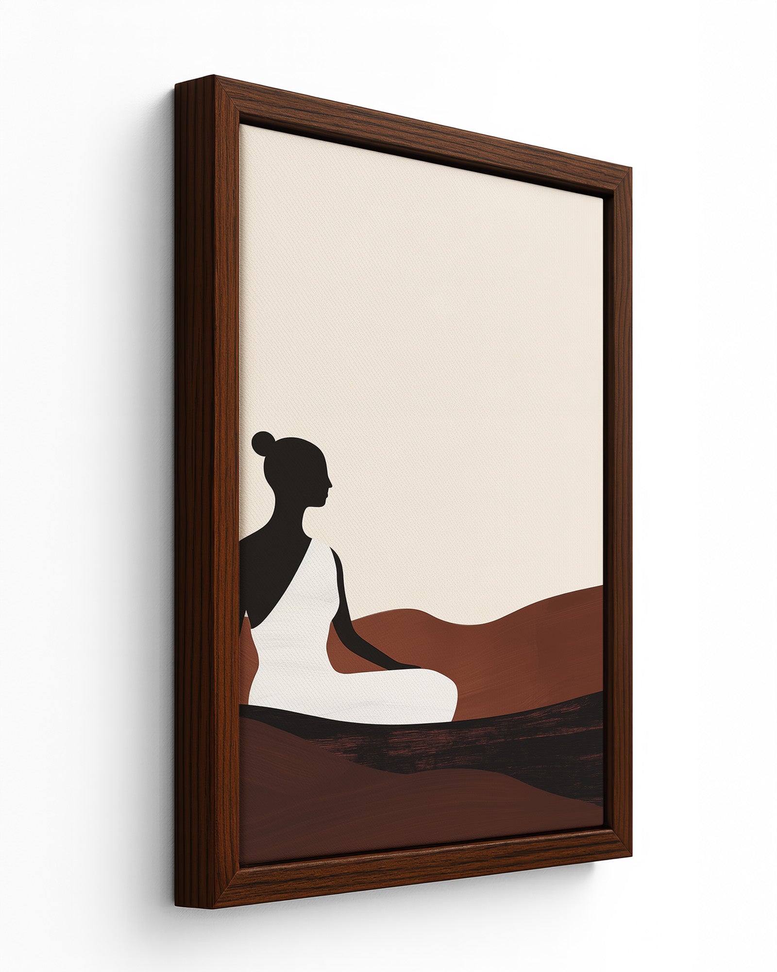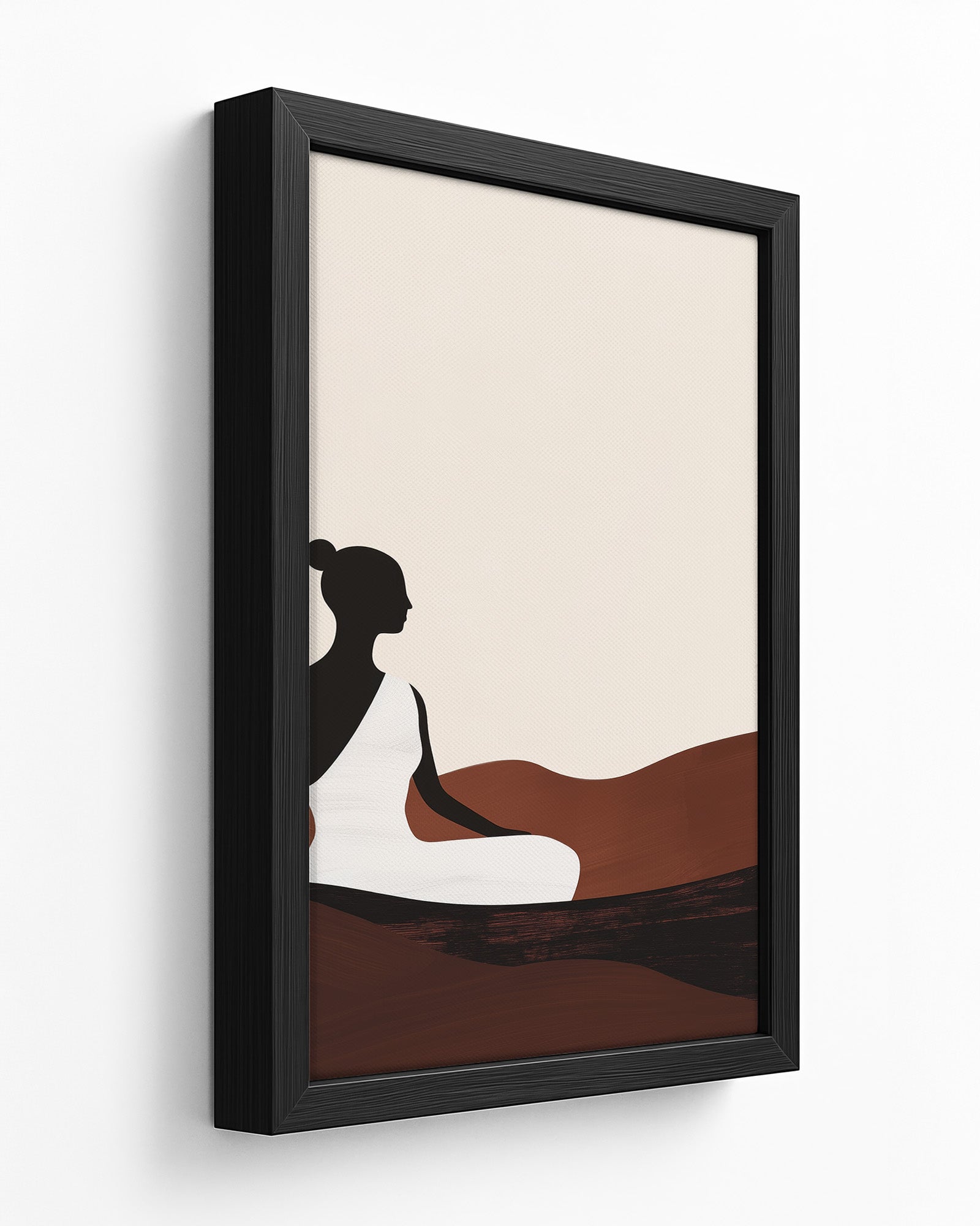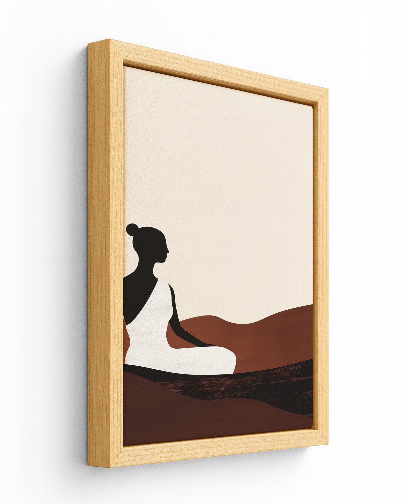 This serene artwork captures a meditative silhouette of a woman seated calmly among flowing earthy dunes. Cloaked in a pure white robe against a soft beige sky, her figure evokes balance, peace, and quiet strength. Rendered in minimalist form with warm terracotta and dark wood tones, this piece is perfect for grounding modern interiors, wellness spaces, or tranquil corners of your home.