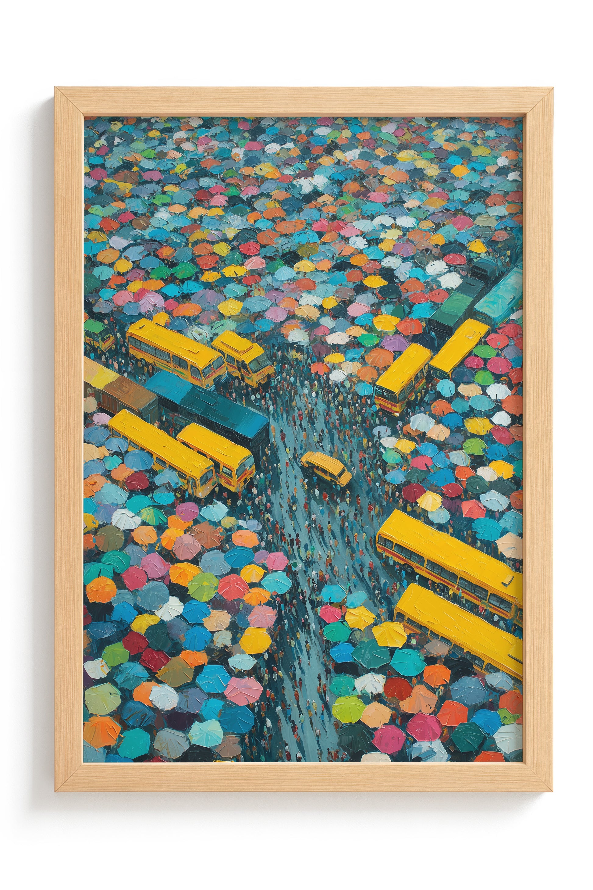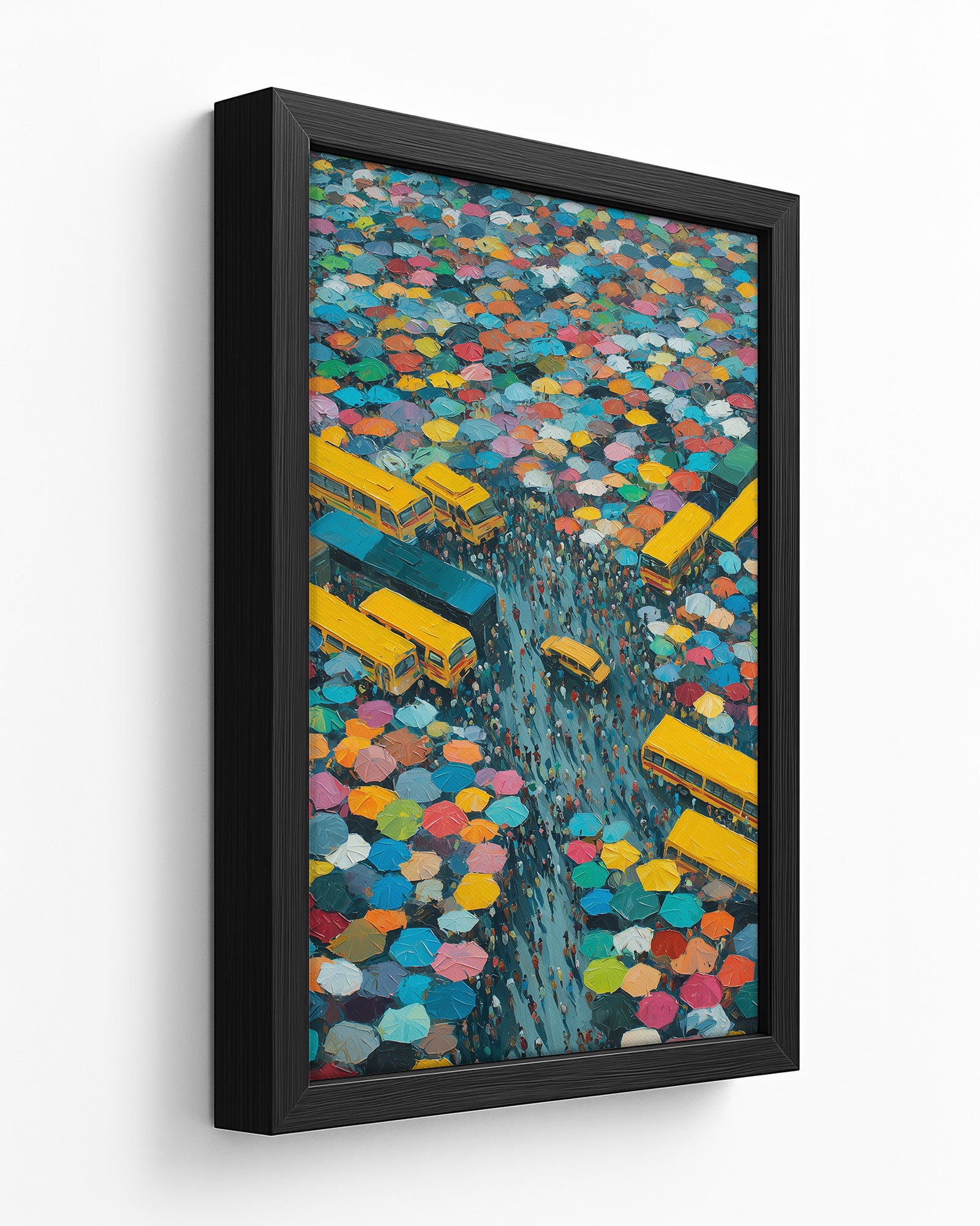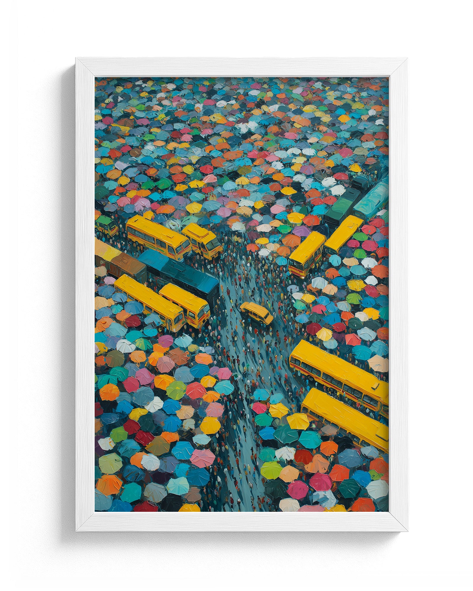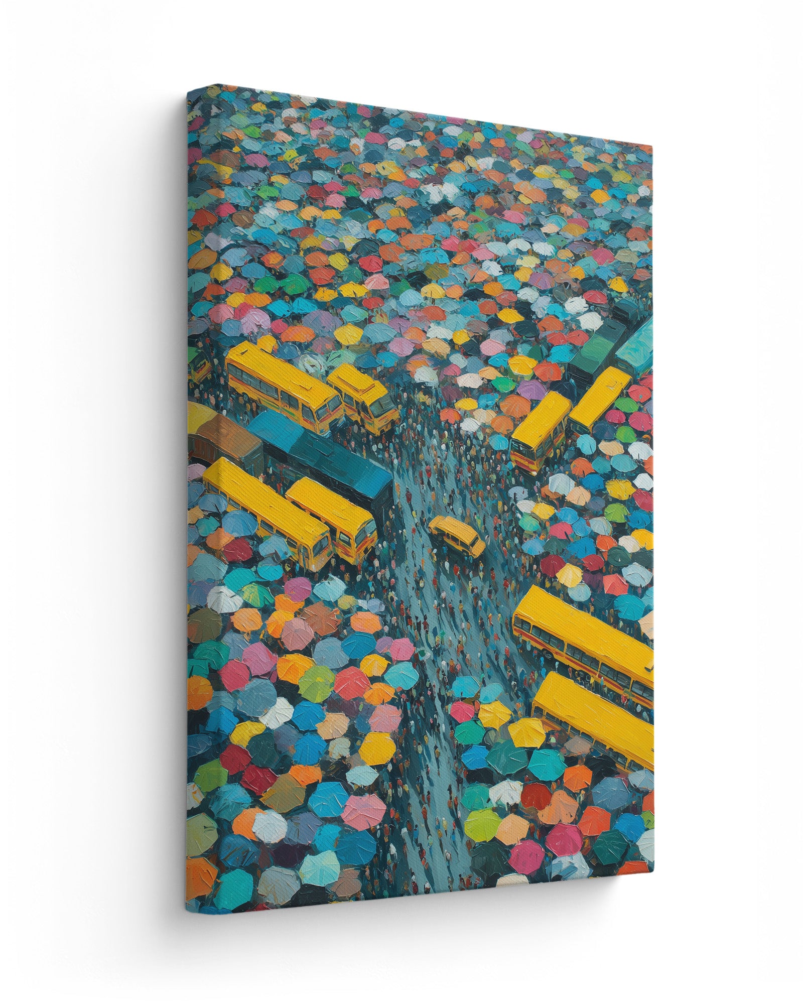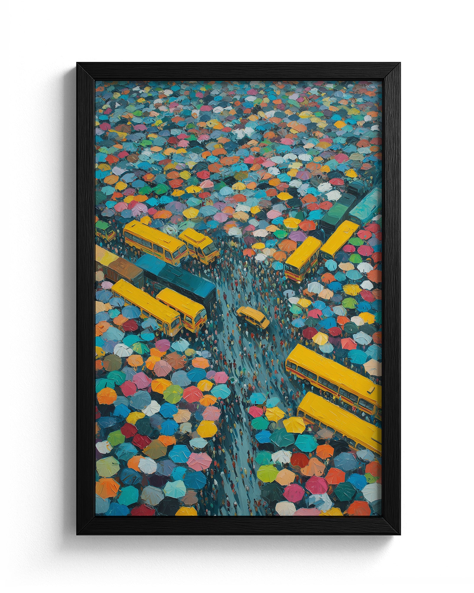 An abstract oil painting of Lagos, alive with vibrant umbrellas, bustling crowds, and iconic yellow city buses. Bold brushstrokes and luminous colours capture the energy, rhythm, and cultural heartbeat of urban Nigeria, blending chaos and beauty into a living tapestry of movement.