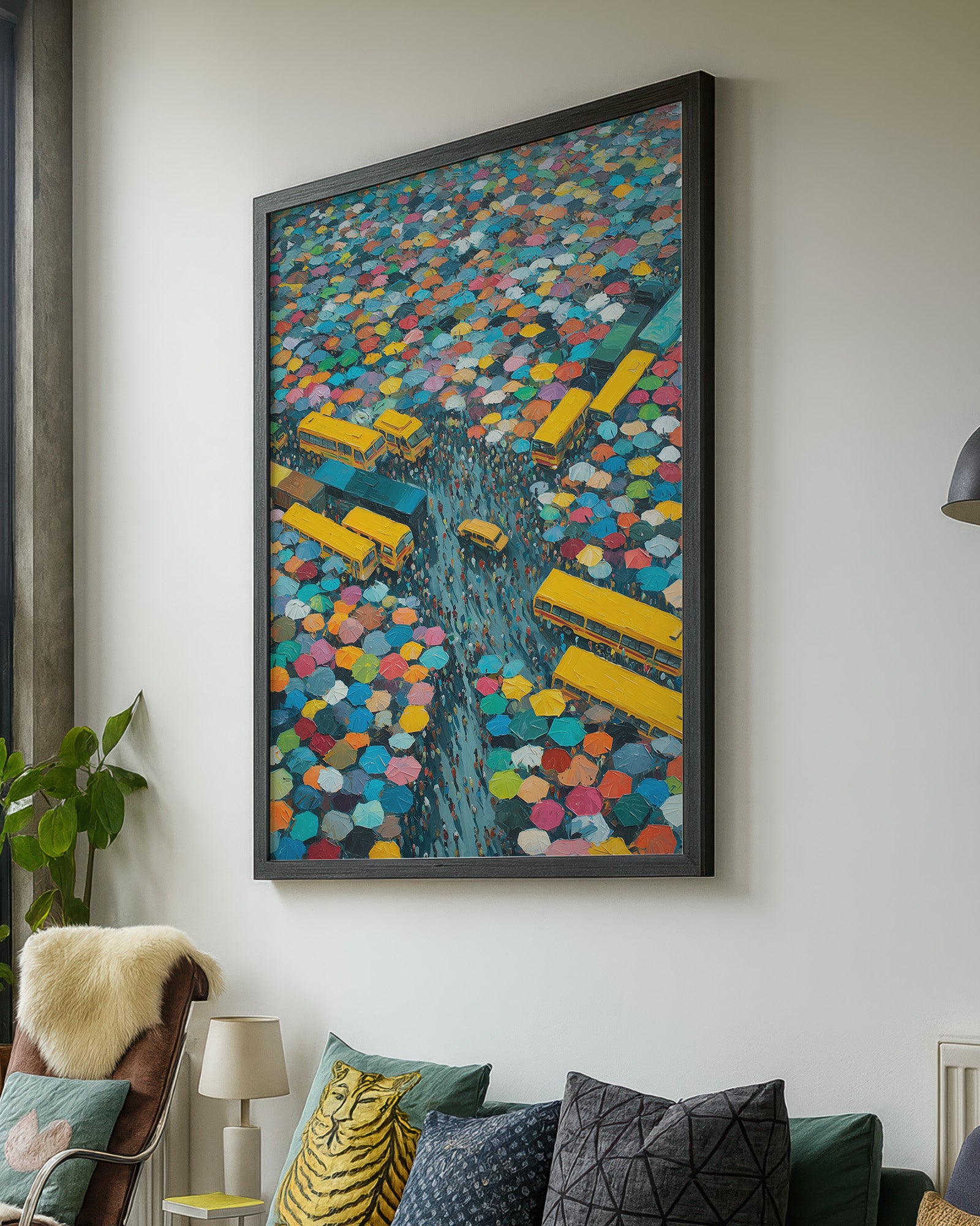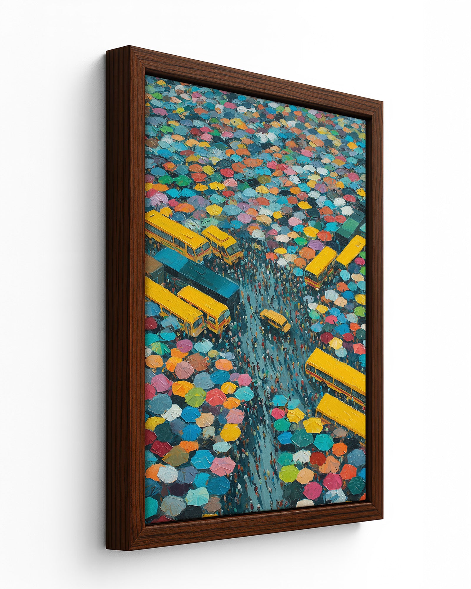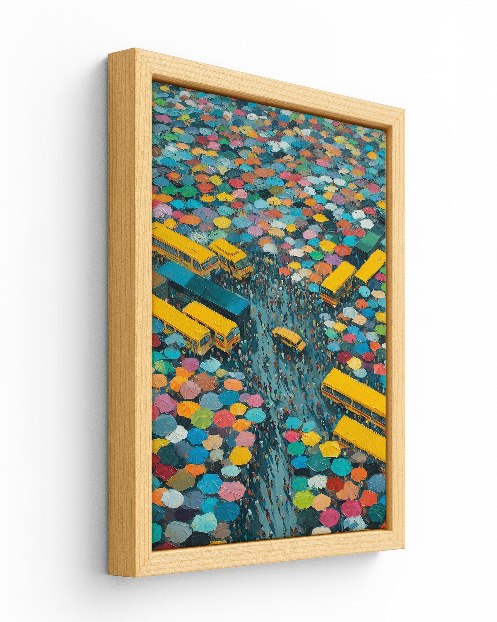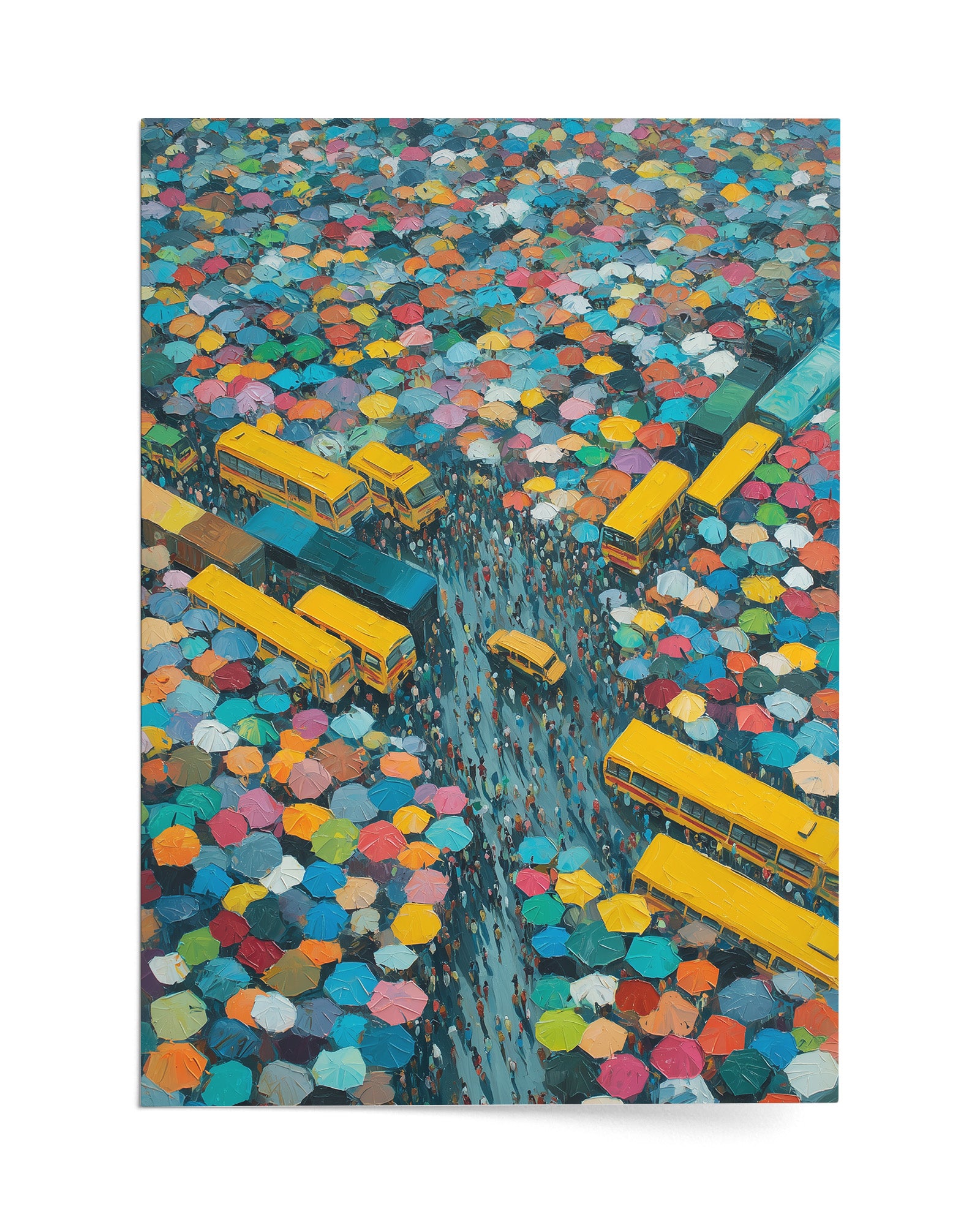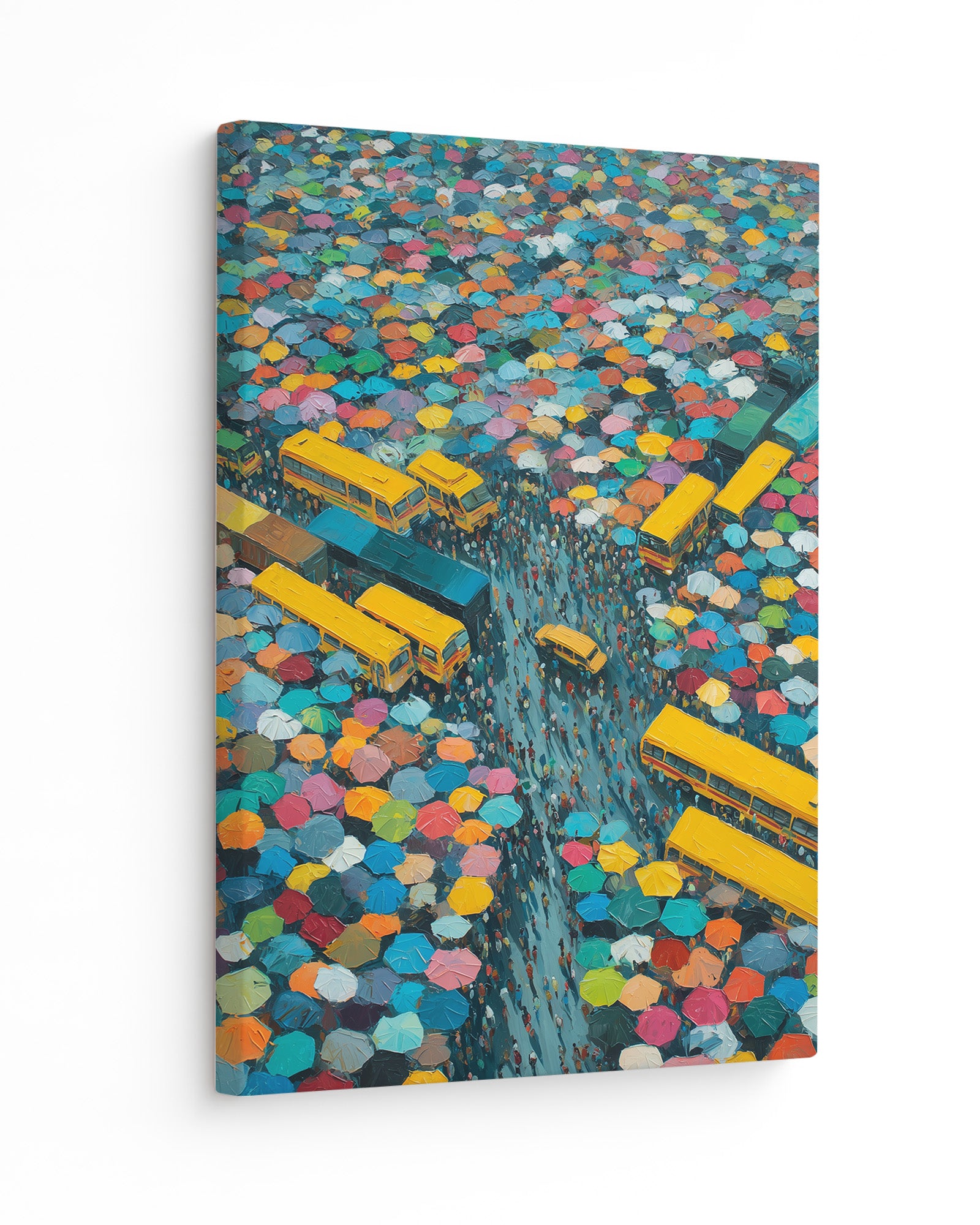 An abstract oil painting of Lagos, alive with vibrant umbrellas, bustling crowds, and iconic yellow city buses. Bold brushstrokes and luminous colours capture the energy, rhythm, and cultural heartbeat of urban Nigeria, blending chaos and beauty into a living tapestry of movement.