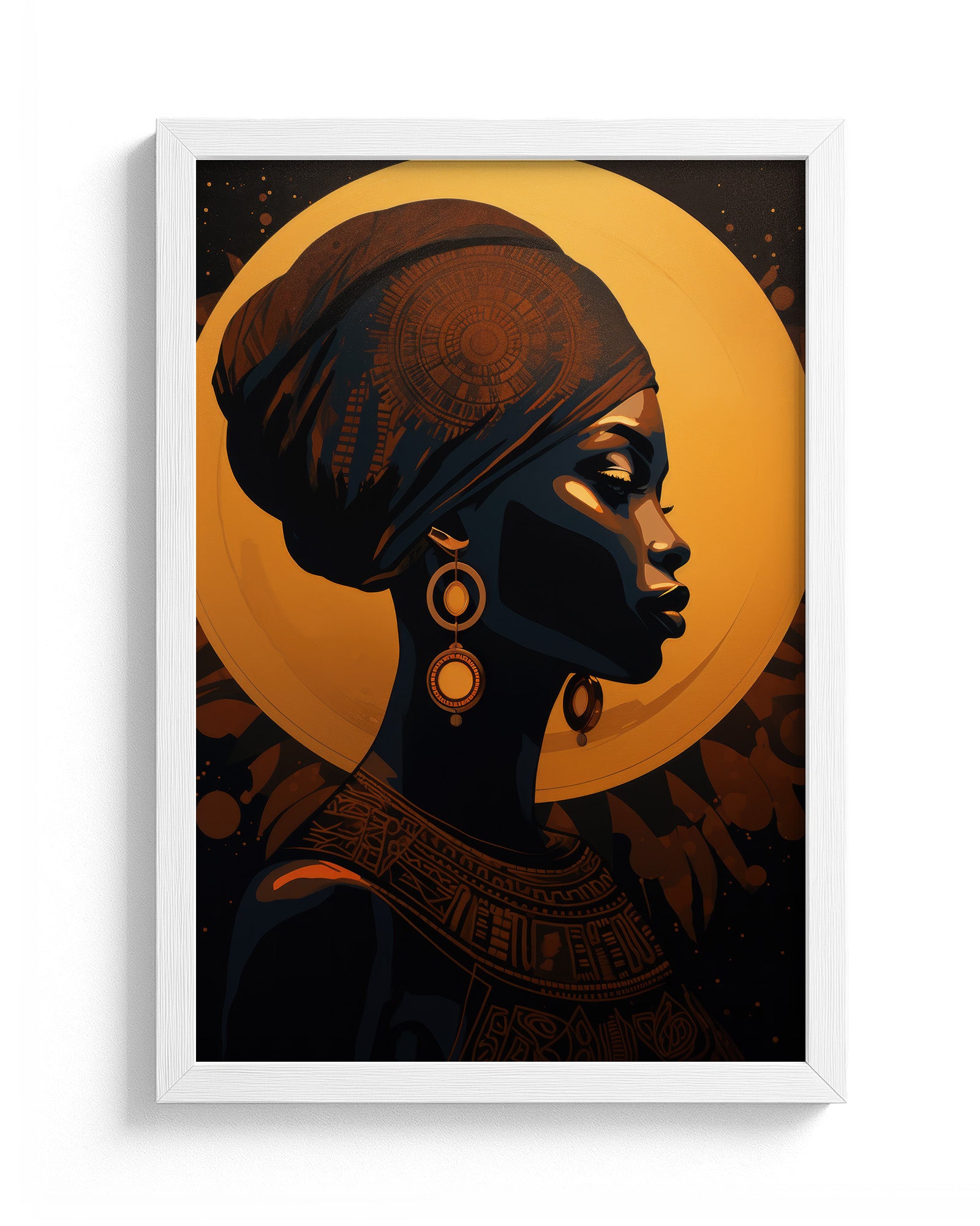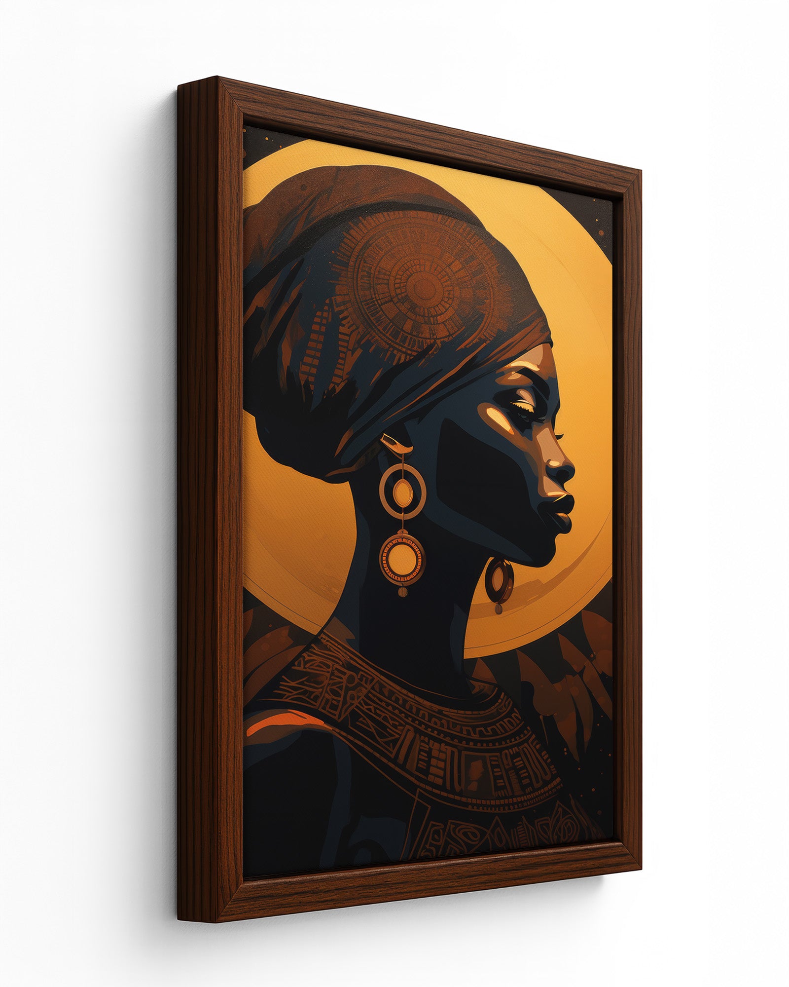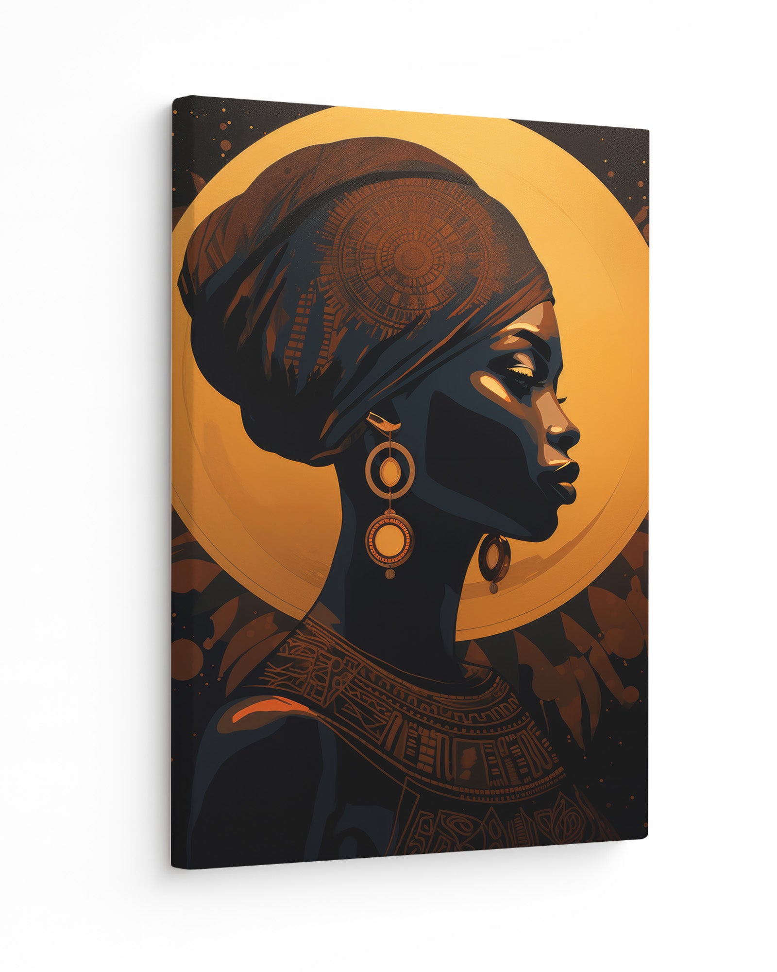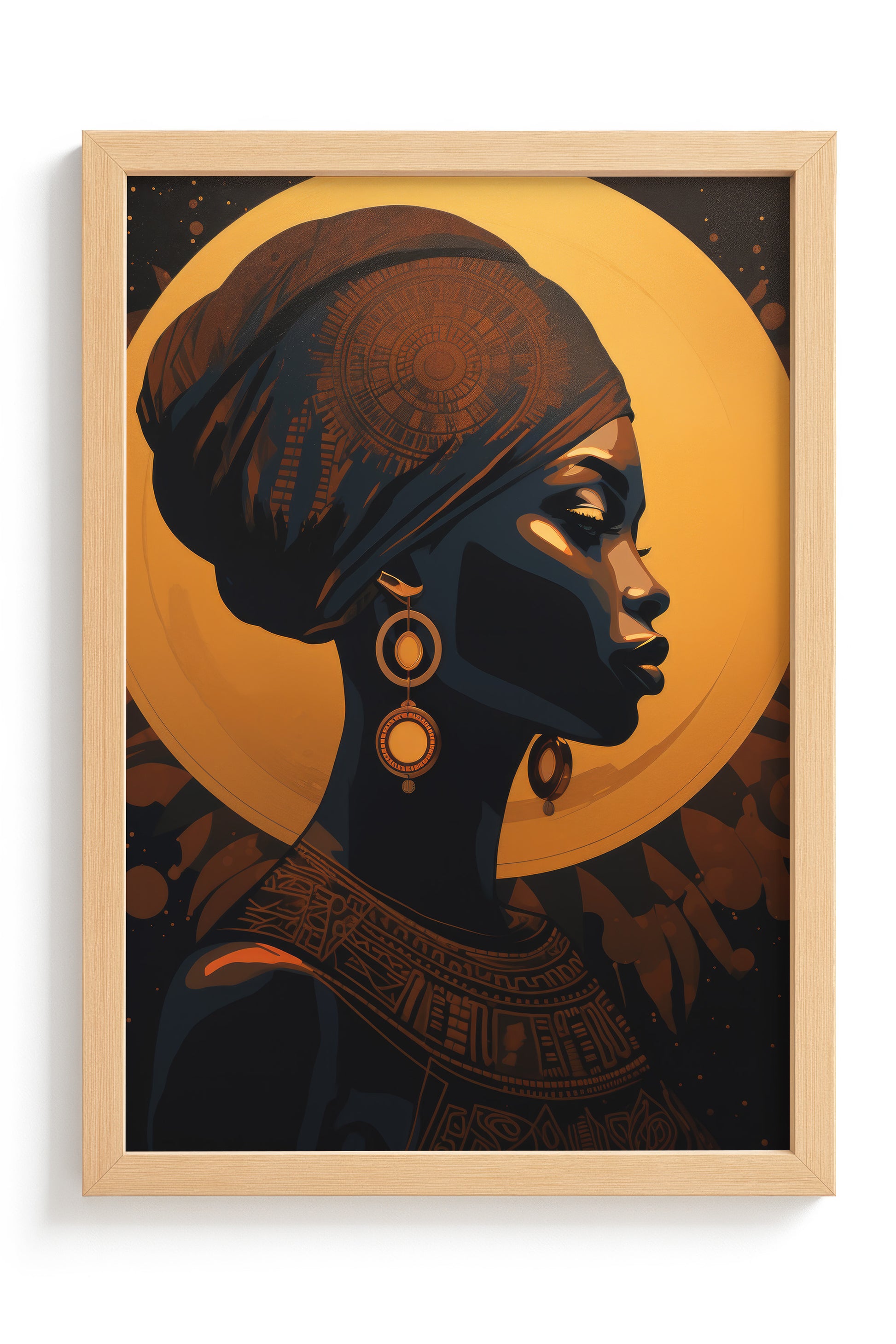 Celebrate the beauty of Ethiopian culture with our captivating wall art featuring an Ethiopian woman against the backdrop of a golden sun. This enchanting painting captures the essence of grace and resilience, portraying the woman's captivating presence.