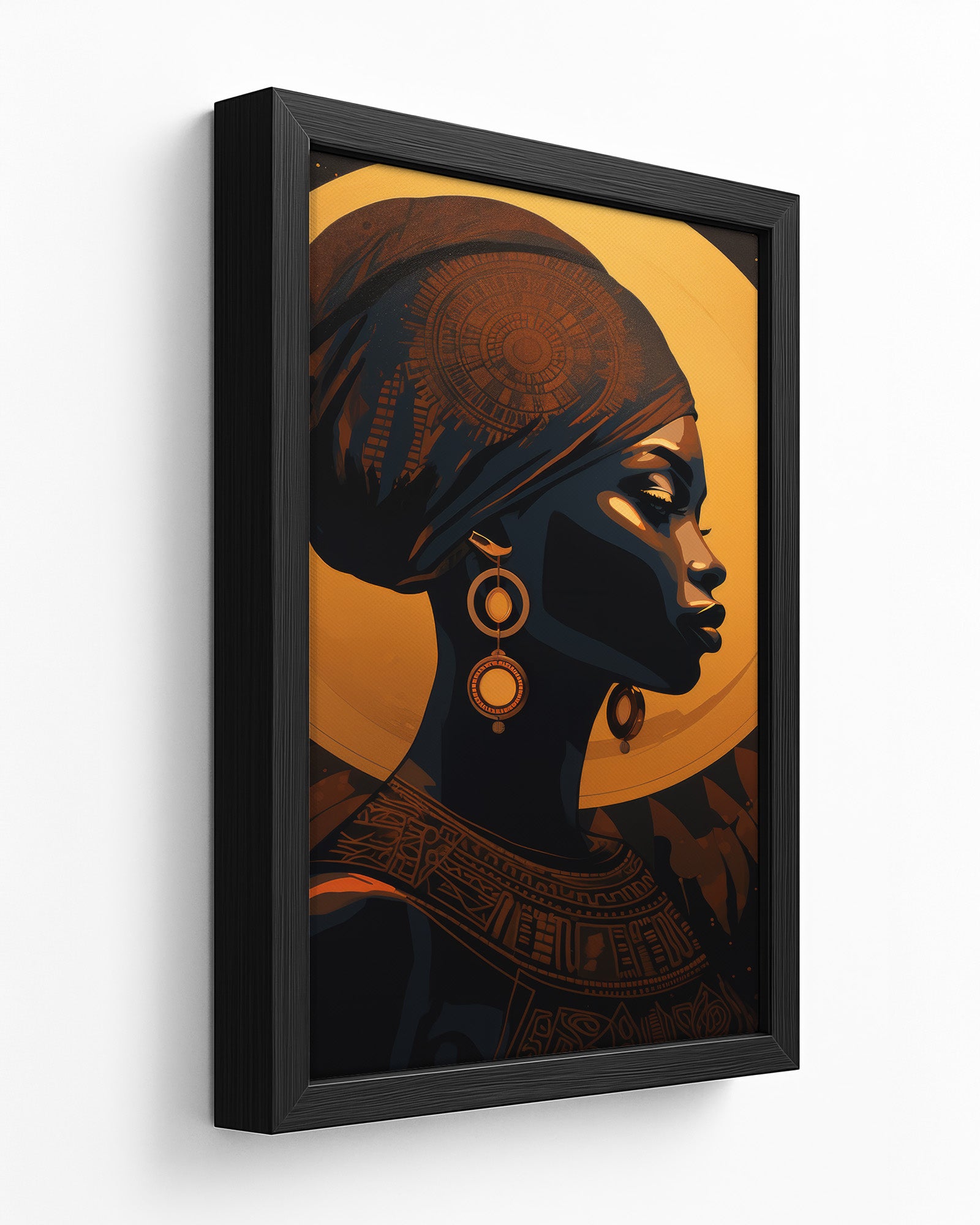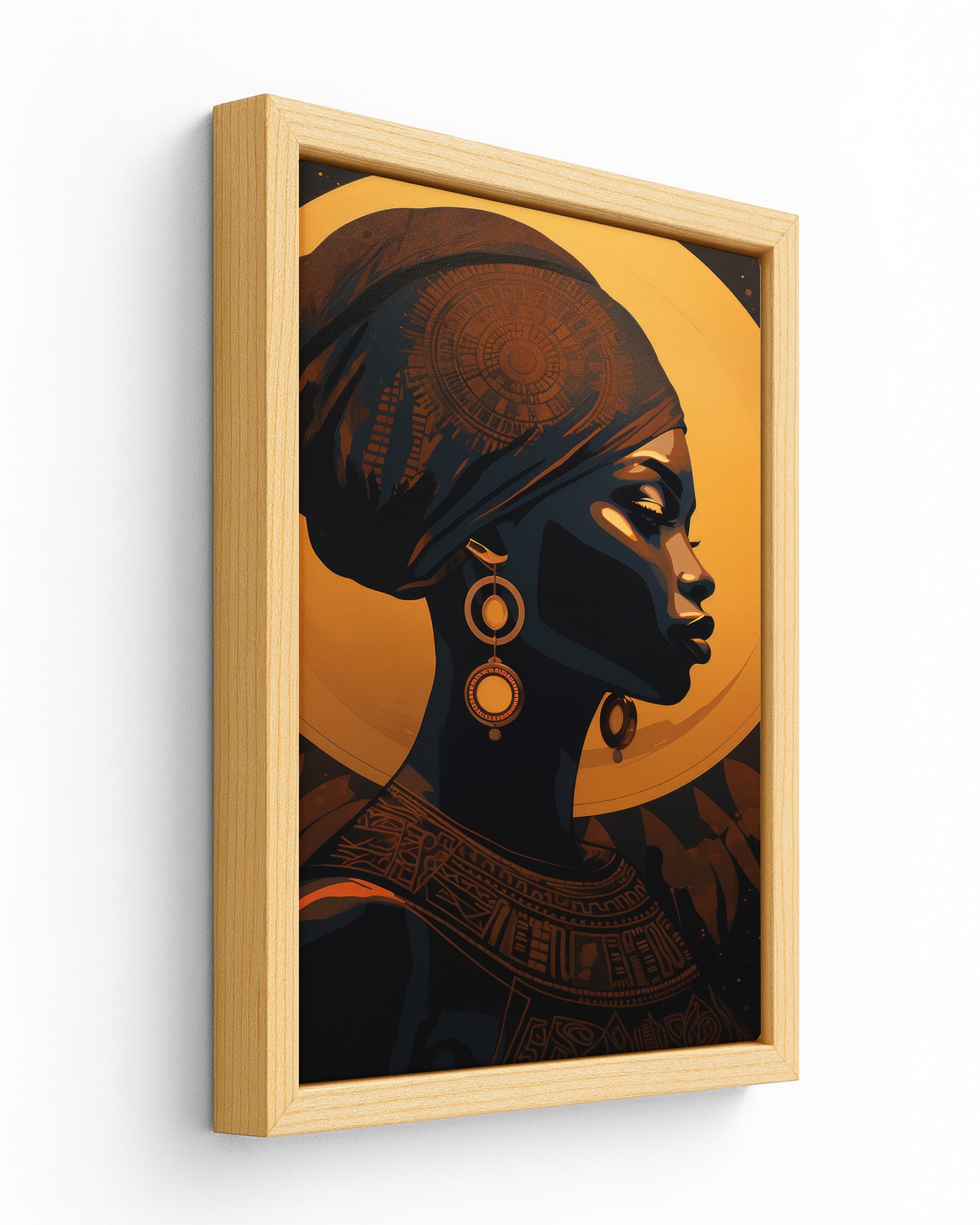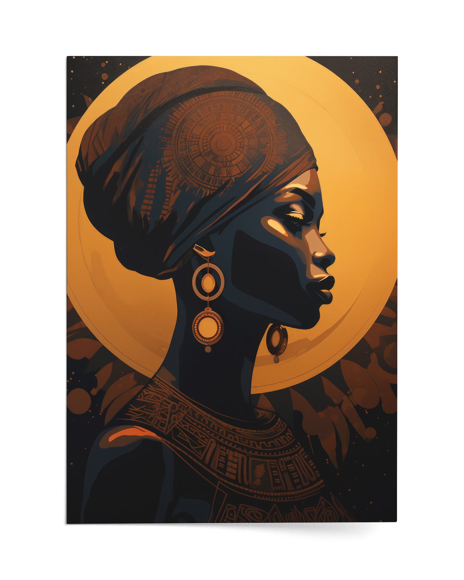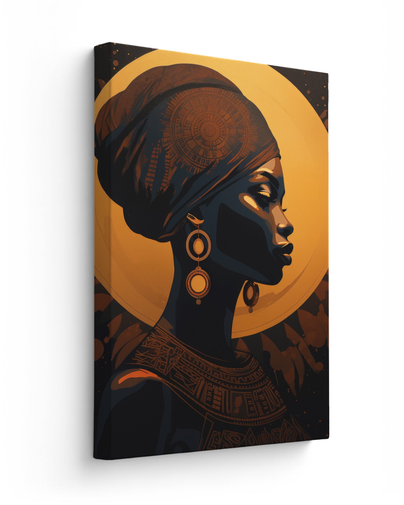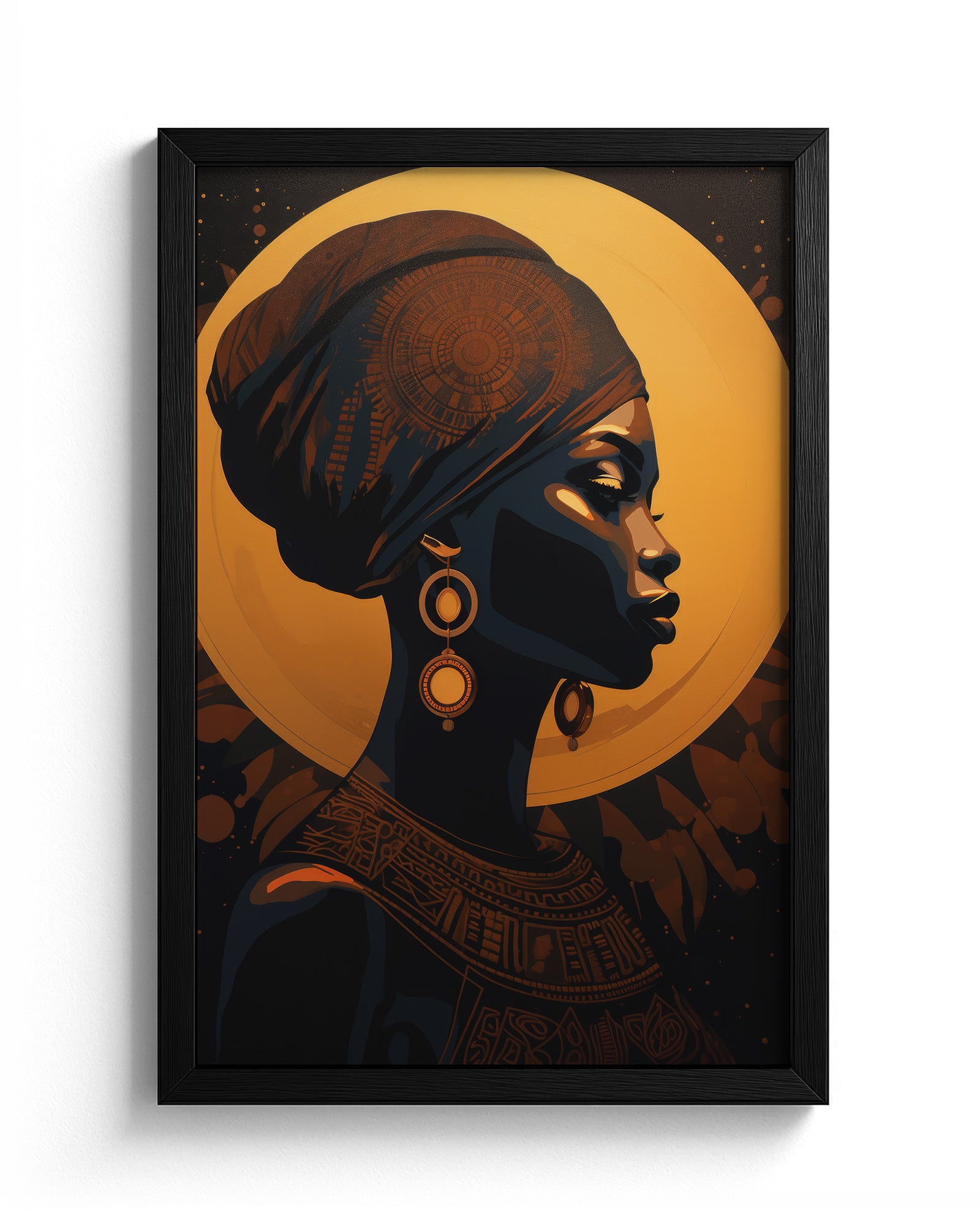 Celebrate the beauty of Ethiopian culture with our captivating wall art featuring an Ethiopian woman against the backdrop of a golden sun. This enchanting painting captures the essence of grace and resilience, portraying the woman's captivating presence.