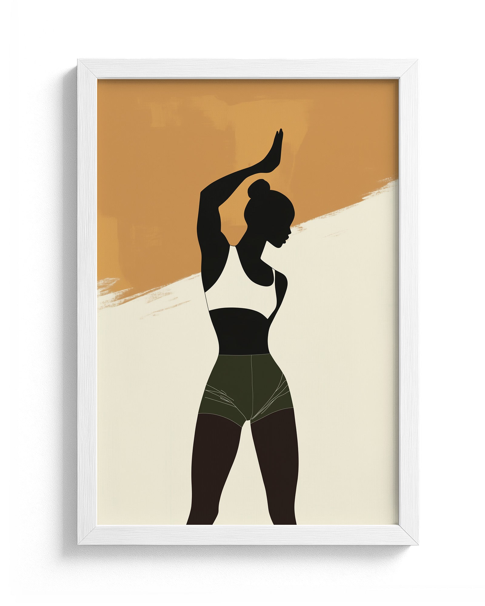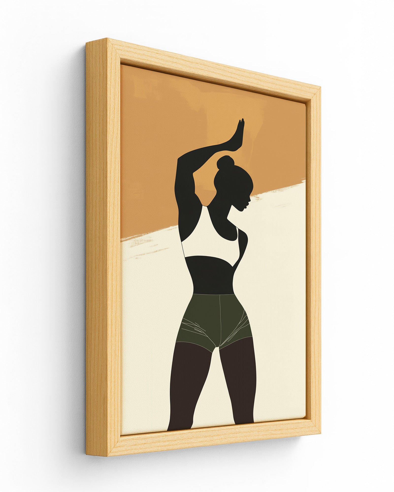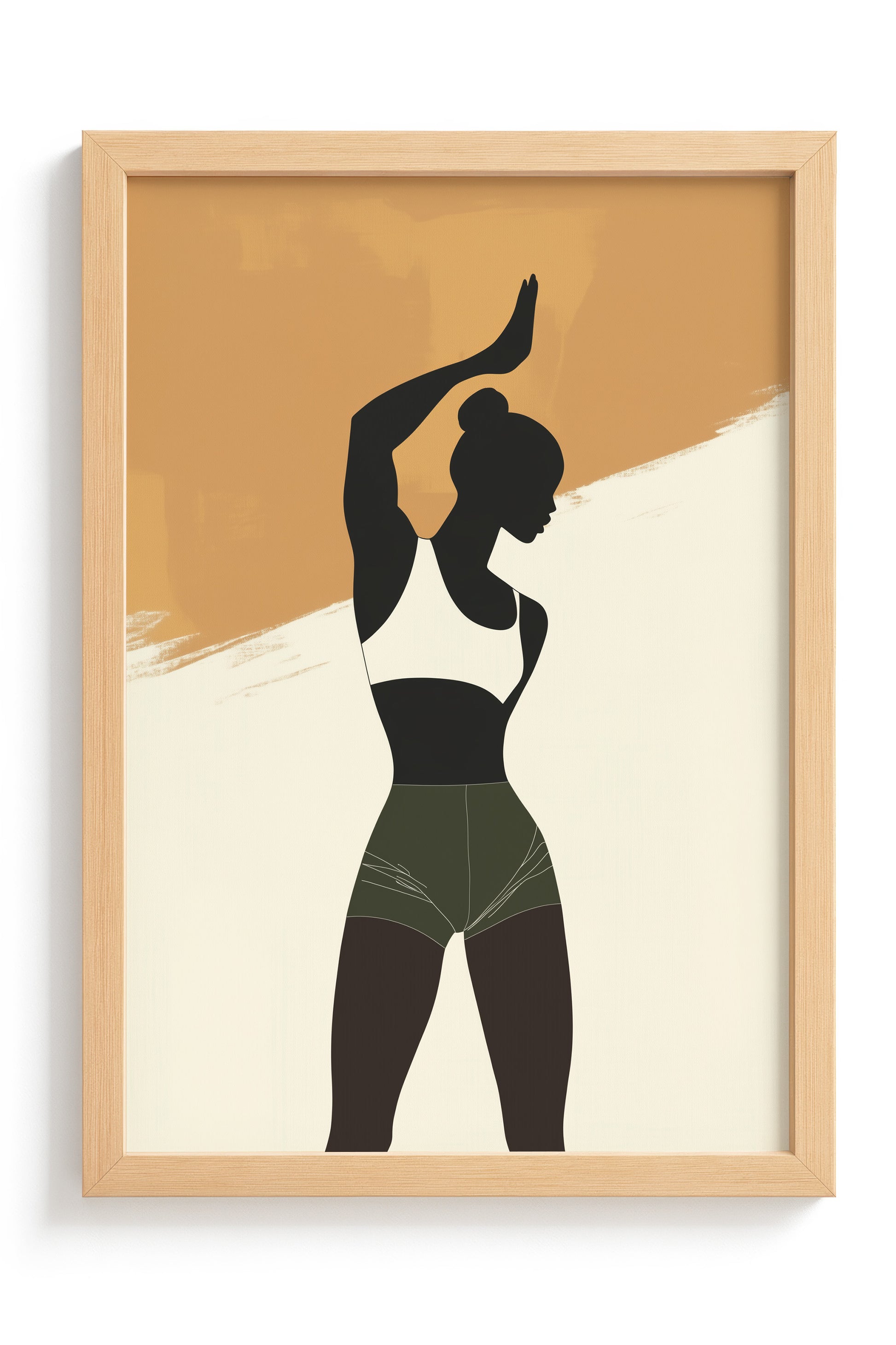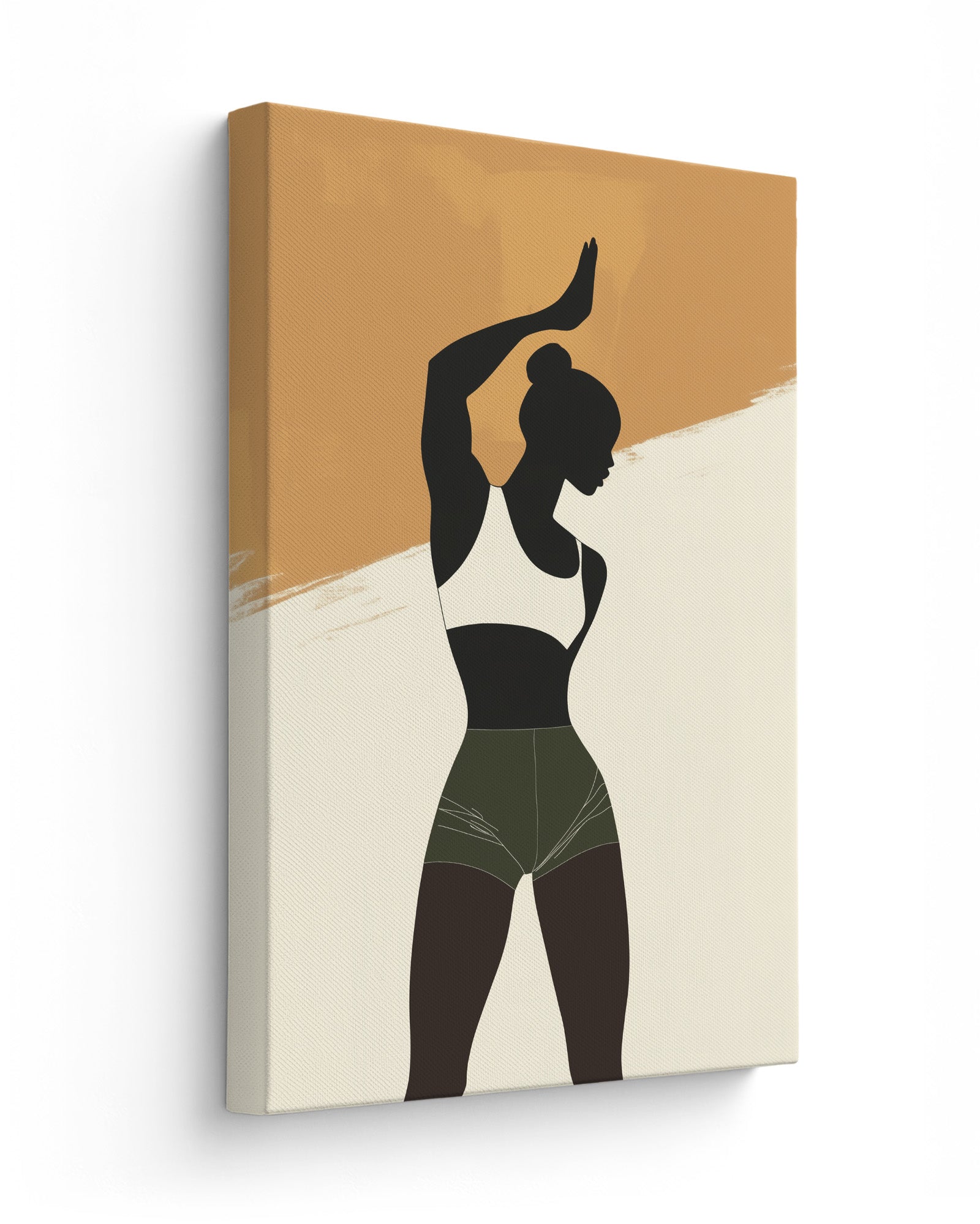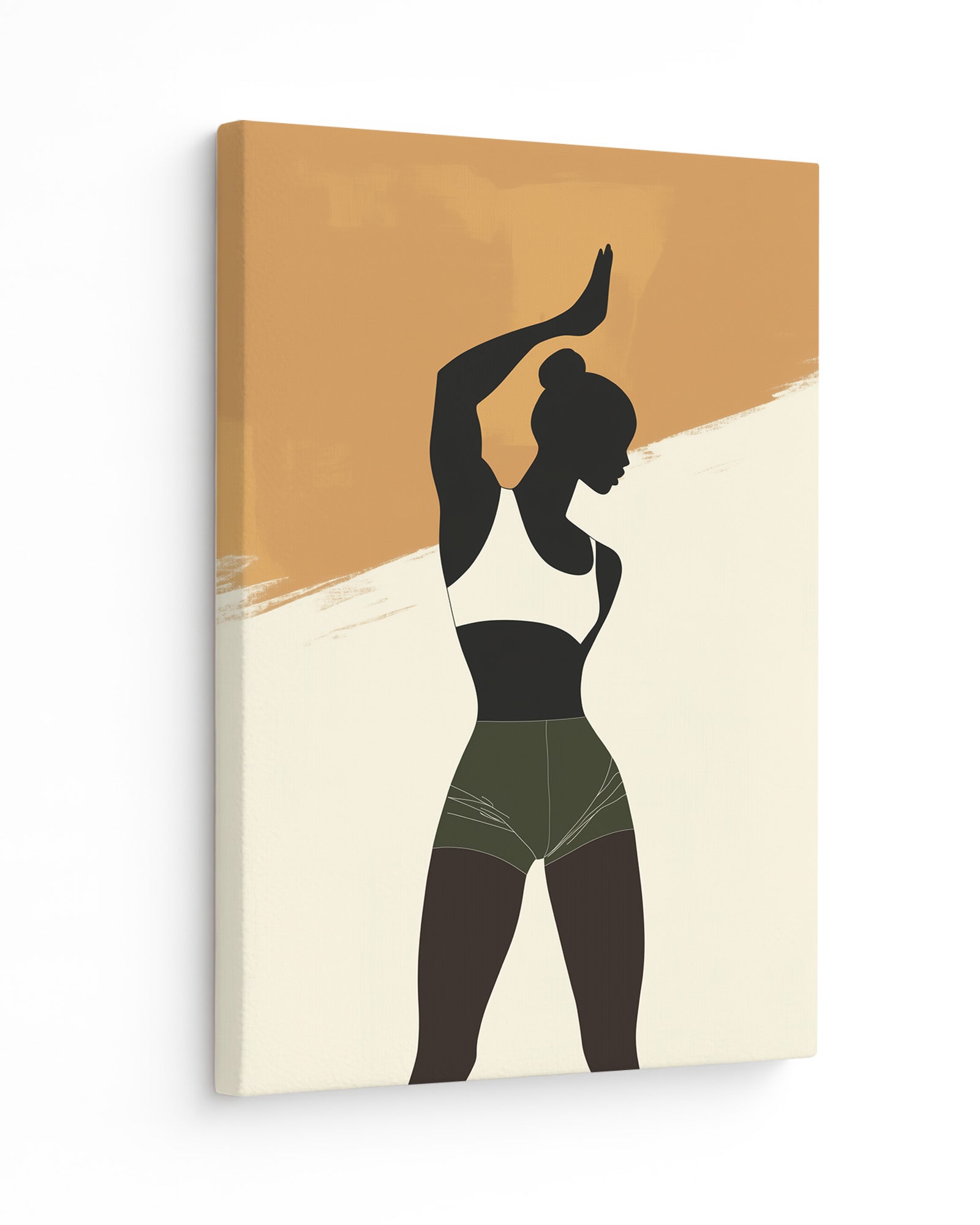 This striking modern painting captures the grace and power of a woman practicing yoga against a vibrant yellow background. Dressed in green athletic wear, she demonstrates extraordinary flexibility with one leg arched, embodying strength, balance, and spiritual connection.
