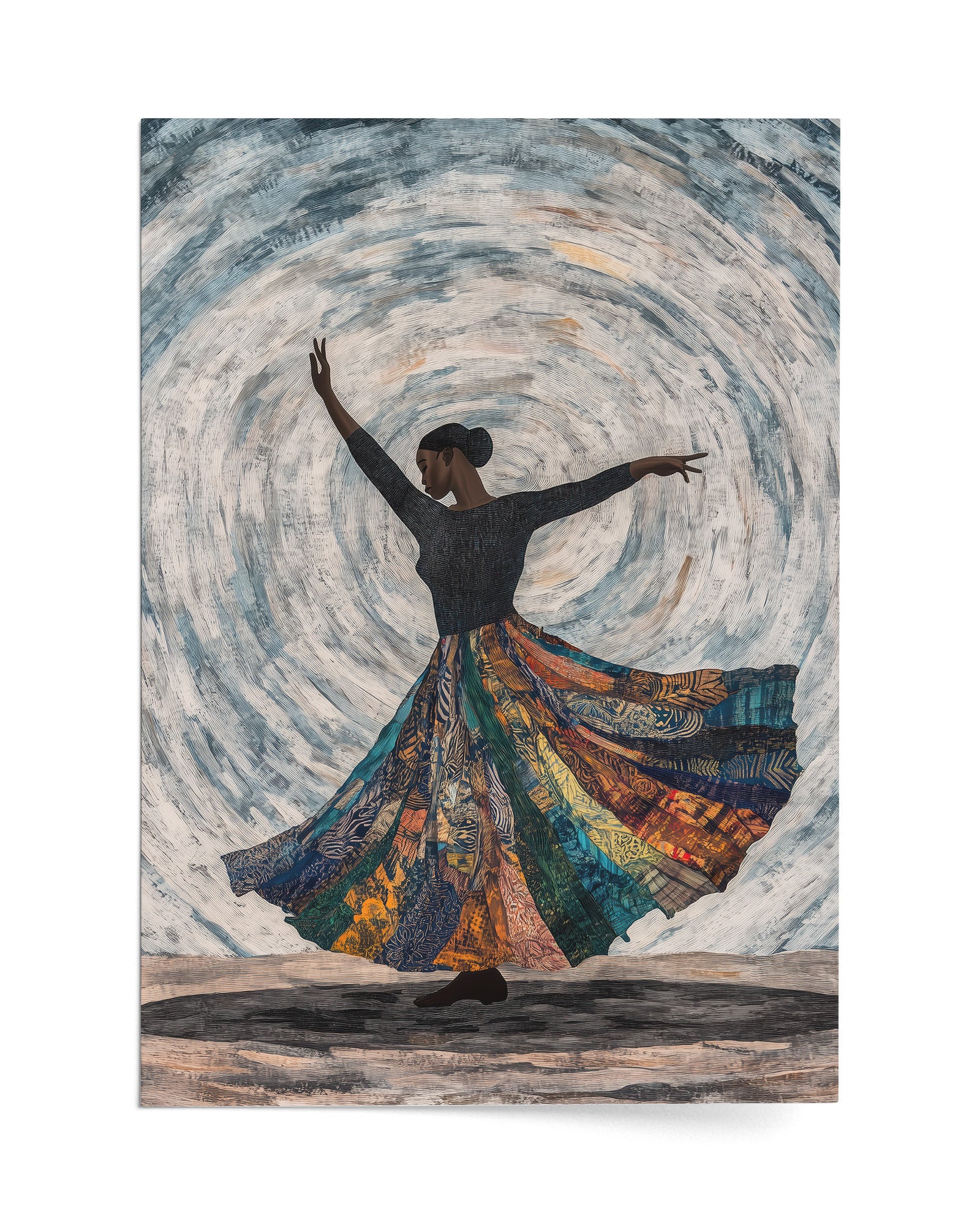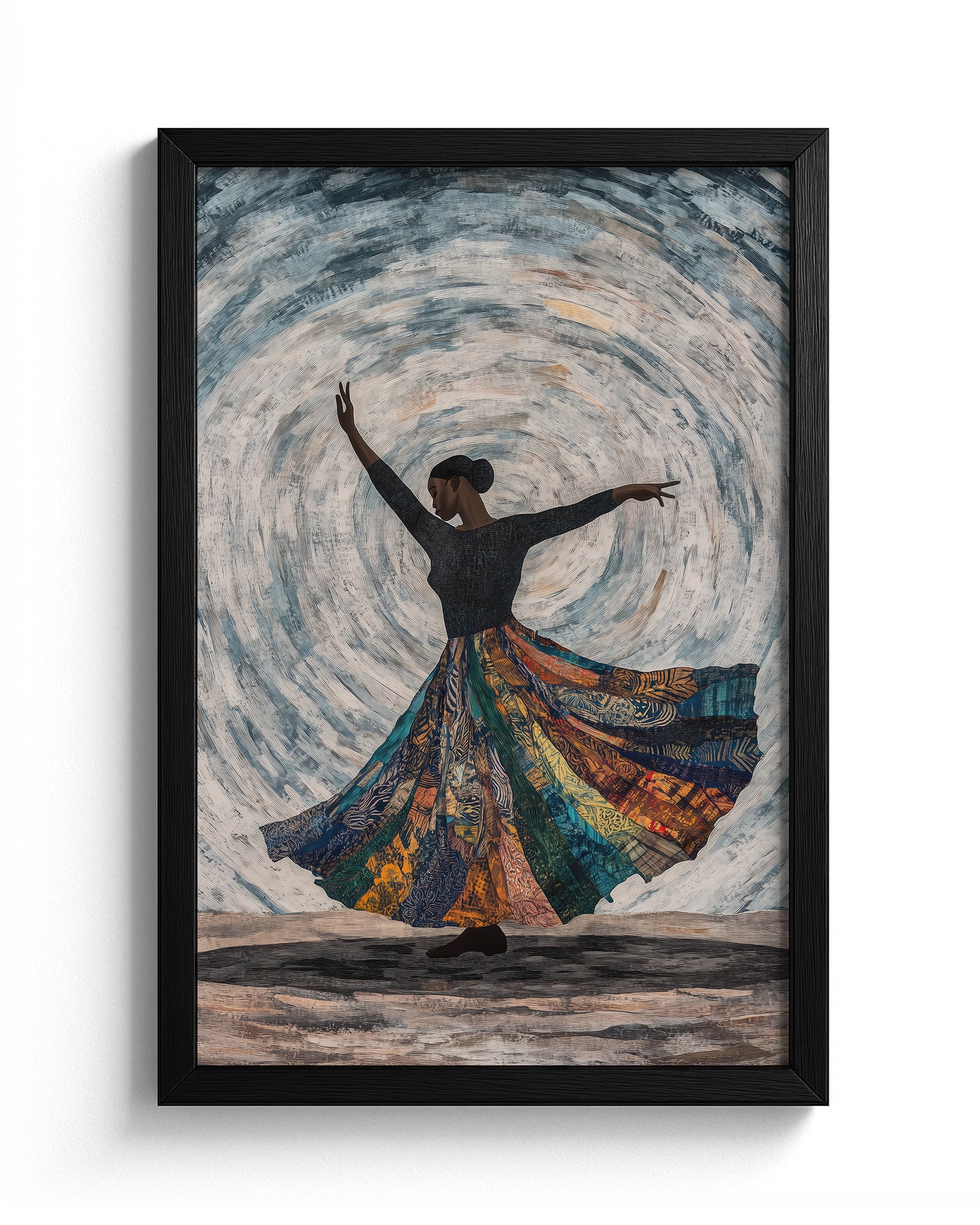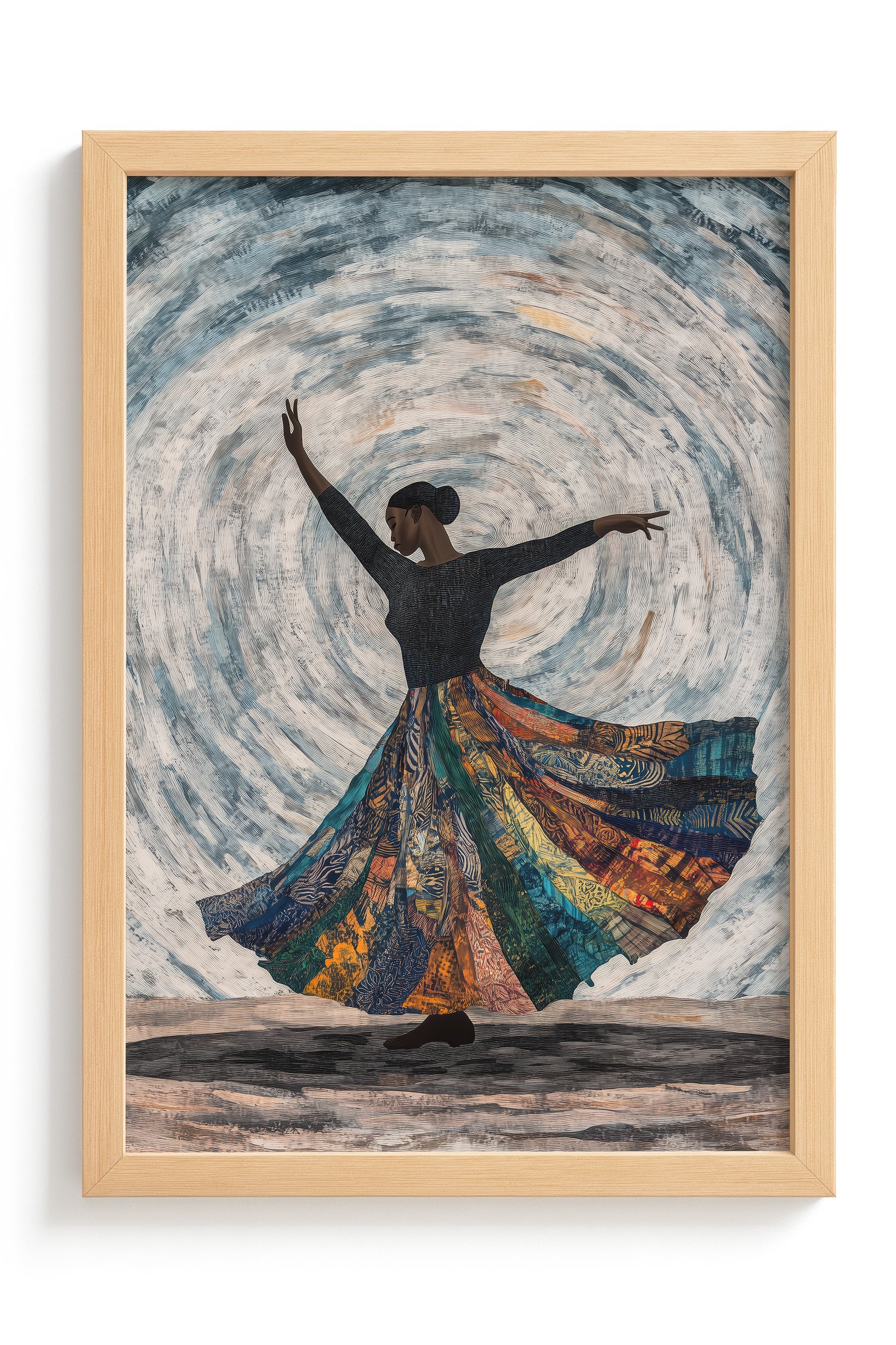 Celebrate the elegance of African dance with this artwork of a dancer mid-spin. Flowing fabric trails blend seamlessly into tribal patterns, set against a muted, earthy background to emphasise the grace of movement.
