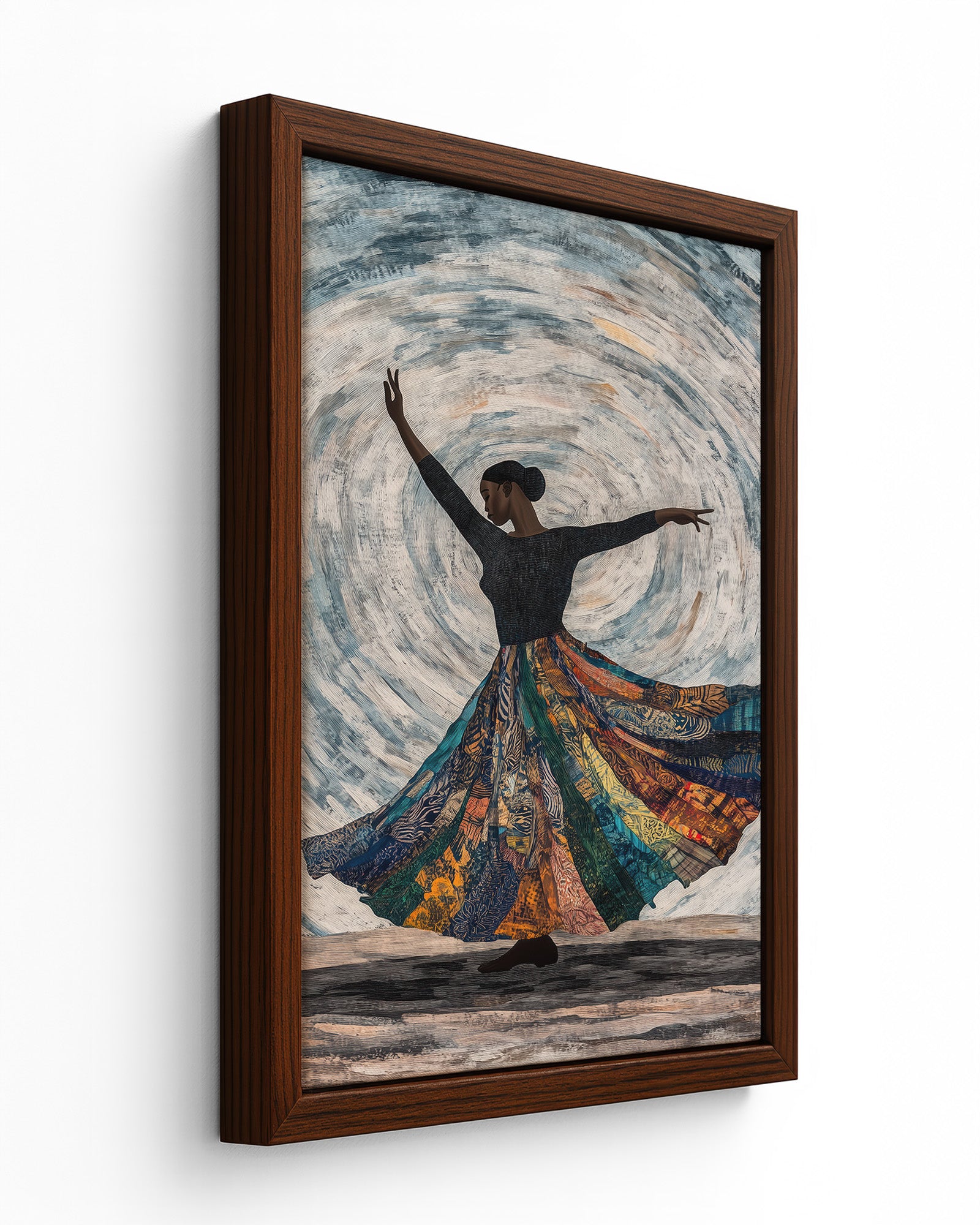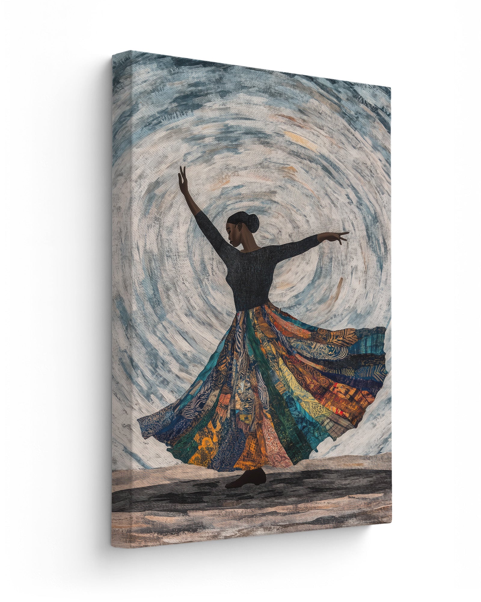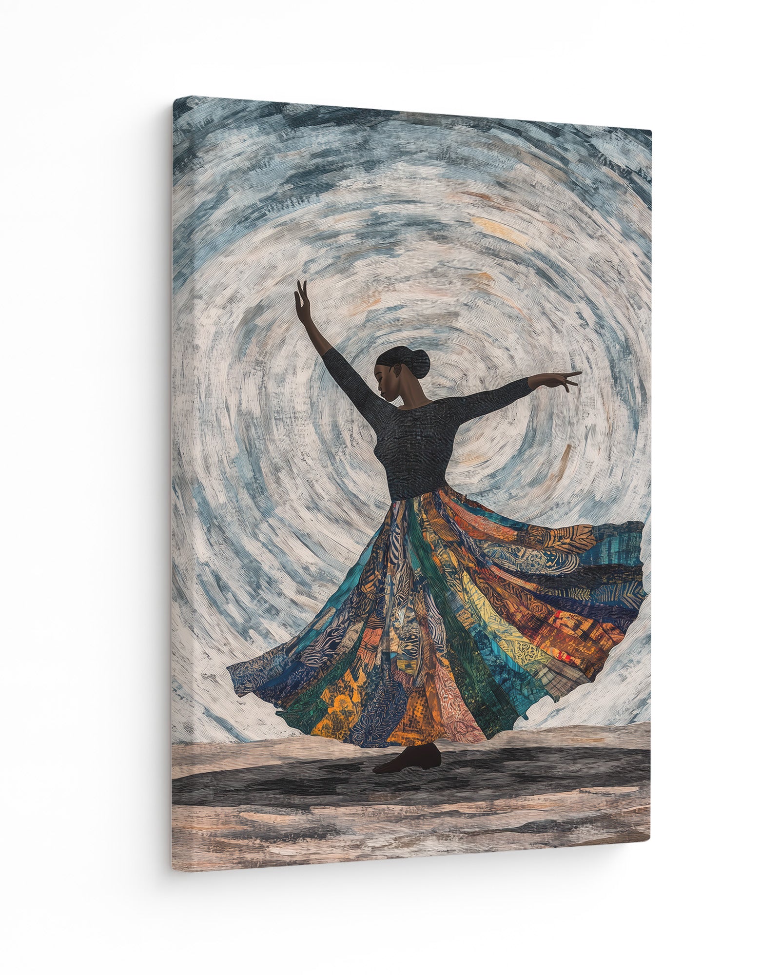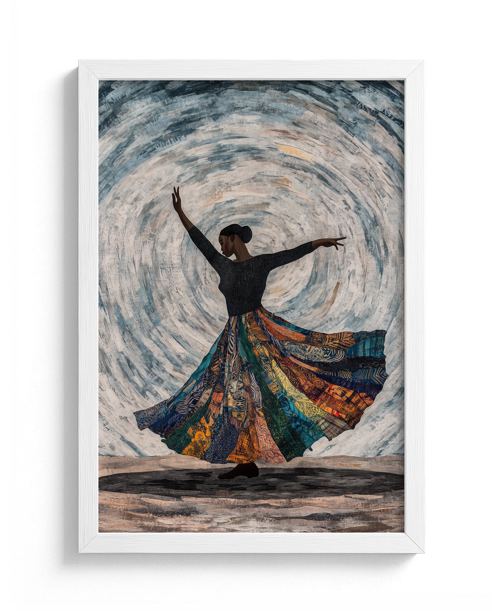 Celebrate the elegance of African dance with this artwork of a dancer mid-spin. Flowing fabric trails blend seamlessly into tribal patterns, set against a muted, earthy background to emphasise the grace of movement.
